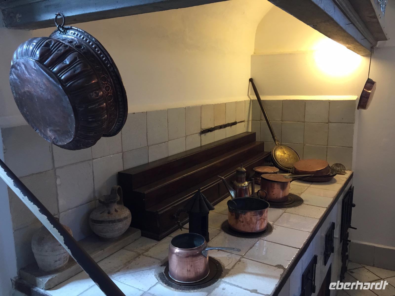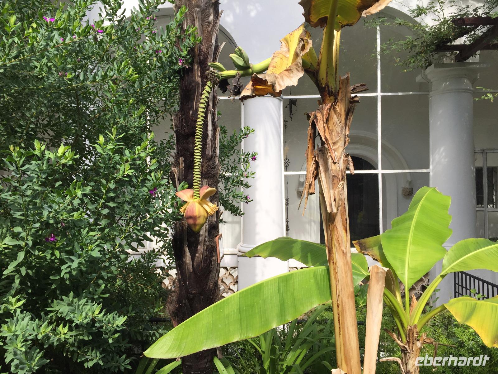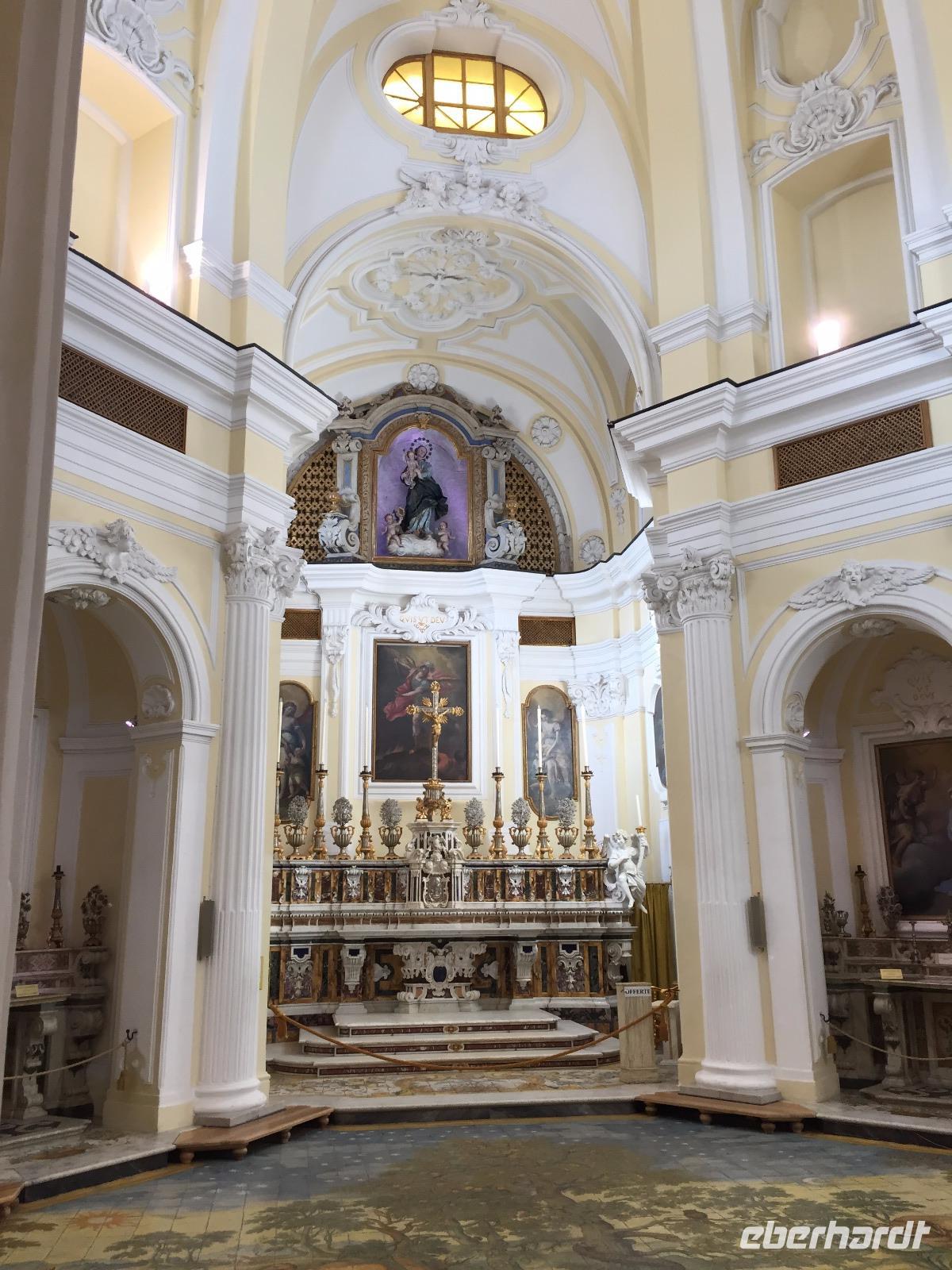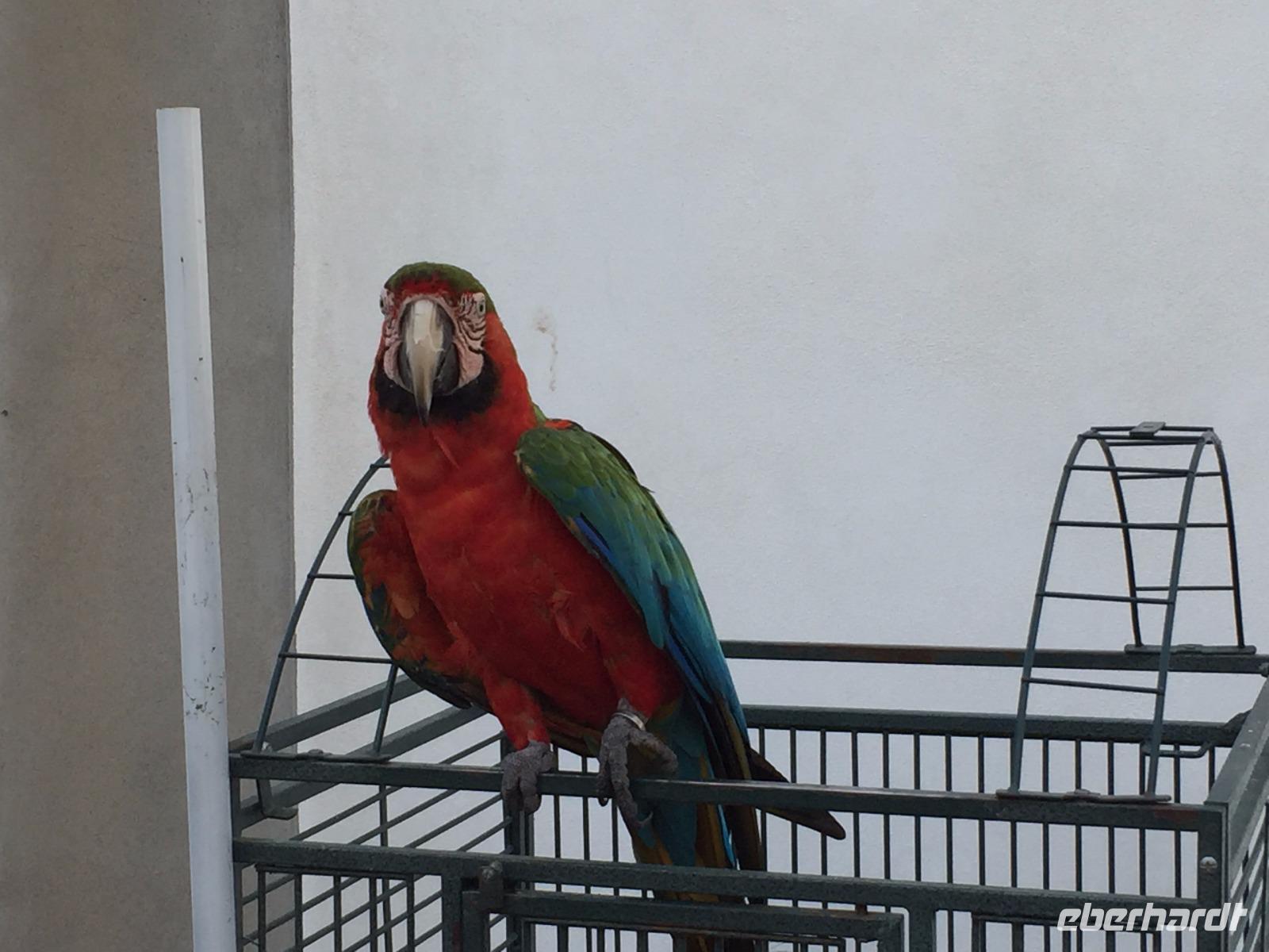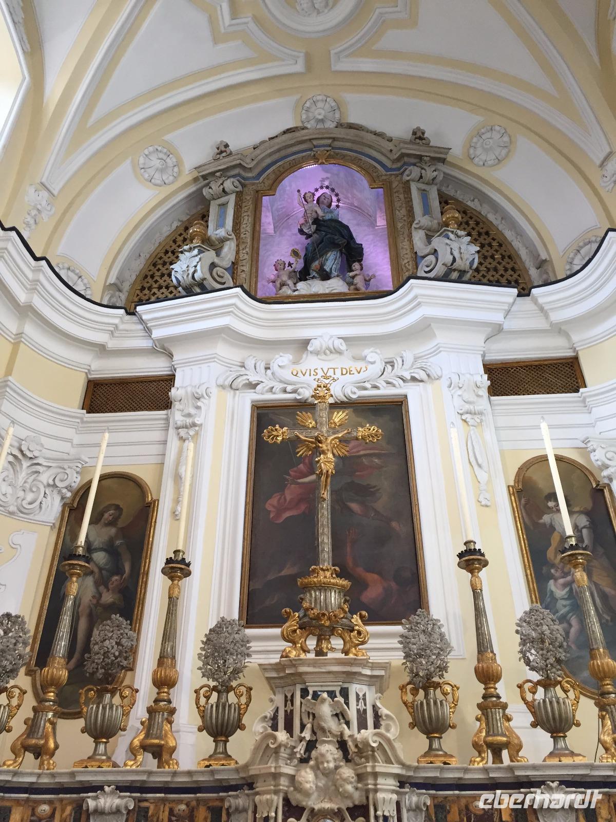 Endlich! Kein Regen und die Sonnenstrahlen stimmen uns auf einen schönen Tag in Anacapri ein. Annamaria treffen wir am kleinen Busbahnhof. Mit einem kleinen, orangen Inselbus fahren wir in wenigen Minuten über die Serpentinenstraße, die auch „Mamma-Mia-Straße" genannt wird, hinauf nach Anacapri. Zunächst machen wir einen gemütlichen Spaziergang durch Anacapri, welches noch etwas verschlafen wirkt. Anacapri ist das Pendant zu Capri-Stadt, hoch oben auf dem Plateau auf 275 Metern. Wir spazieren vorbei am Casa Rossa (rotes Haus), welches zwischen 1876 und 1898 von dem amerikanischen Oberst J.C. MacKowen erbaut wurde und den Aragonesischen Turm umschließt. Leider ist es heute geschlossen und wir können die Gemäldesammlung im Inneren nicht sehen. Unser nächster Besichtigungspunkt ist die Kirche von San Michele. Sie ist ein bedeutender Kunstschatz der Insel Capri und eine der beeindruckendsten Kirchen in Kampanien. Sie liegt an einem hübschen kleinen Platz zwischen den ruhigeren Straßen von Anacapri, weit entfernt vom geschäftigen Treiben auf der Piazzetta von Capri. Von außen ganz unscheinbar, beherbergt sie einen wahren Schatz - der wunderbare, mit handgemalten Keramikfliesen bedeckte Boden im Kirchenschiff. Jeden Zentimeter von ihm bedeckt eine große Szene, die die Vertreibung von Adam und Eva aus dem Paradies darstellt. Die dramatische Szene spielt sich in einer üppigen Kulisse aus Bäumen, Pflanzen und allen möglichen Tieren ab. Dieser bestens erhaltene Boden stammt aus dem Jahr 1761 und wurde von Leonardo Chiaiese, einem der besten Keramikkünstler in Neapel des 18. Jahrhunderts, erschaffen. Wir schlendern weiter in den Gassen von Anacapri und kommen in das Viertel Le Boffe, dem ältesten Teil des Ortes. Nach einer Begegnung mit einem frechen Papagei erreichen wir die schneeweiße Kirche der Heiligen Sofia, wo wir eine kleine Pause einlegen.