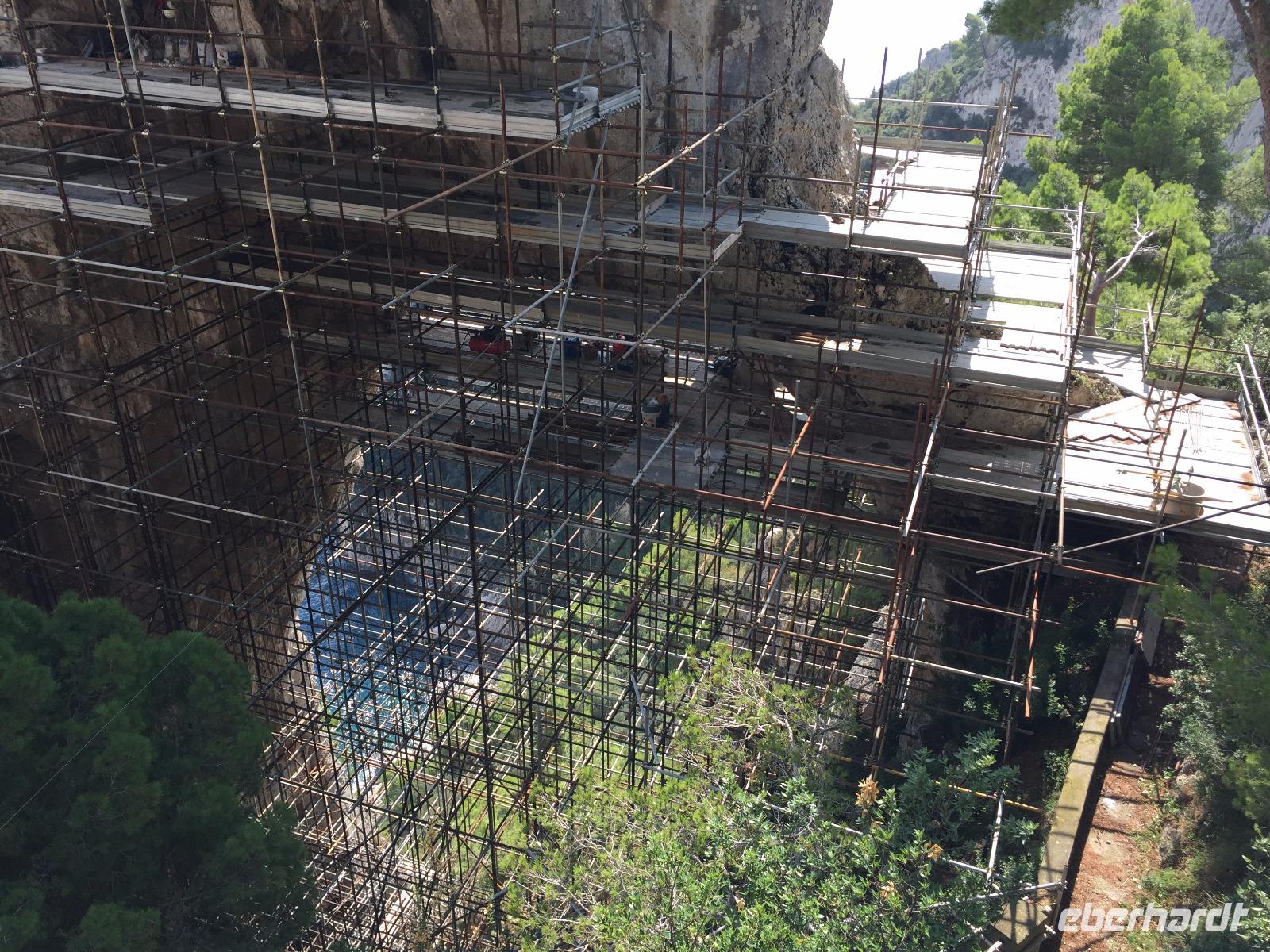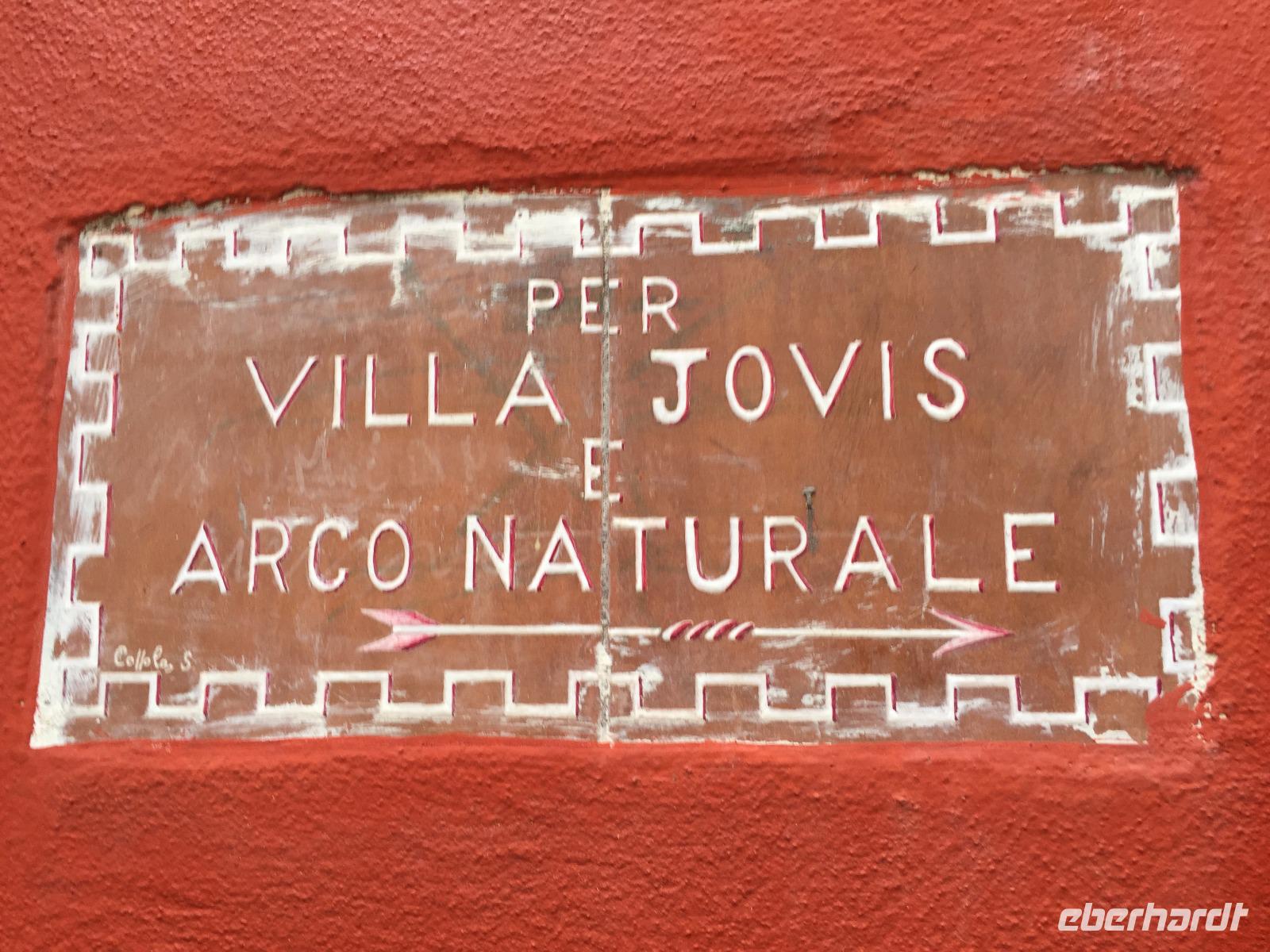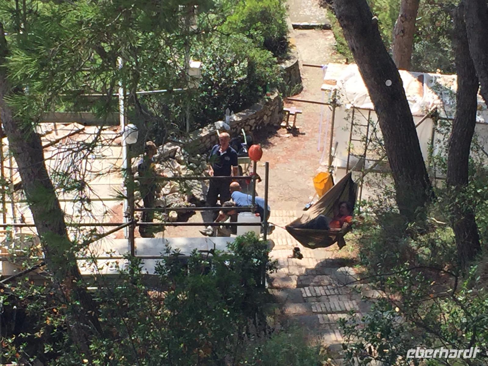 Wir holen heute unseren Spaziergang hinauf zur Villa Jovis nach. Durch die schmalen Wege, vorbei an blühenden Gärten und edlen Villen erreichten wir die Ruinen der Villa auf dem Felssporn des Monte Tiberio. In einer aussichtsreichen, strategisch besten Lage blickt die Villa auf den Golf von Neapel, auf den Punta Campanella, auf die Stadt Capri und auf den Hafen Marina Grande. Nach der ausführlichen Besichtigung mit Annamaria legen wir eine Mittagspause in einem hübschen, kleinen Restaurant mit schönem Blick auf das Meer ein. Nach einer stärkenden Bruschetta spazieren wir zu einem weiteren Highlight und sehenswertem Naturschauspiel der Insel - zum Arco Naturale. Dieser gewaltige Bogen, der leider schon seit einigen Jahren eingerüstet ist, bildet den Überrest einer großen Grotte, die sich in den Berg hineingefressen hat. Die Wellen des Meeres haben die Öffnung erweitert und das Geröll weggespült. Nachdem sich in der Altsteinzeit die Insel gehoben hatte, war die Grotte nicht länger der Erosionswirkung der Wellen ausgesetzt und unter dem Einfluss von Wind und Regen hat sich ihre Oberfläche verändert. Und tatsächlich: die in Hängematten schlafenden Arbeiter, die die Gruppe im Mai schon belächelten, sind noch immer da und walten ihres Amtes.