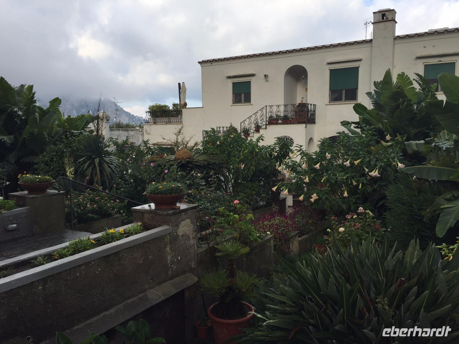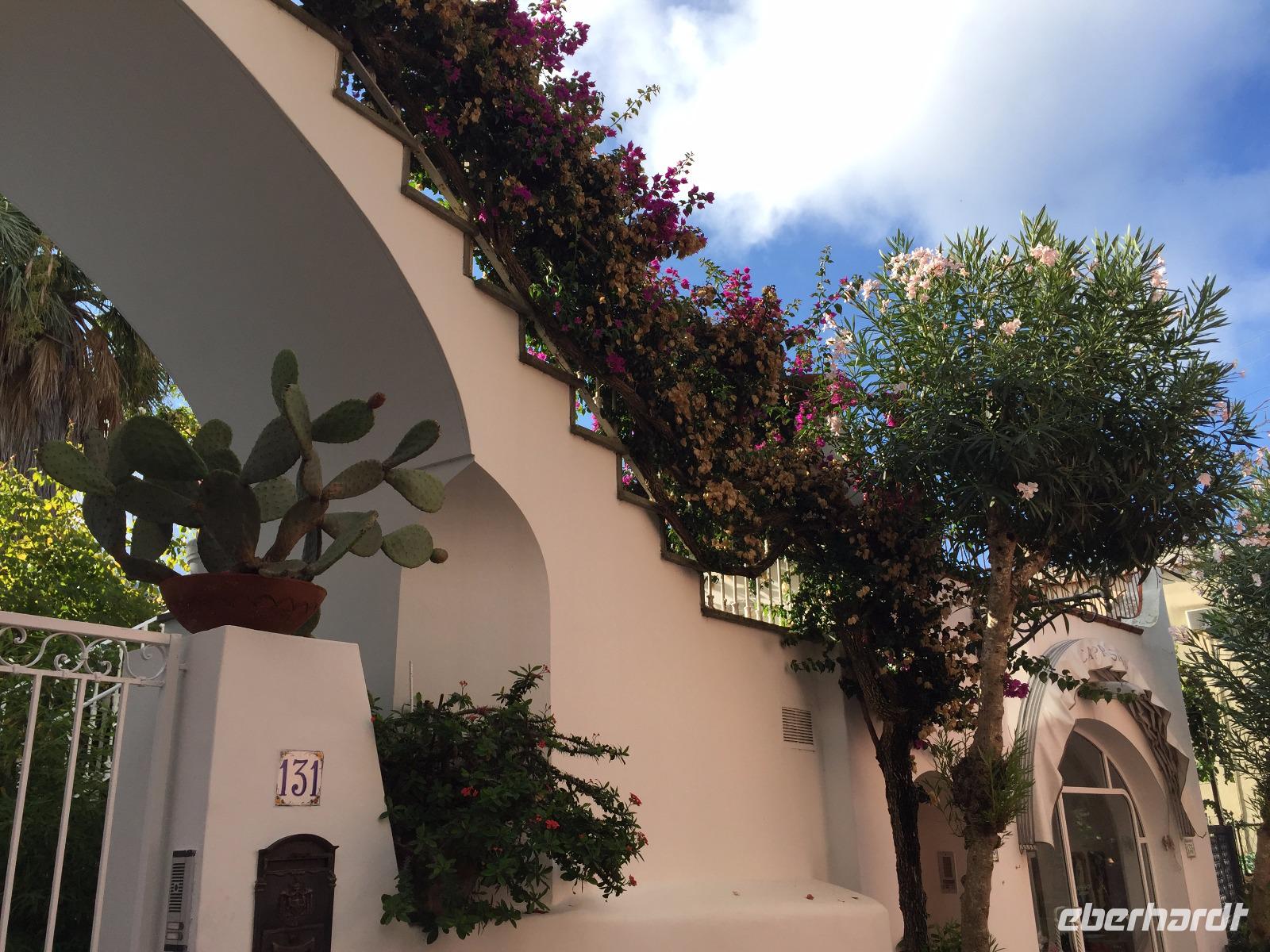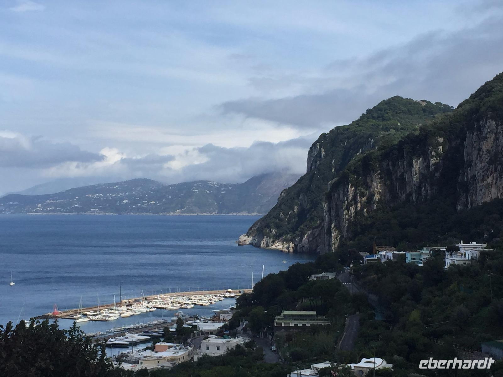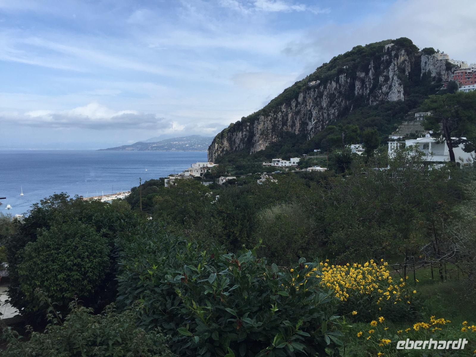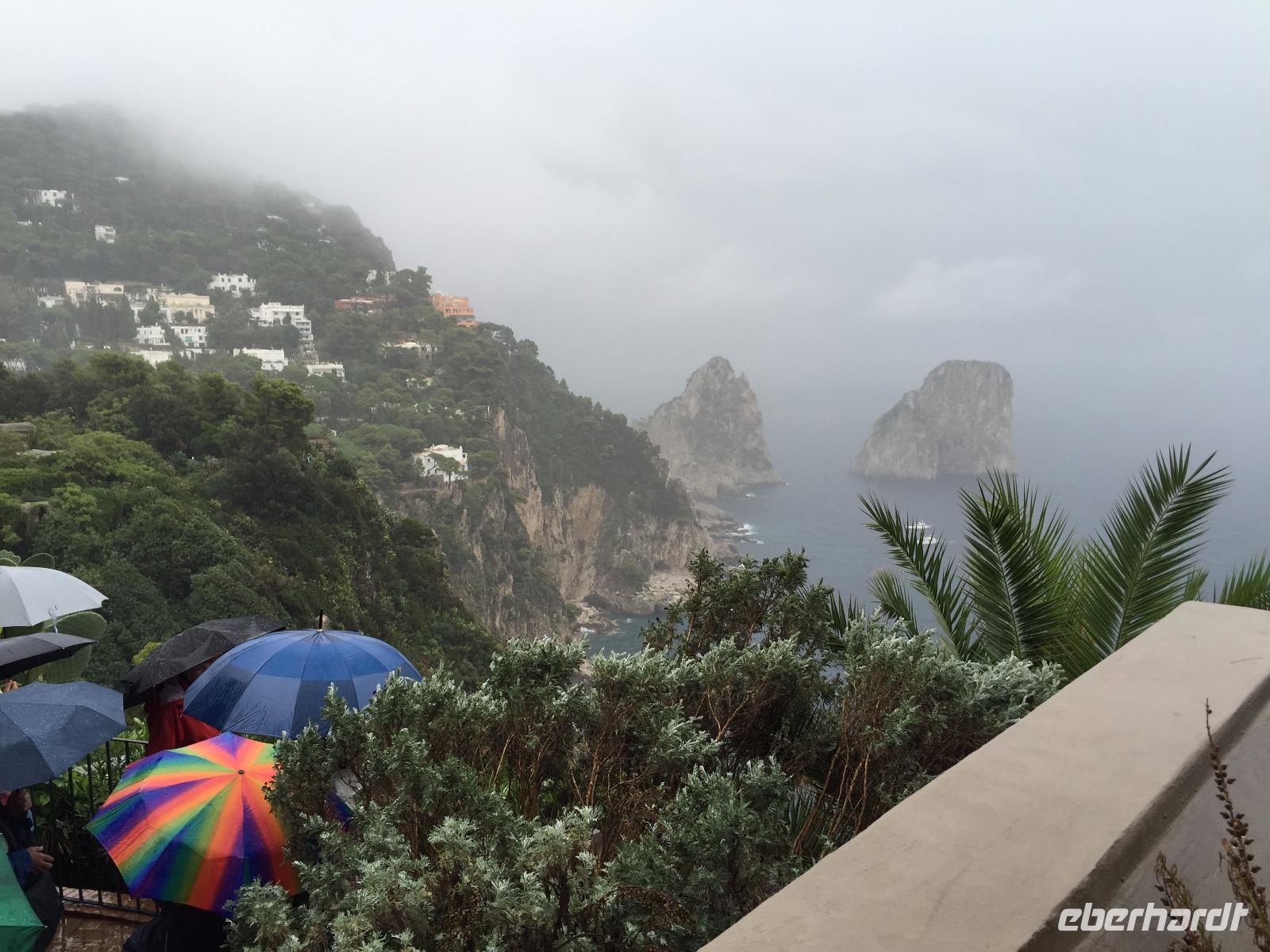 Nach einer geruhsamen Nacht und dem hervorragenden Frühstücksbuffet, dazu ein leckerer Cappuccino oder ein stärkender Espresso, treffen wir uns voller Tatendrang in der Lobby. Der morgendliche Regen trübt leider etwas die Stimmung. Wir einigen uns auf einen späteren Beginn unseres Spaziergangs. Der Regen lässt etwas nach und wir machen uns auf den Weg zur Piazzetta. Die Insel erwacht langsam und die ersten Boote mit Tagestouristen mit straffem Zeitplan erreichen die Insel. Auf der Piazzetta treffen wir unsere örtliche Reiseleiterin Annamaria, eine echte Capresin und somit perfekt für uns. Wir beginnen mit unserem Spaziergang hinauf zur Villa Jovis. Doch leider macht uns der erneut einsetzende Regen einen Strich durch die Rechnung und unsere Führung fällt sprichwörtlich ins Wasser. Wir entscheiden, unsere Wanderung hinauf auf den Monte Tiberio abzubrechen. Bei diesem Wetter macht es einfach keinen Spaß. Wir spazieren nun durch die Gassen von Capri-Stadt und sind über jeden Lauben- und Bogengang froh, der uns vor dem Regen schützt. Wir spazieren vorbei am legendären Grand-Hotel Quisisana und finden in der Parfumerie Carthusia Schutz. Carthusia ist der Duft der Insel Capri, welcher bis 2002 ausschließlich auf der Insel zu haben war. Von hier sind es nur wenige Meter zu den berühmten Augustusgärten, die einen schönen Blick auf die Faraglioni-Felsen und die Via Krupp bieten.