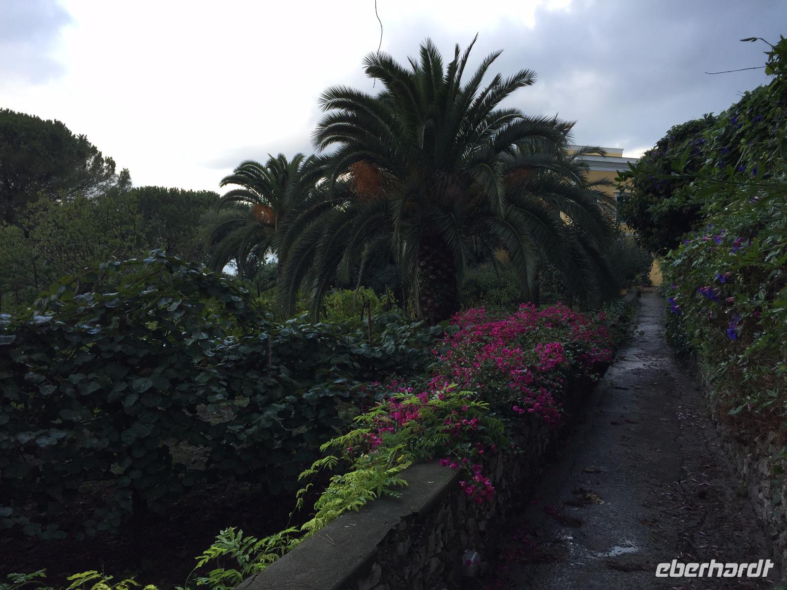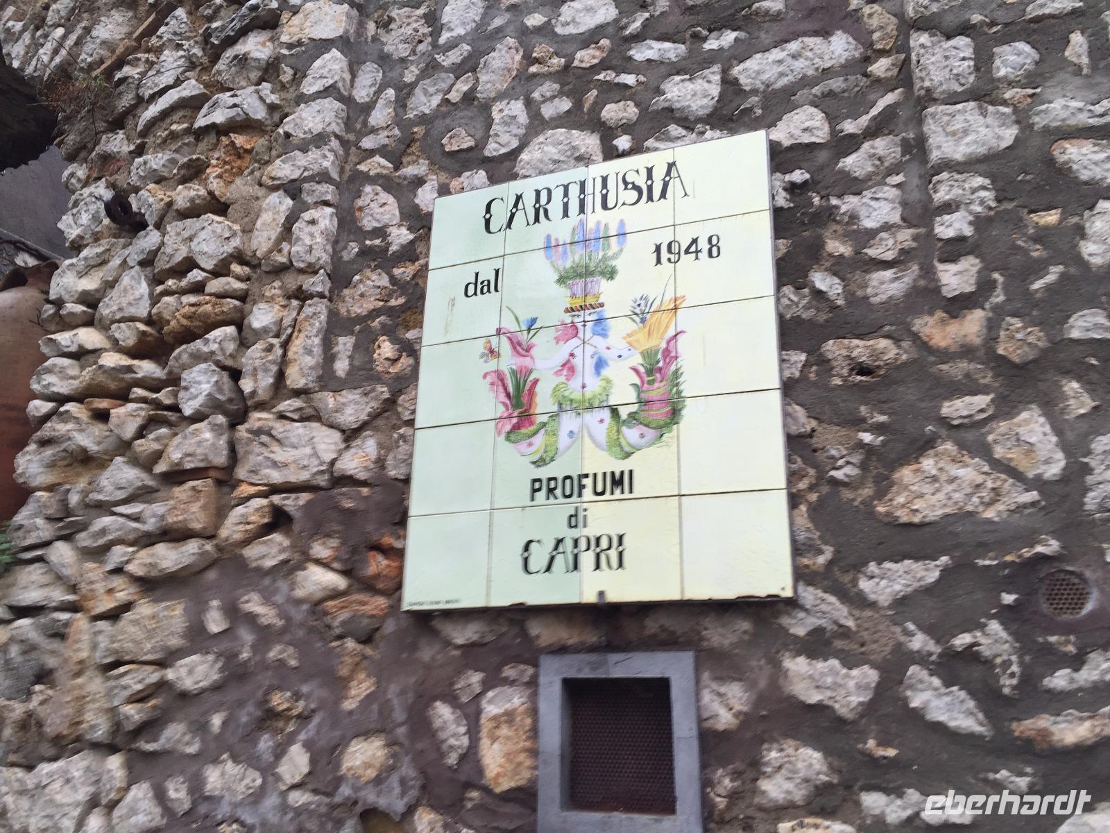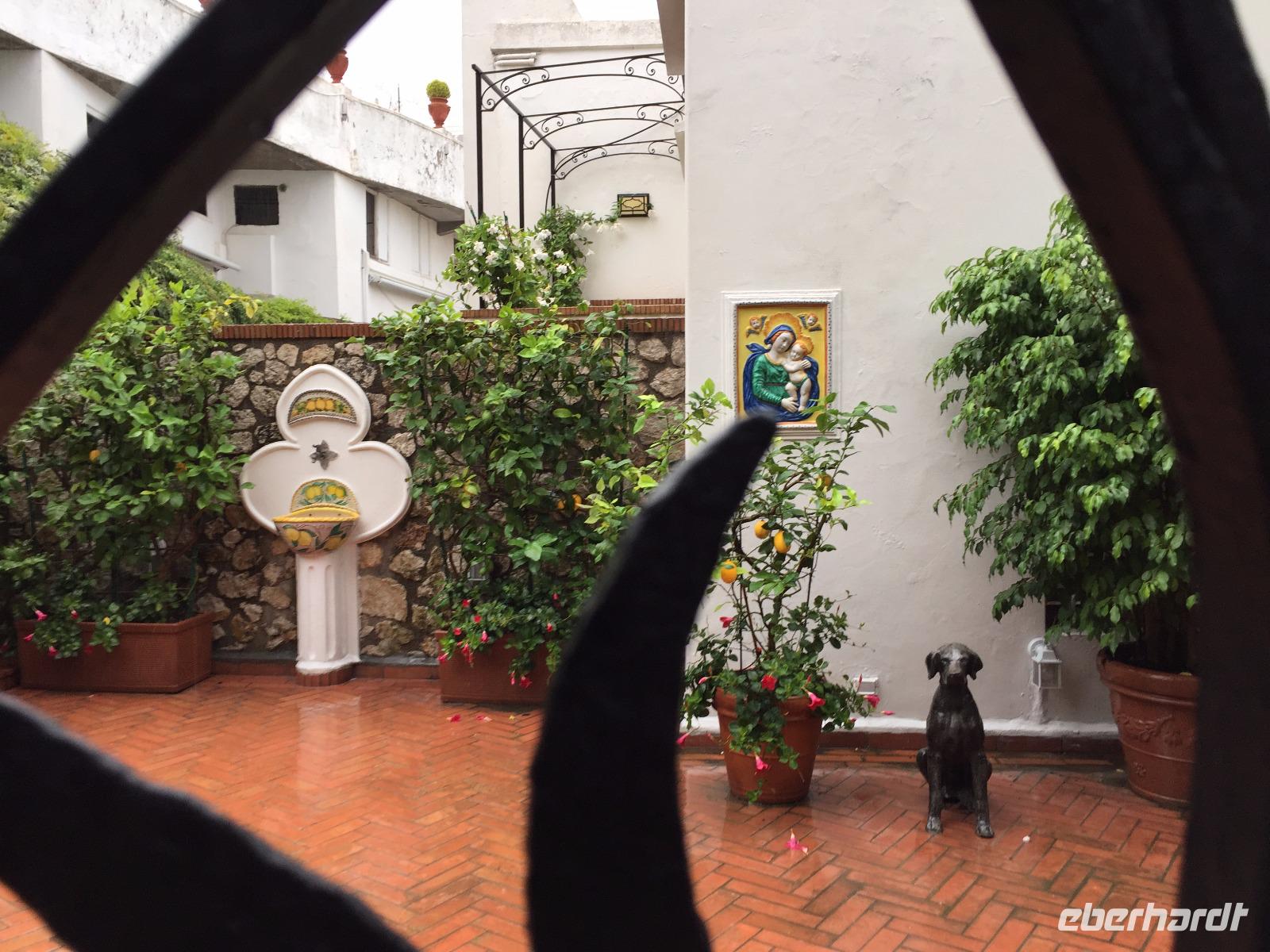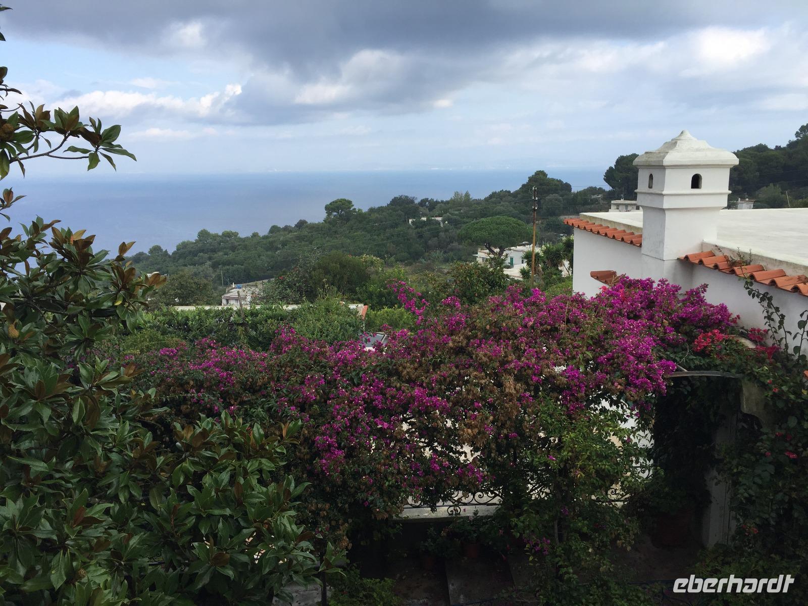 Nach einer geruhsamen Nacht und dem hervorragenden Frühstücksbuffet, dazu ein leckerer Cappuccino oder ein stärkender Espresso, treffen wir uns voller Tatendrang in der Lobby. Der morgendliche Regen trübt leider etwas die Stimmung. Wir einigen uns auf einen späteren Beginn unseres Spaziergangs. Der Regen lässt etwas nach und wir machen uns auf den Weg zur Piazzetta. Die Insel erwacht langsam und die ersten Boote mit Tagestouristen mit straffem Zeitplan erreichen die Insel. Auf der Piazzetta treffen wir unsere örtliche Reiseleiterin Annamaria, eine echte Capresin und somit perfekt für uns. Wir beginnen mit unserem Spaziergang hinauf zur Villa Jovis. Doch leider macht uns der erneut einsetzende Regen einen Strich durch die Rechnung und unsere Führung fällt sprichwörtlich ins Wasser. Wir entscheiden, unsere Wanderung hinauf auf den Monte Tiberio abzubrechen. Bei diesem Wetter macht es einfach keinen Spaß. Wir spazieren nun durch die Gassen von Capri-Stadt und sind über jeden Lauben- und Bogengang froh, der uns vor dem Regen schützt. Wir spazieren vorbei am legendären Grand-Hotel Quisisana und finden in der Parfumerie Carthusia Schutz. Carthusia ist der Duft der Insel Capri, welcher bis 2002 ausschließlich auf der Insel zu haben war. Von hier sind es nur wenige Meter zu den berühmten Augustusgärten, die einen schönen Blick auf die Faraglioni-Felsen und die Via Krupp bieten.