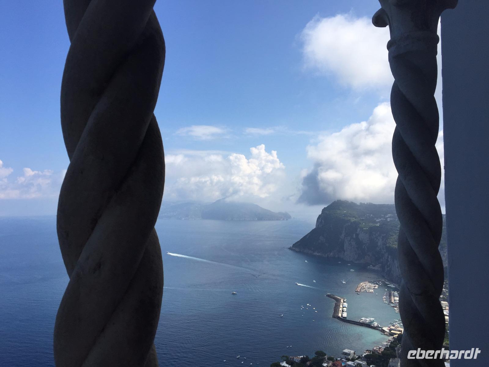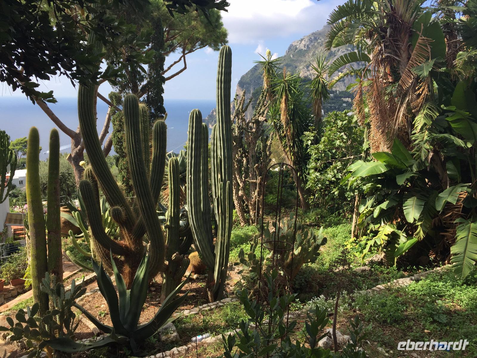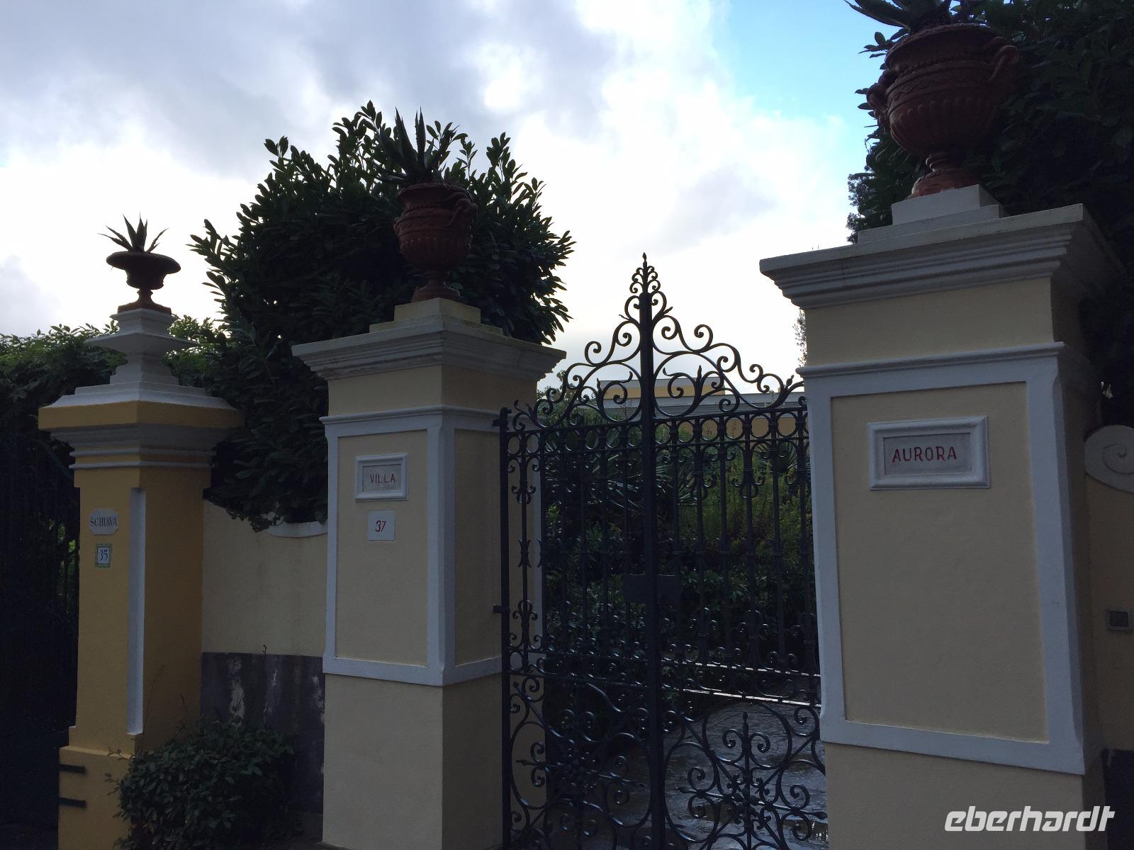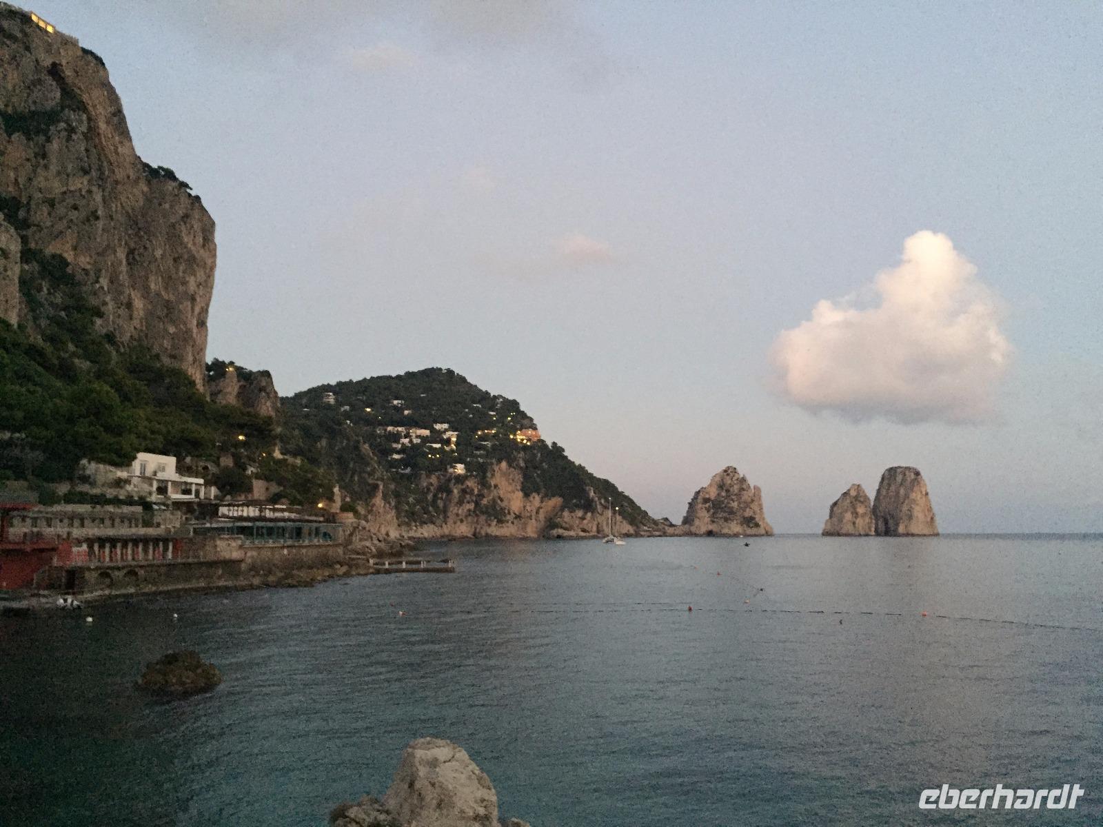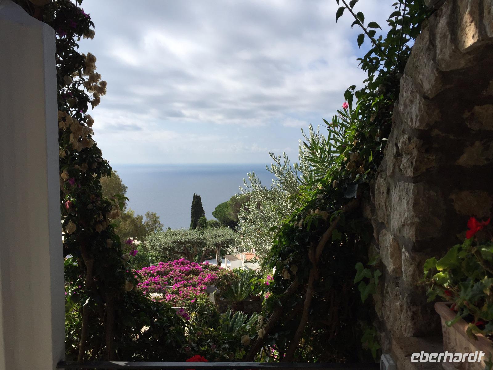 Nach einer geruhsamen Nacht und dem hervorragenden Frühstücksbuffet, dazu ein leckerer Cappuccino oder ein stärkender Espresso, treffen wir uns voller Tatendrang in der Lobby. Der morgendliche Regen trübt leider etwas die Stimmung. Wir einigen uns auf einen späteren Beginn unseres Spaziergangs. Der Regen lässt etwas nach und wir machen uns auf den Weg zur Piazzetta. Die Insel erwacht langsam und die ersten Boote mit Tagestouristen mit straffem Zeitplan erreichen die Insel. Auf der Piazzetta treffen wir unsere örtliche Reiseleiterin Annamaria, eine echte Capresin und somit perfekt für uns. Wir beginnen mit unserem Spaziergang hinauf zur Villa Jovis. Doch leider macht uns der erneut einsetzende Regen einen Strich durch die Rechnung und unsere Führung fällt sprichwörtlich ins Wasser. Wir entscheiden, unsere Wanderung hinauf auf den Monte Tiberio abzubrechen. Bei diesem Wetter macht es einfach keinen Spaß. Wir spazieren nun durch die Gassen von Capri-Stadt und sind über jeden Lauben- und Bogengang froh, der uns vor dem Regen schützt. Wir spazieren vorbei am legendären Grand-Hotel Quisisana und finden in der Parfumerie Carthusia Schutz. Carthusia ist der Duft der Insel Capri, welcher bis 2002 ausschließlich auf der Insel zu haben war. Von hier sind es nur wenige Meter zu den berühmten Augustusgärten, die einen schönen Blick auf die Faraglioni-Felsen und die Via Krupp bieten.