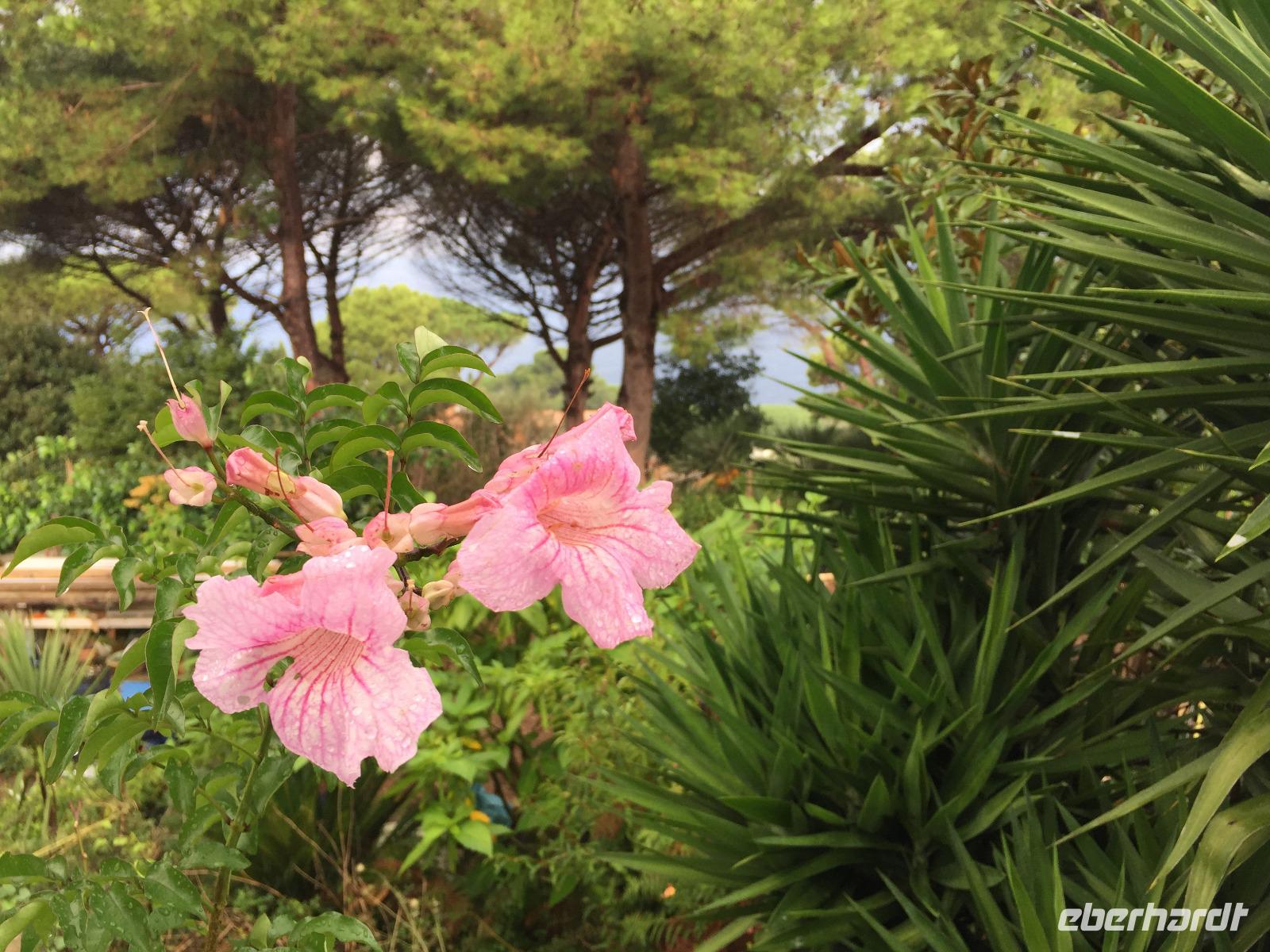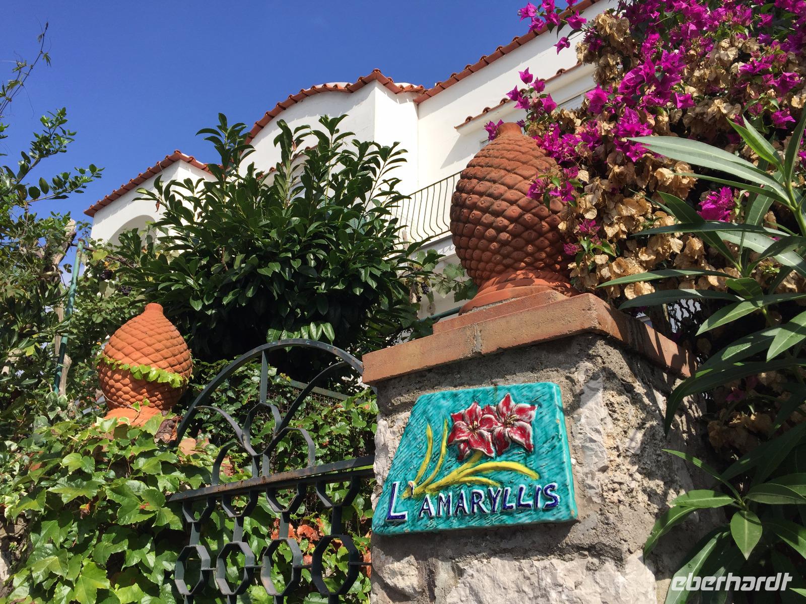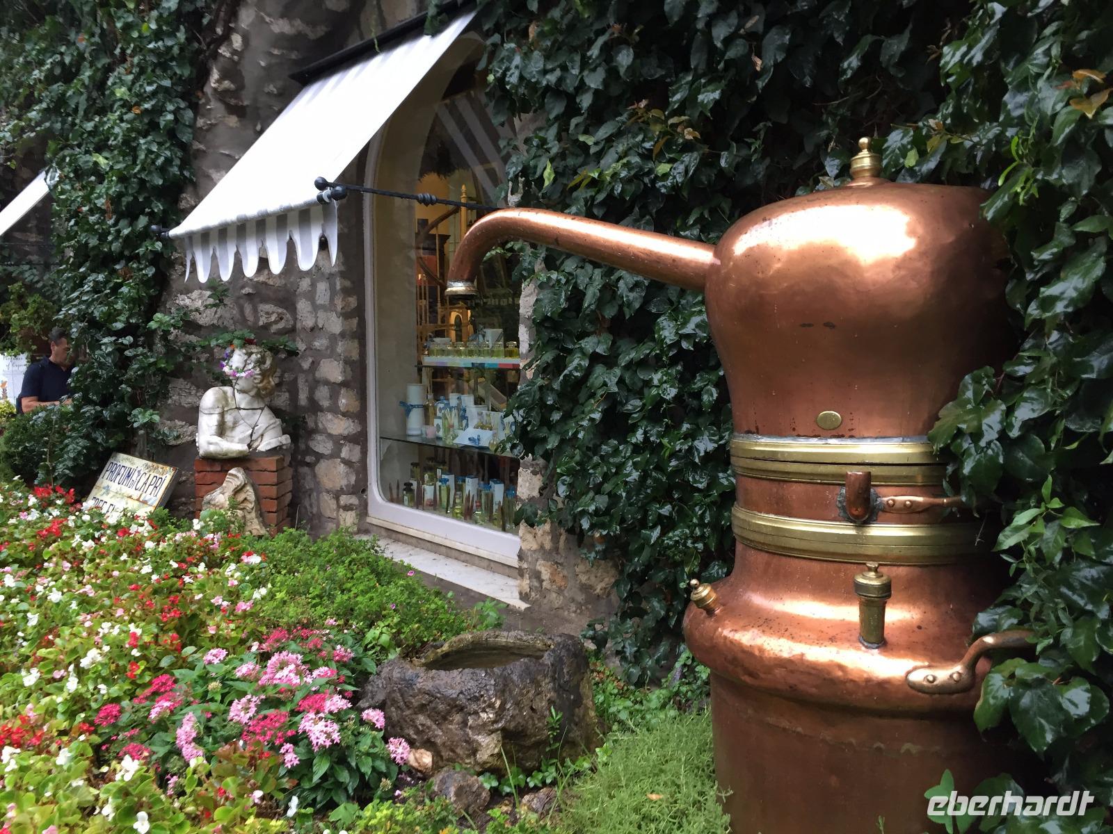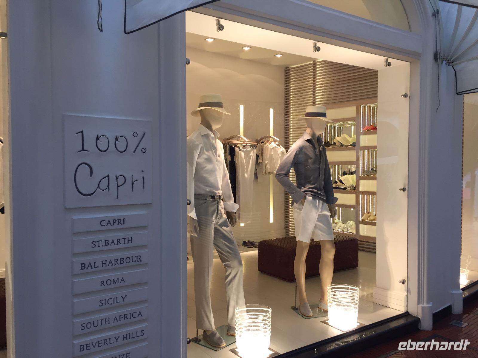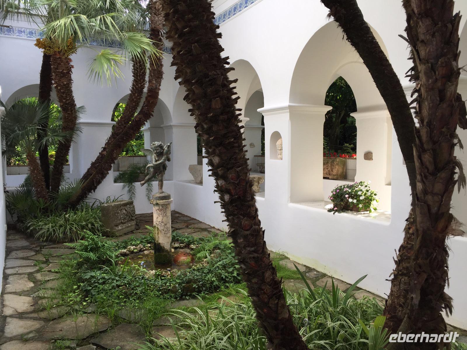 Nach einer geruhsamen Nacht und dem hervorragenden Frühstücksbuffet, dazu ein leckerer Cappuccino oder ein stärkender Espresso, treffen wir uns voller Tatendrang in der Lobby. Der morgendliche Regen trübt leider etwas die Stimmung. Wir einigen uns auf einen späteren Beginn unseres Spaziergangs. Der Regen lässt etwas nach und wir machen uns auf den Weg zur Piazzetta. Die Insel erwacht langsam und die ersten Boote mit Tagestouristen mit straffem Zeitplan erreichen die Insel. Auf der Piazzetta treffen wir unsere örtliche Reiseleiterin Annamaria, eine echte Capresin und somit perfekt für uns. Wir beginnen mit unserem Spaziergang hinauf zur Villa Jovis. Doch leider macht uns der erneut einsetzende Regen einen Strich durch die Rechnung und unsere Führung fällt sprichwörtlich ins Wasser. Wir entscheiden, unsere Wanderung hinauf auf den Monte Tiberio abzubrechen. Bei diesem Wetter macht es einfach keinen Spaß. Wir spazieren nun durch die Gassen von Capri-Stadt und sind über jeden Lauben- und Bogengang froh, der uns vor dem Regen schützt. Wir spazieren vorbei am legendären Grand-Hotel Quisisana und finden in der Parfumerie Carthusia Schutz. Carthusia ist der Duft der Insel Capri, welcher bis 2002 ausschließlich auf der Insel zu haben war. Von hier sind es nur wenige Meter zu den berühmten Augustusgärten, die einen schönen Blick auf die Faraglioni-Felsen und die Via Krupp bieten.