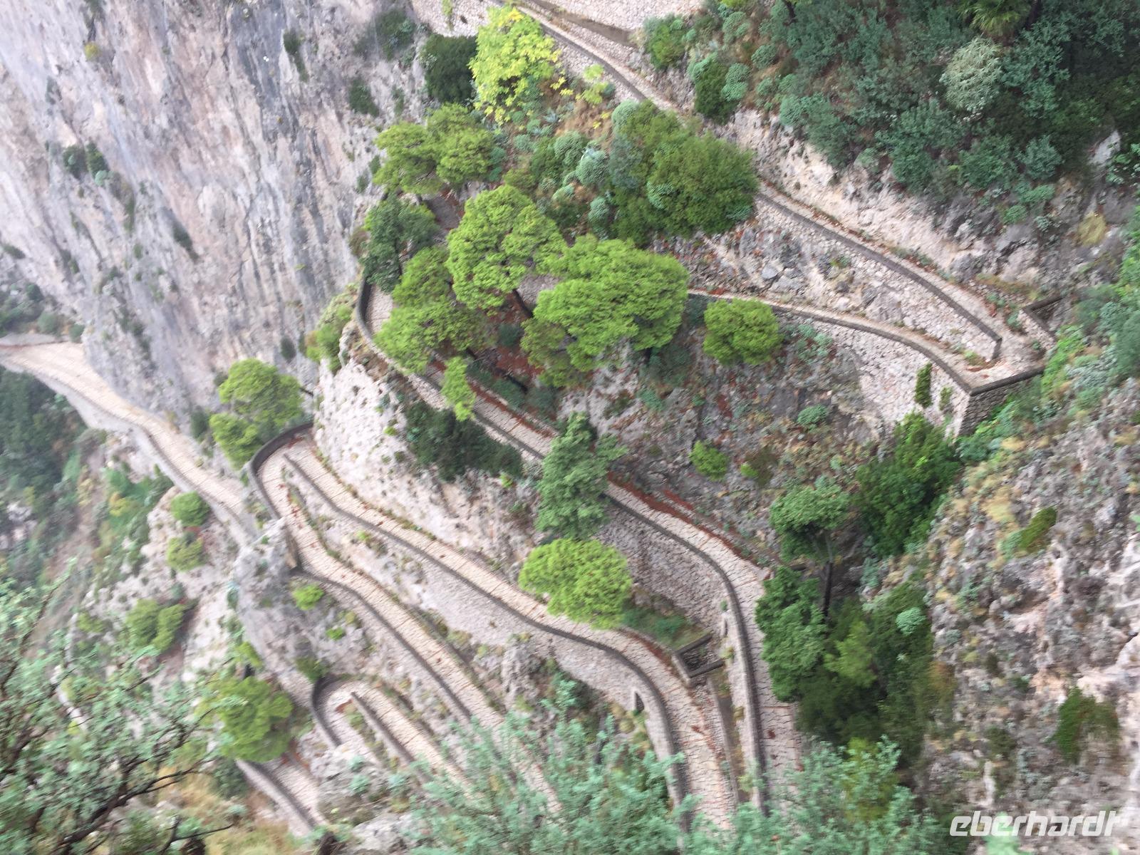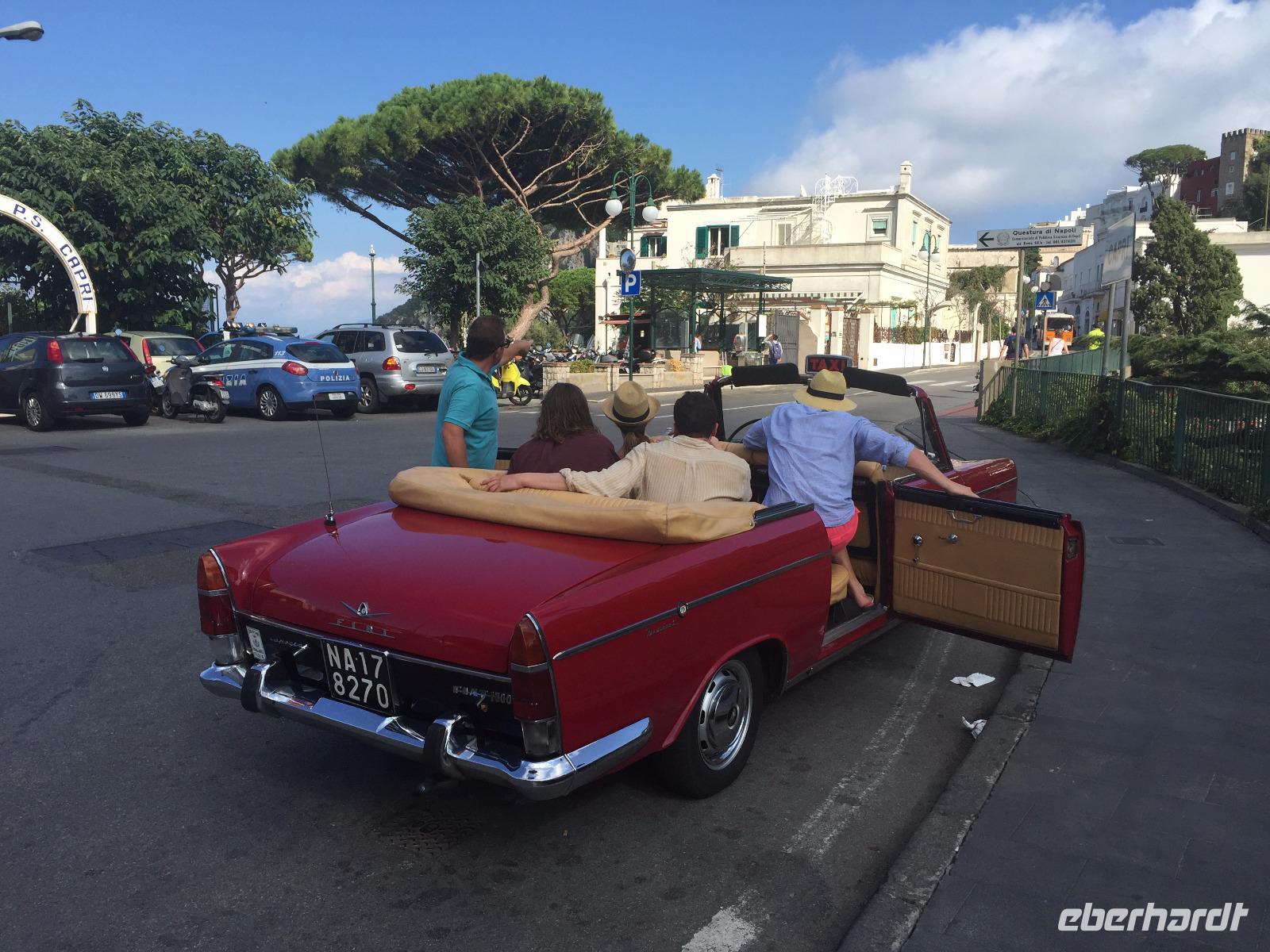 Auf dem Rückweg hinunter zur Piazza Vittoria teilen wir uns auf: entweder wieder zurück mit dem Sessellift (die gemütliche Variante) oder zu Fuß in ca. 1 Stunde auf einem angenehmen Wanderweg (die sportliche Variante). Als kleine Entschädigung für den verpassten Ausblick vom Monte Solaro fahren wir standesgemäß mit den Cabrio-Taxen auf der Mamma-Mia-Straße wieder hinunter nach Capri-Stadt.