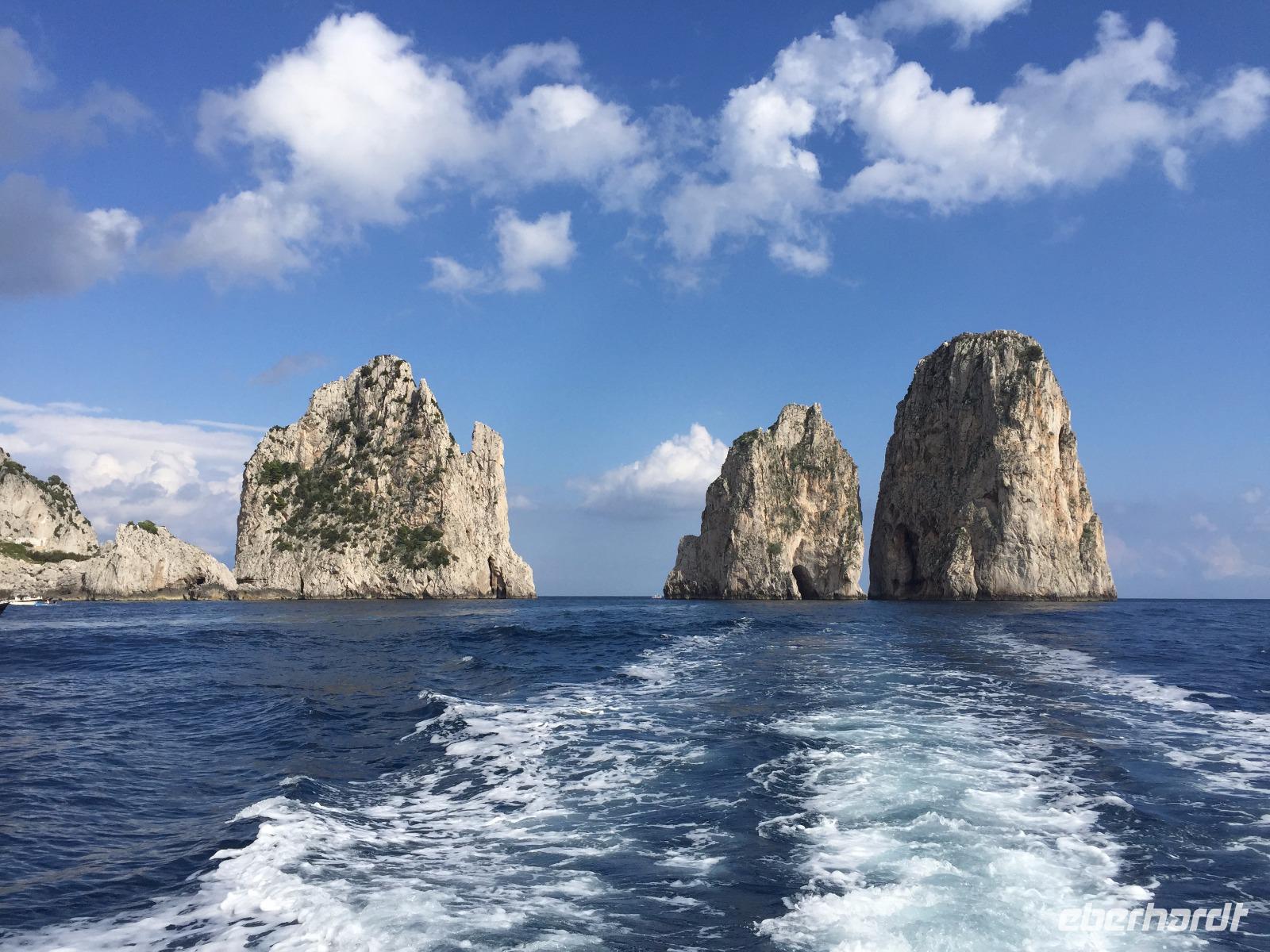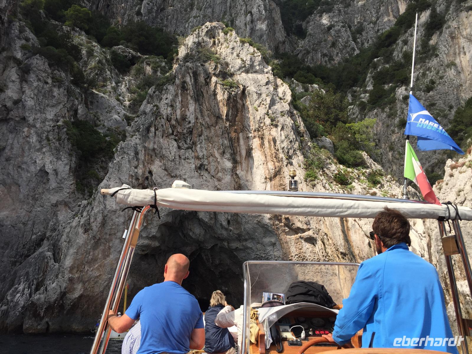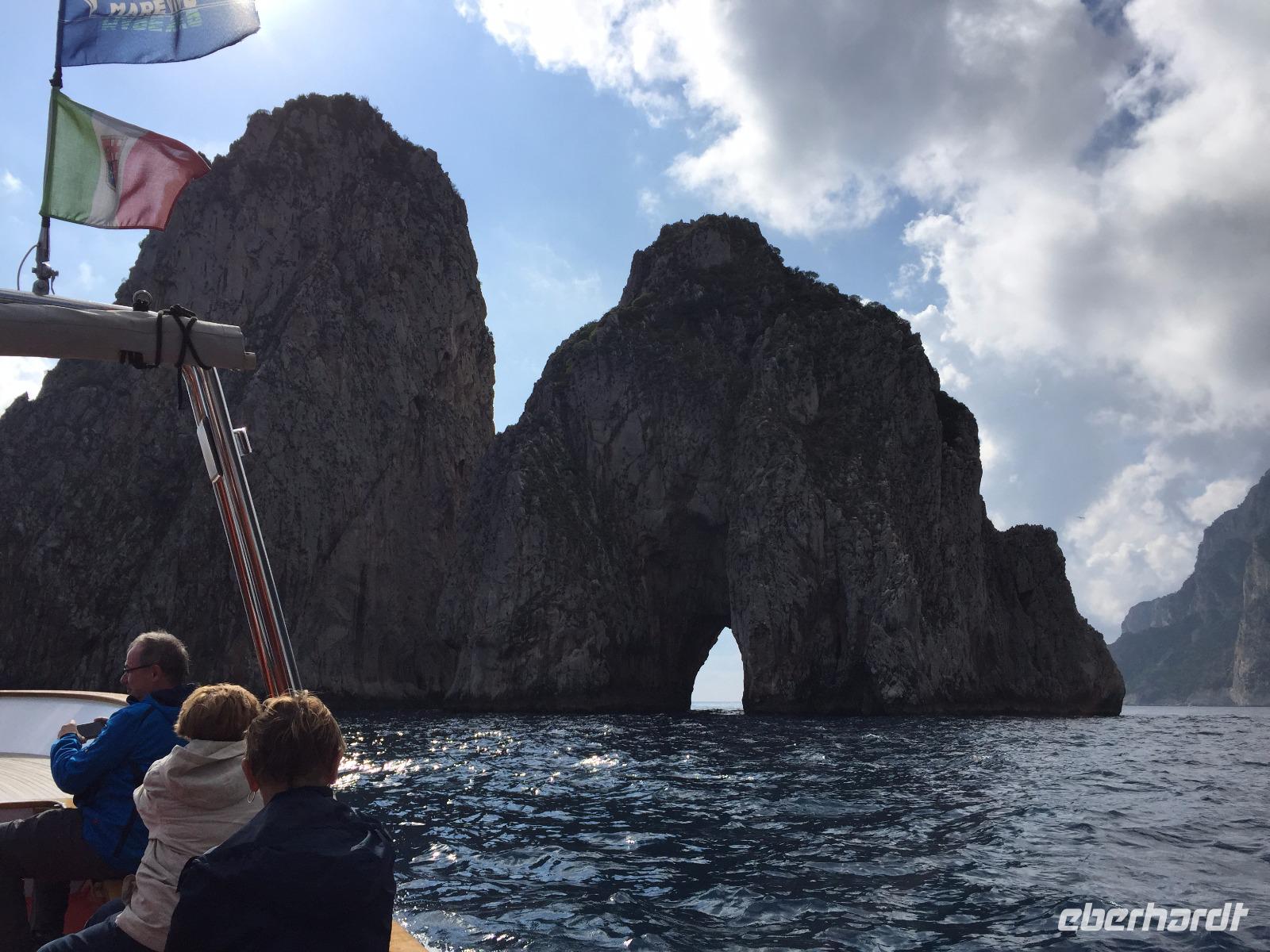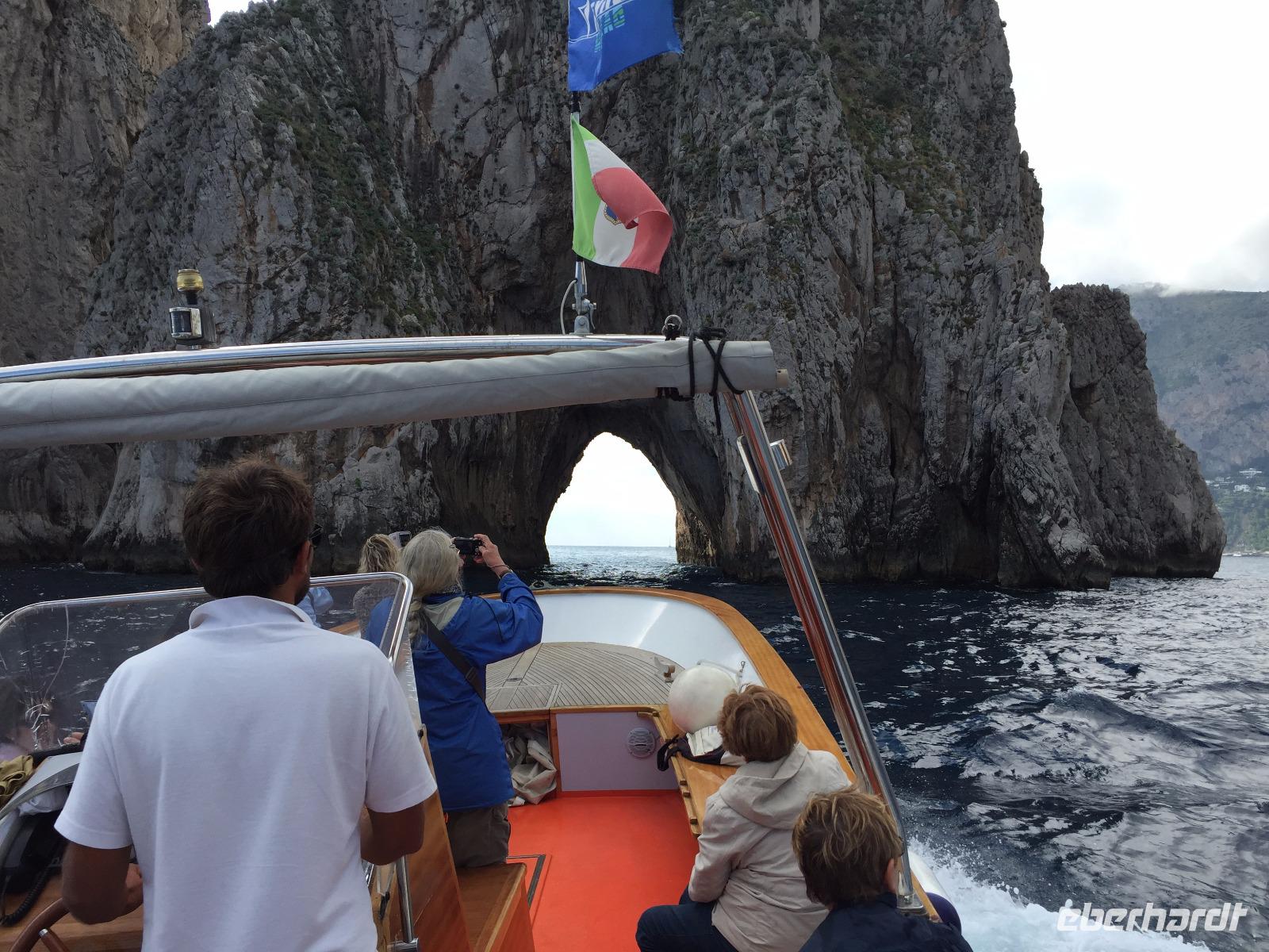 Gemeinsam fahren wir am Nachmittag hinunter zur Marina Grande, wo unser Bootsmann schon für die Inselrundfahrt auf uns wartet. Wir genießen die aussichtsreiche Fahrt in unserem privaten Boot und lernen die Insel aus einer ganz anderen Perspektive kennen. Annamaria kann den Bootsmann überreden, dass wir auch bei dem recht aktiven See die komplette Runde um die Insel machen. Wir sehen DIE Wahrzeichen der Insel - die Faraglioni-Felsen, viele Grotten (weiße Grotte, grüne Grotte, blaue Grotte), den Arco Naturale von der Wasserseite aus, den Hafen Marina Piccola (und das Haus von Annamaria) und die Via Krupp, ein historischer Serpentinenpfad an der Südküste der Insel. Mit einem Limoncello stoßen wir auf eine gelungene Inselrundfahrt und sicherlich einem weiteren Höhepunkt unserer Reise an.