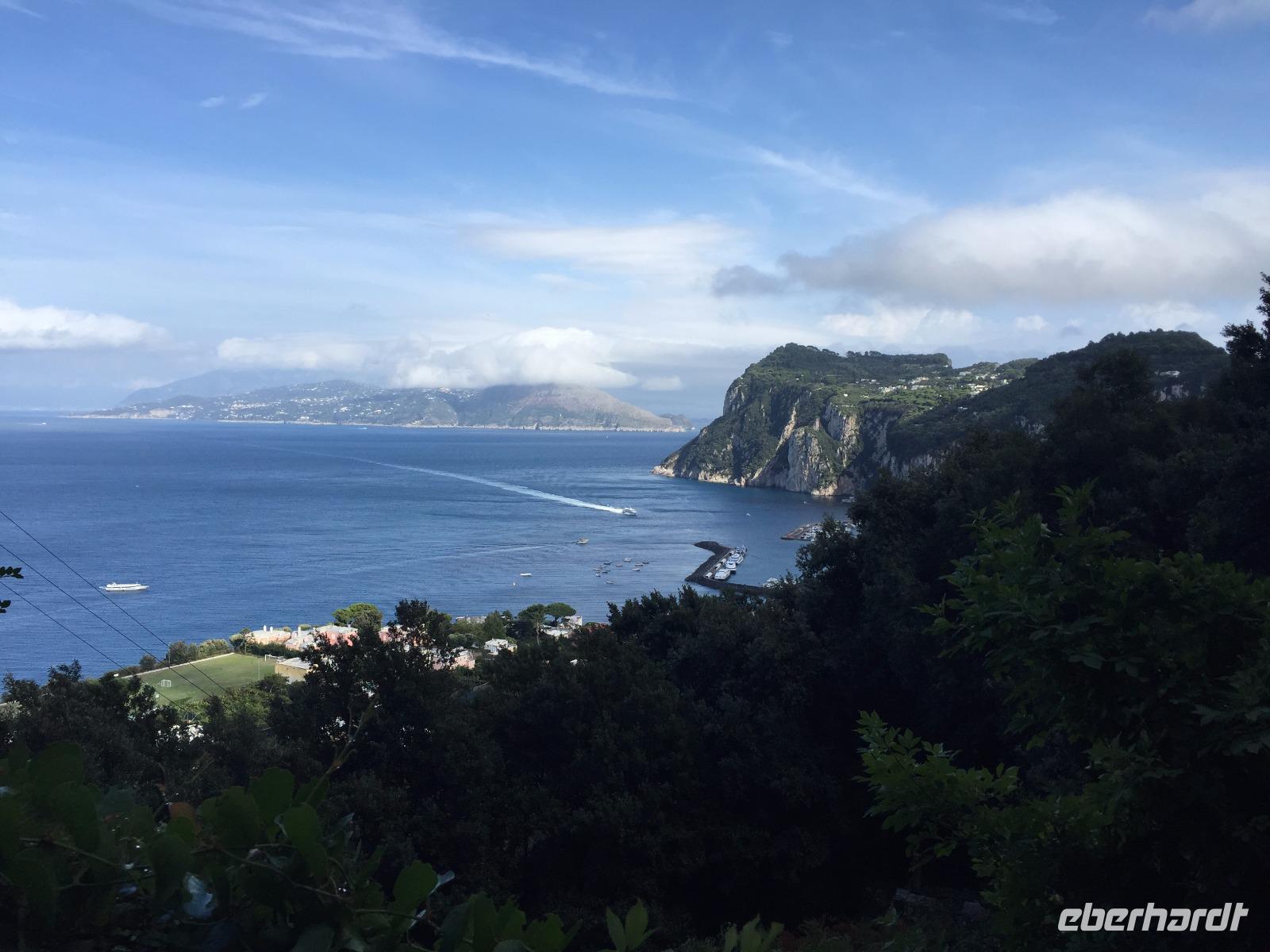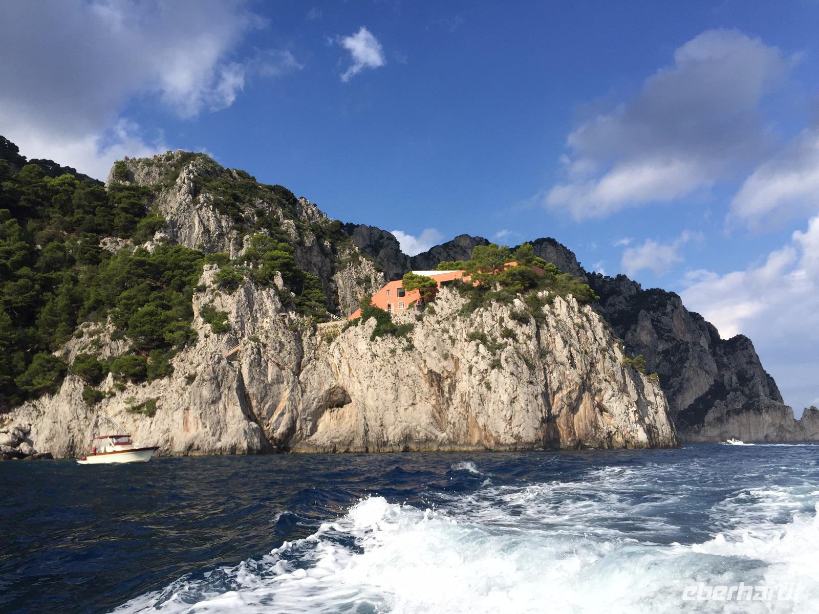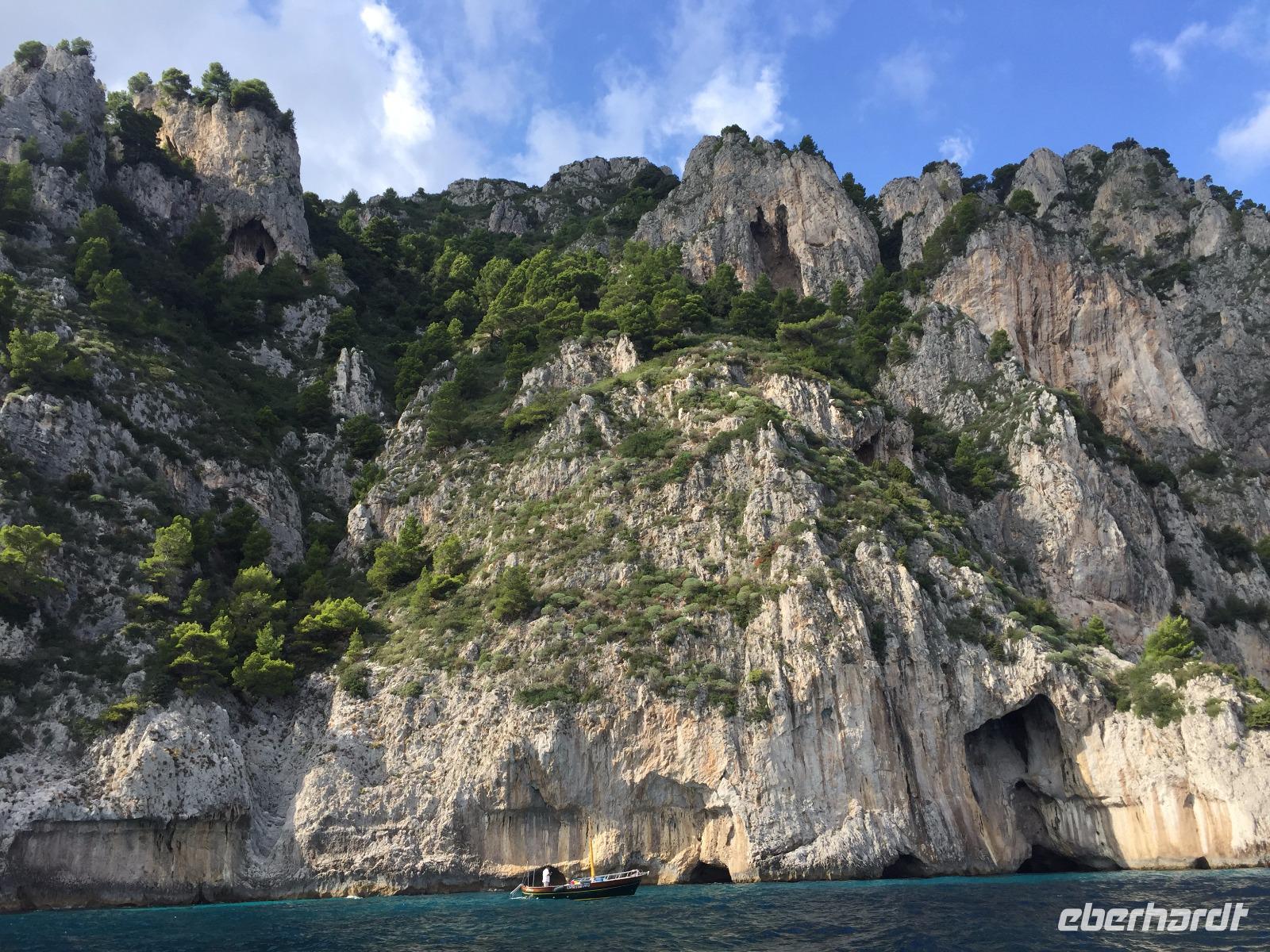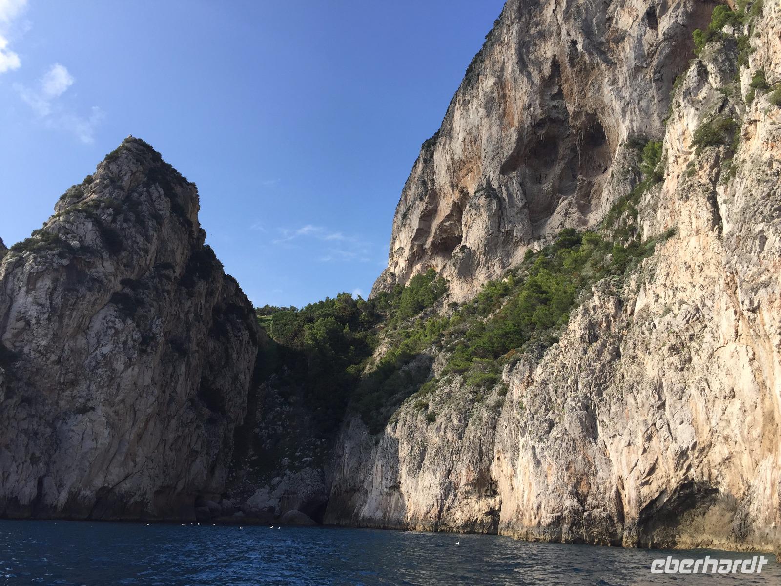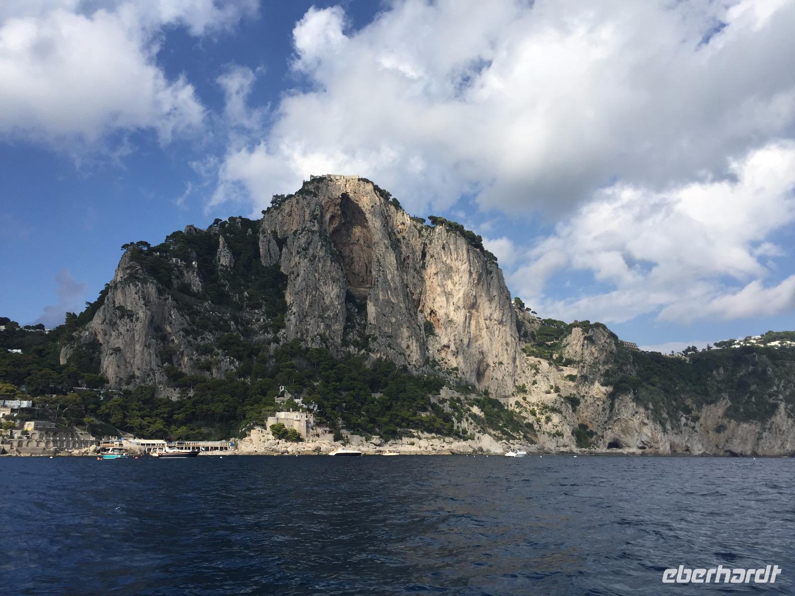Gemeinsam fahren wir am Nachmittag hinunter zur Marina Grande, wo unser Bootsmann schon für die Inselrundfahrt auf uns wartet. Wir genießen die aussichtsreiche Fahrt in unserem privaten Boot und lernen die Insel aus einer ganz anderen Perspektive kennen. Annamaria kann den Bootsmann überreden, dass wir auch bei dem recht aktiven See die komplette Runde um die Insel machen. Wir sehen DIE Wahrzeichen der Insel - die Faraglioni-Felsen, viele Grotten (weiße Grotte, grüne Grotte, blaue Grotte), den Arco Naturale von der Wasserseite aus, den Hafen Marina Piccola (und das Haus von Annamaria) und die Via Krupp, ein historischer Serpentinenpfad an der Südküste der Insel. Mit einem Limoncello stoßen wir auf eine gelungene Inselrundfahrt und sicherlich einem weiteren Höhepunkt unserer Reise an.