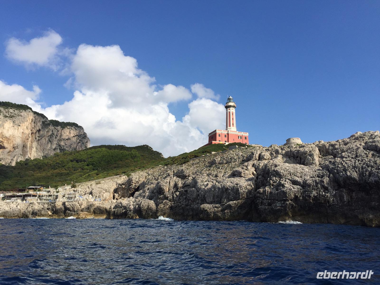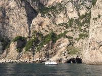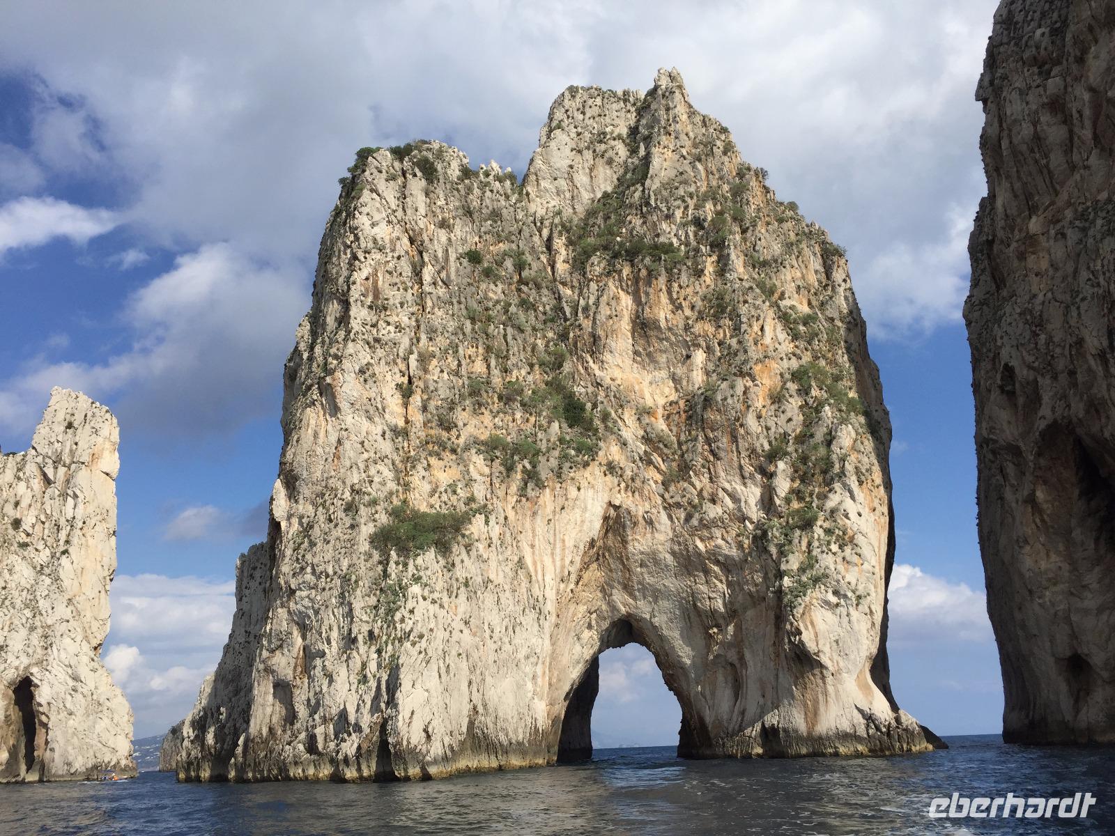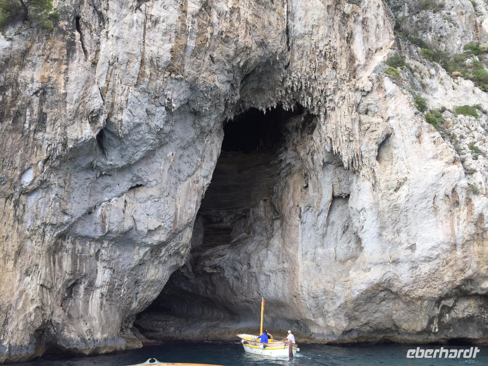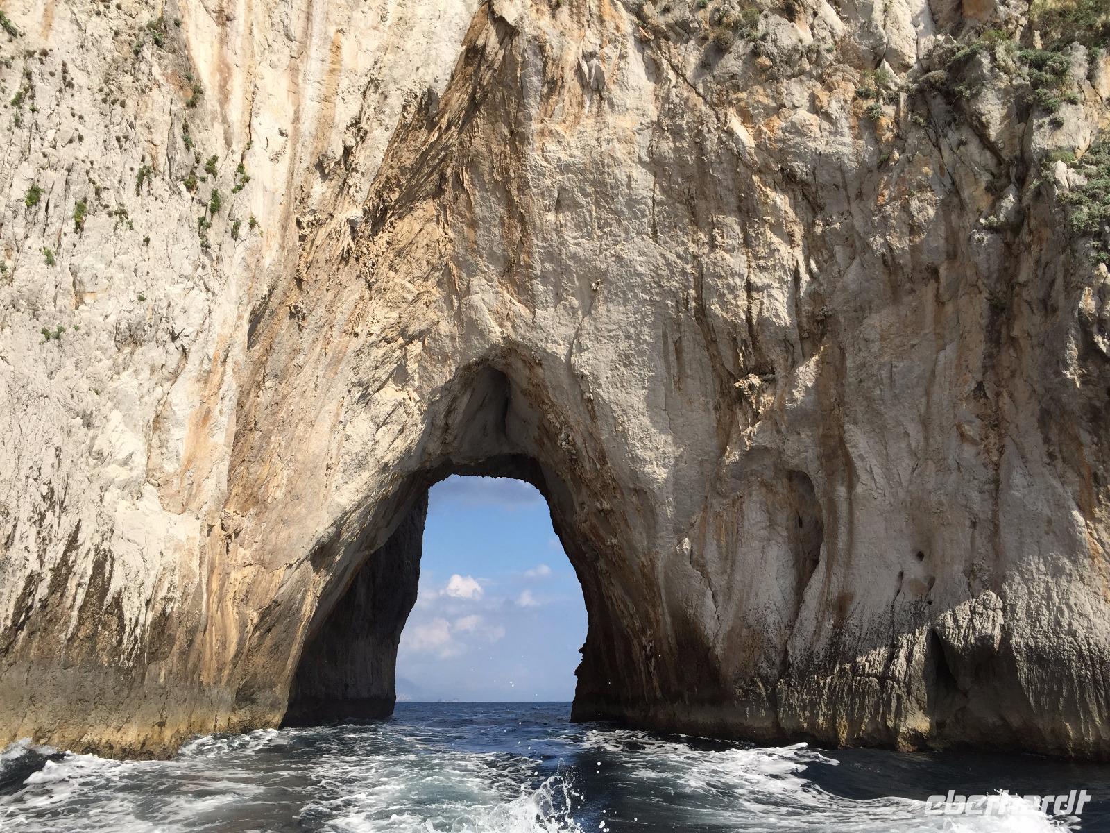 Gemeinsam fahren wir am Nachmittag hinunter zur Marina Grande, wo unser Bootsmann schon für die Inselrundfahrt auf uns wartet. Wir genießen die aussichtsreiche Fahrt in unserem privaten Boot und lernen die Insel aus einer ganz anderen Perspektive kennen. Annamaria kann den Bootsmann überreden, dass wir auch bei dem recht aktiven See die komplette Runde um die Insel machen. Wir sehen DIE Wahrzeichen der Insel - die Faraglioni-Felsen, viele Grotten (weiße Grotte, grüne Grotte, blaue Grotte), den Arco Naturale von der Wasserseite aus, den Hafen Marina Piccola (und das Haus von Annamaria) und die Via Krupp, ein historischer Serpentinenpfad an der Südküste der Insel. Mit einem Limoncello stoßen wir auf eine gelungene Inselrundfahrt und sicherlich einem weiteren Höhepunkt unserer Reise an.