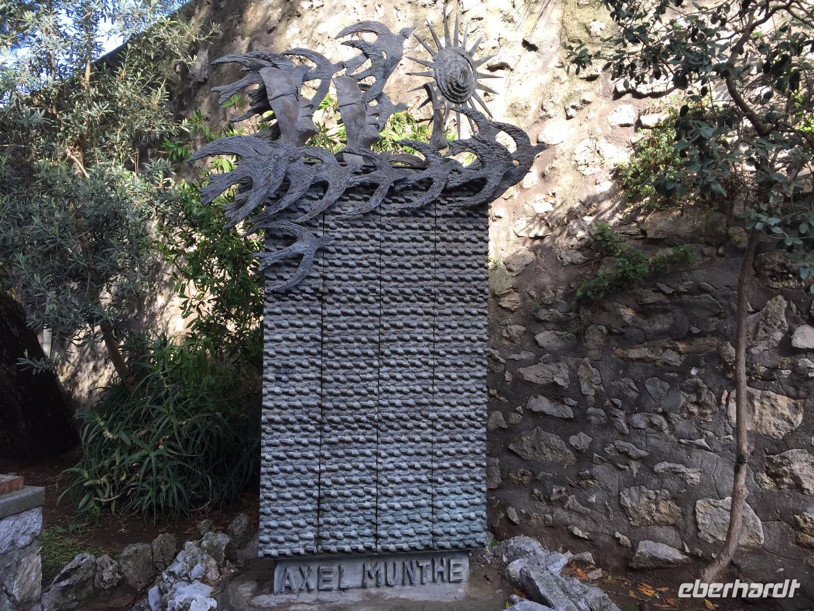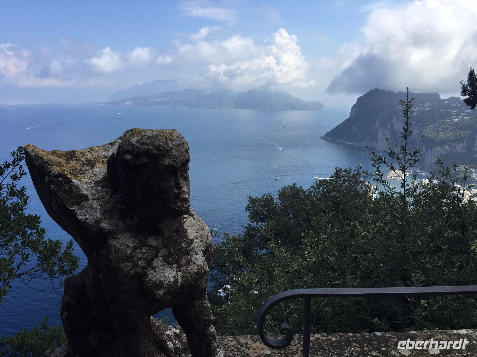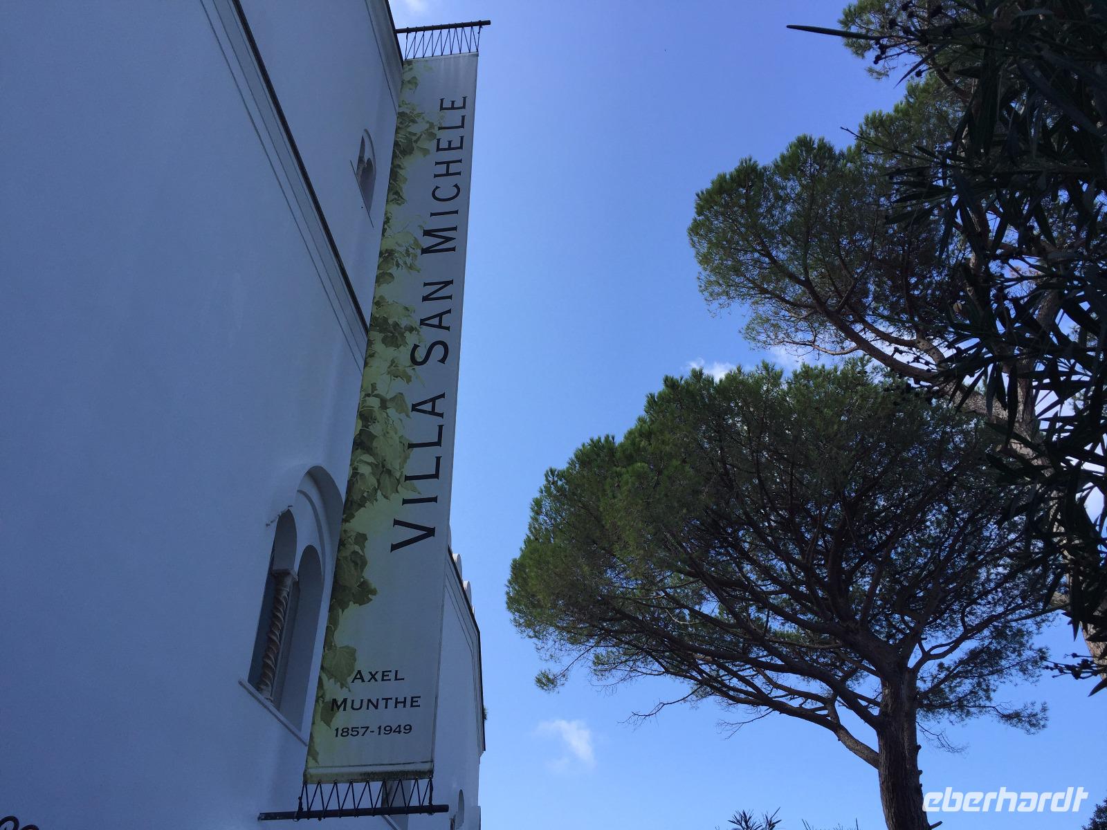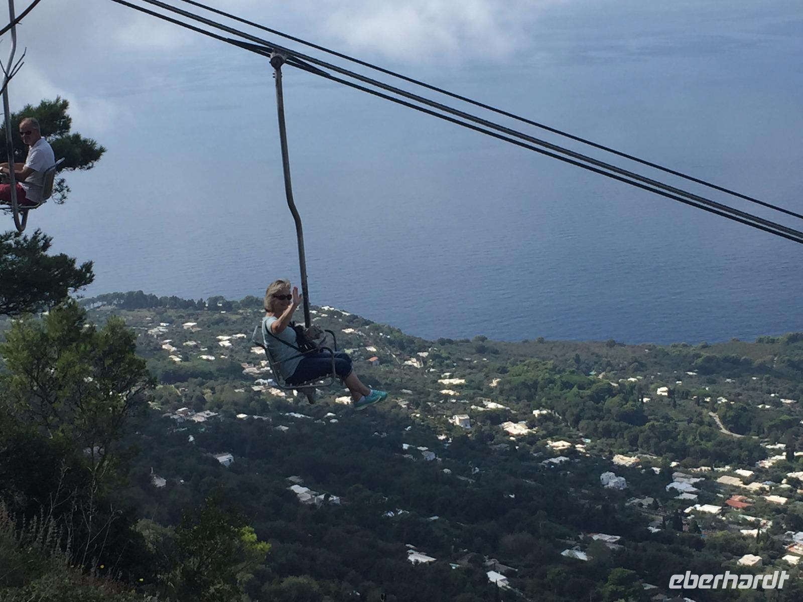 Annamaria führt uns über die Viale Axel Munthe zur Villa des berühmten schwedischen Arztes und Schriftstellers, der mit dem Buch von San Michele Weltruhm erlangte. Wir besichtigen die Wohn- und Arbeitsräume der schönen Villa und bestaunen den wunderschönen Garten mit dem tollen Blick auf die Insel. Nach ein wenig Freizeit zum Bummeln geht es hoch hinaus. Mit dem Sessellift (Einzelsitzer) schweben wir auf den höchsten Punkt der Insel - auf den 589 Meter hohen Monte Solaro. Der spektakuläre Ausblick bleibt uns durch den aufsteigenden Nebel an der Südseite der Insel leider verwehrt. Wir suchen uns ein ruhiges Fleckchen und genießen ein kleines Picknick, typisch mit Panini Caprese (Baguette mit Tomaten und Mozzarella) und guten Wein.