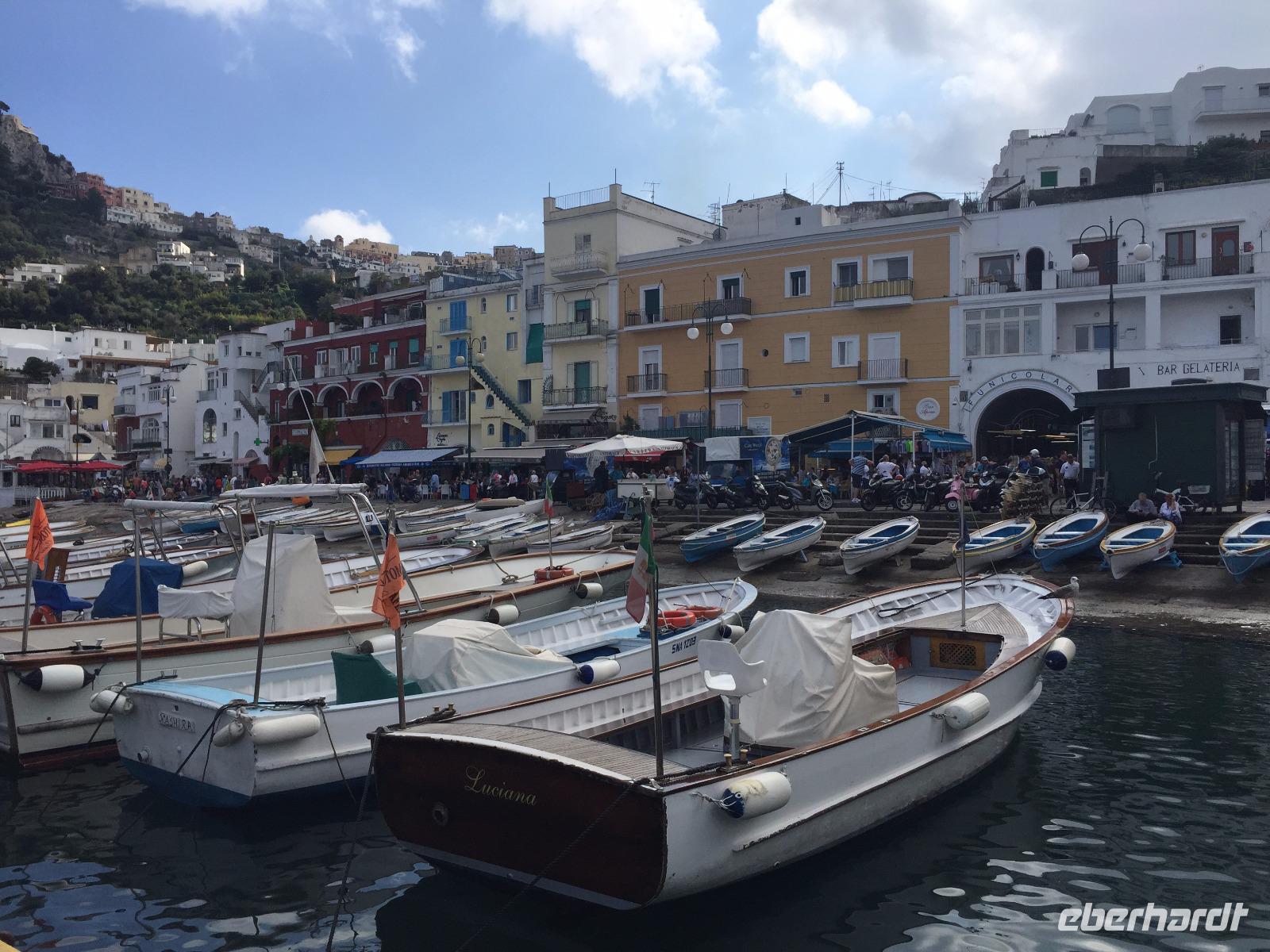 Schon recht zeitig treffen sich 7 erwartungsvolle Reisegäste und Reisebegleiter Patrick am Flughafen in Dresden für den kurzen Flug nach Frankfurt. Hier stoßen noch 4 weitere Reisegäste hinzu und wir machen uns mit Lufthansa auf den Weg nach Neapel. Hier landen wir am zeitigen Nachmittag, sodass wir die Schnellfähre um 14 Uhr auf die wohl berühmteste Insel der Welt machen - Capri, die Diva im Golf von Neapel ist unser Domizil für die nächsten 4 Nächte. Nach knapp 45 Minuten Fahrt erreichen wir den Hafen Marina Grande, wo sich schon die Tagestouristen tummeln, um ja pünktlich wieder am Schiff für die Rückfahrt zu sein.