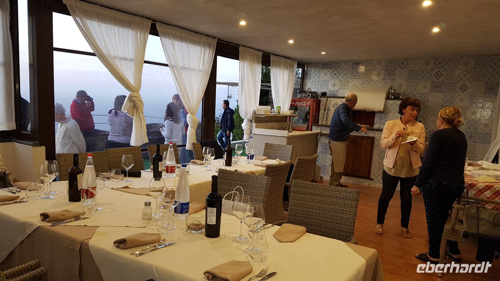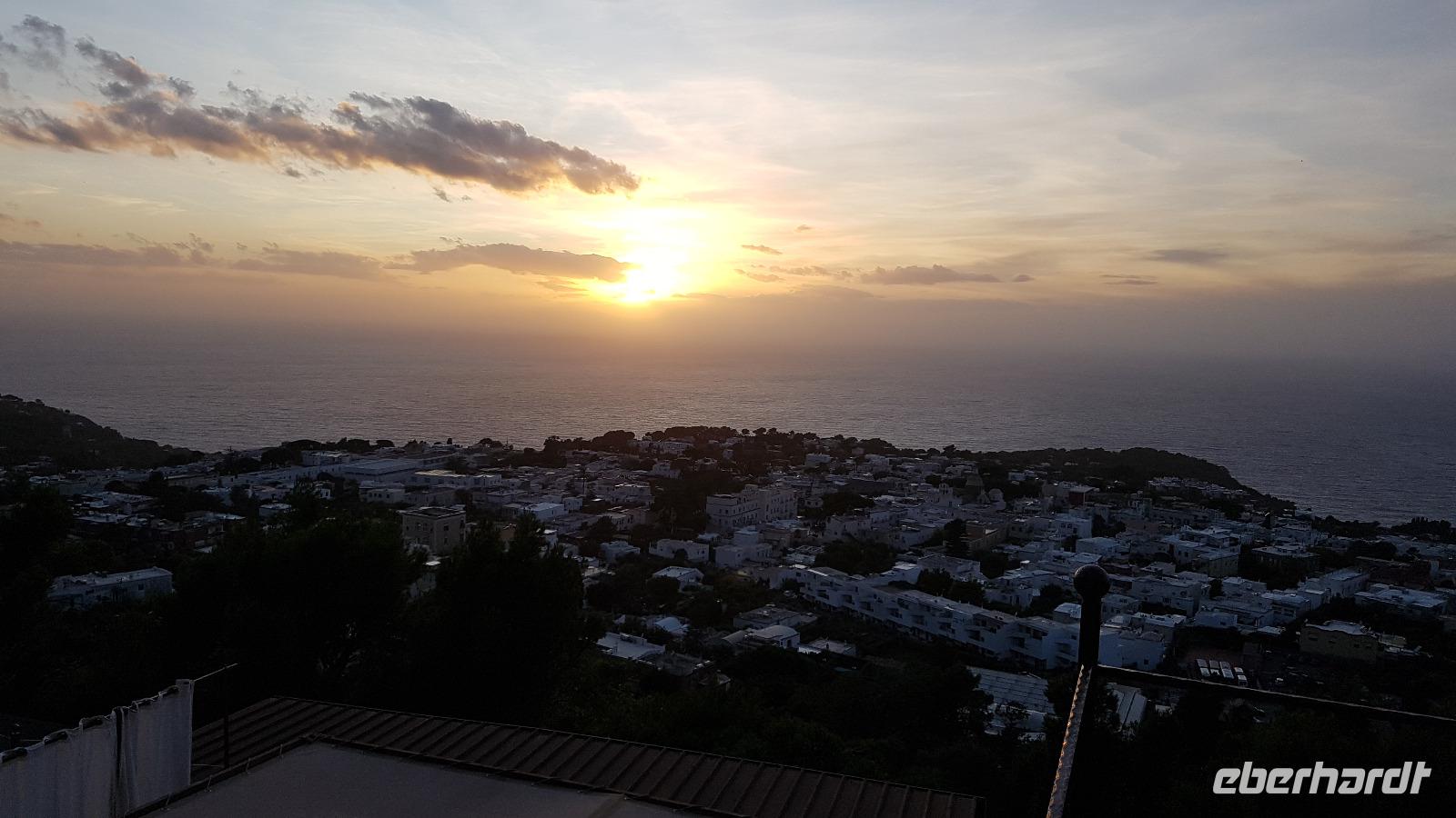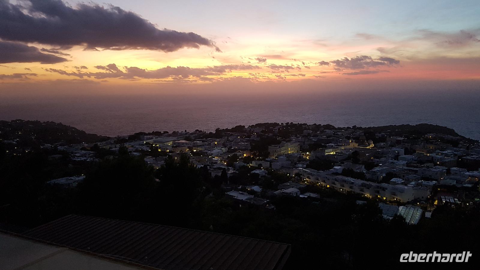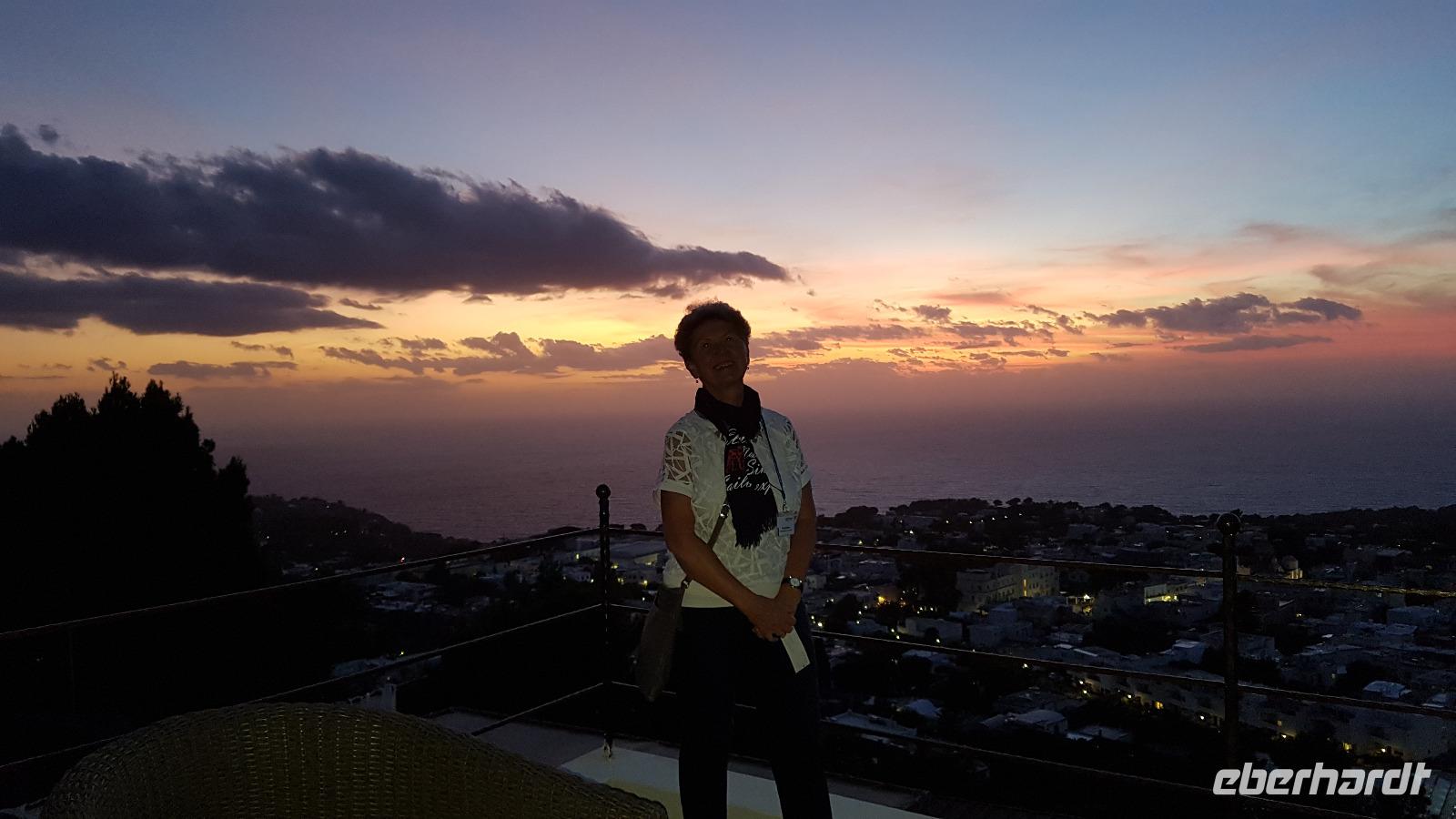 17 Uhr trafen wir uns wieder und fuhren mit dem Inselbus nach Anacapri. Dort erwartete uns schon Annamaria und gemeinsam gingen wir zu unserem Lokal für das letzte Abendessen. Es lag hoch oben über Anacapri am Hang des Monte Solaro. Mit einem Pkw fuhren wir den steilen Weg hinauf und kamen oben gerade noch rechtzeitig zum Sonnenuntergang an. Wenn bei Capri die rote Sonne im Meer versinkt........Für uns versank sie in einem Wolkenmeer, aber auch das war spektakulär. Dazu gab es Prosecco und frische Pizza aus dem Pizzaofen. Es war ein unvergesslicher Moment und ein würdiger Abschluss unserer Caprireise. Aber das war noch nicht alles. Drinnen erwartete uns ein tolles Abendessen bei der Familie Pontecorvo mit Salat Caprese, Ravioli alla Caprese, Parmigiana di Melanzane und ein Semifredo. Dazu gab es Rot- und Weisswein, Wein des Hauses und zum Schluss einen selbst gemachten Limoncello. Noch ein Blick von der Terrasse auf das beleuchtete Anacapri und dann brachte uns der Pkw wieder den steilen Berg hinunter und von der Piazza fuhren wir mit Taxis zurück ins Hotel.