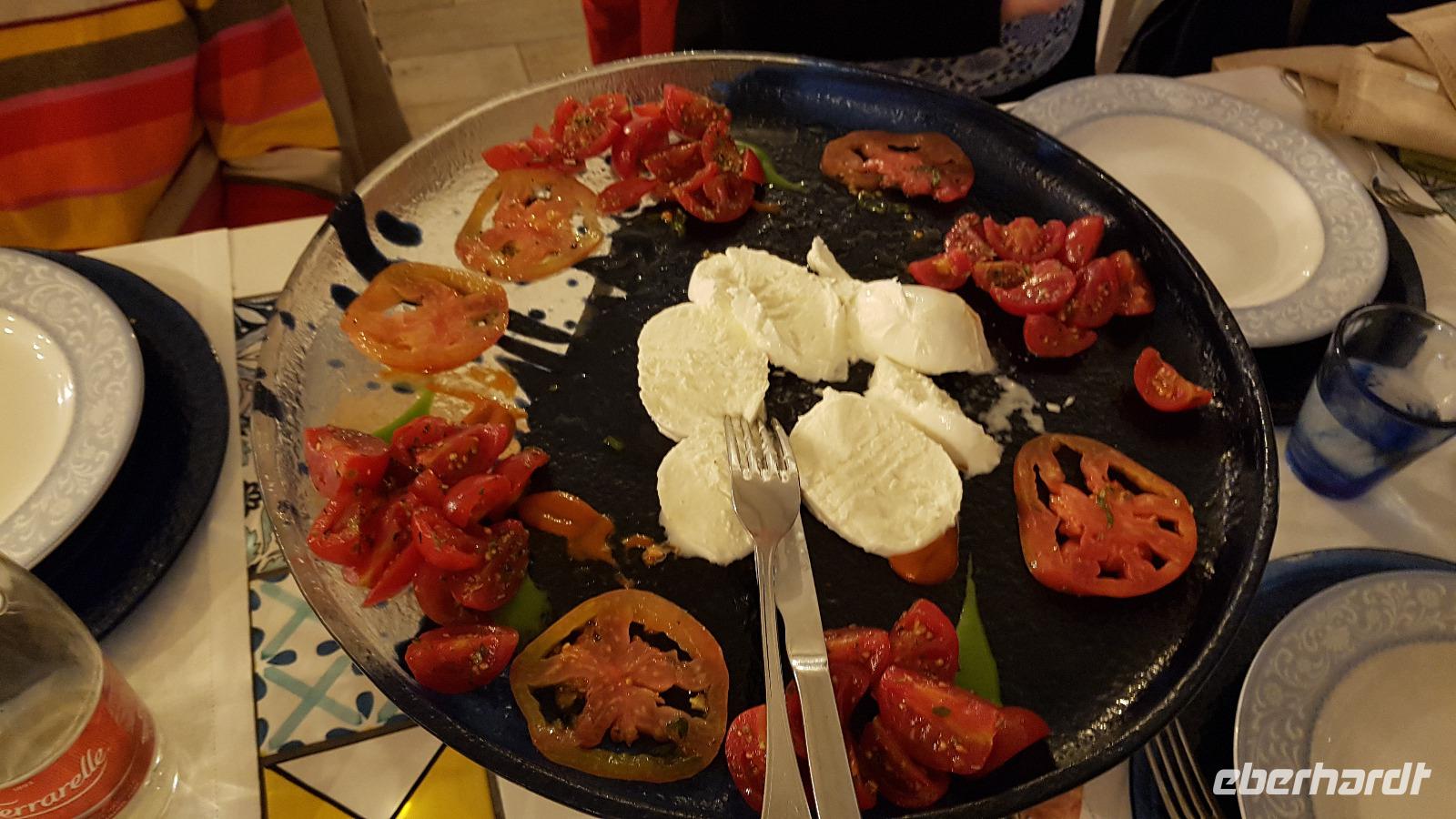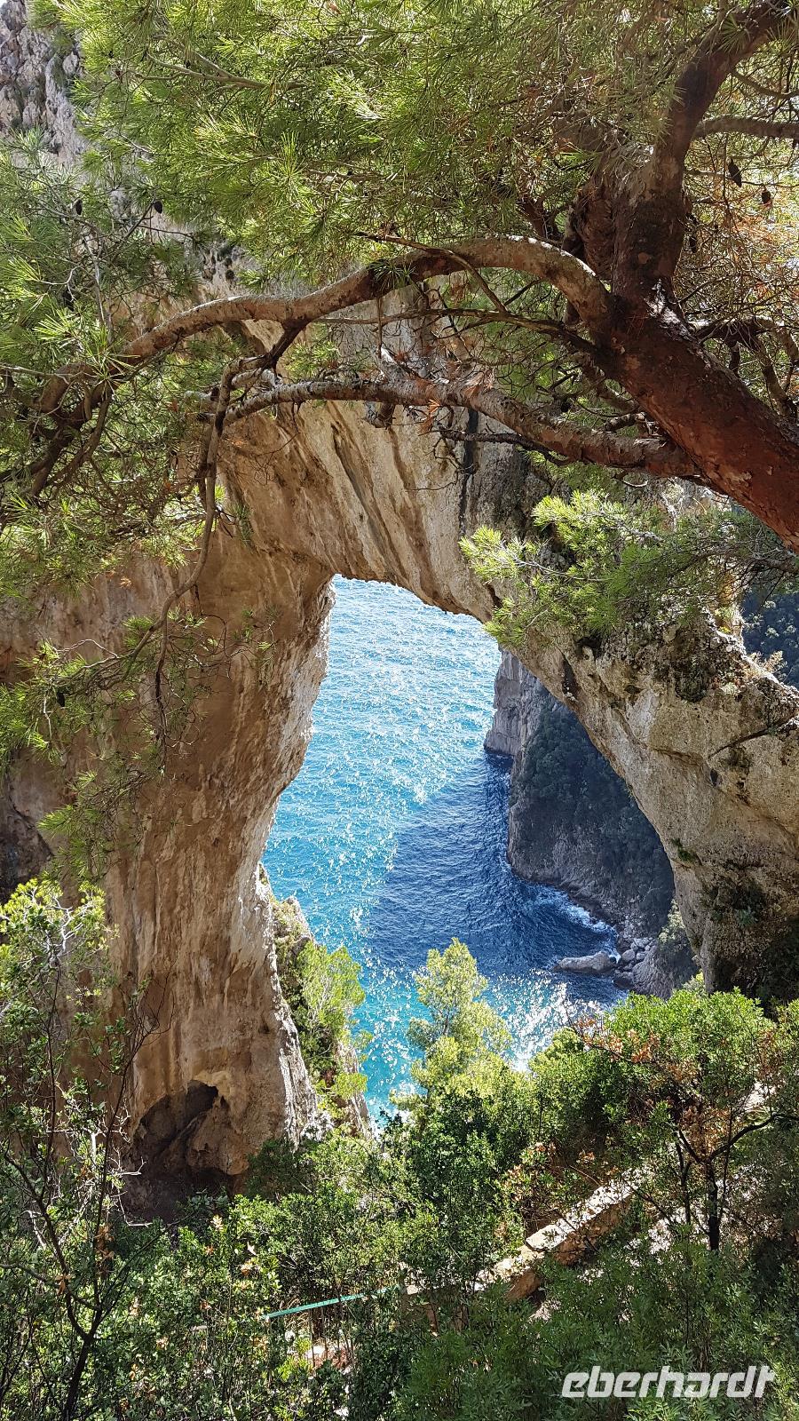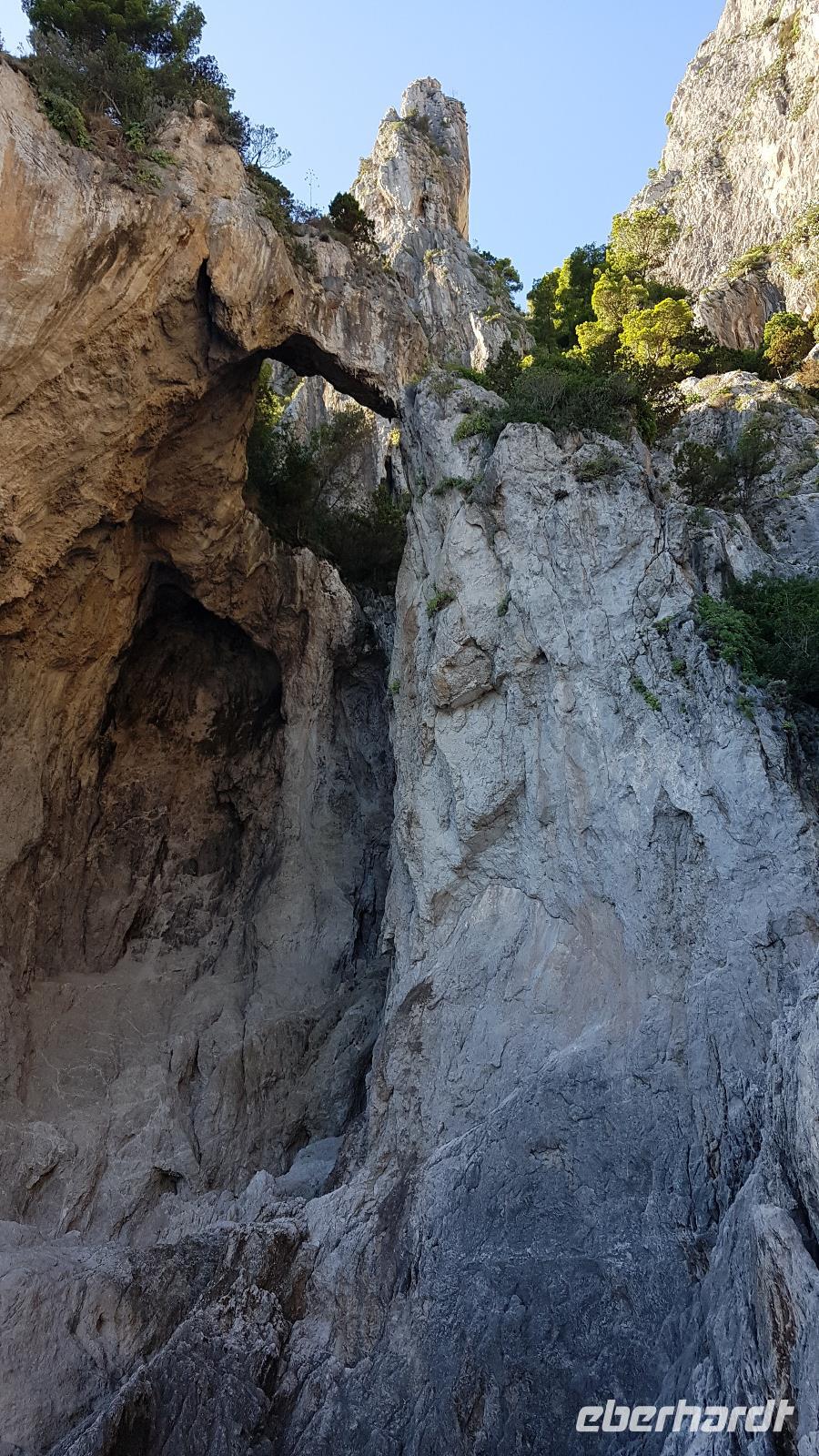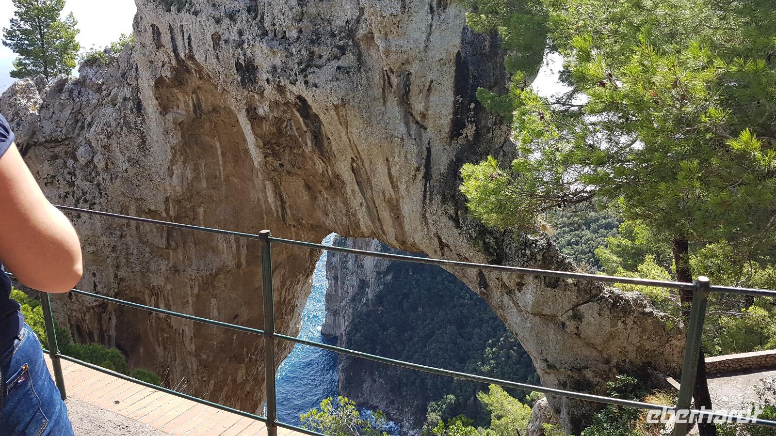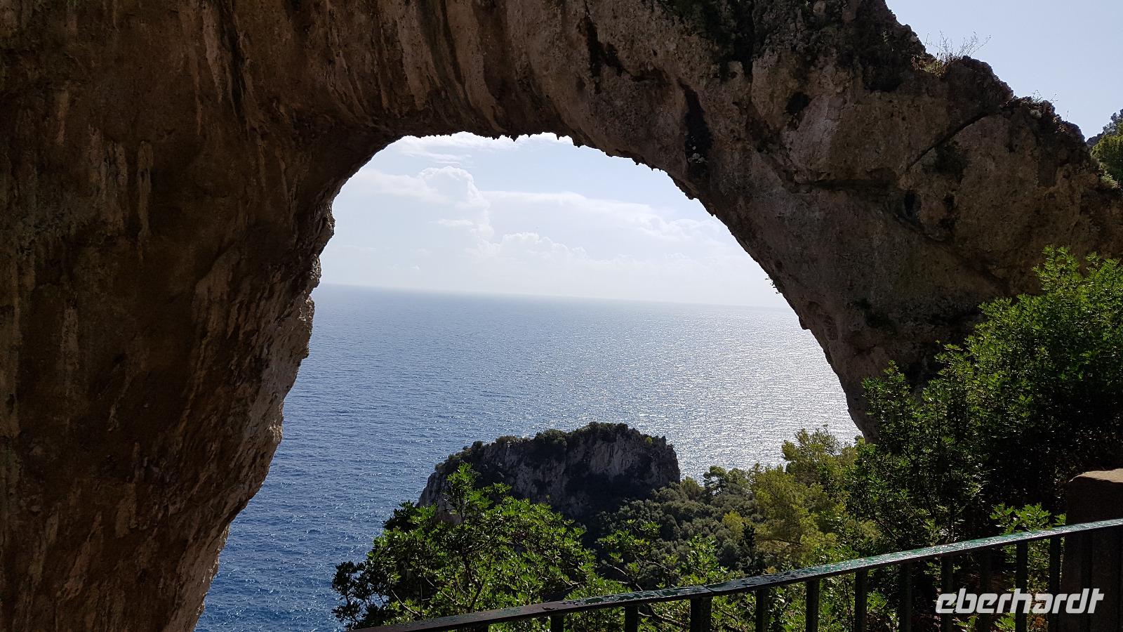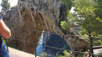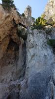 Nun spazierten wir durch die Gassen, abseits der Touristenströme bis zum Arco Naturale. Dieser Naturbogen war einst eine Höhle und der zum Meer liegende Teil wurde über Jahrtausende weggespült. Der Grossteil unserer Gruppe nahm die vielen Stufen bis hinunter zum Bogen und dort gab es unzählige Fotomotive. Wieder zurück beim Aussichtsrestaurant gingen wir gemeinsam zurück und besuchten dann das Ristorante da Tonino, wo für unsere Gruppe ein kleines Mittagsmenue vorbeitet war und welches wir sehr genossen. Nach einigen kleinen Vorspeisen gab es selbst gemachte Nudeln mit Aubergine oder Venusmuscheln und als Nachtisch einen "Apfelkuchen" mit Eis. Diese Pause tat uns allen gut und danach gingen einige Gäste zurück ins Zentrum von Capri und die anderen zu einer weiteren Besichtigungstour zu den Villen hoch oben über Capri.
