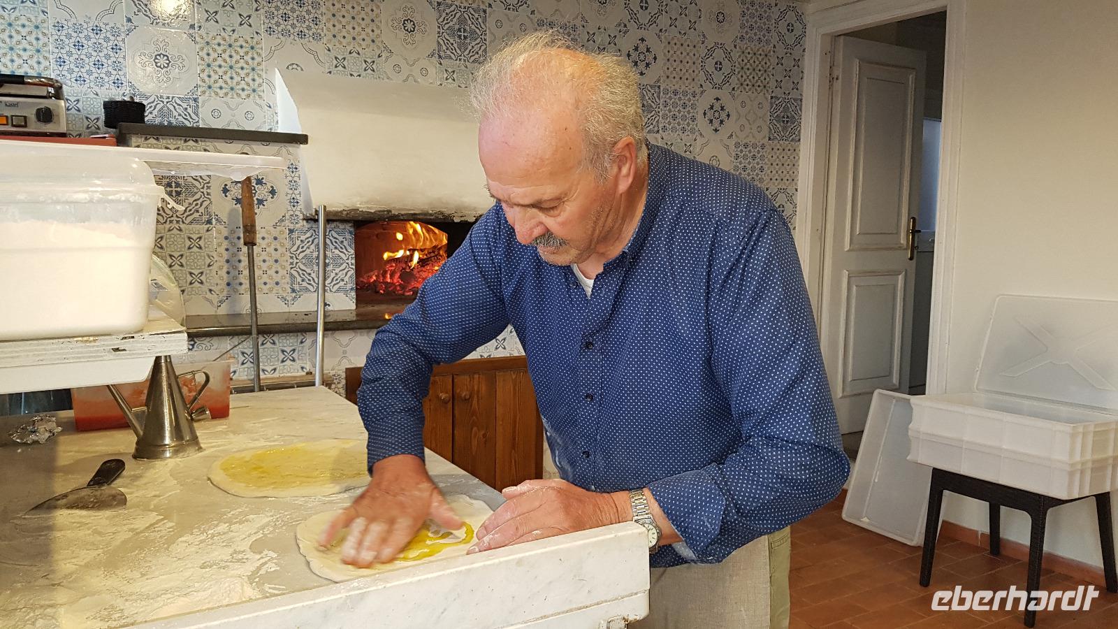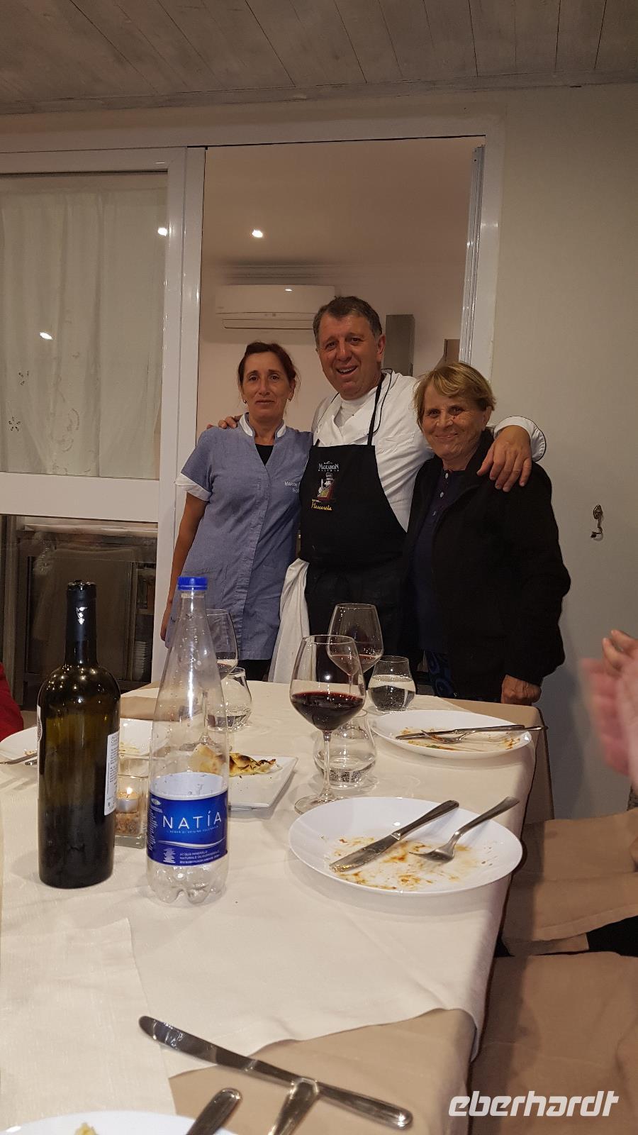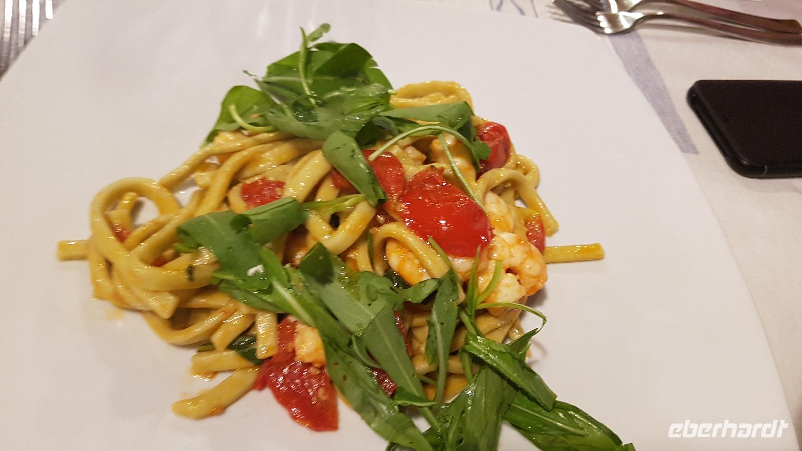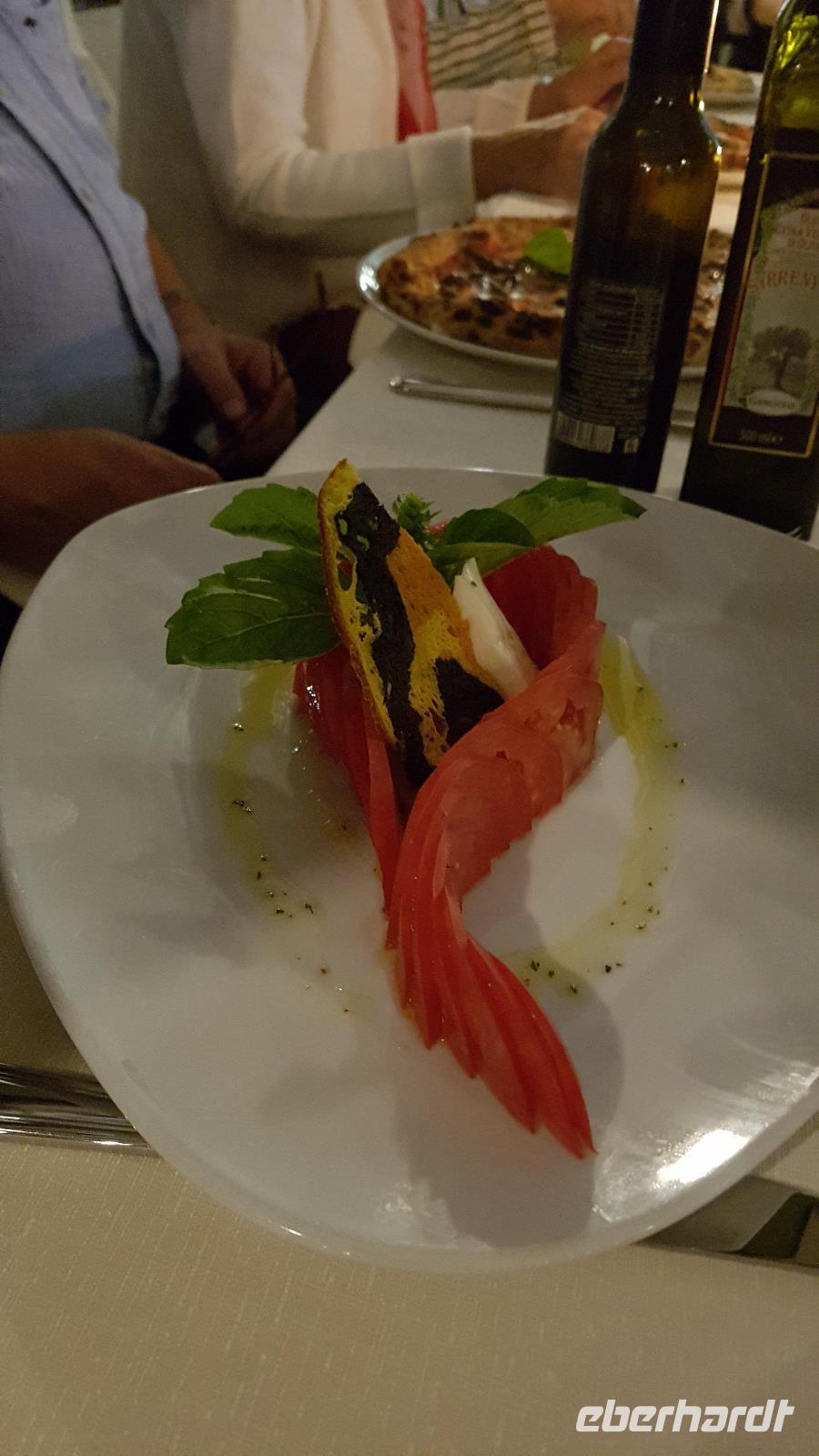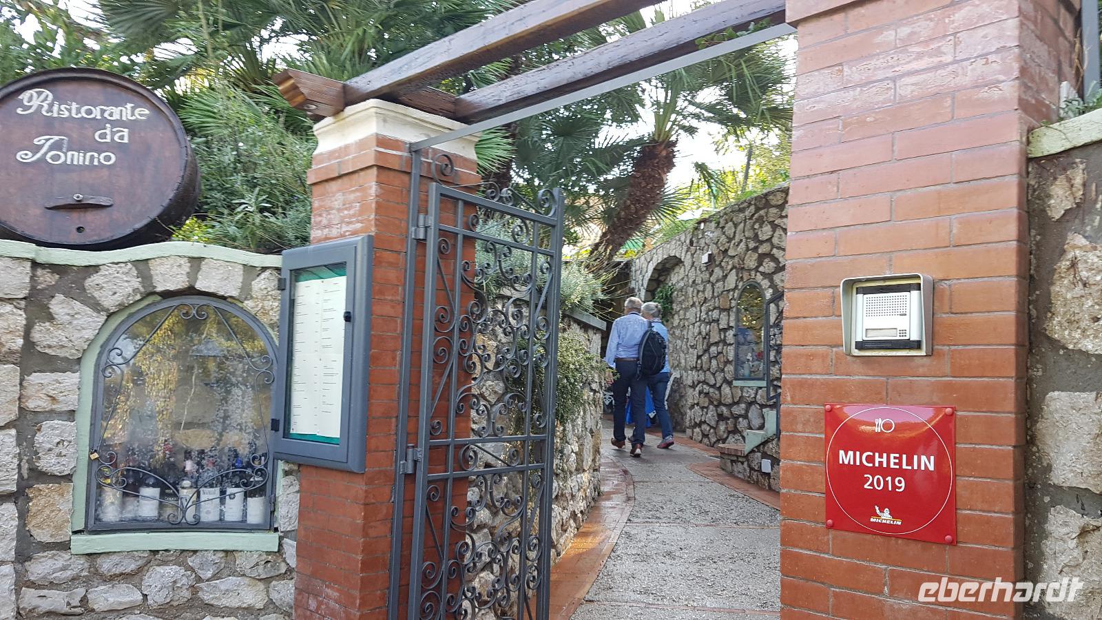 Nun spazierten wir durch die Gassen, abseits der Touristenströme bis zum Arco Naturale. Dieser Naturbogen war einst eine Höhle und der zum Meer liegende Teil wurde über Jahrtausende weggespült. Der Grossteil unserer Gruppe nahm die vielen Stufen bis hinunter zum Bogen und dort gab es unzählige Fotomotive. Wieder zurück beim Aussichtsrestaurant gingen wir gemeinsam zurück und besuchten dann das Ristorante da Tonino, wo für unsere Gruppe ein kleines Mittagsmenue vorbeitet war und welches wir sehr genossen. Nach einigen kleinen Vorspeisen gab es selbst gemachte Nudeln mit Aubergine oder Venusmuscheln und als Nachtisch einen "Apfelkuchen" mit Eis. Diese Pause tat uns allen gut und danach gingen einige Gäste zurück ins Zentrum von Capri und die anderen zu einer weiteren Besichtigungstour zu den Villen hoch oben über Capri.