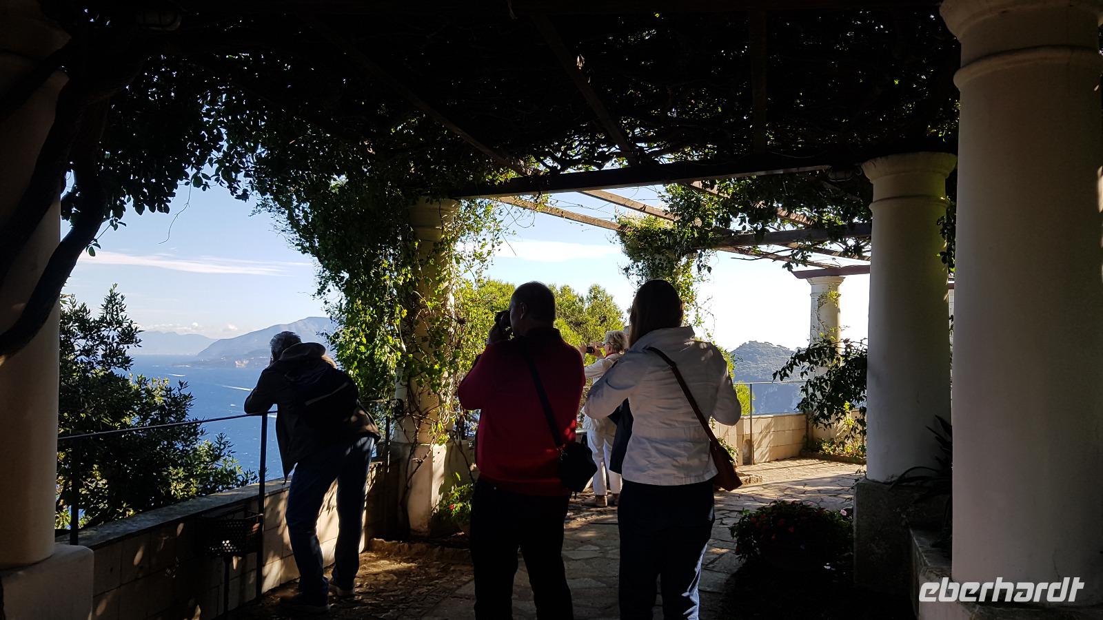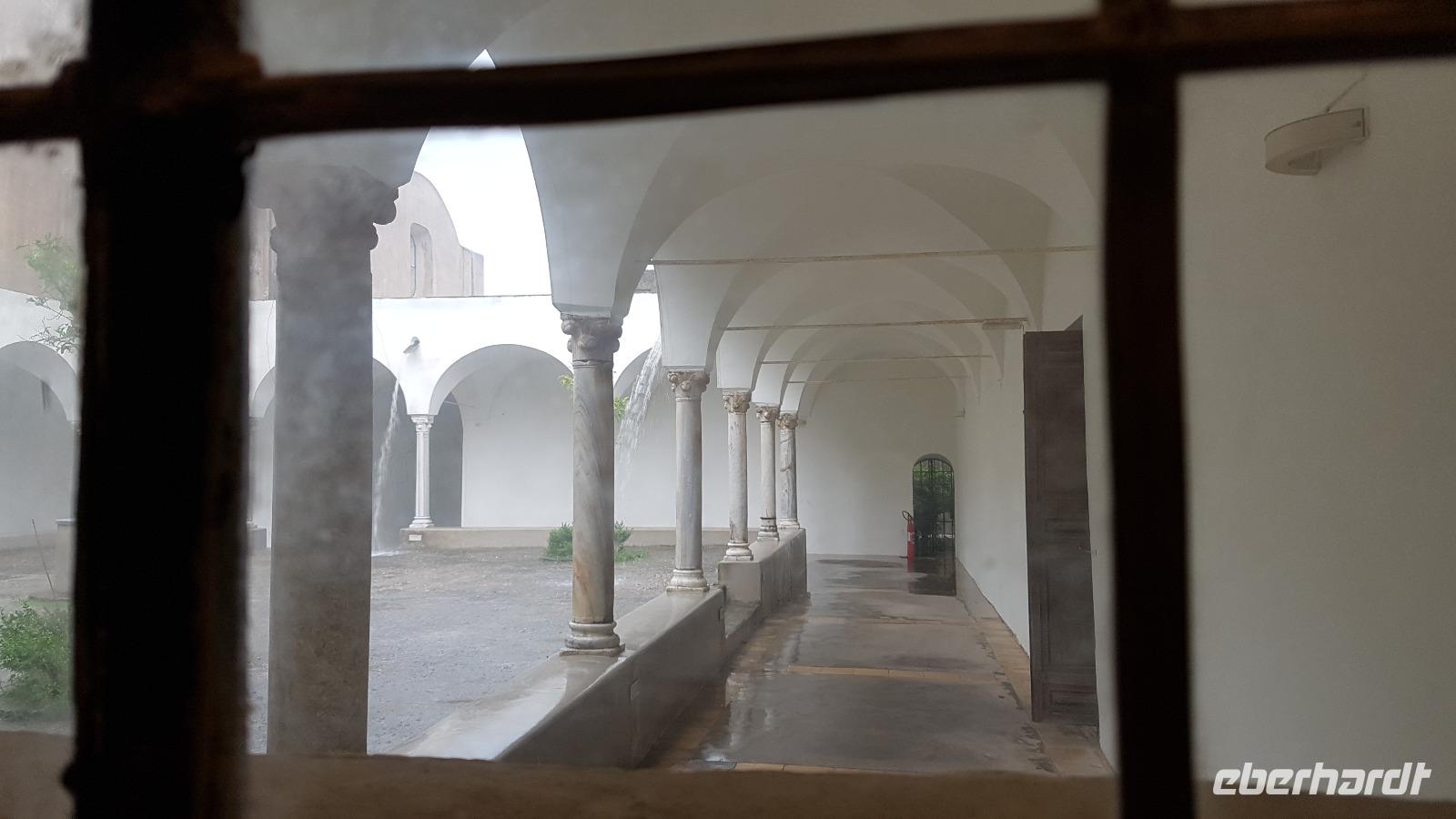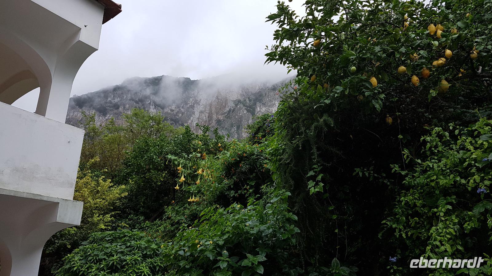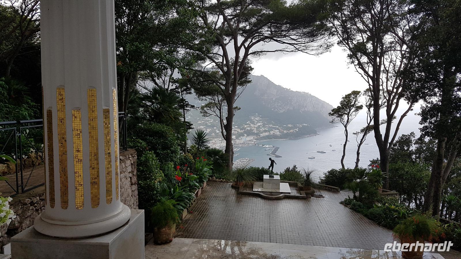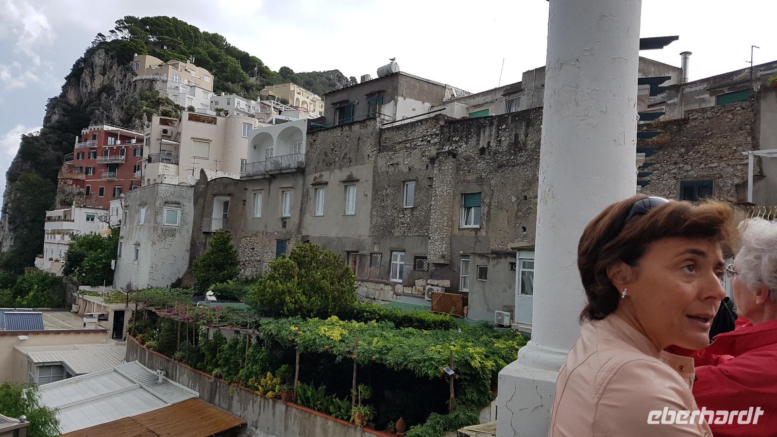 Das Frühstück war unsere erste positive Überraschung des Tages, denn es war ganz ausgezeichnet. Wir konnten beim Frühstück drin oder draussen unter einem Dach sitzen und die ersten Regenschauer ganz entspannt ertragen. Annamaria, unsere Capreser Reiseleiterin, holte uns im Hotel ab. Den Beginn unseres Besichtigungsprogramms hatten wir schon auf 9.30 Uhr verschoben, in der Hoffnung, dass der Regen dann vorbei sei. Aber während wir zum Kartäuserkloster unterwegs waren, gab es nochmals sehr kräftige Gewitterschläge und dann im Kloster schüttete es ganz mächtig. Die Wasserspeier konnten die Wassermassen nicht aufnehmen und so entstanden noch recht interessante Fotos in den Innenhöfen des Klosters und wir konnten uns Zeit lassen und die Gemälde von Diefenbach in aller Ruhe betrachten. Als der Regen vorbei war, gingen wir zu den Augustusgärten und machten unterwegs einen Stopp an der Parfümerie Carthusia. Auf den Aussichtsterrassen der Augustusgärten waren schon viele Gruppen unterwegs und wir brauchten viel Geduld, um bis zu den schönsten Fotomotiven vorzudringen. Aber im Gegensatz zu den Tagestouristen hatten wir ja Zeit.