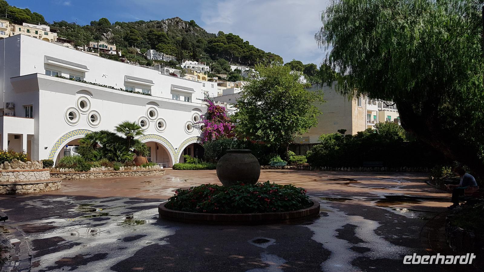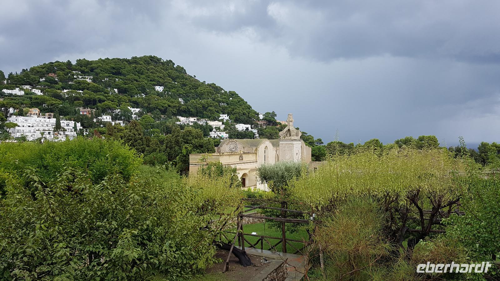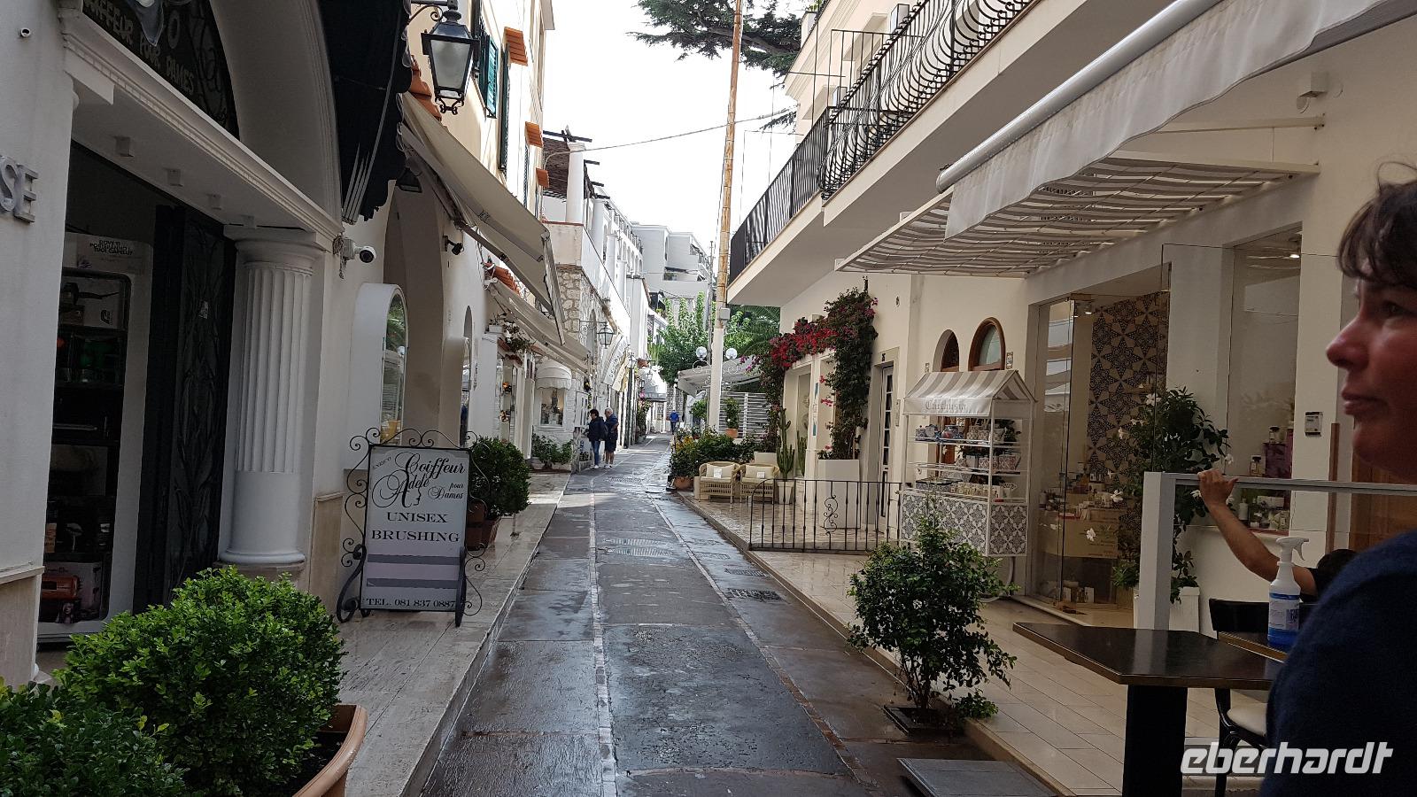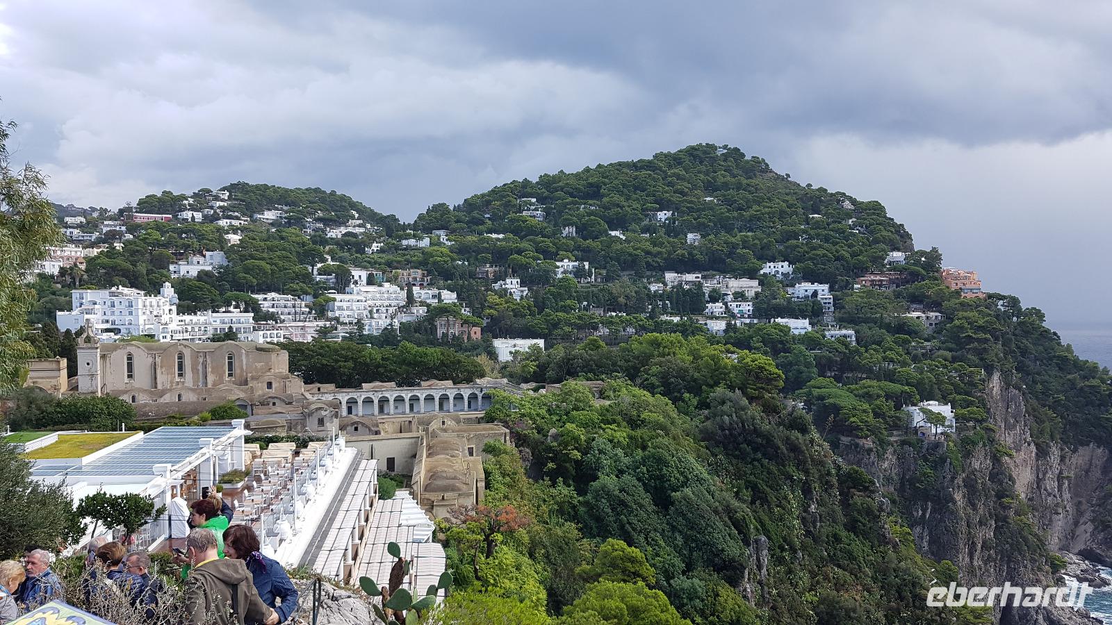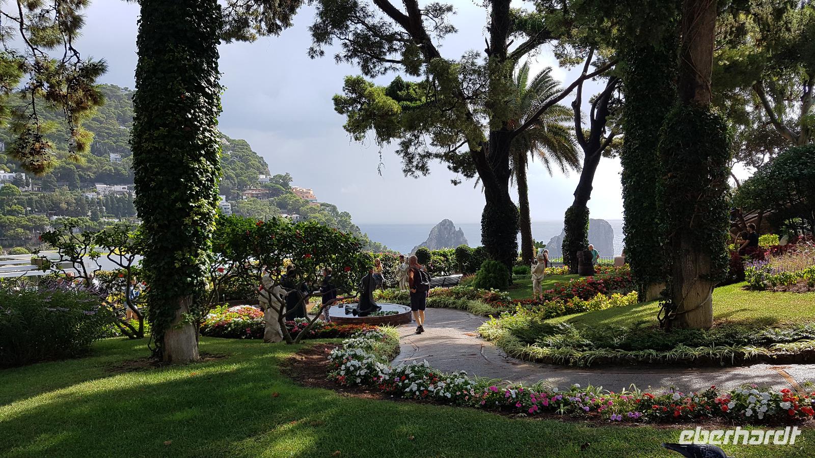 Das Frühstück war unsere erste positive Überraschung des Tages, denn es war ganz ausgezeichnet. Wir konnten beim Frühstück drin oder draussen unter einem Dach sitzen und die ersten Regenschauer ganz entspannt ertragen. Annamaria, unsere Capreser Reiseleiterin, holte uns im Hotel ab. Den Beginn unseres Besichtigungsprogramms hatten wir schon auf 9.30 Uhr verschoben, in der Hoffnung, dass der Regen dann vorbei sei. Aber während wir zum Kartäuserkloster unterwegs waren, gab es nochmals sehr kräftige Gewitterschläge und dann im Kloster schüttete es ganz mächtig. Die Wasserspeier konnten die Wassermassen nicht aufnehmen und so entstanden noch recht interessante Fotos in den Innenhöfen des Klosters und wir konnten uns Zeit lassen und die Gemälde von Diefenbach in aller Ruhe betrachten. Als der Regen vorbei war, gingen wir zu den Augustusgärten und machten unterwegs einen Stopp an der Parfümerie Carthusia. Auf den Aussichtsterrassen der Augustusgärten waren schon viele Gruppen unterwegs und wir brauchten viel Geduld, um bis zu den schönsten Fotomotiven vorzudringen. Aber im Gegensatz zu den Tagestouristen hatten wir ja Zeit.