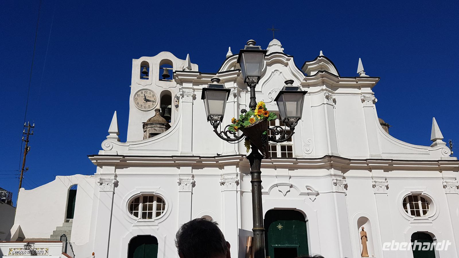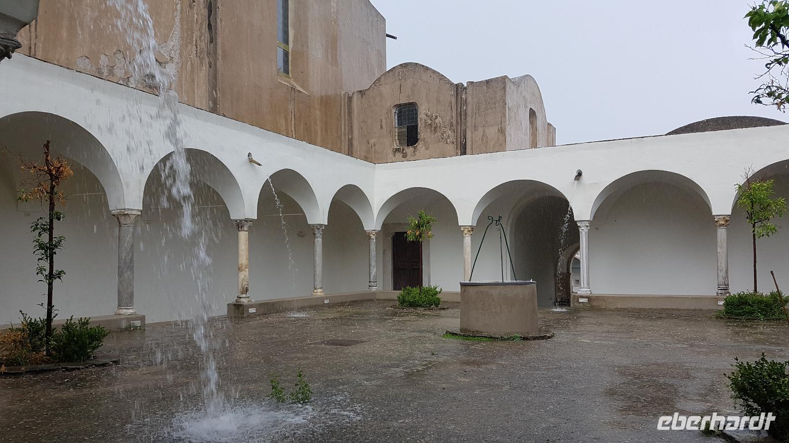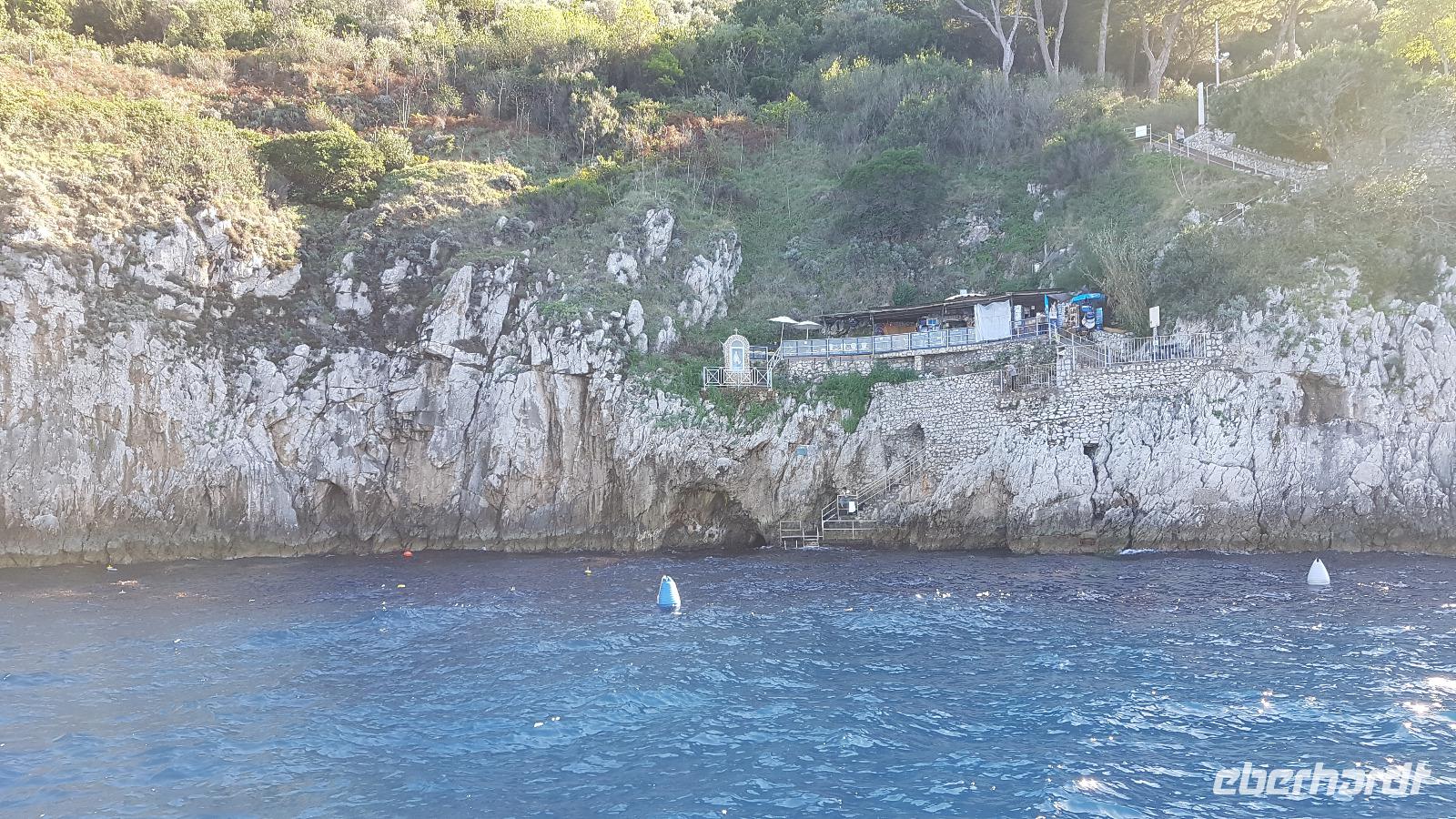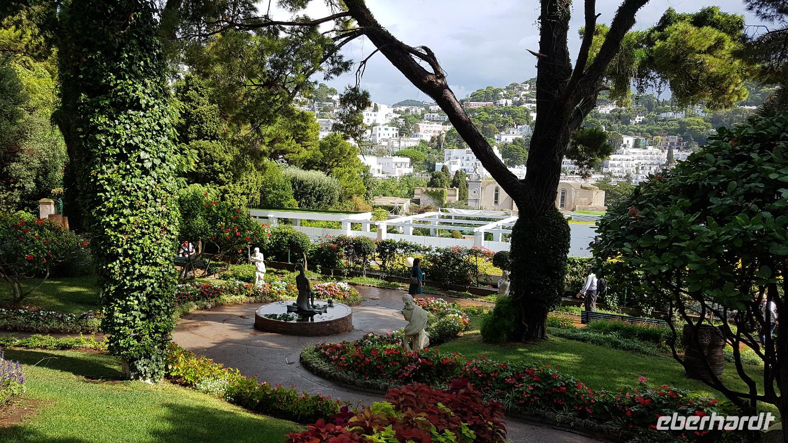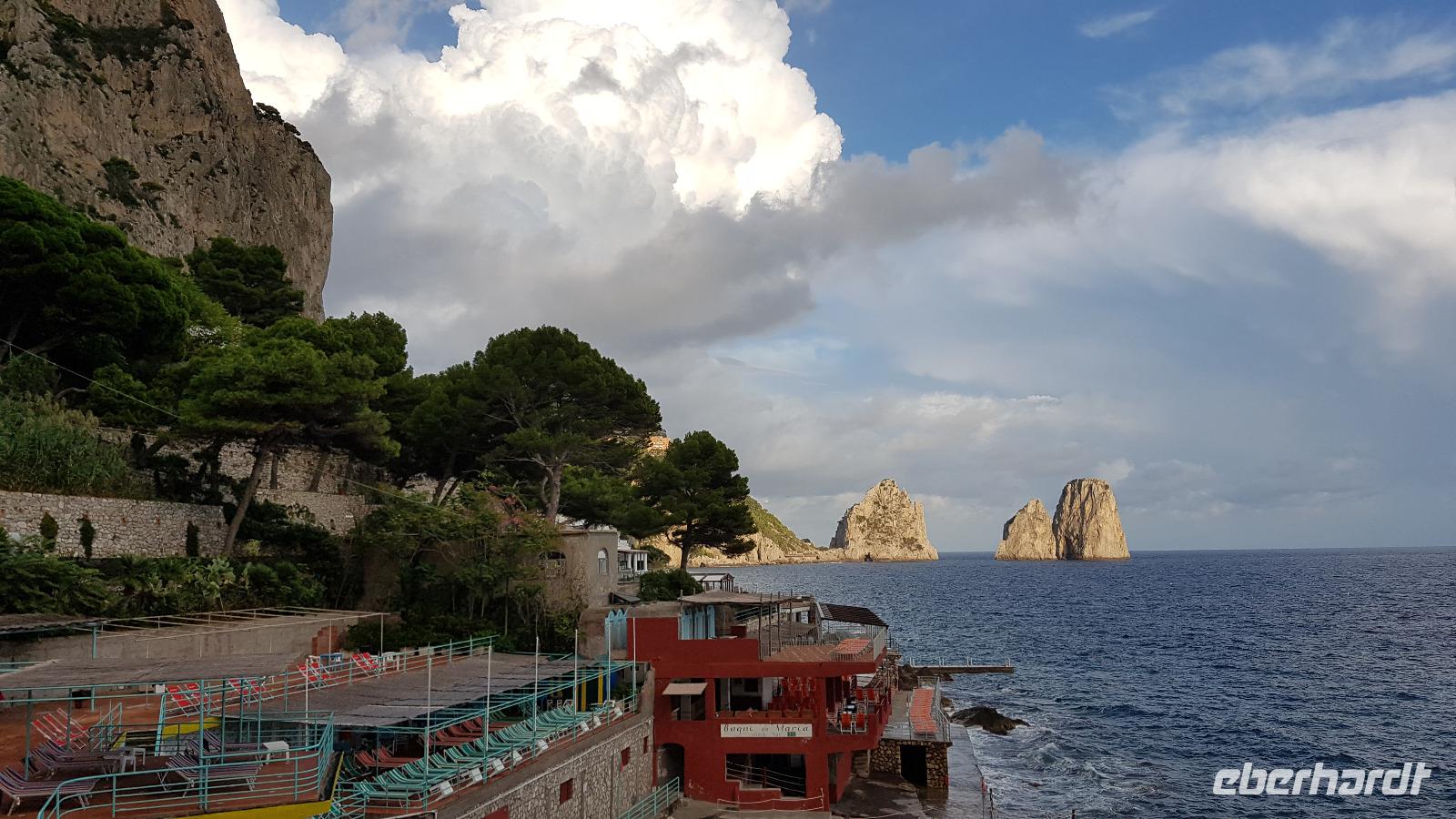 Das Frühstück war unsere erste positive Überraschung des Tages, denn es war ganz ausgezeichnet. Wir konnten beim Frühstück drin oder draussen unter einem Dach sitzen und die ersten Regenschauer ganz entspannt ertragen. Annamaria, unsere Capreser Reiseleiterin, holte uns im Hotel ab. Den Beginn unseres Besichtigungsprogramms hatten wir schon auf 9.30 Uhr verschoben, in der Hoffnung, dass der Regen dann vorbei sei. Aber während wir zum Kartäuserkloster unterwegs waren, gab es nochmals sehr kräftige Gewitterschläge und dann im Kloster schüttete es ganz mächtig. Die Wasserspeier konnten die Wassermassen nicht aufnehmen und so entstanden noch recht interessante Fotos in den Innenhöfen des Klosters und wir konnten uns Zeit lassen und die Gemälde von Diefenbach in aller Ruhe betrachten. Als der Regen vorbei war, gingen wir zu den Augustusgärten und machten unterwegs einen Stopp an der Parfümerie Carthusia. Auf den Aussichtsterrassen der Augustusgärten waren schon viele Gruppen unterwegs und wir brauchten viel Geduld, um bis zu den schönsten Fotomotiven vorzudringen. Aber im Gegensatz zu den Tagestouristen hatten wir ja Zeit.