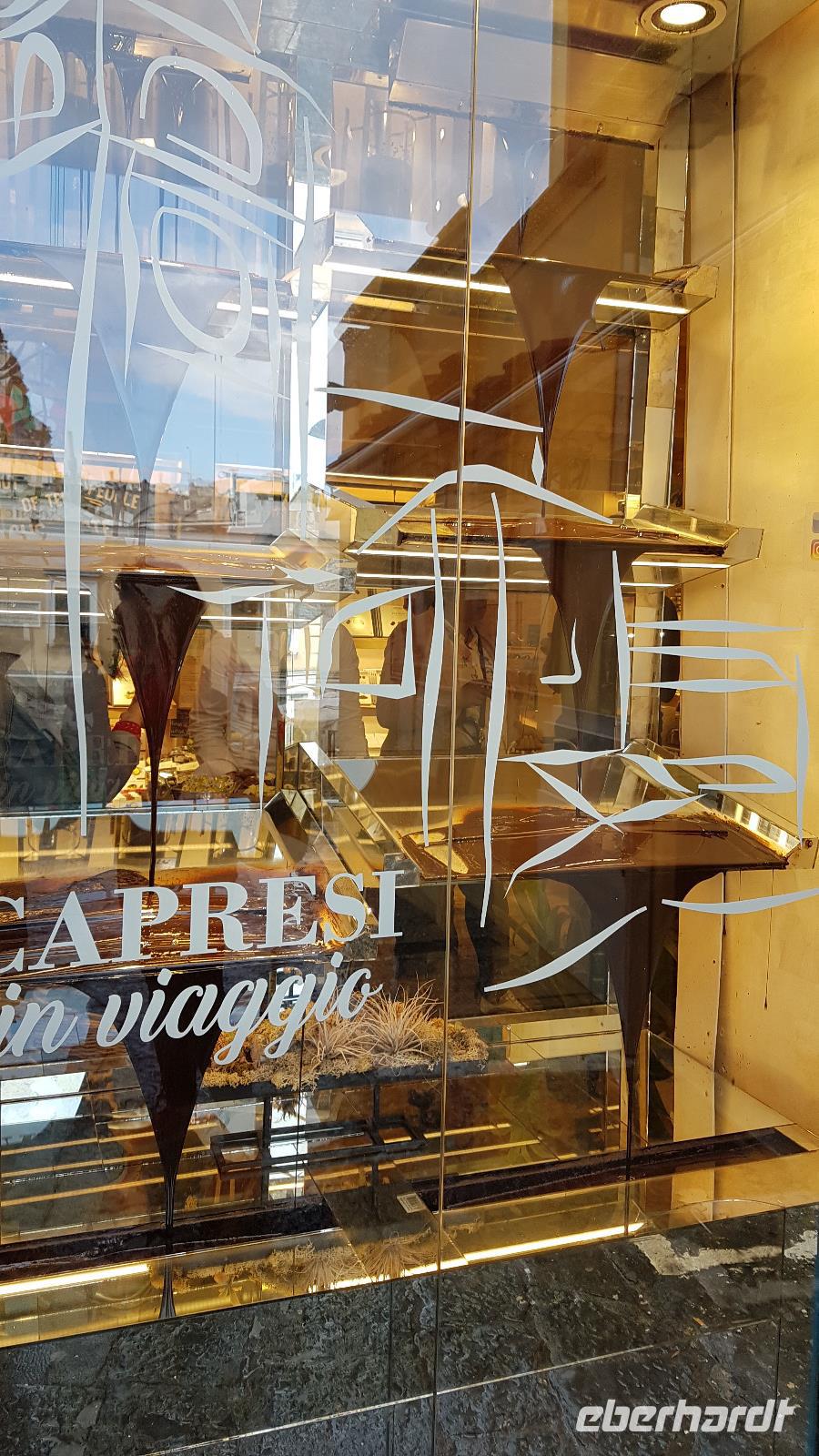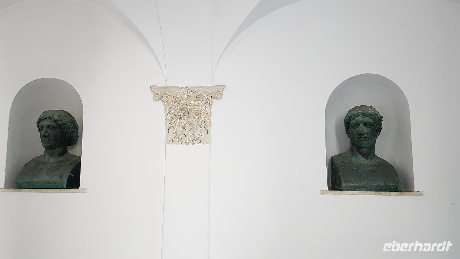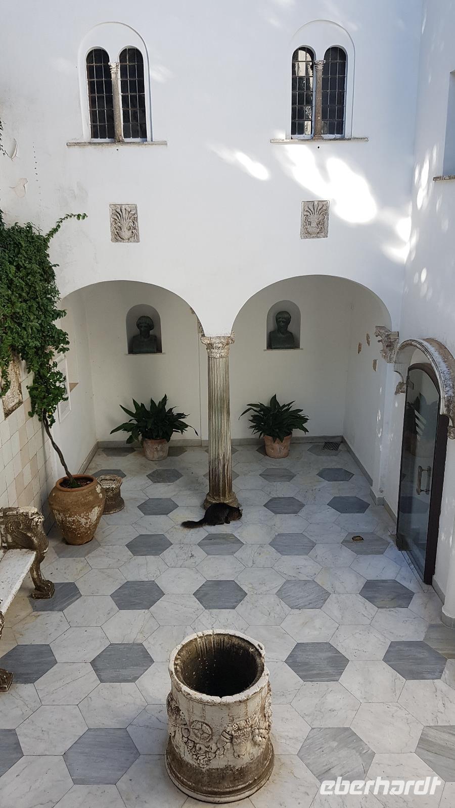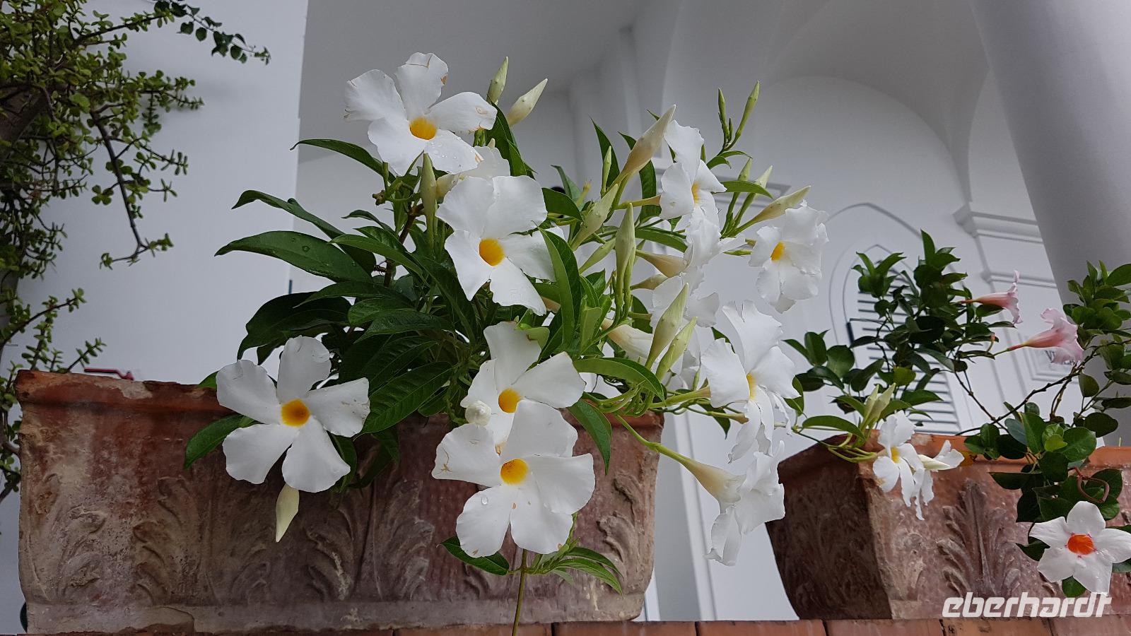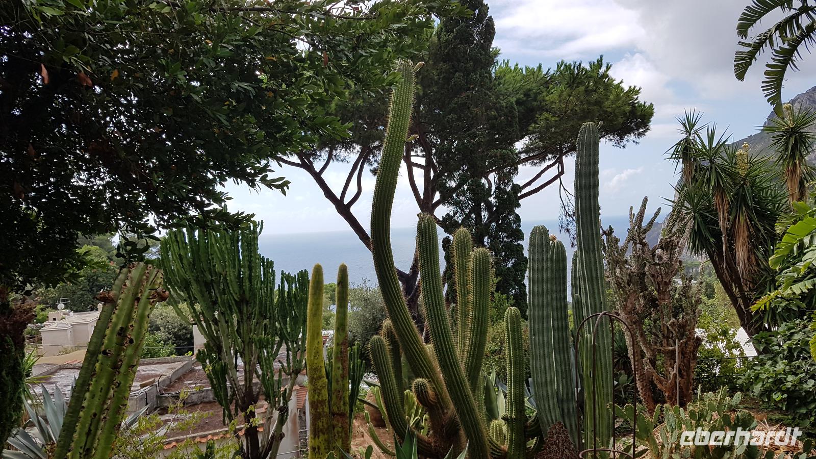 Das Frühstück war unsere erste positive Überraschung des Tages, denn es war ganz ausgezeichnet. Wir konnten beim Frühstück drin oder draussen unter einem Dach sitzen und die ersten Regenschauer ganz entspannt ertragen. Annamaria, unsere Capreser Reiseleiterin, holte uns im Hotel ab. Den Beginn unseres Besichtigungsprogramms hatten wir schon auf 9.30 Uhr verschoben, in der Hoffnung, dass der Regen dann vorbei sei. Aber während wir zum Kartäuserkloster unterwegs waren, gab es nochmals sehr kräftige Gewitterschläge und dann im Kloster schüttete es ganz mächtig. Die Wasserspeier konnten die Wassermassen nicht aufnehmen und so entstanden noch recht interessante Fotos in den Innenhöfen des Klosters und wir konnten uns Zeit lassen und die Gemälde von Diefenbach in aller Ruhe betrachten. Als der Regen vorbei war, gingen wir zu den Augustusgärten und machten unterwegs einen Stopp an der Parfümerie Carthusia. Auf den Aussichtsterrassen der Augustusgärten waren schon viele Gruppen unterwegs und wir brauchten viel Geduld, um bis zu den schönsten Fotomotiven vorzudringen. Aber im Gegensatz zu den Tagestouristen hatten wir ja Zeit.