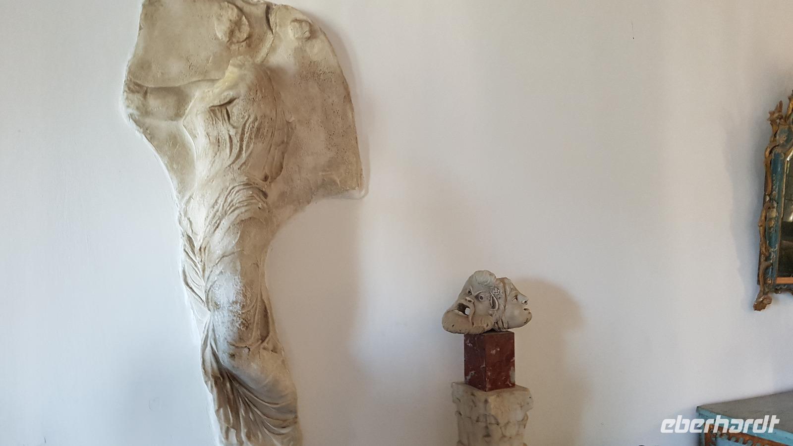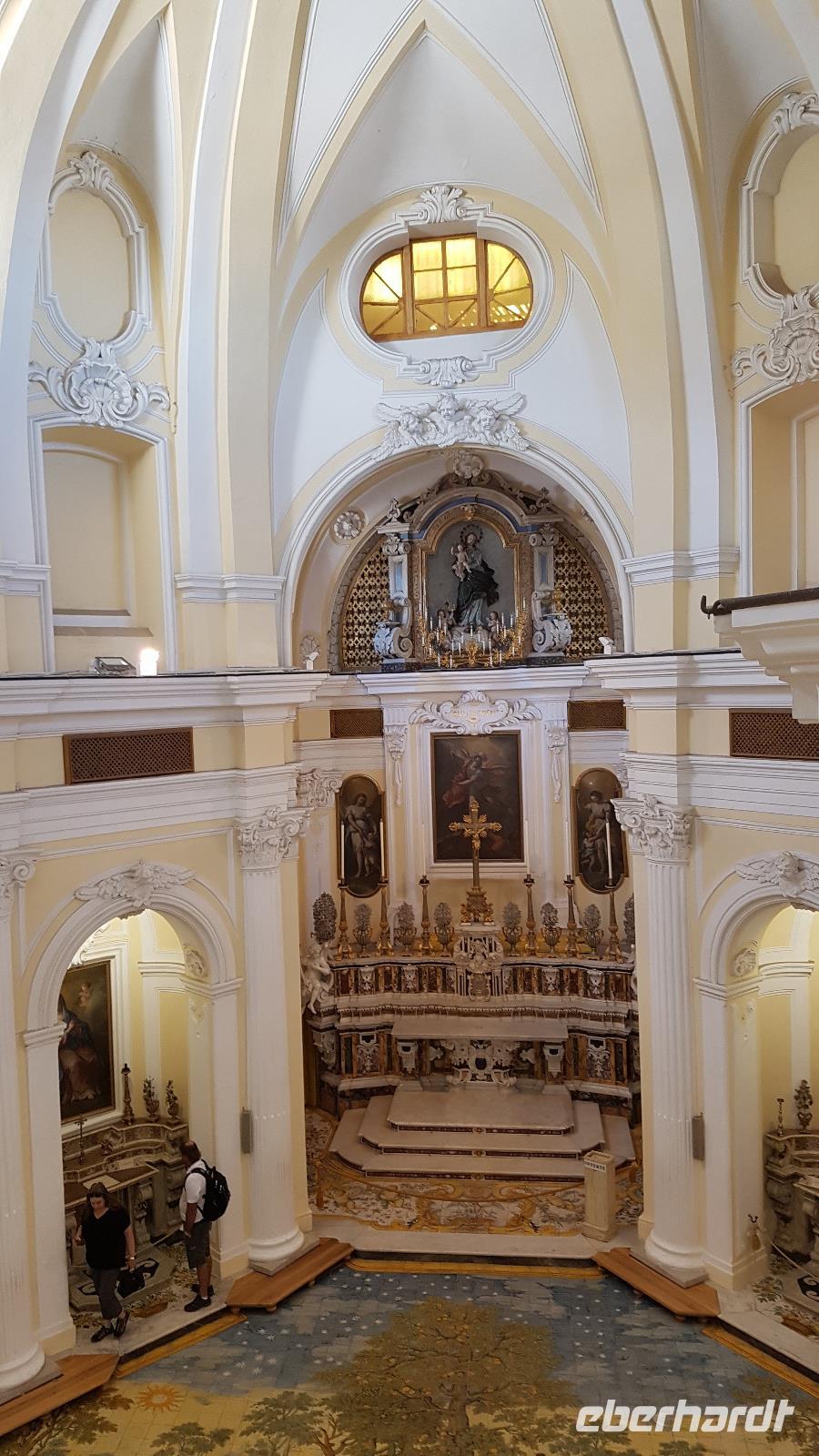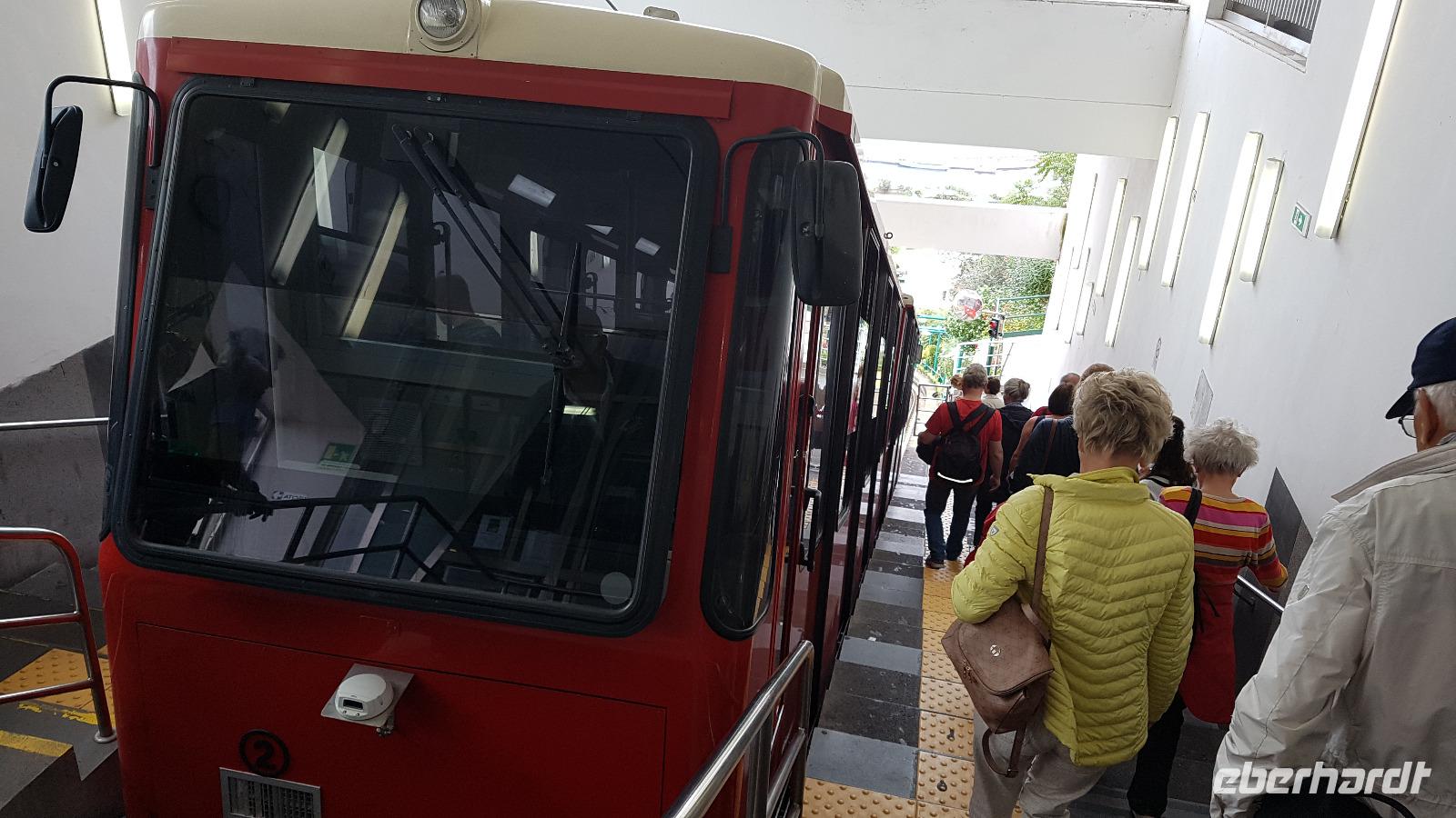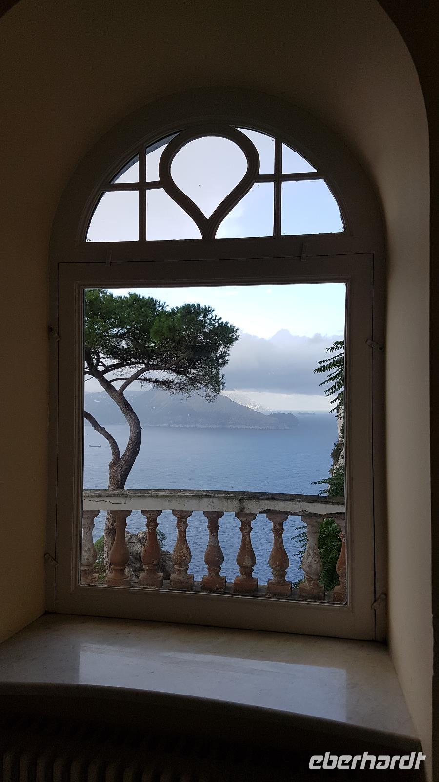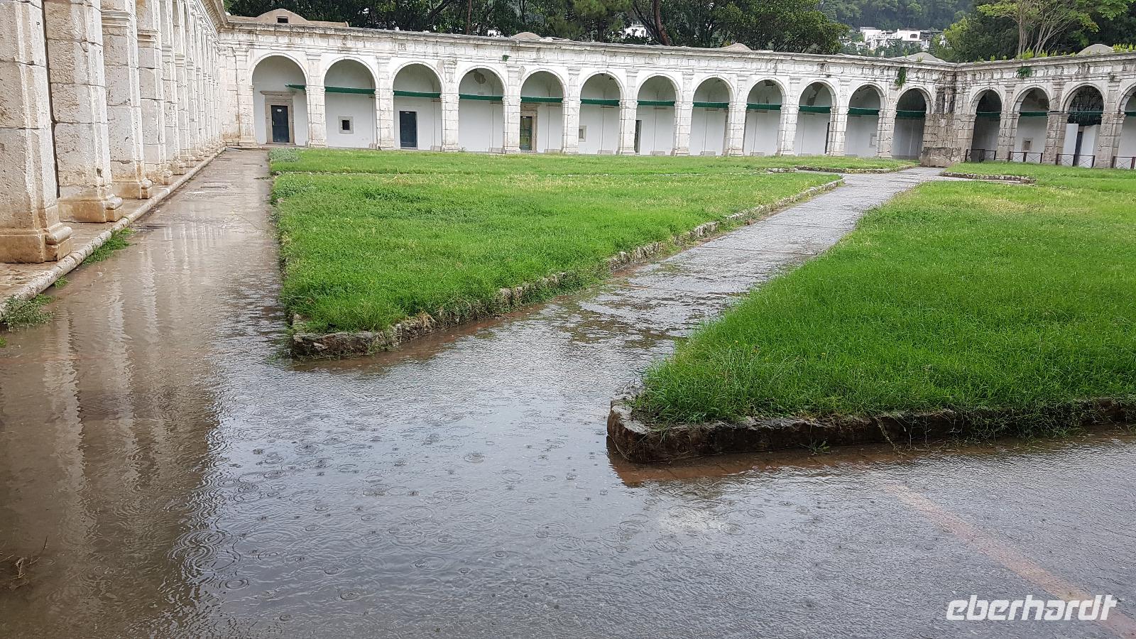 Das Frühstück war unsere erste positive Überraschung des Tages, denn es war ganz ausgezeichnet. Wir konnten beim Frühstück drin oder draussen unter einem Dach sitzen und die ersten Regenschauer ganz entspannt ertragen. Annamaria, unsere Capreser Reiseleiterin, holte uns im Hotel ab. Den Beginn unseres Besichtigungsprogramms hatten wir schon auf 9.30 Uhr verschoben, in der Hoffnung, dass der Regen dann vorbei sei. Aber während wir zum Kartäuserkloster unterwegs waren, gab es nochmals sehr kräftige Gewitterschläge und dann im Kloster schüttete es ganz mächtig. Die Wasserspeier konnten die Wassermassen nicht aufnehmen und so entstanden noch recht interessante Fotos in den Innenhöfen des Klosters und wir konnten uns Zeit lassen und die Gemälde von Diefenbach in aller Ruhe betrachten. Als der Regen vorbei war, gingen wir zu den Augustusgärten und machten unterwegs einen Stopp an der Parfümerie Carthusia. Auf den Aussichtsterrassen der Augustusgärten waren schon viele Gruppen unterwegs und wir brauchten viel Geduld, um bis zu den schönsten Fotomotiven vorzudringen. Aber im Gegensatz zu den Tagestouristen hatten wir ja Zeit.
