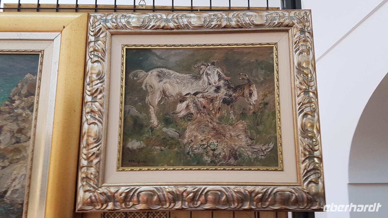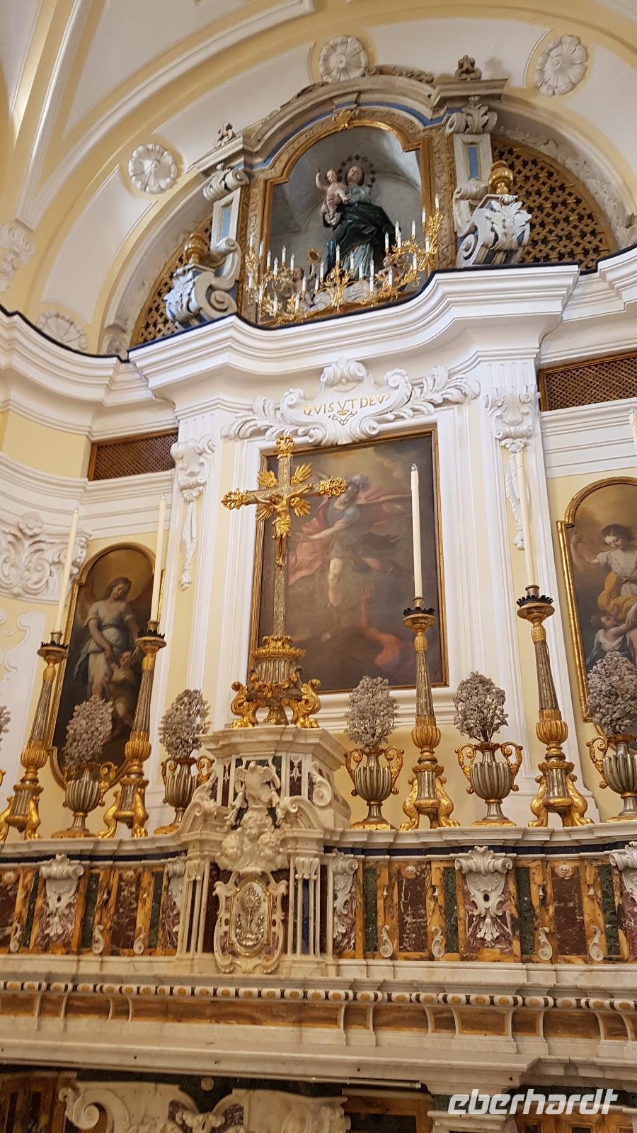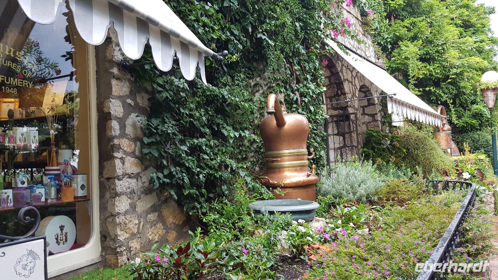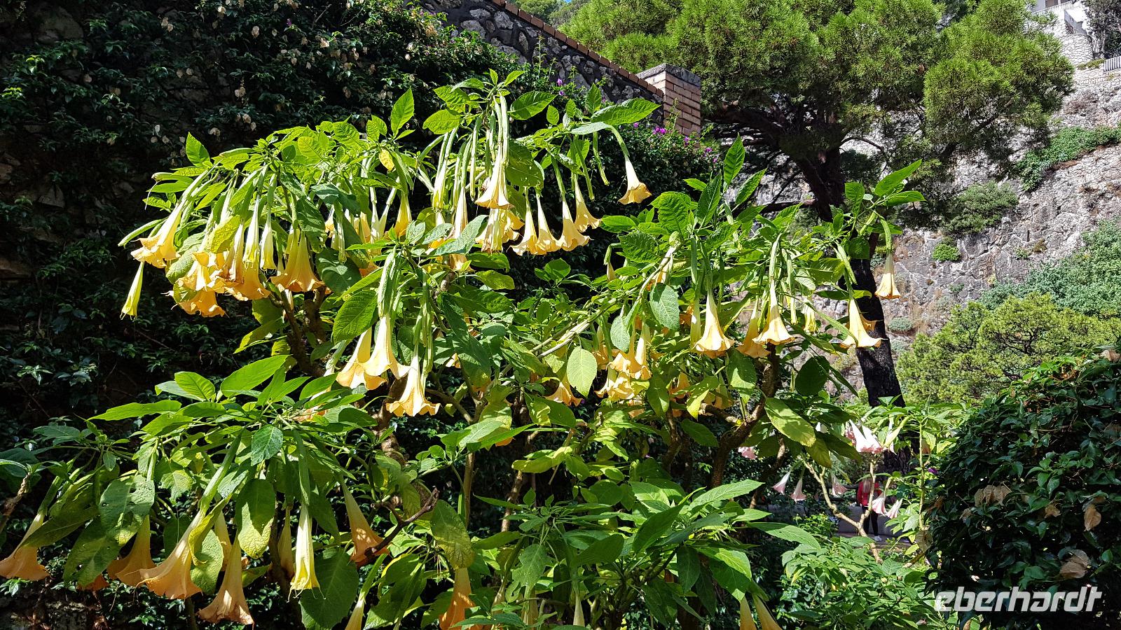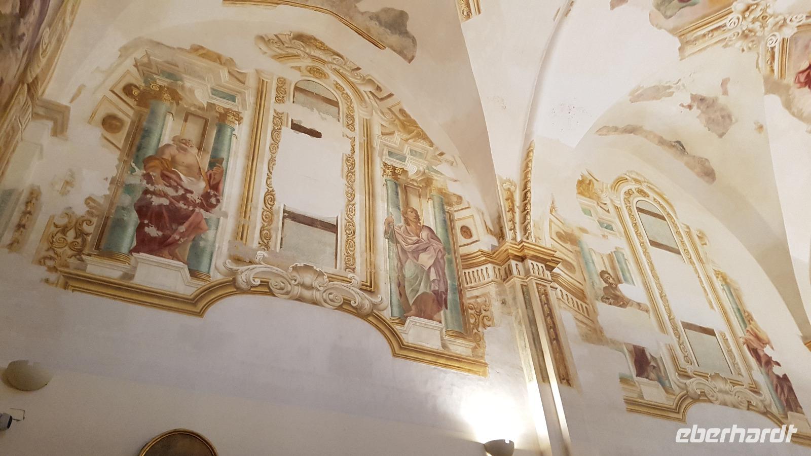 Das Frühstück war unsere erste positive Überraschung des Tages, denn es war ganz ausgezeichnet. Wir konnten beim Frühstück drin oder draussen unter einem Dach sitzen und die ersten Regenschauer ganz entspannt ertragen. Annamaria, unsere Capreser Reiseleiterin, holte uns im Hotel ab. Den Beginn unseres Besichtigungsprogramms hatten wir schon auf 9.30 Uhr verschoben, in der Hoffnung, dass der Regen dann vorbei sei. Aber während wir zum Kartäuserkloster unterwegs waren, gab es nochmals sehr kräftige Gewitterschläge und dann im Kloster schüttete es ganz mächtig. Die Wasserspeier konnten die Wassermassen nicht aufnehmen und so entstanden noch recht interessante Fotos in den Innenhöfen des Klosters und wir konnten uns Zeit lassen und die Gemälde von Diefenbach in aller Ruhe betrachten. Als der Regen vorbei war, gingen wir zu den Augustusgärten und machten unterwegs einen Stopp an der Parfümerie Carthusia. Auf den Aussichtsterrassen der Augustusgärten waren schon viele Gruppen unterwegs und wir brauchten viel Geduld, um bis zu den schönsten Fotomotiven vorzudringen. Aber im Gegensatz zu den Tagestouristen hatten wir ja Zeit.