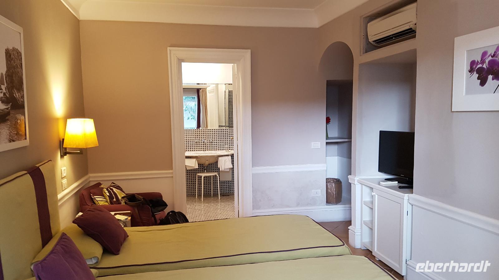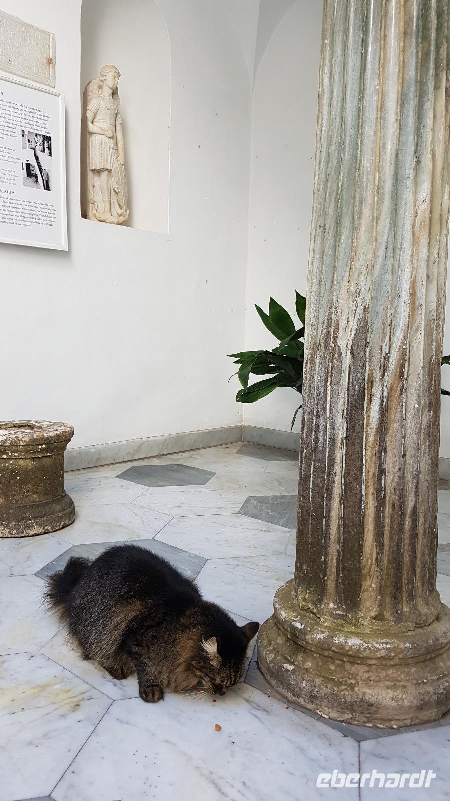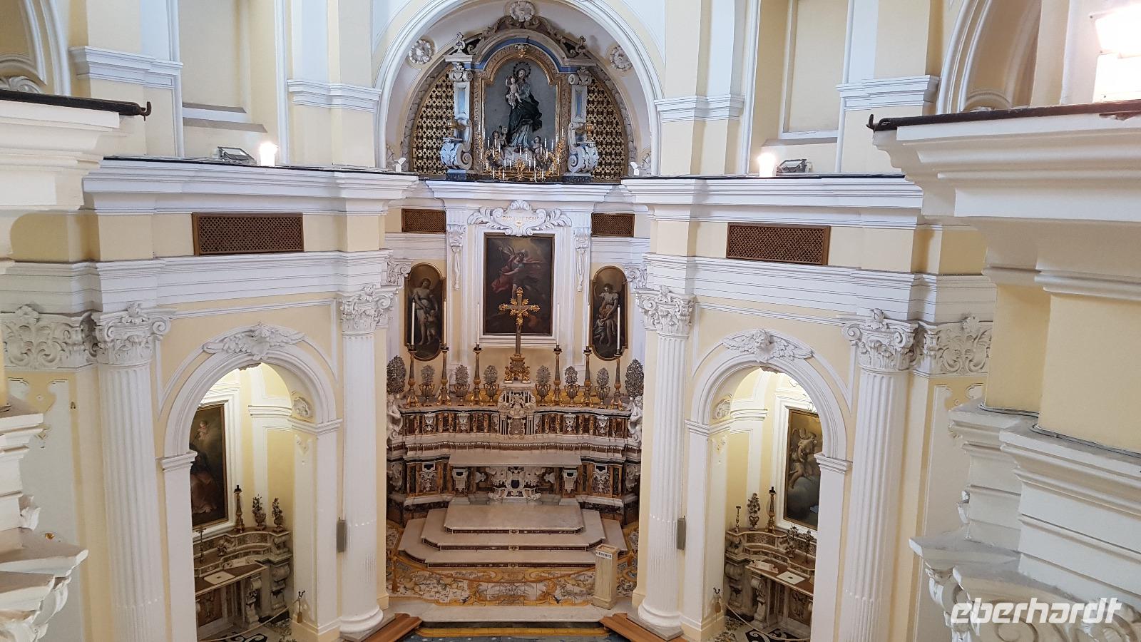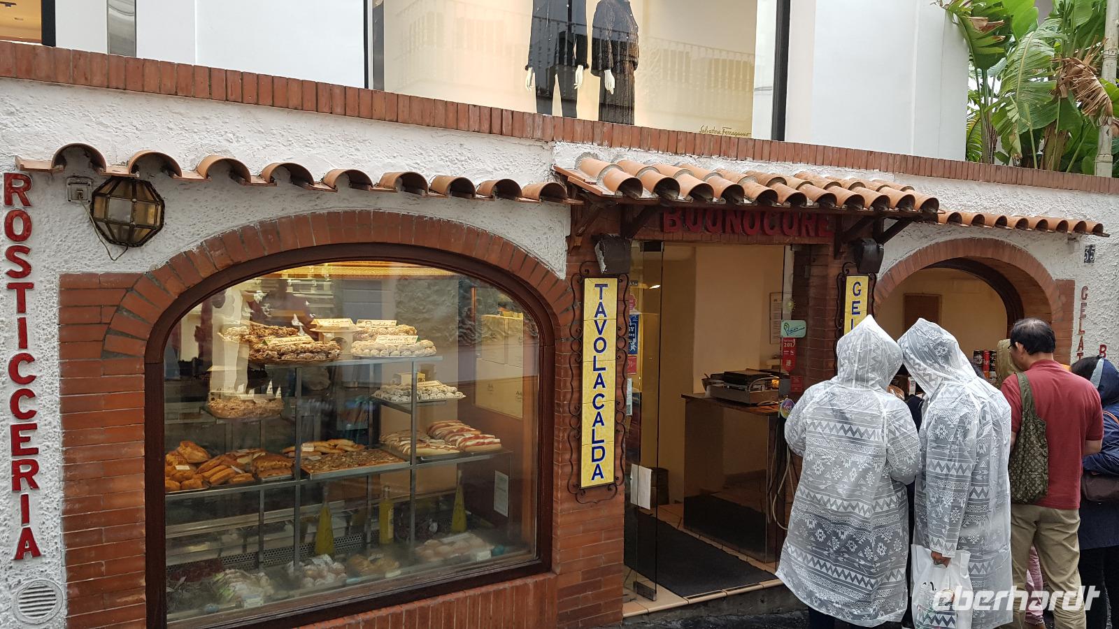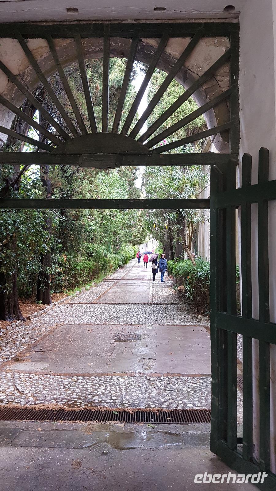 Das Frühstück war unsere erste positive Überraschung des Tages, denn es war ganz ausgezeichnet. Wir konnten beim Frühstück drin oder draussen unter einem Dach sitzen und die ersten Regenschauer ganz entspannt ertragen. Annamaria, unsere Capreser Reiseleiterin, holte uns im Hotel ab. Den Beginn unseres Besichtigungsprogramms hatten wir schon auf 9.30 Uhr verschoben, in der Hoffnung, dass der Regen dann vorbei sei. Aber während wir zum Kartäuserkloster unterwegs waren, gab es nochmals sehr kräftige Gewitterschläge und dann im Kloster schüttete es ganz mächtig. Die Wasserspeier konnten die Wassermassen nicht aufnehmen und so entstanden noch recht interessante Fotos in den Innenhöfen des Klosters und wir konnten uns Zeit lassen und die Gemälde von Diefenbach in aller Ruhe betrachten. Als der Regen vorbei war, gingen wir zu den Augustusgärten und machten unterwegs einen Stopp an der Parfümerie Carthusia. Auf den Aussichtsterrassen der Augustusgärten waren schon viele Gruppen unterwegs und wir brauchten viel Geduld, um bis zu den schönsten Fotomotiven vorzudringen. Aber im Gegensatz zu den Tagestouristen hatten wir ja Zeit.