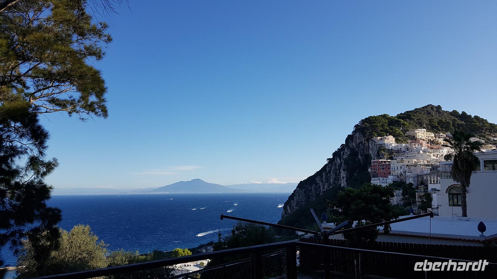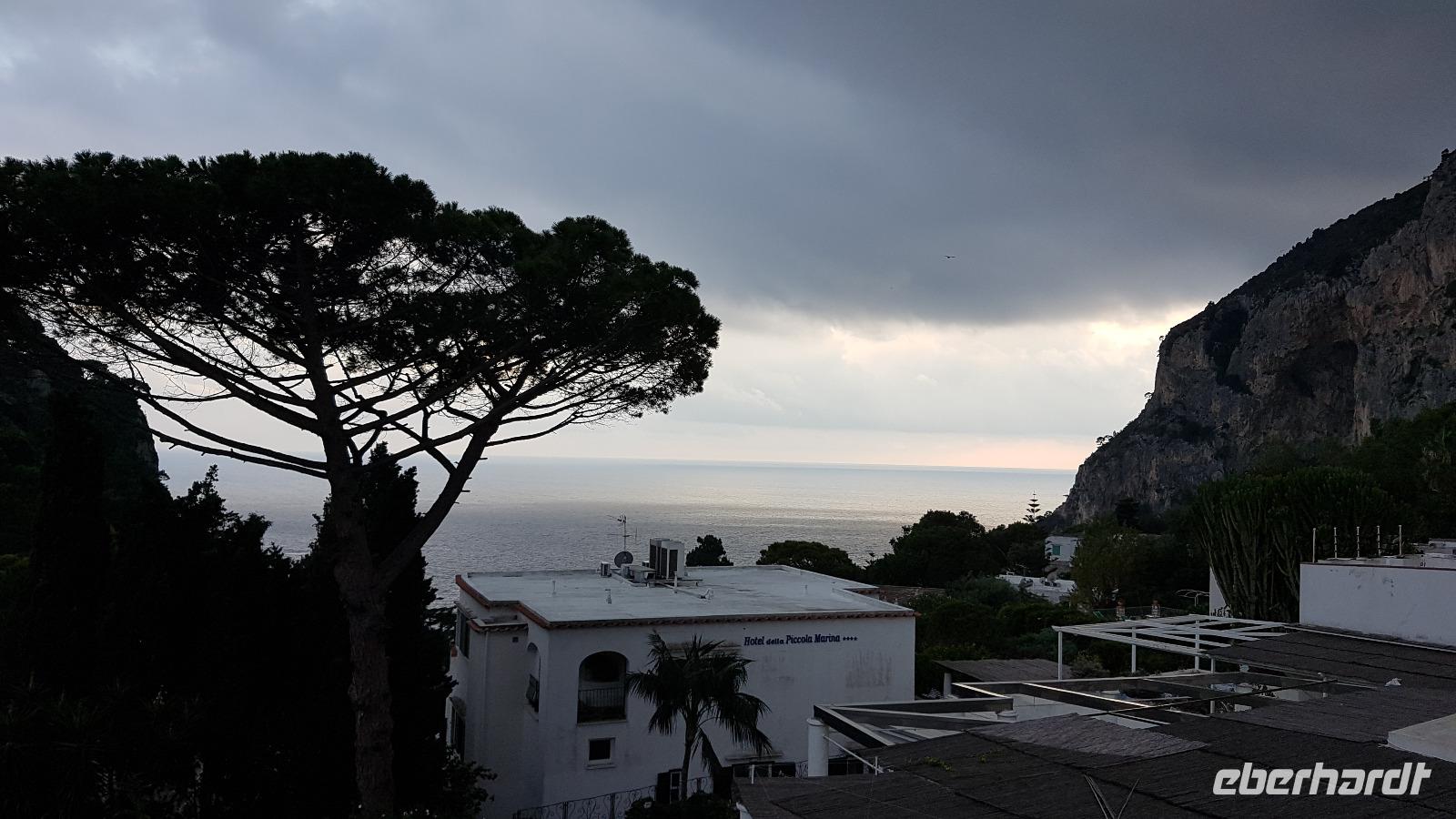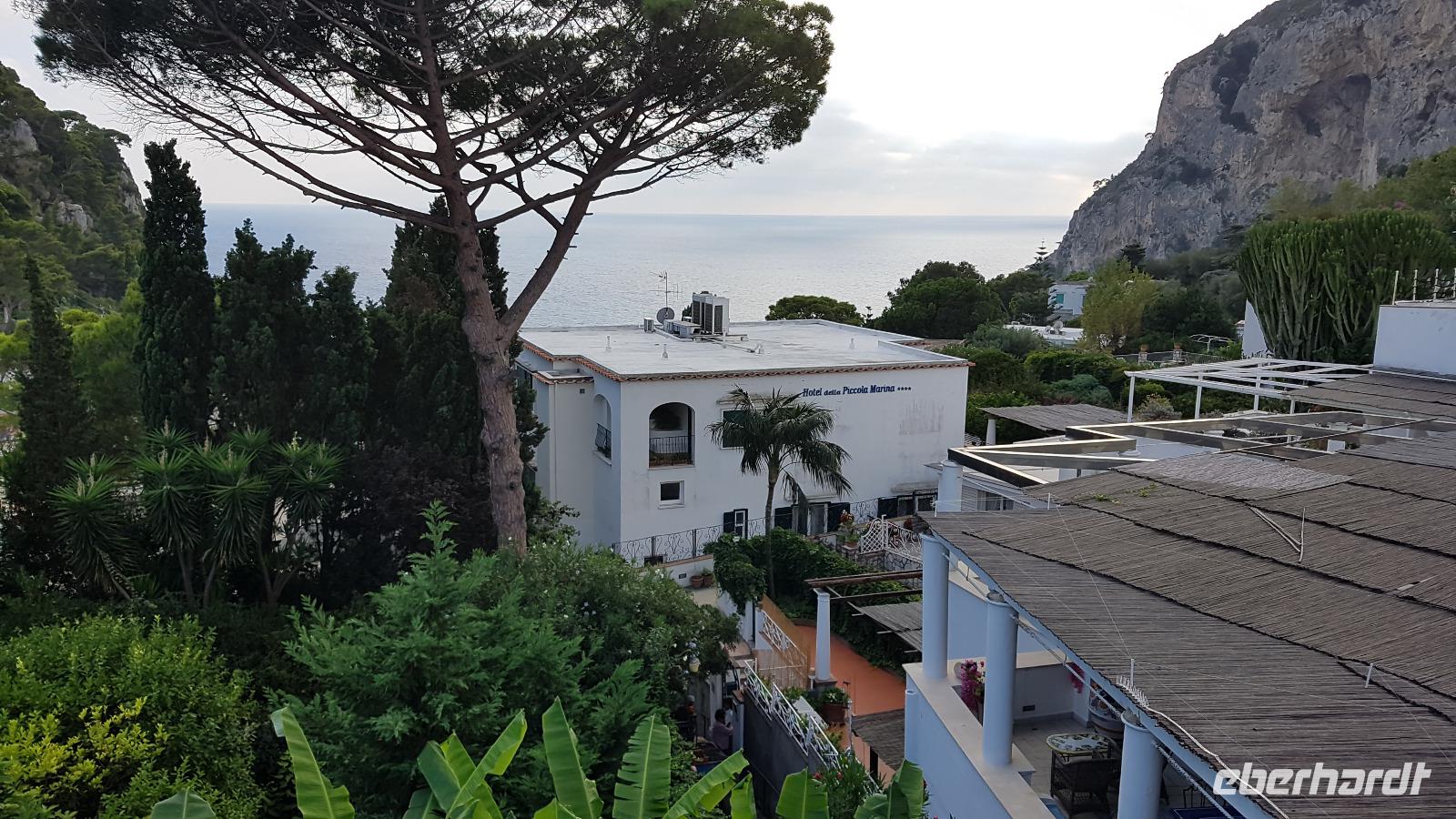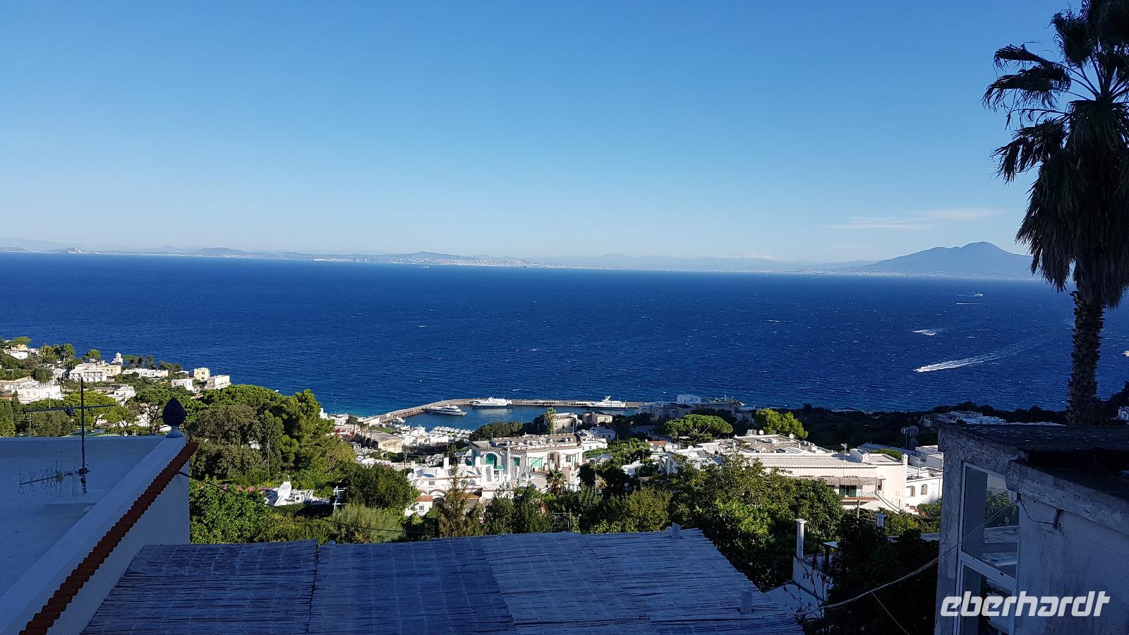 Von Dresden, Hamburg und Leipzig flogen wir alle mit Lufthansa über München oder Frankfurt nach Neapel und dort traf sich unsere kleine Gruppe ganz planmässig am Flughafen. Noch schnell einen erster italienischer Kaffee im Stehen trinken und Knabbereien sowie Wasser im Flughafen Kiosk kaufen und dann gingen wir auch schon los mit unseren Koffern zum Bus, der uns das kurze Stück zum Fährhafen in die Innenstadt von Neapel brachte. Dort besorgte ich flink unsere Fährtickets und nach wenigen Minuten durften wir an Bord der Fähre von Navigazione Libera del Golfo (NLG) gehen. Die Sonne schien, es war warm und so nahmen wir am Oberdeck Platz. Im Hafen von Neapel lagen viele Kreuzfahrtschiffe und zahlreiche grössere und kleinere Fährboote waren unterwegs. Beim Auslaufen konnten wir den Blick auf die Stadt, den Vesuv und die Orte am Golf von Neapel geniessen, denn die See war recht ruhig. In Capri Marina Grande kamen wir dann ganz pünktlich an, übergaben unsere Koffer einem Gepäckdienst und gingen dann zu Fuss zur Funicolare. Die bereits 1907 in Betrieb genommene Standseilbahn überwindet fast 140 Höhenmeter und befördert 140 Passagiere in 5 Minuten und das von morgens 6.30 bis nachts 21.30 Uhr. Oben angekommen, orientierten wir uns erst einmal und liefen dann über die Via Roma bis zu unserem Hotel Piccola Marina. Das lag abseits von Strassen und war nur zu Fuss auf einem recht steilen Weg zu erreichen. Die Zimmer waren schnell verteilt und 18 Uhr trafen wir uns zu einem kleinen Empfang mit Prosecco, Wein und verschiedenen Snacks. Ich informierte zu unserem Programm und anschliessend ging ein Teil unserer Gruppe noch zur nahe gelegenen Pizzeria Verginiello. Inzwischen war ein Gewitter aufgezogen und wir sahen die Blitze über dem Golf zucken, wie in einem Theater. In einer Regenpause gingen wir flink zurück in unser Hotel.