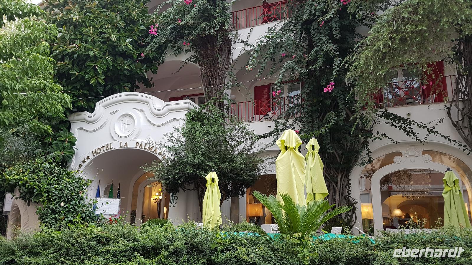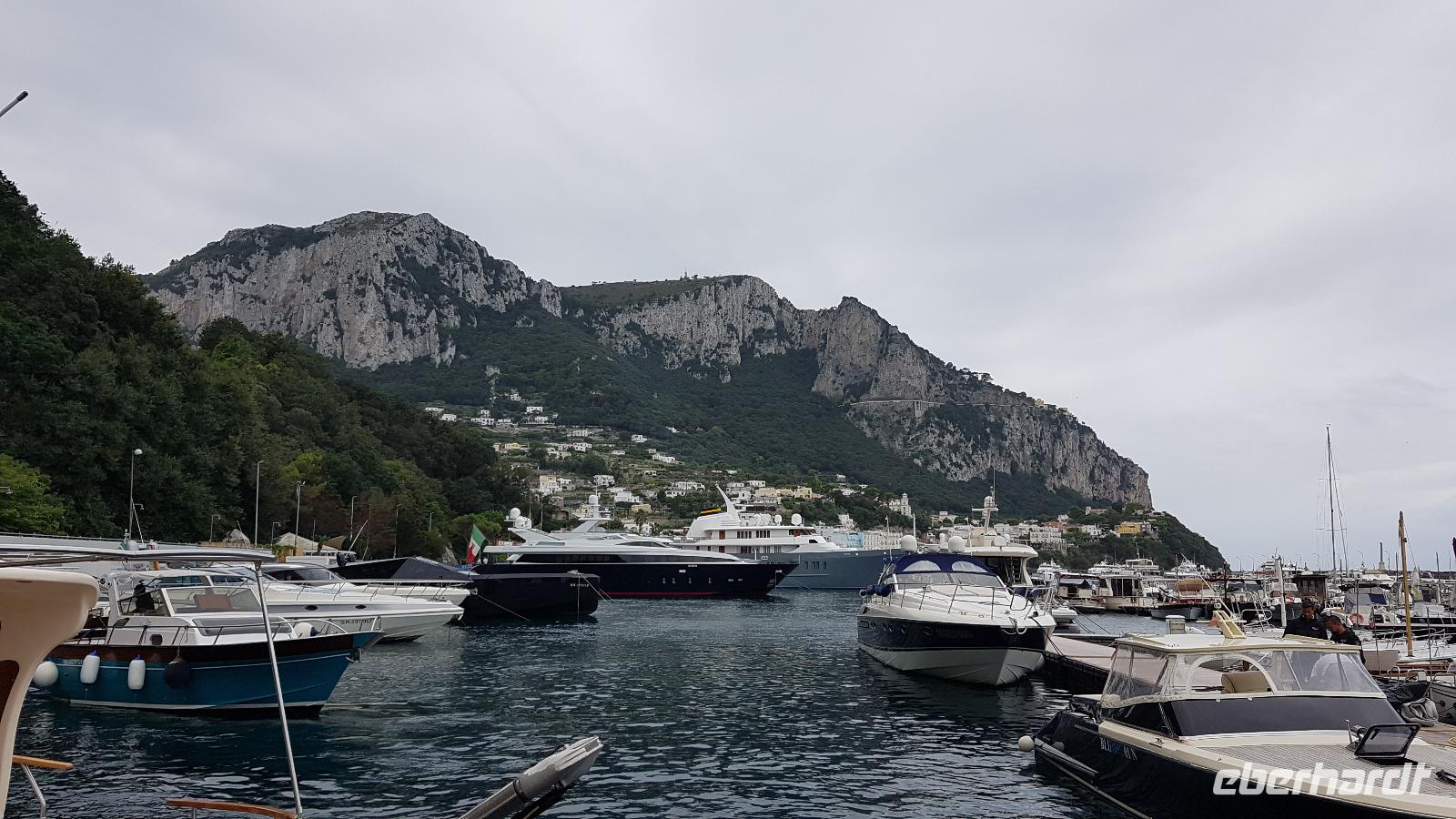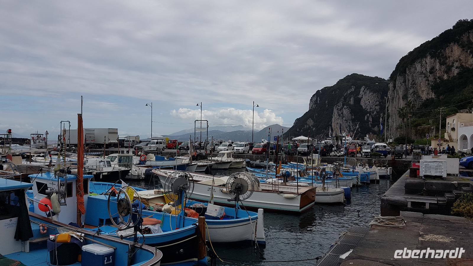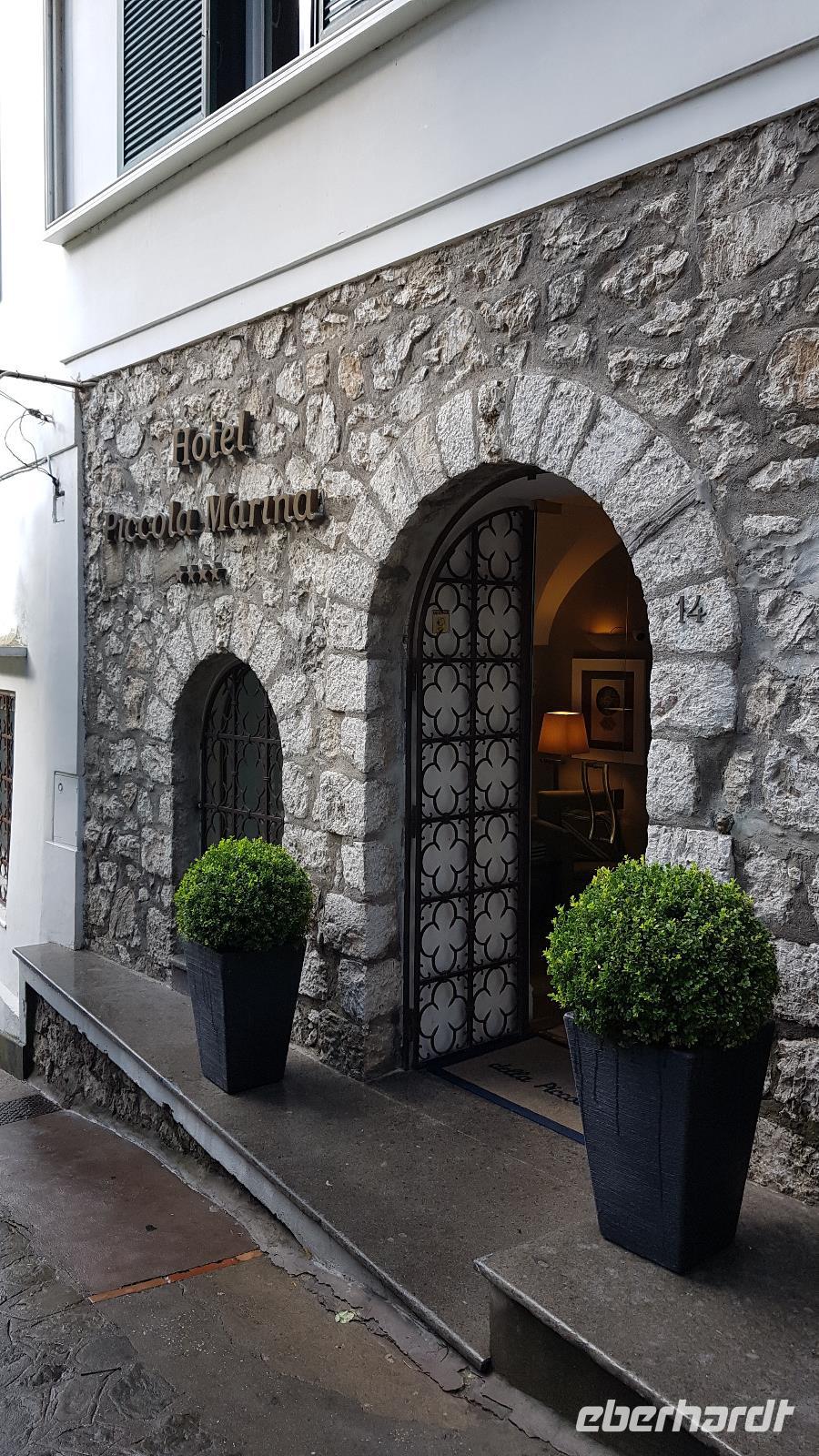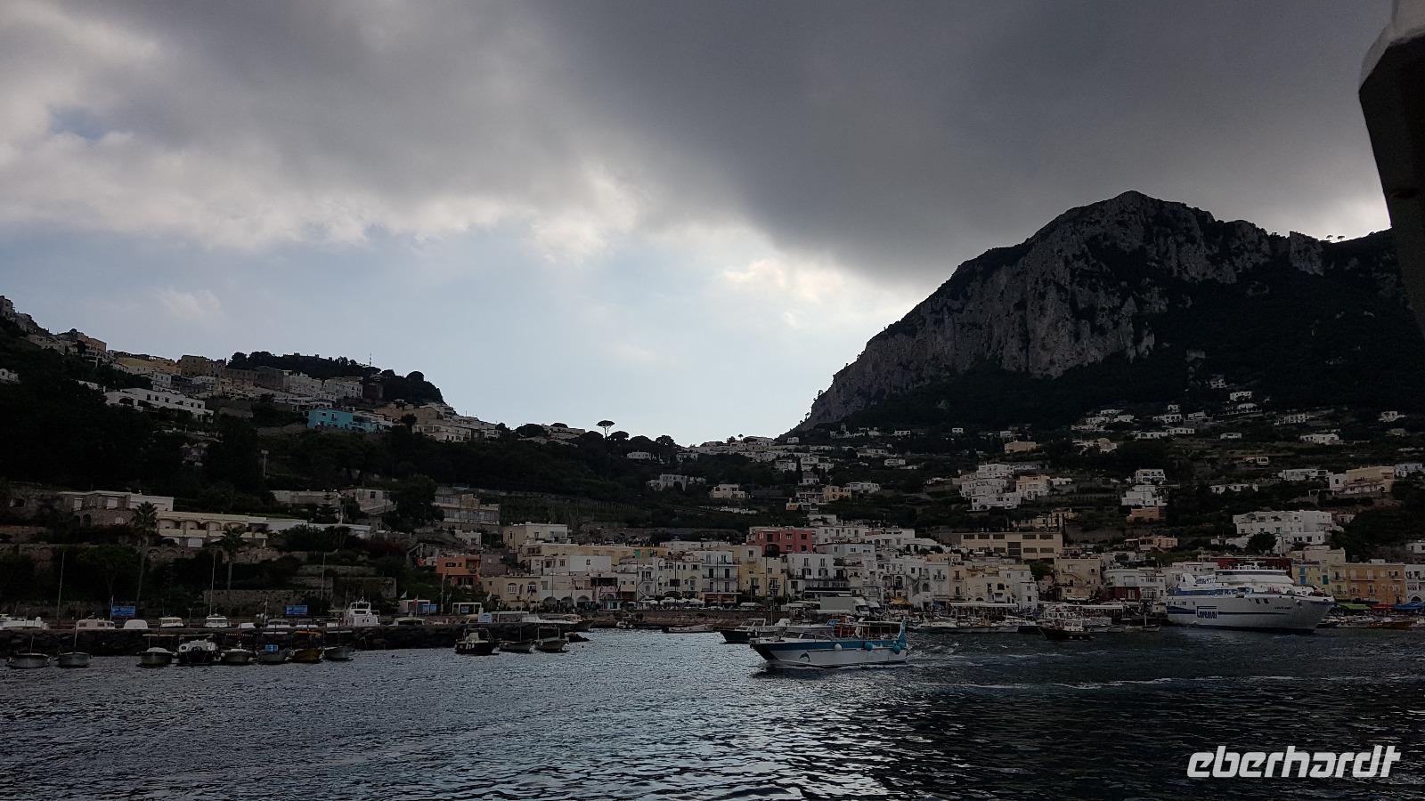 Von Dresden, Hamburg und Leipzig flogen wir alle mit Lufthansa über München oder Frankfurt nach Neapel und dort traf sich unsere kleine Gruppe ganz planmässig am Flughafen. Noch schnell einen erster italienischer Kaffee im Stehen trinken und Knabbereien sowie Wasser im Flughafen Kiosk kaufen und dann gingen wir auch schon los mit unseren Koffern zum Bus, der uns das kurze Stück zum Fährhafen in die Innenstadt von Neapel brachte. Dort besorgte ich flink unsere Fährtickets und nach wenigen Minuten durften wir an Bord der Fähre von Navigazione Libera del Golfo (NLG) gehen. Die Sonne schien, es war warm und so nahmen wir am Oberdeck Platz. Im Hafen von Neapel lagen viele Kreuzfahrtschiffe und zahlreiche grössere und kleinere Fährboote waren unterwegs. Beim Auslaufen konnten wir den Blick auf die Stadt, den Vesuv und die Orte am Golf von Neapel geniessen, denn die See war recht ruhig. In Capri Marina Grande kamen wir dann ganz pünktlich an, übergaben unsere Koffer einem Gepäckdienst und gingen dann zu Fuss zur Funicolare. Die bereits 1907 in Betrieb genommene Standseilbahn überwindet fast 140 Höhenmeter und befördert 140 Passagiere in 5 Minuten und das von morgens 6.30 bis nachts 21.30 Uhr. Oben angekommen, orientierten wir uns erst einmal und liefen dann über die Via Roma bis zu unserem Hotel Piccola Marina. Das lag abseits von Strassen und war nur zu Fuss auf einem recht steilen Weg zu erreichen. Die Zimmer waren schnell verteilt und 18 Uhr trafen wir uns zu einem kleinen Empfang mit Prosecco, Wein und verschiedenen Snacks. Ich informierte zu unserem Programm und anschliessend ging ein Teil unserer Gruppe noch zur nahe gelegenen Pizzeria Verginiello. Inzwischen war ein Gewitter aufgezogen und wir sahen die Blitze über dem Golf zucken, wie in einem Theater. In einer Regenpause gingen wir flink zurück in unser Hotel.