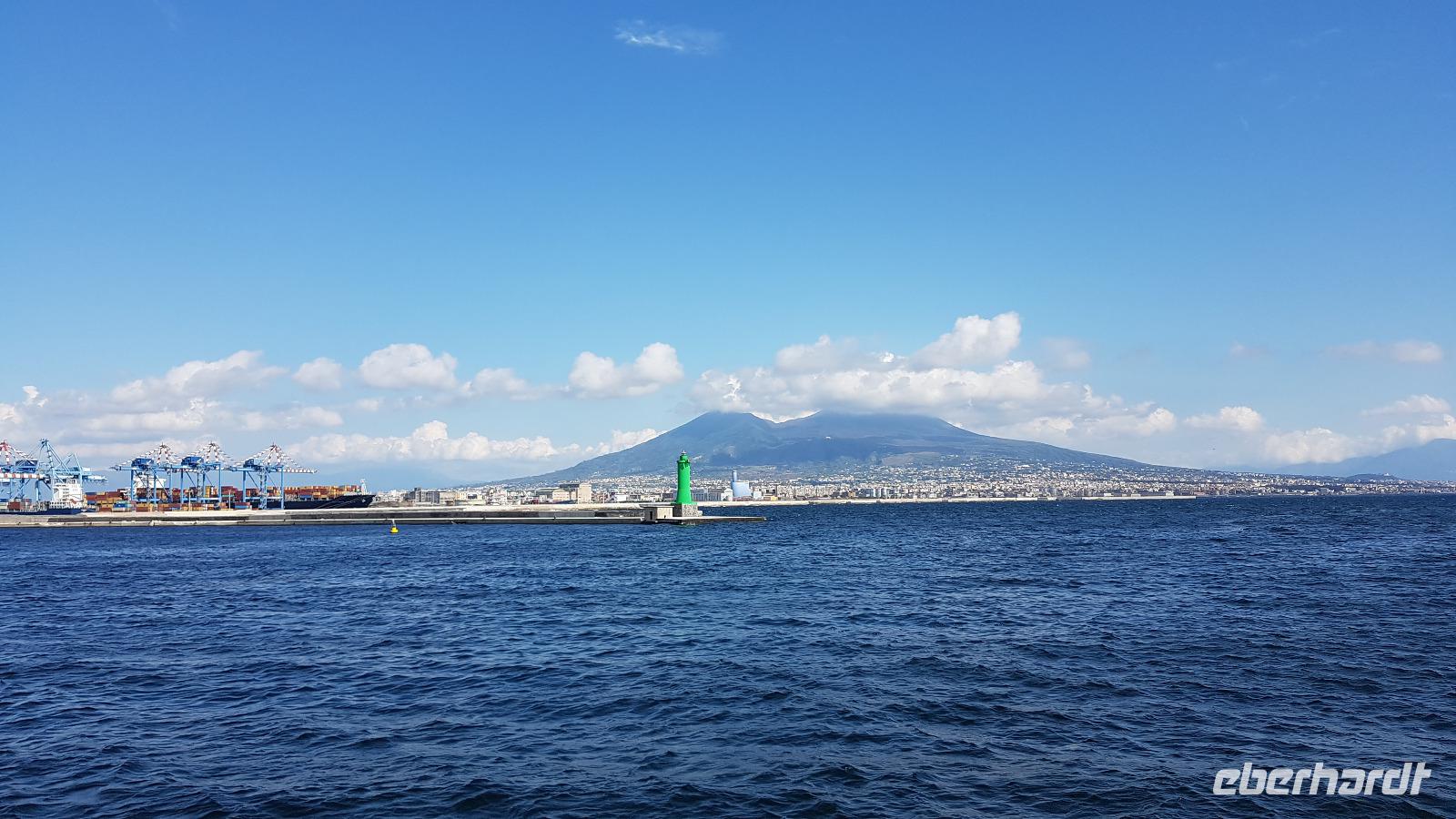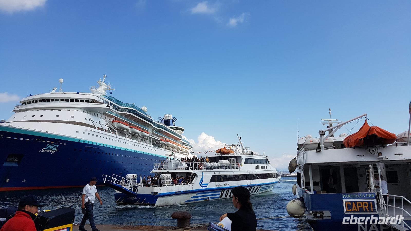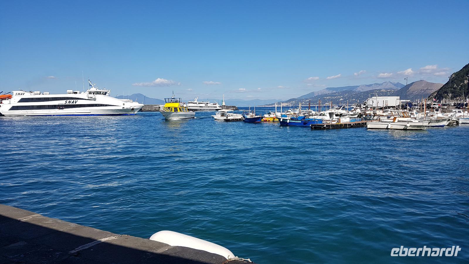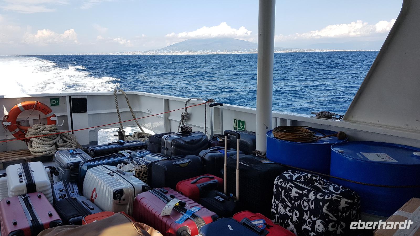 Von Dresden, Hamburg und Leipzig flogen wir alle mit Lufthansa über München oder Frankfurt nach Neapel und dort traf sich unsere kleine Gruppe ganz planmässig am Flughafen. Noch schnell einen erster italienischer Kaffee im Stehen trinken und Knabbereien sowie Wasser im Flughafen Kiosk kaufen und dann gingen wir auch schon los mit unseren Koffern zum Bus, der uns das kurze Stück zum Fährhafen in die Innenstadt von Neapel brachte. Dort besorgte ich flink unsere Fährtickets und nach wenigen Minuten durften wir an Bord der Fähre von Navigazione Libera del Golfo (NLG) gehen. Die Sonne schien, es war warm und so nahmen wir am Oberdeck Platz. Im Hafen von Neapel lagen viele Kreuzfahrtschiffe und zahlreiche grössere und kleinere Fährboote waren unterwegs. Beim Auslaufen konnten wir den Blick auf die Stadt, den Vesuv und die Orte am Golf von Neapel geniessen, denn die See war recht ruhig. In Capri Marina Grande kamen wir dann ganz pünktlich an, übergaben unsere Koffer einem Gepäckdienst und gingen dann zu Fuss zur Funicolare. Die bereits 1907 in Betrieb genommene Standseilbahn überwindet fast 140 Höhenmeter und befördert 140 Passagiere in 5 Minuten und das von morgens 6.30 bis nachts 21.30 Uhr. Oben angekommen, orientierten wir uns erst einmal und liefen dann über die Via Roma bis zu unserem Hotel Piccola Marina. Das lag abseits von Strassen und war nur zu Fuss auf einem recht steilen Weg zu erreichen. Die Zimmer waren schnell verteilt und 18 Uhr trafen wir uns zu einem kleinen Empfang mit Prosecco, Wein und verschiedenen Snacks. Ich informierte zu unserem Programm und anschliessend ging ein Teil unserer Gruppe noch zur nahe gelegenen Pizzeria Verginiello. Inzwischen war ein Gewitter aufgezogen und wir sahen die Blitze über dem Golf zucken, wie in einem Theater. In einer Regenpause gingen wir flink zurück in unser Hotel.