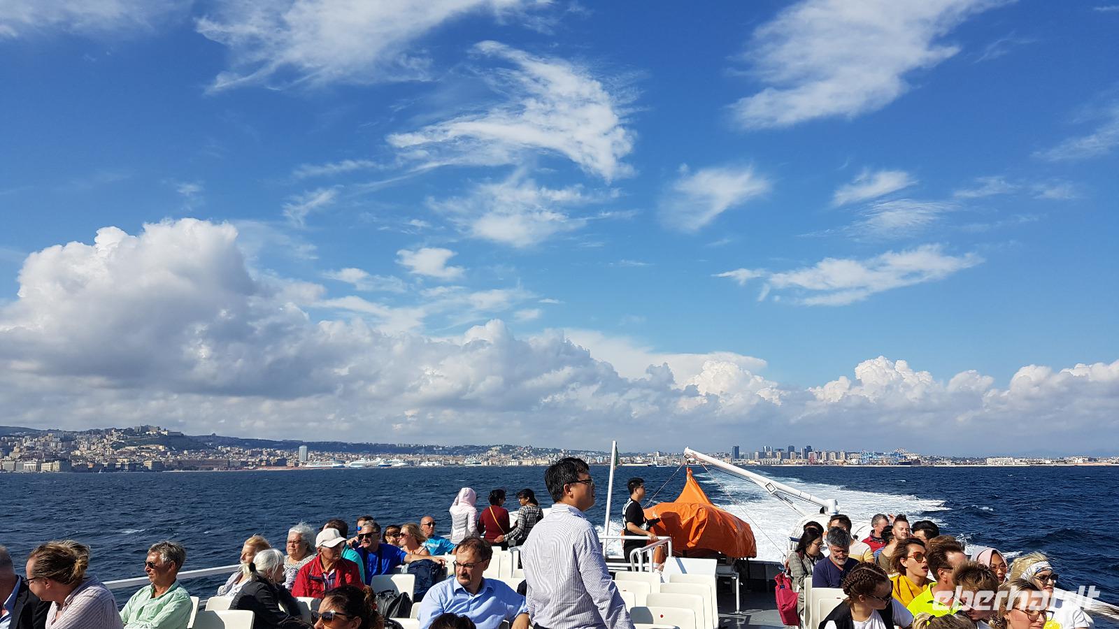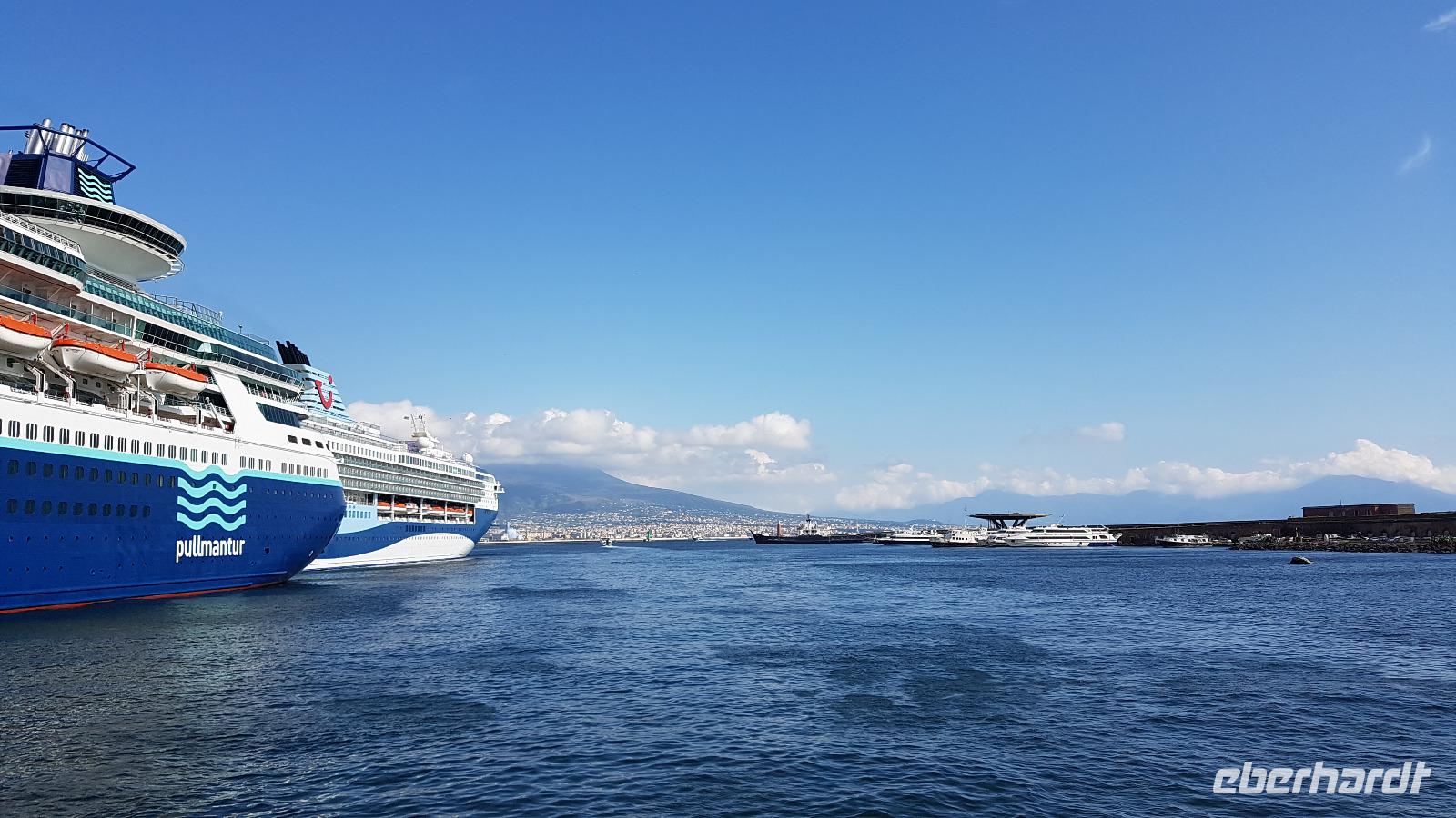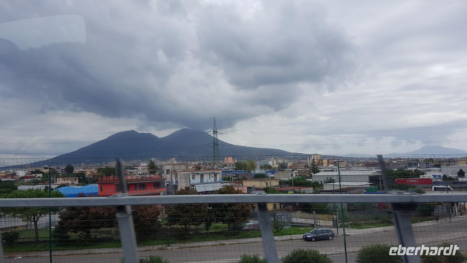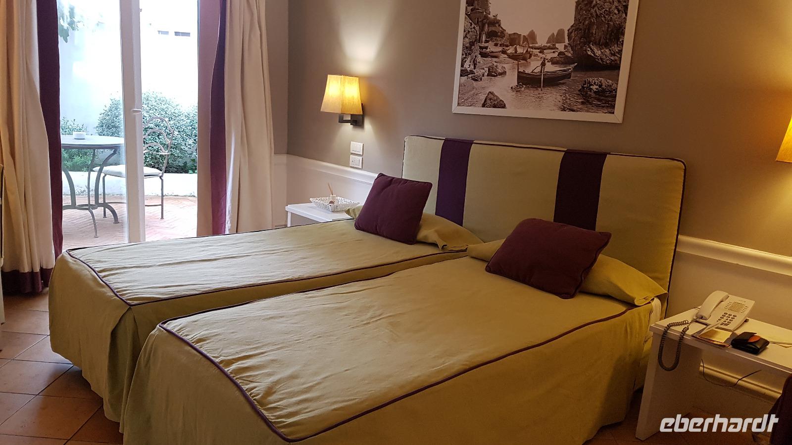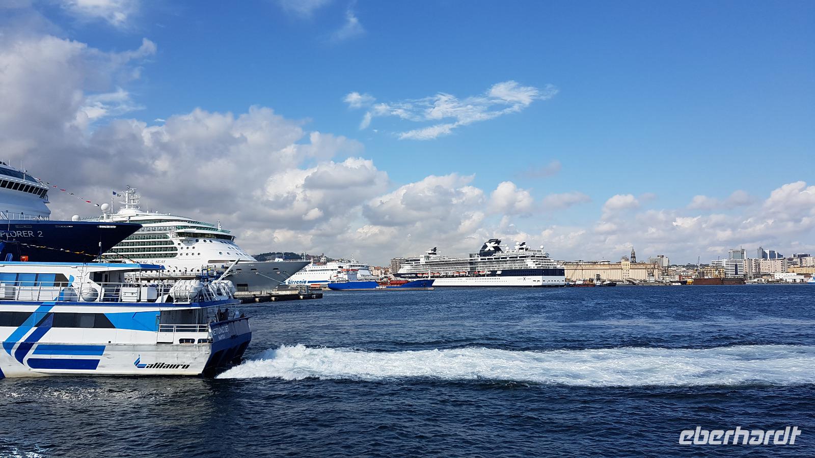 Von Dresden, Hamburg und Leipzig flogen wir alle mit Lufthansa über München oder Frankfurt nach Neapel und dort traf sich unsere kleine Gruppe ganz planmässig am Flughafen. Noch schnell einen erster italienischer Kaffee im Stehen trinken und Knabbereien sowie Wasser im Flughafen Kiosk kaufen und dann gingen wir auch schon los mit unseren Koffern zum Bus, der uns das kurze Stück zum Fährhafen in die Innenstadt von Neapel brachte. Dort besorgte ich flink unsere Fährtickets und nach wenigen Minuten durften wir an Bord der Fähre von Navigazione Libera del Golfo (NLG) gehen. Die Sonne schien, es war warm und so nahmen wir am Oberdeck Platz. Im Hafen von Neapel lagen viele Kreuzfahrtschiffe und zahlreiche grössere und kleinere Fährboote waren unterwegs. Beim Auslaufen konnten wir den Blick auf die Stadt, den Vesuv und die Orte am Golf von Neapel geniessen, denn die See war recht ruhig. In Capri Marina Grande kamen wir dann ganz pünktlich an, übergaben unsere Koffer einem Gepäckdienst und gingen dann zu Fuss zur Funicolare. Die bereits 1907 in Betrieb genommene Standseilbahn überwindet fast 140 Höhenmeter und befördert 140 Passagiere in 5 Minuten und das von morgens 6.30 bis nachts 21.30 Uhr. Oben angekommen, orientierten wir uns erst einmal und liefen dann über die Via Roma bis zu unserem Hotel Piccola Marina. Das lag abseits von Strassen und war nur zu Fuss auf einem recht steilen Weg zu erreichen. Die Zimmer waren schnell verteilt und 18 Uhr trafen wir uns zu einem kleinen Empfang mit Prosecco, Wein und verschiedenen Snacks. Ich informierte zu unserem Programm und anschliessend ging ein Teil unserer Gruppe noch zur nahe gelegenen Pizzeria Verginiello. Inzwischen war ein Gewitter aufgezogen und wir sahen die Blitze über dem Golf zucken, wie in einem Theater. In einer Regenpause gingen wir flink zurück in unser Hotel.
