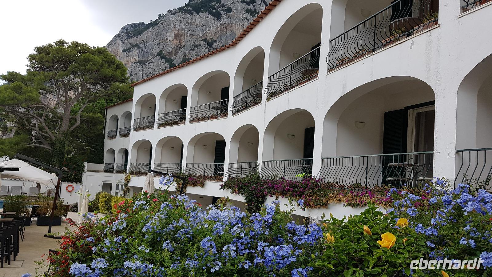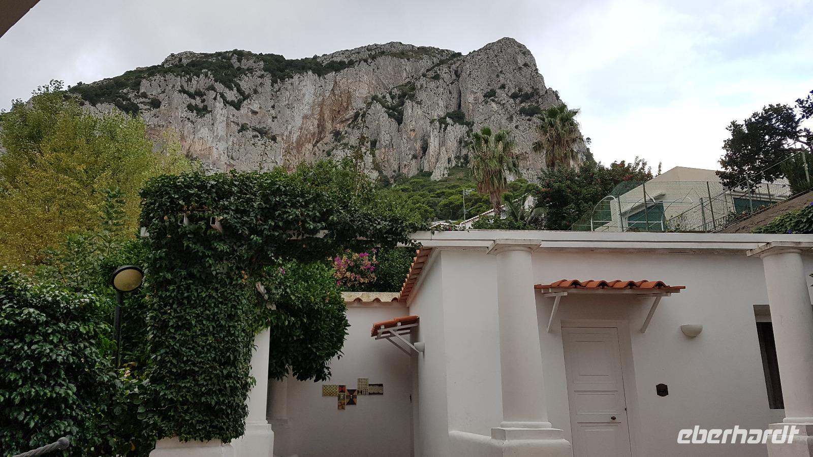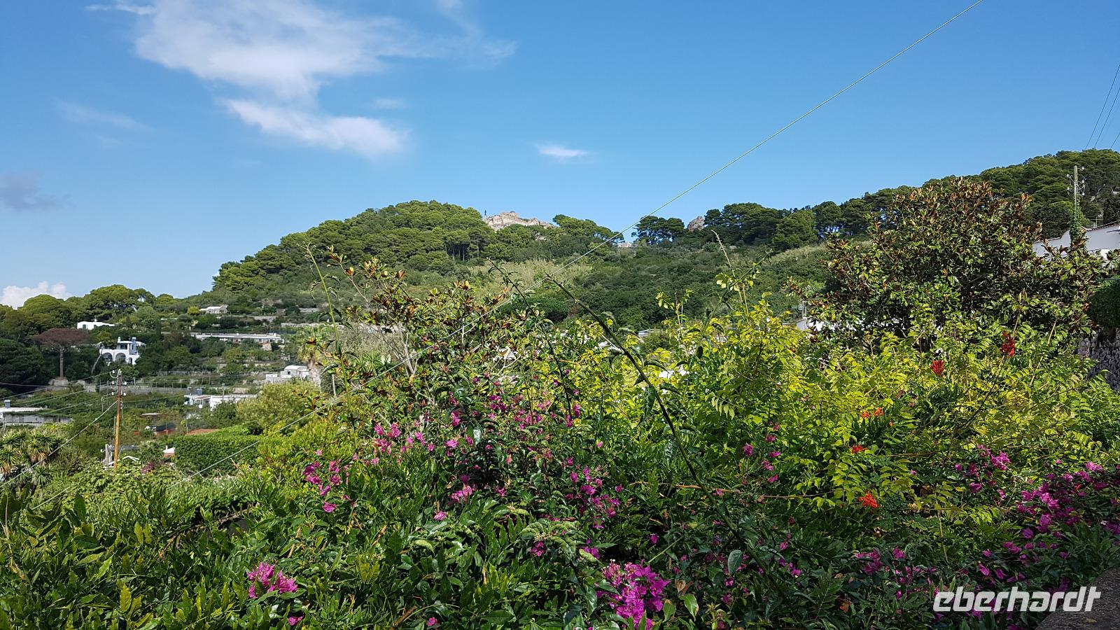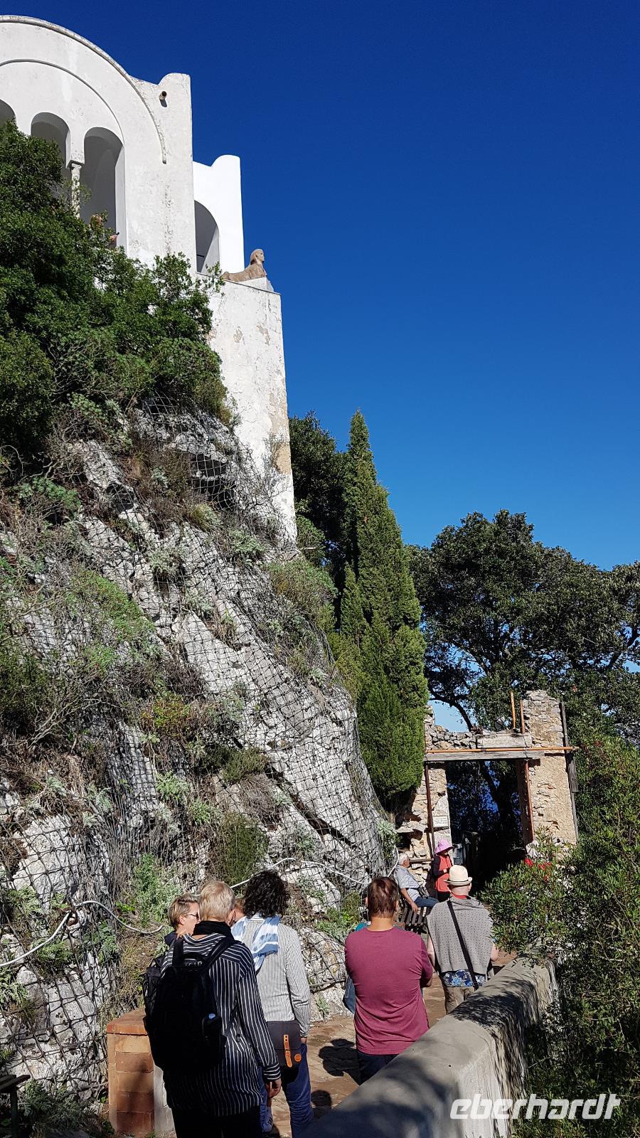 Unser ausgeschriebenes Programm hatten wir abgearbeitet mit passendem Wetter und nun war ein Tag zum Geniessen angesagt. Das Frühstück begann später und dauerte länger und dann hatten wir auch noch ein Geburtstagskind in der Gruppe. Jeder hatte sich für den Tag etwas vorgenommen und einige Gäste brachen mit mir zu einer Wanderung zur Pizzo Lungo auf. Wir spazierten durch die Gassen von Capri bis zum Naturbogen und gingen dann aber die vielen vielen Treppen hinunter zur Crotta Matromania. Einst war das ein kultischer Ort und bei den Römern ein Nymphäum. Später liebten die Hippies diesen Platz. Weitere Stufen führten immer weiter nach unten bis wir fast am Meer waren. Der Weg verlief im Wald und dann kamen wir treppauf zur Aussicht auf die Villa Malaparte. Der Weg verlief in den Felsen und bot immer wieder schöne Ausblicke auf das Meer und die Faraglioni Felsen. Bei der Punta Tragara erreichten wir die Aussichtsterrasse des Hotels und genossen den Blick auf Capris Küste. An den Mauern entdeckten wir Kapernpflanzen, die schon wieder blühten. Auf dem Rückweg durch den Ort nahmen wir einen kleinen Imbiss und gingen dann zurück ins Hotel.