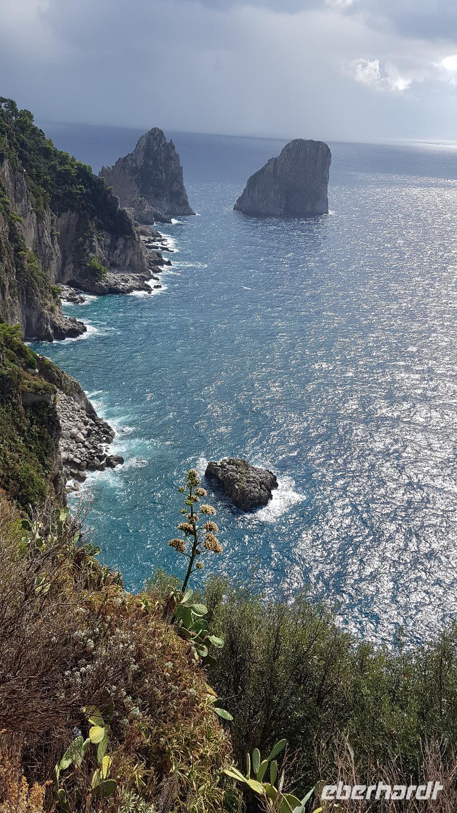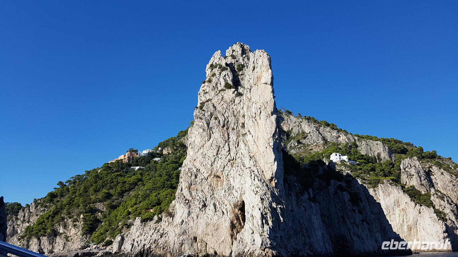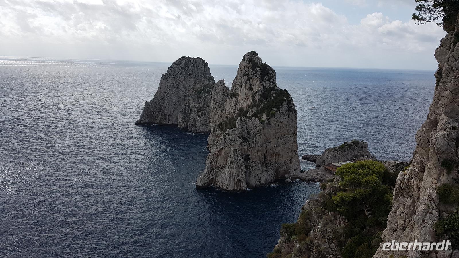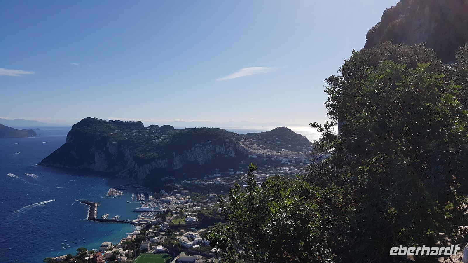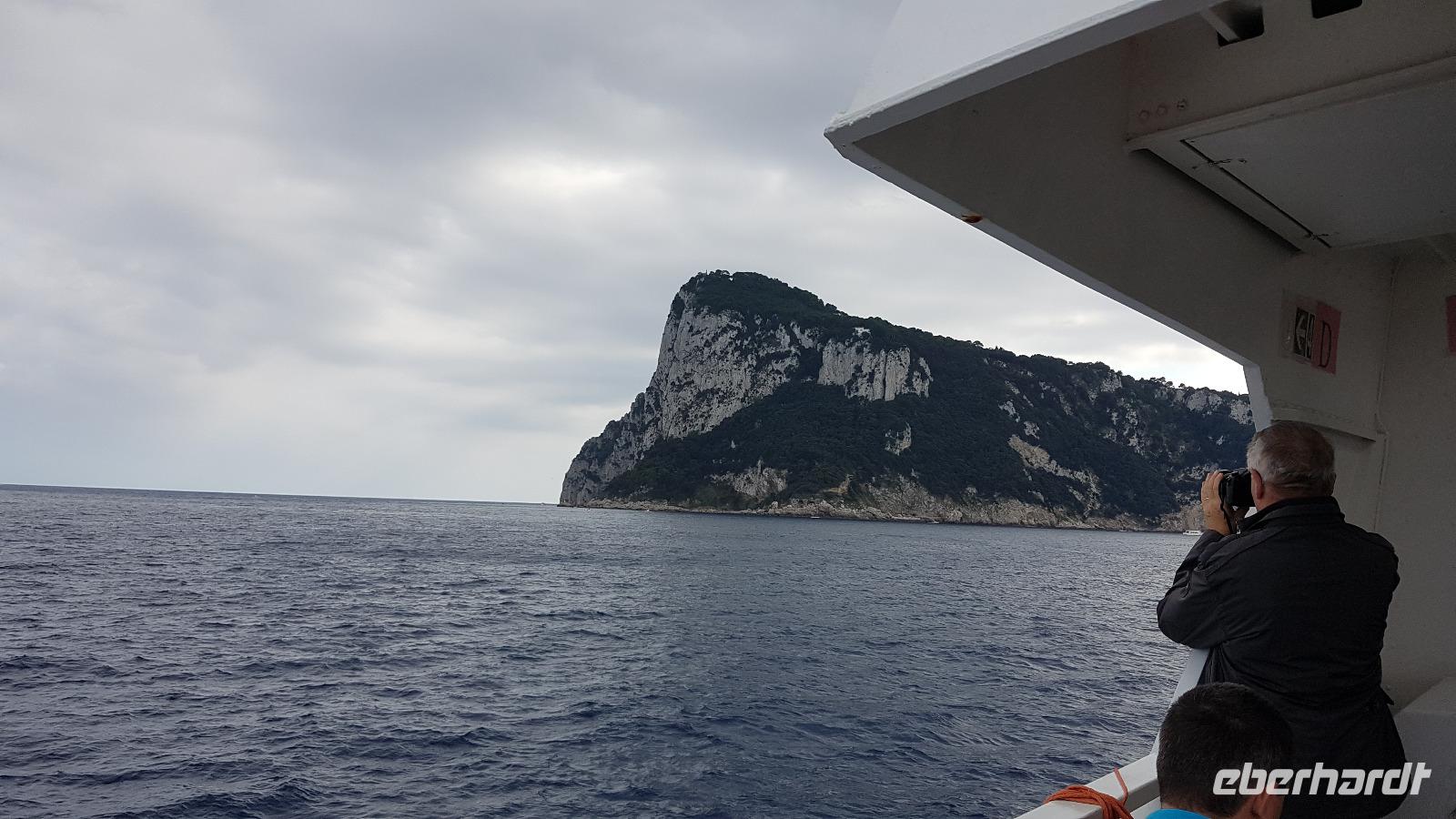 Unser ausgeschriebenes Programm hatten wir abgearbeitet mit passendem Wetter und nun war ein Tag zum Geniessen angesagt. Das Frühstück begann später und dauerte länger und dann hatten wir auch noch ein Geburtstagskind in der Gruppe. Jeder hatte sich für den Tag etwas vorgenommen und einige Gäste brachen mit mir zu einer Wanderung zur Pizzo Lungo auf. Wir spazierten durch die Gassen von Capri bis zum Naturbogen und gingen dann aber die vielen vielen Treppen hinunter zur Crotta Matromania. Einst war das ein kultischer Ort und bei den Römern ein Nymphäum. Später liebten die Hippies diesen Platz. Weitere Stufen führten immer weiter nach unten bis wir fast am Meer waren. Der Weg verlief im Wald und dann kamen wir treppauf zur Aussicht auf die Villa Malaparte. Der Weg verlief in den Felsen und bot immer wieder schöne Ausblicke auf das Meer und die Faraglioni Felsen. Bei der Punta Tragara erreichten wir die Aussichtsterrasse des Hotels und genossen den Blick auf Capris Küste. An den Mauern entdeckten wir Kapernpflanzen, die schon wieder blühten. Auf dem Rückweg durch den Ort nahmen wir einen kleinen Imbiss und gingen dann zurück ins Hotel.