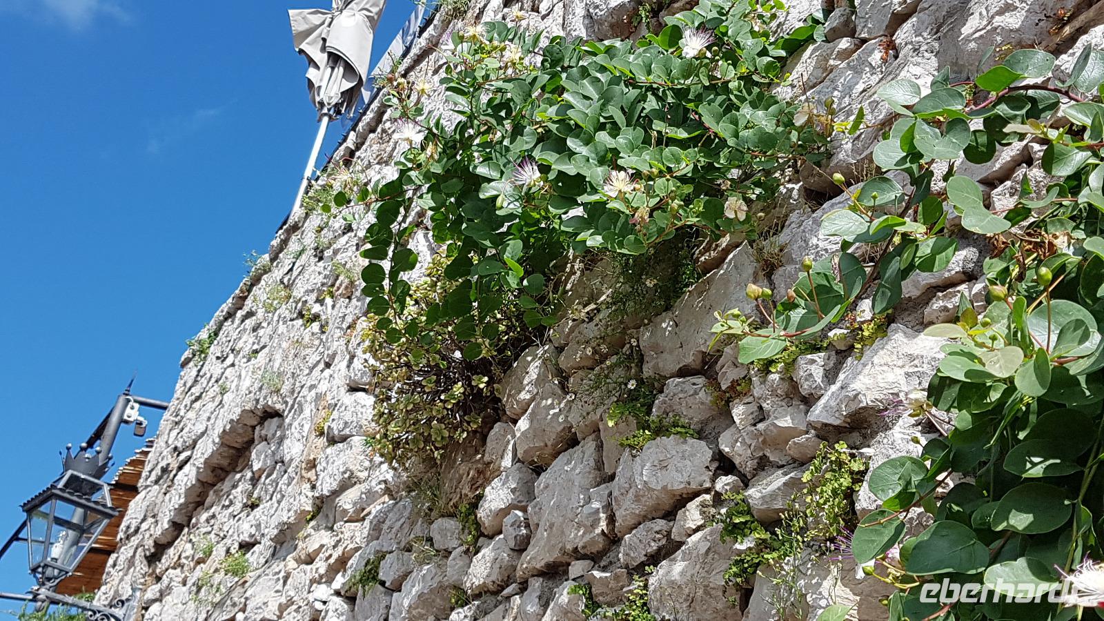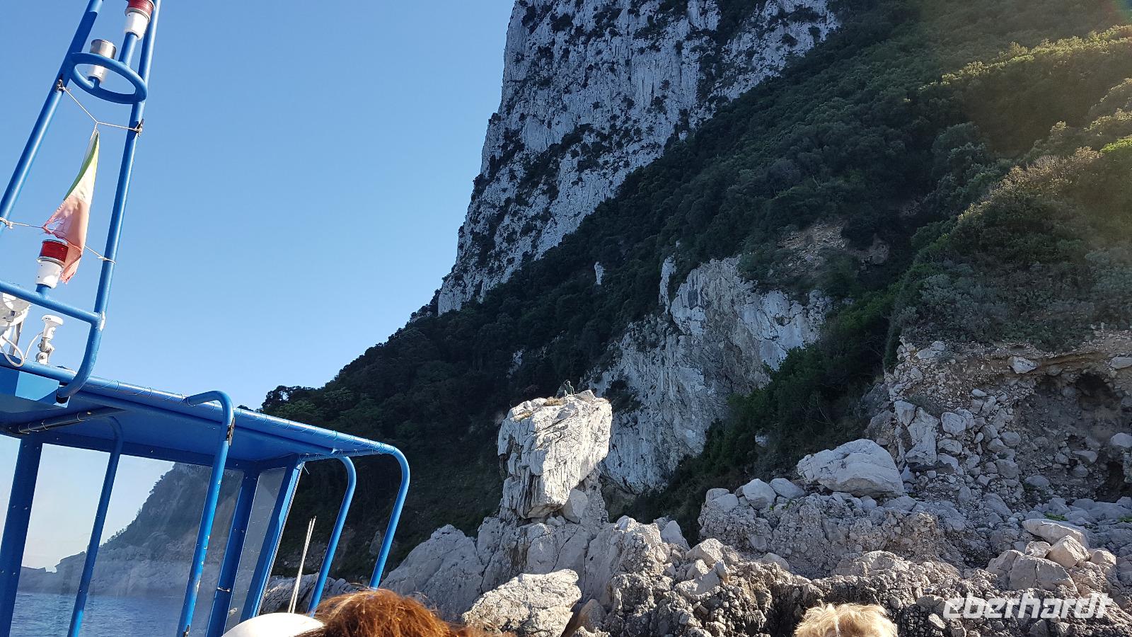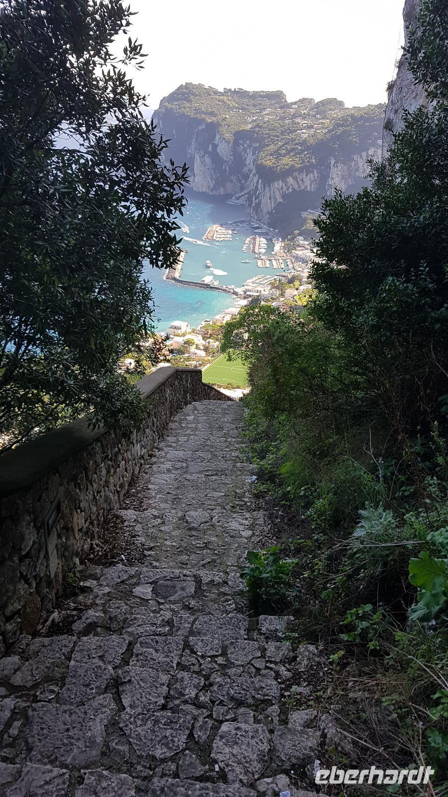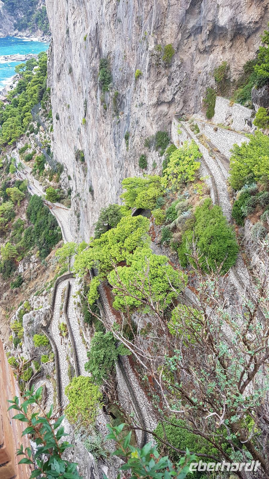 Unser ausgeschriebenes Programm hatten wir abgearbeitet mit passendem Wetter und nun war ein Tag zum Geniessen angesagt. Das Frühstück begann später und dauerte länger und dann hatten wir auch noch ein Geburtstagskind in der Gruppe. Jeder hatte sich für den Tag etwas vorgenommen und einige Gäste brachen mit mir zu einer Wanderung zur Pizzo Lungo auf. Wir spazierten durch die Gassen von Capri bis zum Naturbogen und gingen dann aber die vielen vielen Treppen hinunter zur Crotta Matromania. Einst war das ein kultischer Ort und bei den Römern ein Nymphäum. Später liebten die Hippies diesen Platz. Weitere Stufen führten immer weiter nach unten bis wir fast am Meer waren. Der Weg verlief im Wald und dann kamen wir treppauf zur Aussicht auf die Villa Malaparte. Der Weg verlief in den Felsen und bot immer wieder schöne Ausblicke auf das Meer und die Faraglioni Felsen. Bei der Punta Tragara erreichten wir die Aussichtsterrasse des Hotels und genossen den Blick auf Capris Küste. An den Mauern entdeckten wir Kapernpflanzen, die schon wieder blühten. Auf dem Rückweg durch den Ort nahmen wir einen kleinen Imbiss und gingen dann zurück ins Hotel.