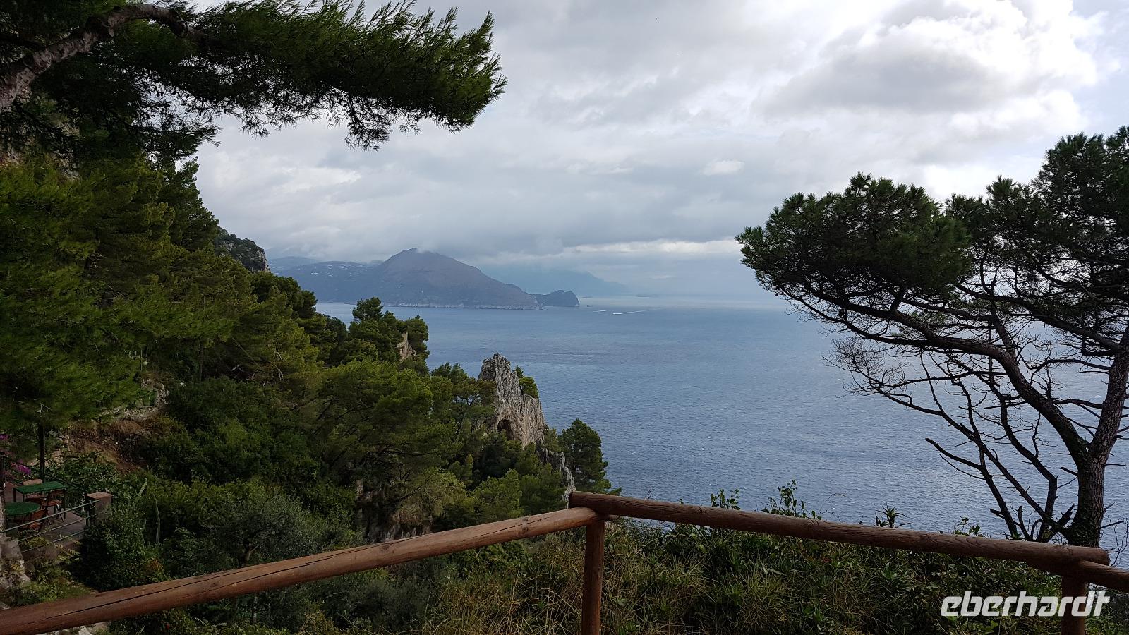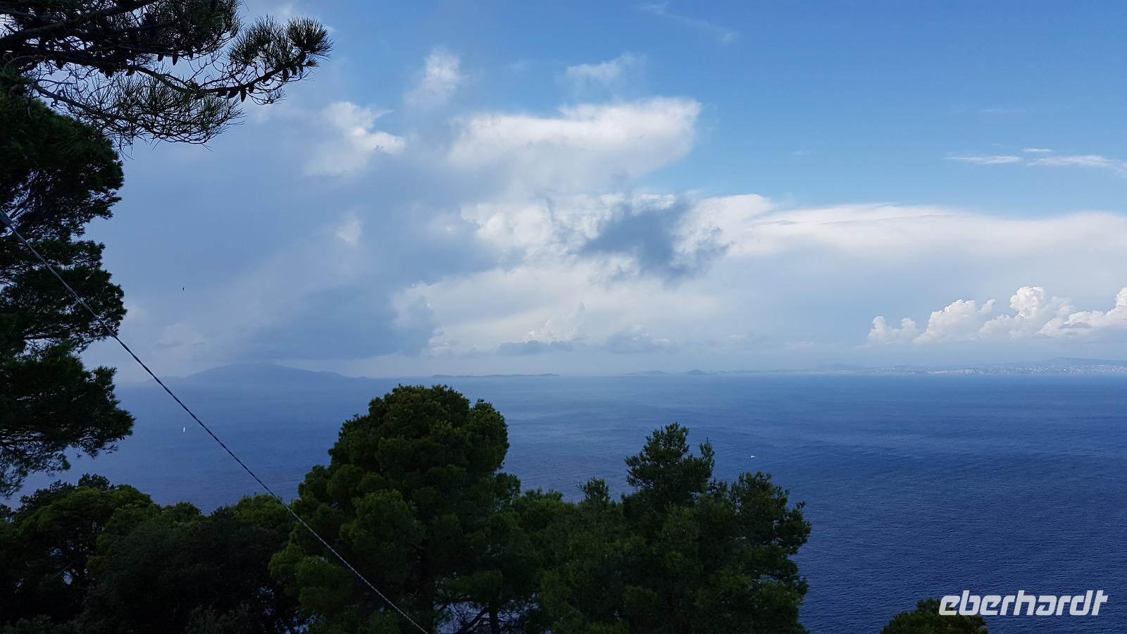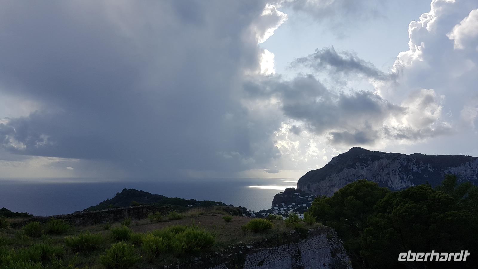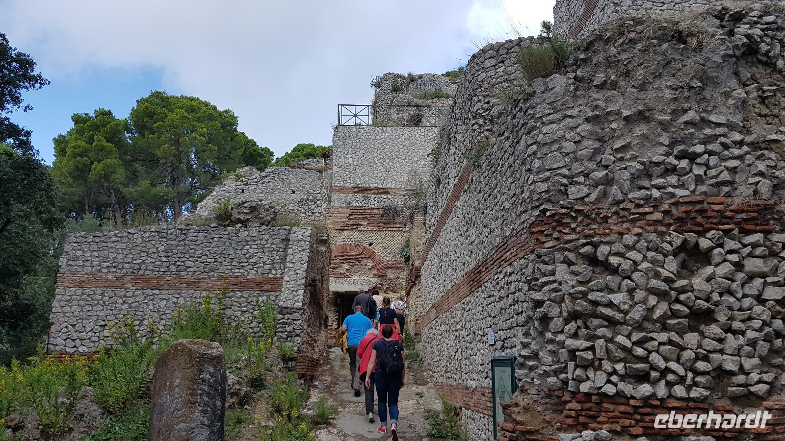 Als Kaiser Augustus auf dem Rückweg von einer siegreichen Schlacht in Capri Halt machte, beschloss er, auf dieser Insel eine Sommervilla zu errichten. Kaiser Tiberius hatte auf Capri 12 Villen und regierte seine letzten 11 Jahre das römische Reich von der Villa Jovis aus. Die Villa liegt auf einer Felsenklippe, von der man den Golf von Neapel hervorragend überwachen konnte. Die einst 8 Stockwerke hohe Villa beherbergt im Inneren eine riesige Zisterne mit 4 Kammern, die heute noch gut zu erkennen sind. Über die Jahre wurde die Villa geplündert und die Steine als Baumaterial der Capreser benutzt. So ist heute von der einstigen wertvollen Ausschmückung leider nichts mehr zu sehen. Die Aussichtsterrasse ganz oben bei der Kirche bot uns aber herrliche Ausblicke hinüber zum Vesuv, zur sorrentinischen Halbinsel und bis in den Golf von Salerno. Nach dem Besuch der Villa entschlossen wir uns, auf dem Wanderwege hinunter zur Villa Lysis zu gehen. Der Weg verlief zunächst an den unteren Mauerresten der Villa Jovis entlang und ging dann steil bergab mit einem grandiosen Ausblick auf den Golf von Neapel. In der Ferne hörten wir das Grollen eines Gewitters und gingen so recht zügig hinunter.