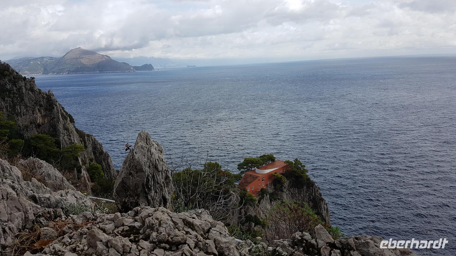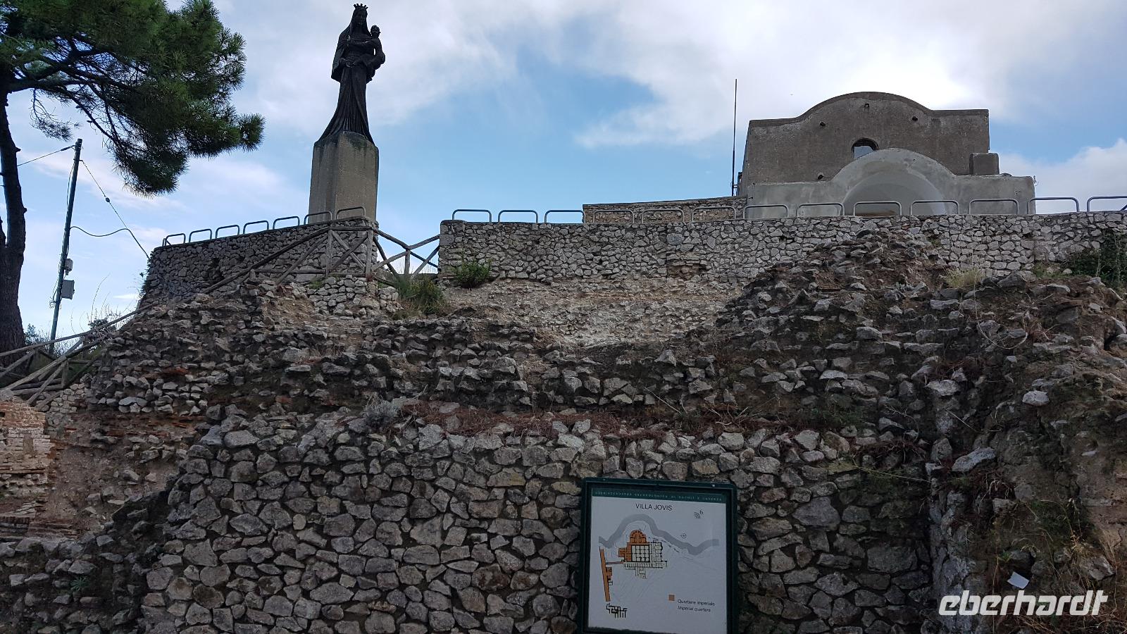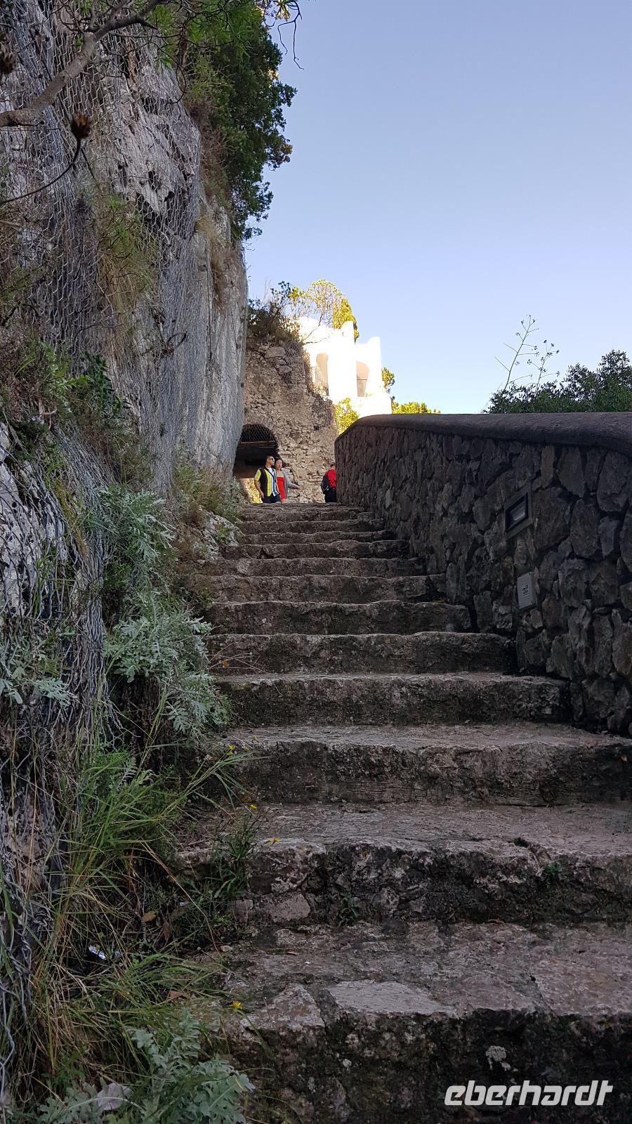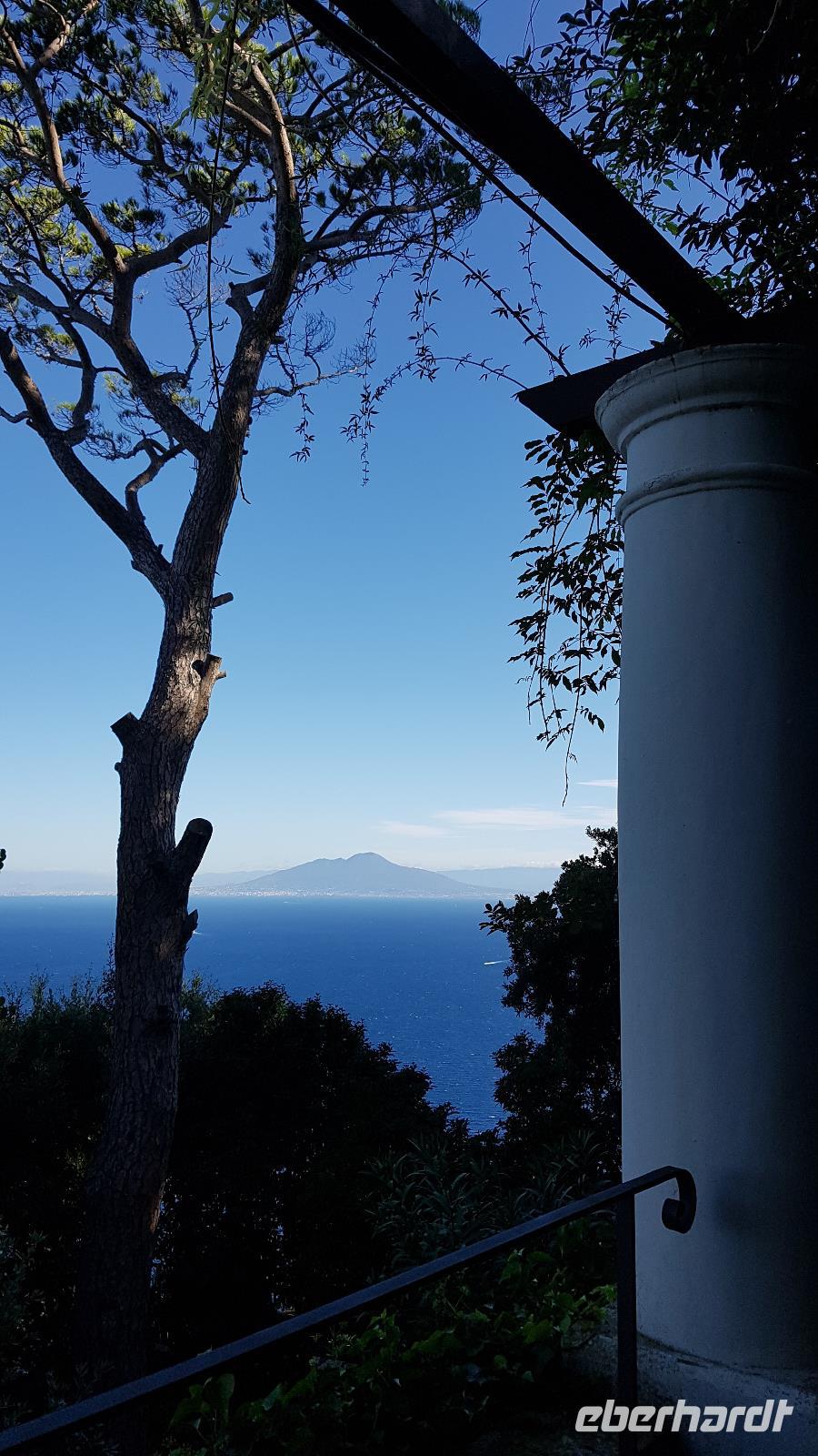 Als Kaiser Augustus auf dem Rückweg von einer siegreichen Schlacht in Capri Halt machte, beschloss er, auf dieser Insel eine Sommervilla zu errichten. Kaiser Tiberius hatte auf Capri 12 Villen und regierte seine letzten 11 Jahre das römische Reich von der Villa Jovis aus. Die Villa liegt auf einer Felsenklippe, von der man den Golf von Neapel hervorragend überwachen konnte. Die einst 8 Stockwerke hohe Villa beherbergt im Inneren eine riesige Zisterne mit 4 Kammern, die heute noch gut zu erkennen sind. Über die Jahre wurde die Villa geplündert und die Steine als Baumaterial der Capreser benutzt. So ist heute von der einstigen wertvollen Ausschmückung leider nichts mehr zu sehen. Die Aussichtsterrasse ganz oben bei der Kirche bot uns aber herrliche Ausblicke hinüber zum Vesuv, zur sorrentinischen Halbinsel und bis in den Golf von Salerno. Nach dem Besuch der Villa entschlossen wir uns, auf dem Wanderwege hinunter zur Villa Lysis zu gehen. Der Weg verlief zunächst an den unteren Mauerresten der Villa Jovis entlang und ging dann steil bergab mit einem grandiosen Ausblick auf den Golf von Neapel. In der Ferne hörten wir das Grollen eines Gewitters und gingen so recht zügig hinunter.