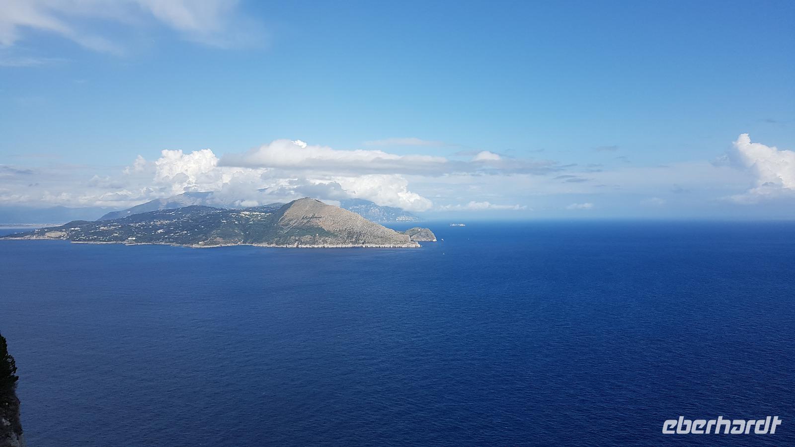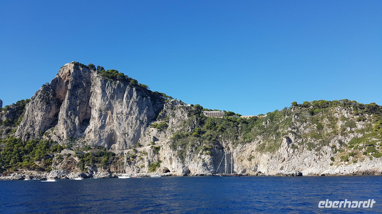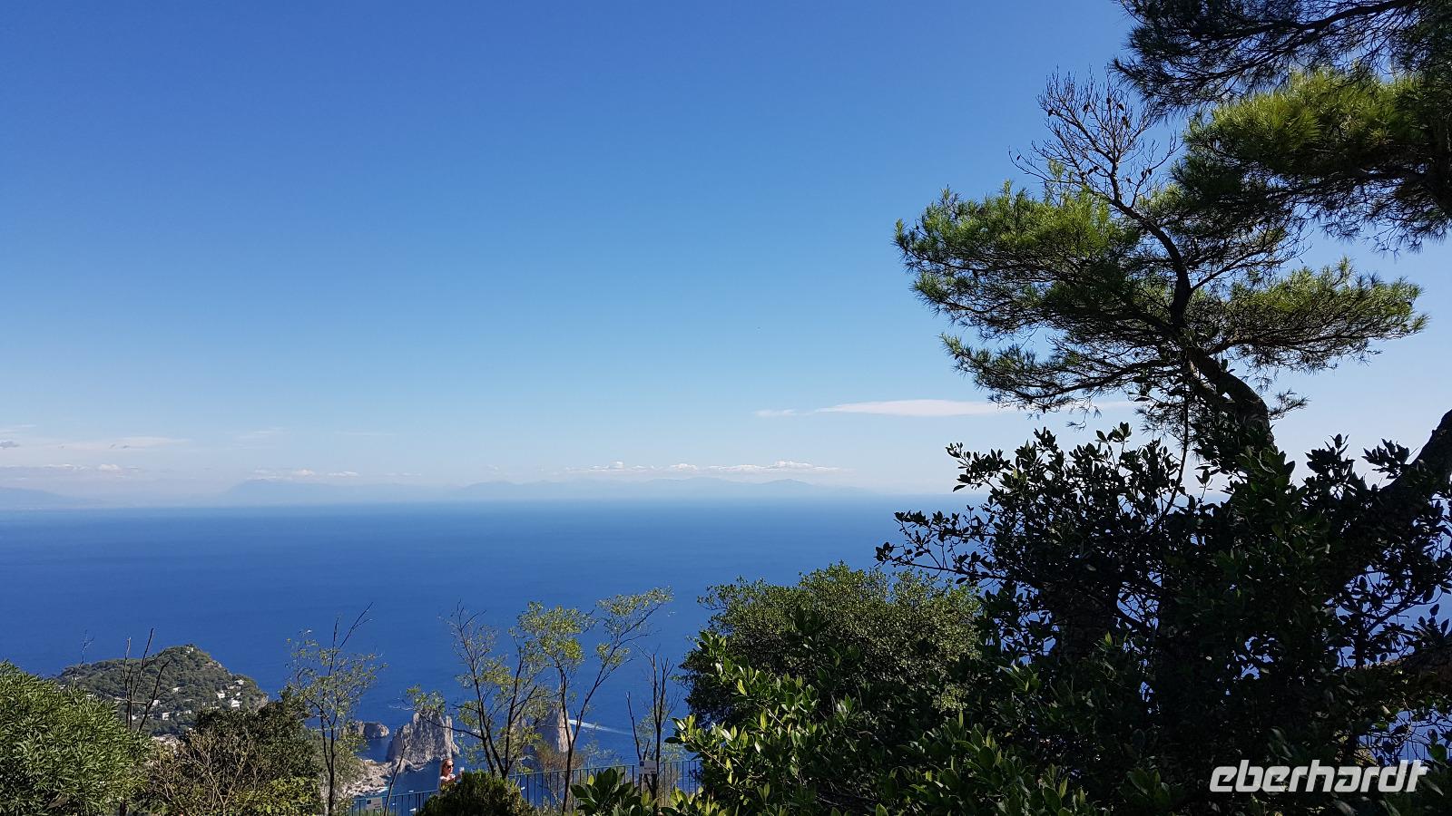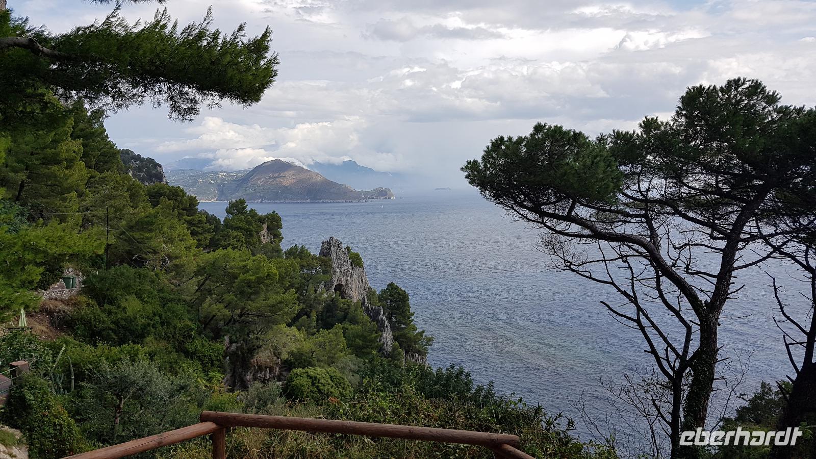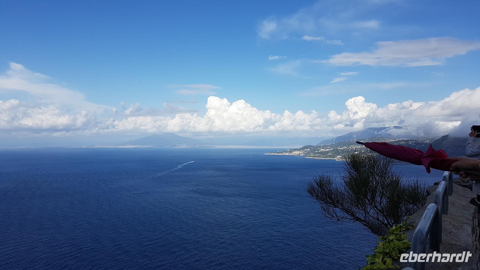 Als Kaiser Augustus auf dem Rückweg von einer siegreichen Schlacht in Capri Halt machte, beschloss er, auf dieser Insel eine Sommervilla zu errichten. Kaiser Tiberius hatte auf Capri 12 Villen und regierte seine letzten 11 Jahre das römische Reich von der Villa Jovis aus. Die Villa liegt auf einer Felsenklippe, von der man den Golf von Neapel hervorragend überwachen konnte. Die einst 8 Stockwerke hohe Villa beherbergt im Inneren eine riesige Zisterne mit 4 Kammern, die heute noch gut zu erkennen sind. Über die Jahre wurde die Villa geplündert und die Steine als Baumaterial der Capreser benutzt. So ist heute von der einstigen wertvollen Ausschmückung leider nichts mehr zu sehen. Die Aussichtsterrasse ganz oben bei der Kirche bot uns aber herrliche Ausblicke hinüber zum Vesuv, zur sorrentinischen Halbinsel und bis in den Golf von Salerno. Nach dem Besuch der Villa entschlossen wir uns, auf dem Wanderwege hinunter zur Villa Lysis zu gehen. Der Weg verlief zunächst an den unteren Mauerresten der Villa Jovis entlang und ging dann steil bergab mit einem grandiosen Ausblick auf den Golf von Neapel. In der Ferne hörten wir das Grollen eines Gewitters und gingen so recht zügig hinunter.