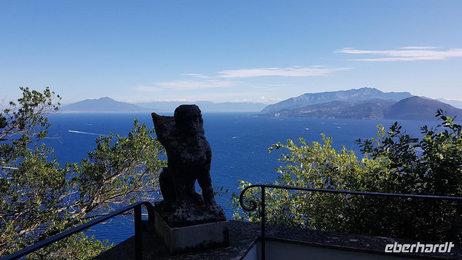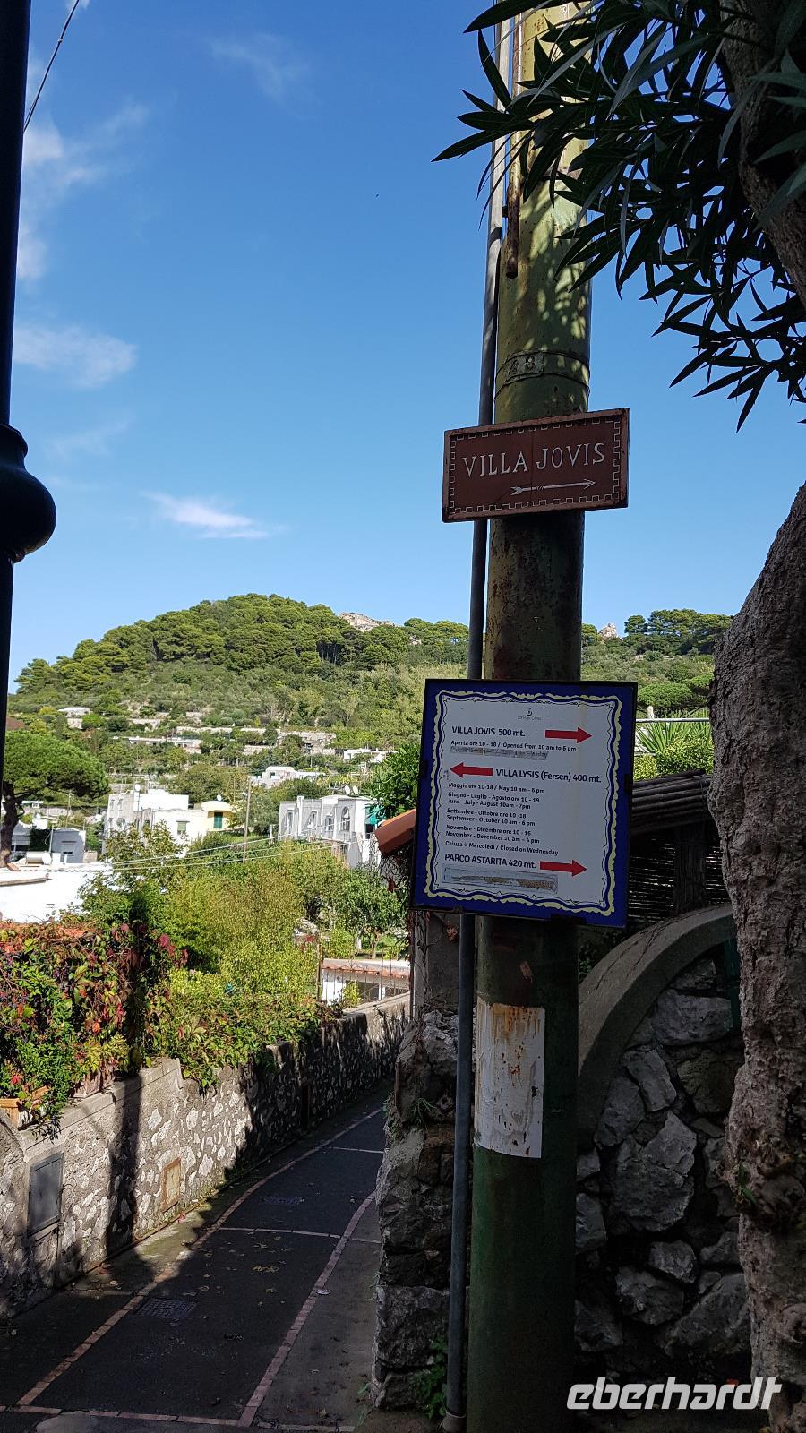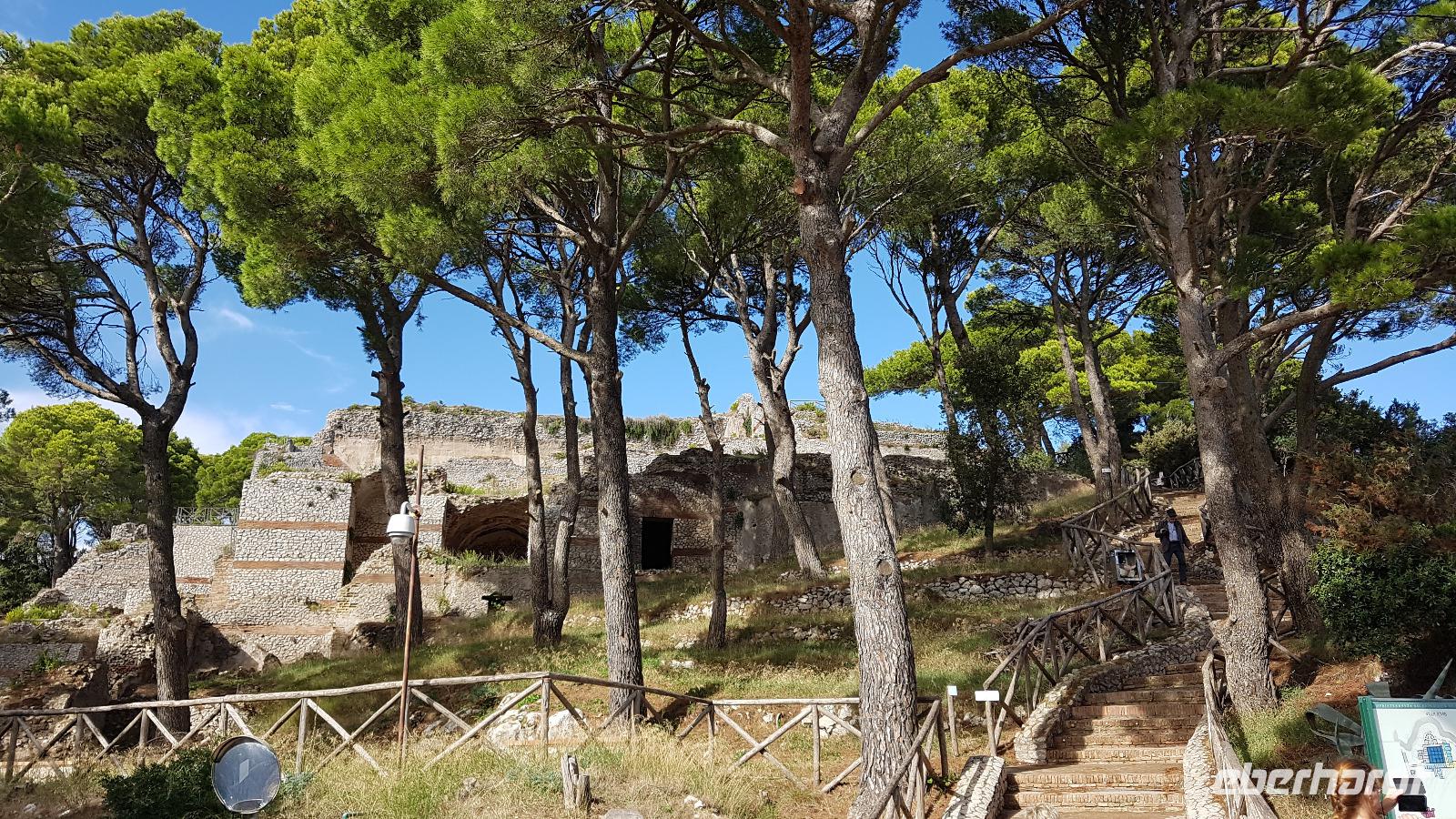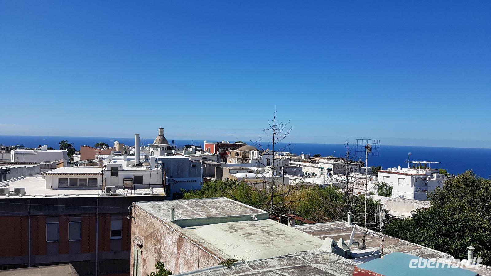 Als Kaiser Augustus auf dem Rückweg von einer siegreichen Schlacht in Capri Halt machte, beschloss er, auf dieser Insel eine Sommervilla zu errichten. Kaiser Tiberius hatte auf Capri 12 Villen und regierte seine letzten 11 Jahre das römische Reich von der Villa Jovis aus. Die Villa liegt auf einer Felsenklippe, von der man den Golf von Neapel hervorragend überwachen konnte. Die einst 8 Stockwerke hohe Villa beherbergt im Inneren eine riesige Zisterne mit 4 Kammern, die heute noch gut zu erkennen sind. Über die Jahre wurde die Villa geplündert und die Steine als Baumaterial der Capreser benutzt. So ist heute von der einstigen wertvollen Ausschmückung leider nichts mehr zu sehen. Die Aussichtsterrasse ganz oben bei der Kirche bot uns aber herrliche Ausblicke hinüber zum Vesuv, zur sorrentinischen Halbinsel und bis in den Golf von Salerno. Nach dem Besuch der Villa entschlossen wir uns, auf dem Wanderwege hinunter zur Villa Lysis zu gehen. Der Weg verlief zunächst an den unteren Mauerresten der Villa Jovis entlang und ging dann steil bergab mit einem grandiosen Ausblick auf den Golf von Neapel. In der Ferne hörten wir das Grollen eines Gewitters und gingen so recht zügig hinunter.