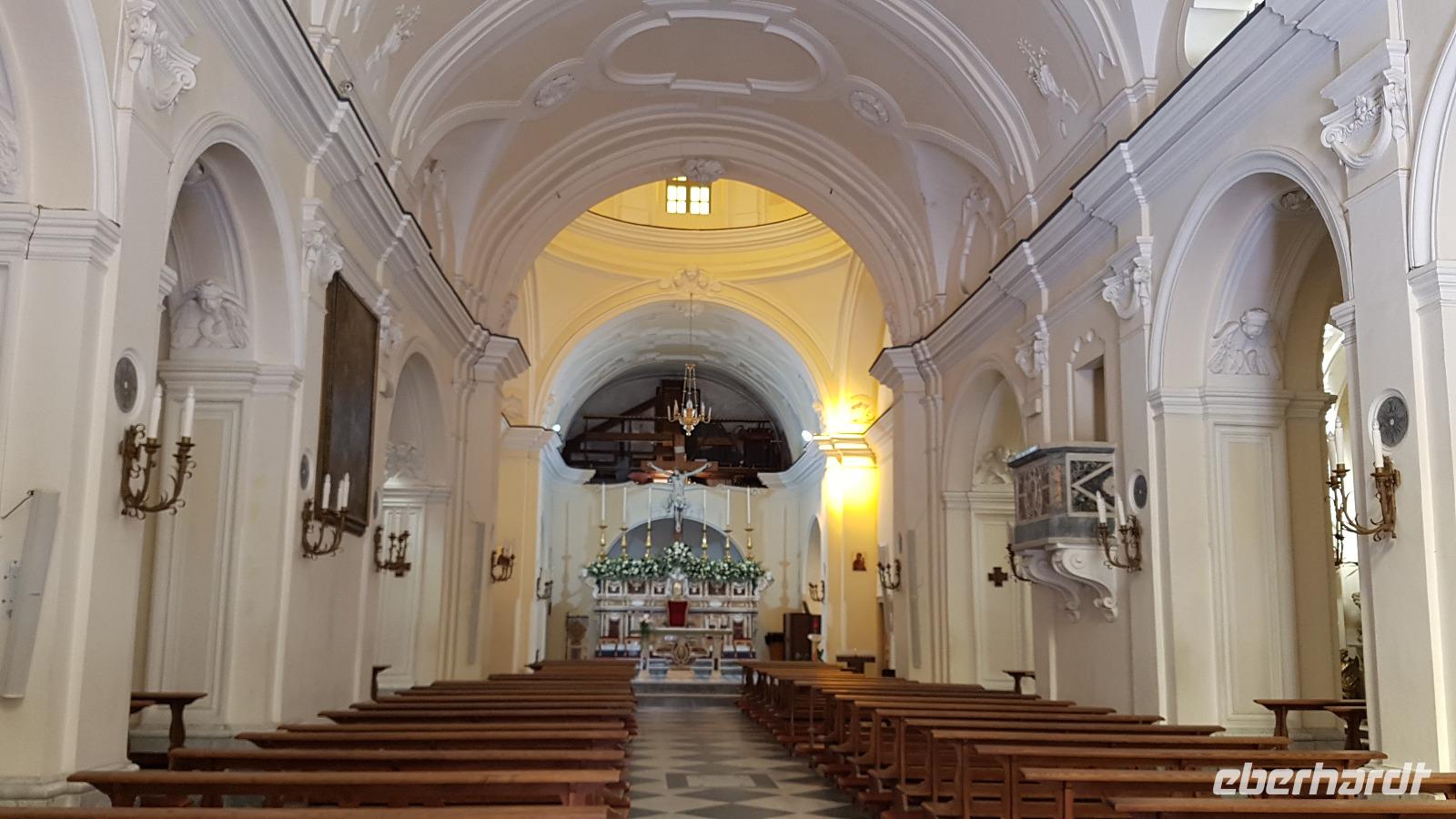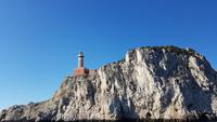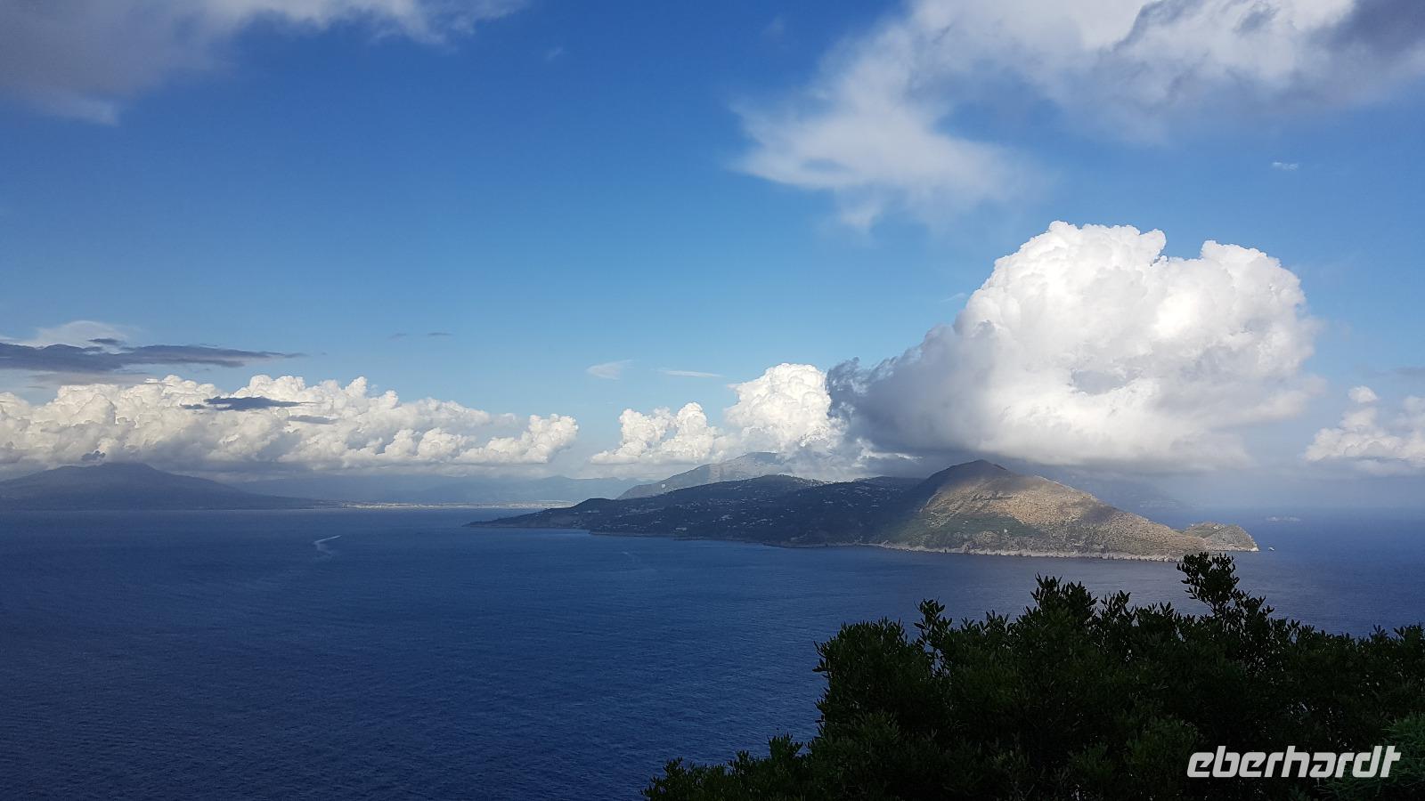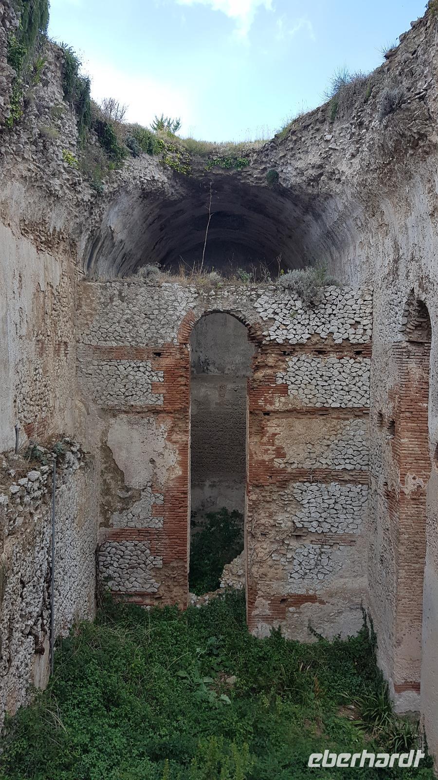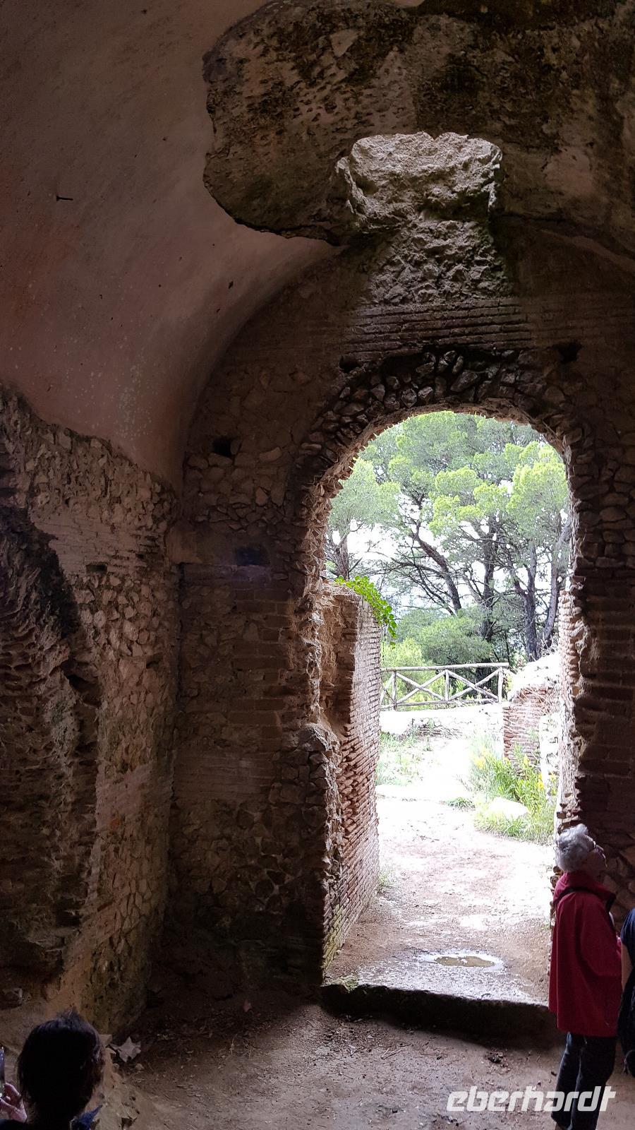 Als Kaiser Augustus auf dem Rückweg von einer siegreichen Schlacht in Capri Halt machte, beschloss er, auf dieser Insel eine Sommervilla zu errichten. Kaiser Tiberius hatte auf Capri 12 Villen und regierte seine letzten 11 Jahre das römische Reich von der Villa Jovis aus. Die Villa liegt auf einer Felsenklippe, von der man den Golf von Neapel hervorragend überwachen konnte. Die einst 8 Stockwerke hohe Villa beherbergt im Inneren eine riesige Zisterne mit 4 Kammern, die heute noch gut zu erkennen sind. Über die Jahre wurde die Villa geplündert und die Steine als Baumaterial der Capreser benutzt. So ist heute von der einstigen wertvollen Ausschmückung leider nichts mehr zu sehen. Die Aussichtsterrasse ganz oben bei der Kirche bot uns aber herrliche Ausblicke hinüber zum Vesuv, zur sorrentinischen Halbinsel und bis in den Golf von Salerno. Nach dem Besuch der Villa entschlossen wir uns, auf dem Wanderwege hinunter zur Villa Lysis zu gehen. Der Weg verlief zunächst an den unteren Mauerresten der Villa Jovis entlang und ging dann steil bergab mit einem grandiosen Ausblick auf den Golf von Neapel. In der Ferne hörten wir das Grollen eines Gewitters und gingen so recht zügig hinunter.