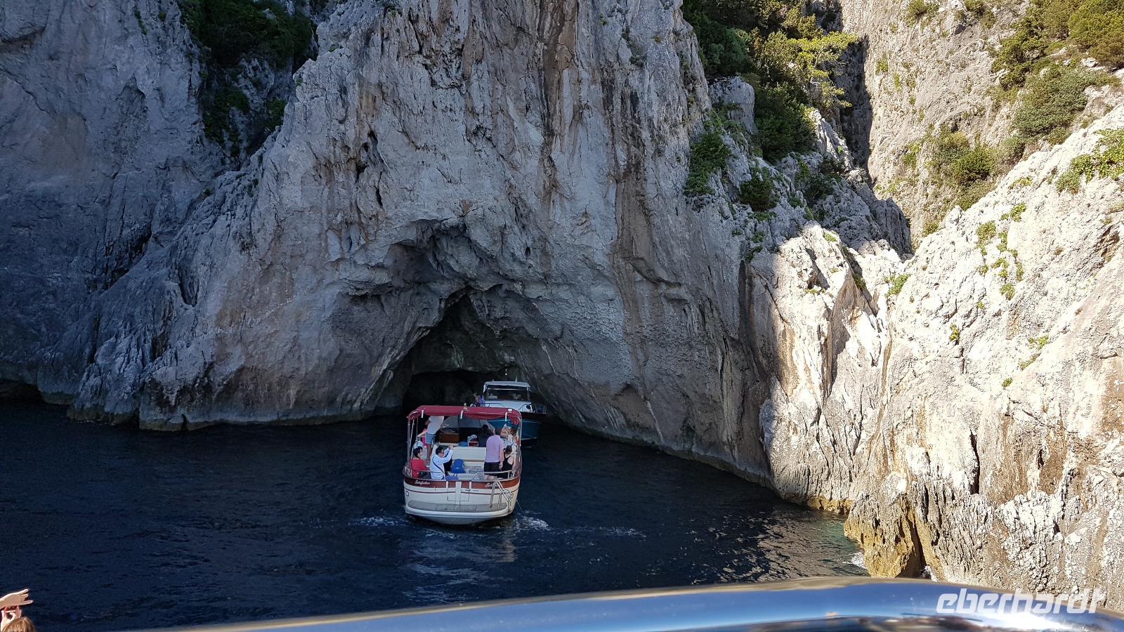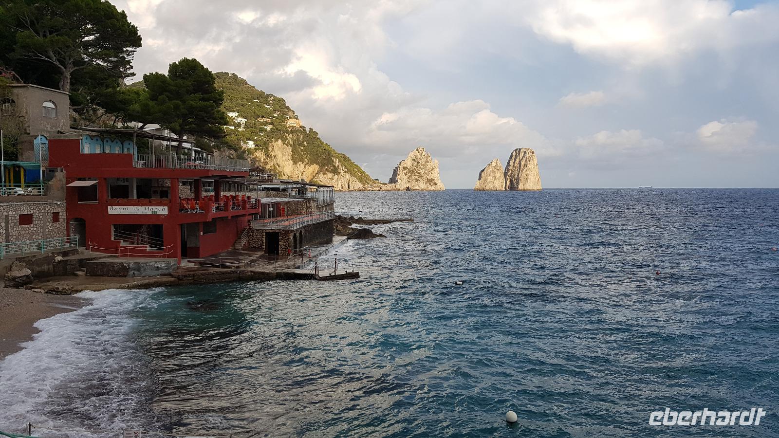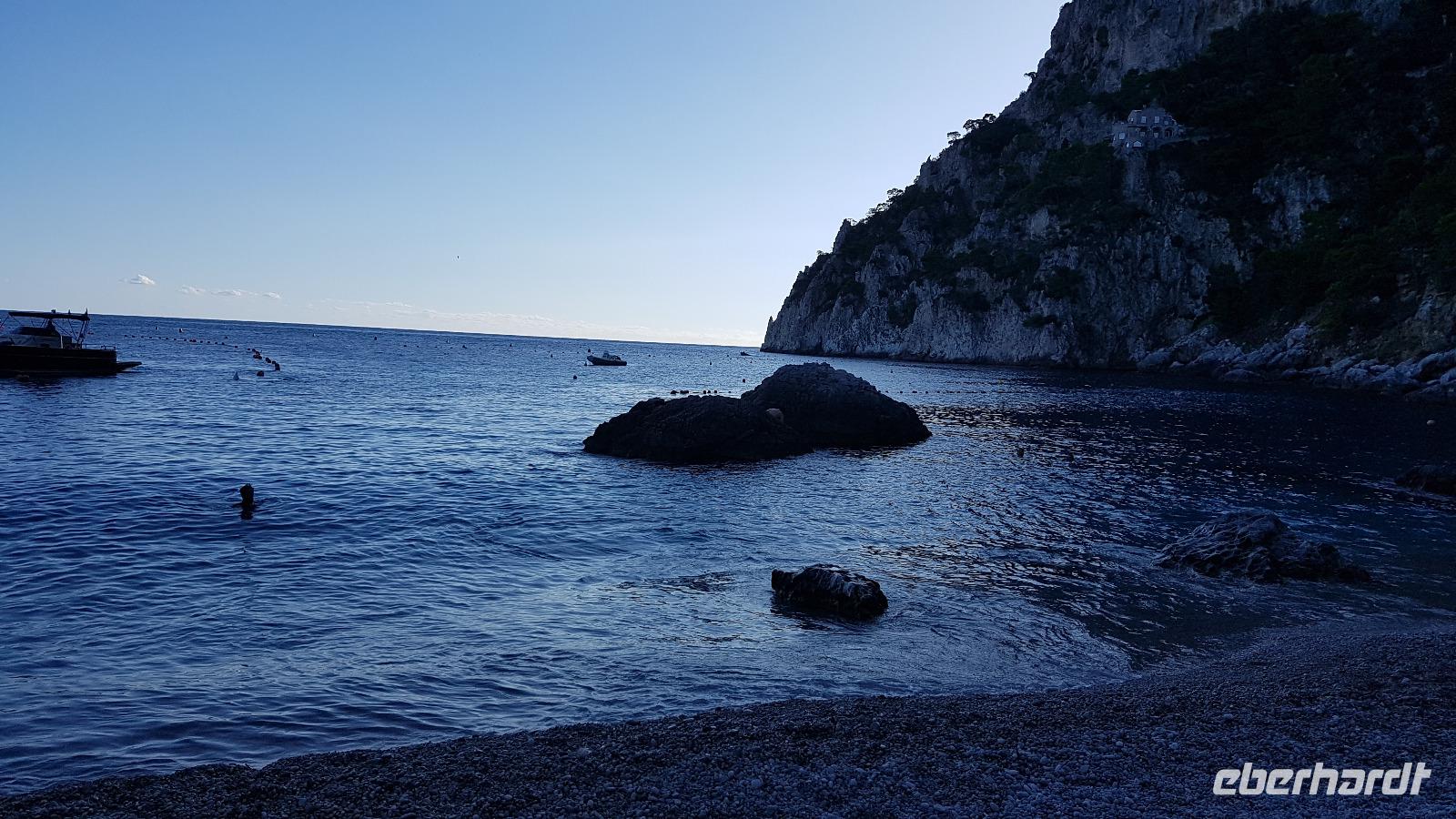 Mit einem Privatboot umrundeten wir dann die Insel Capri und sahen vom Wasser alles das, was wir an Land schon kennengelernt hatten. ZURÜCK vom Hafen Marina Grande nahmen wir die Funicolare hinauf zur Piazetta und die freie Zeit bis zum Abendessen gestaltete jeder ganz nach seinen Vorstellungen. Zum Beispiel reichte die Zeit für ein Bad im Meer bei der Marina Piccola und das Wasser war noch ganz angenehm warm. Das Abendessen nahm ein Teil unserer Gruppe im Ristorante al Capri ein.