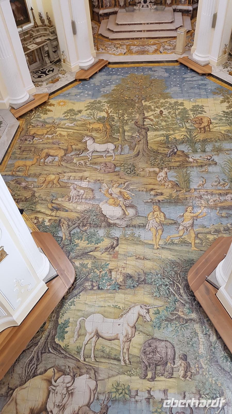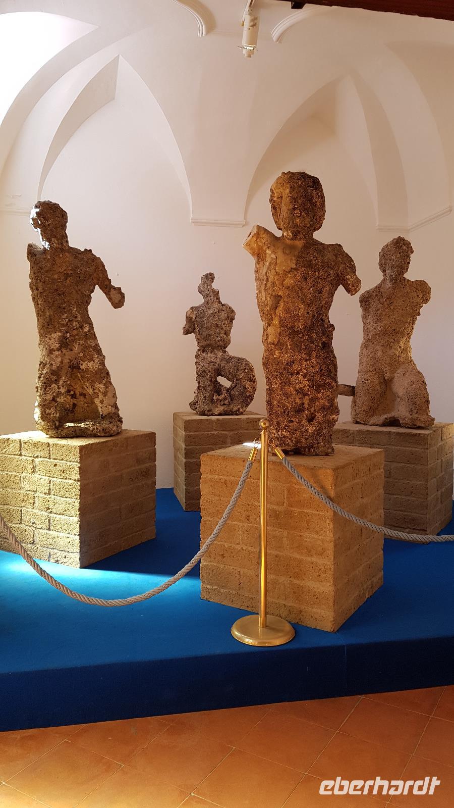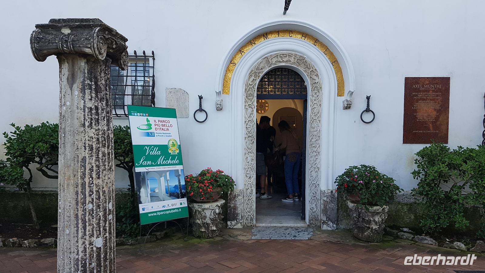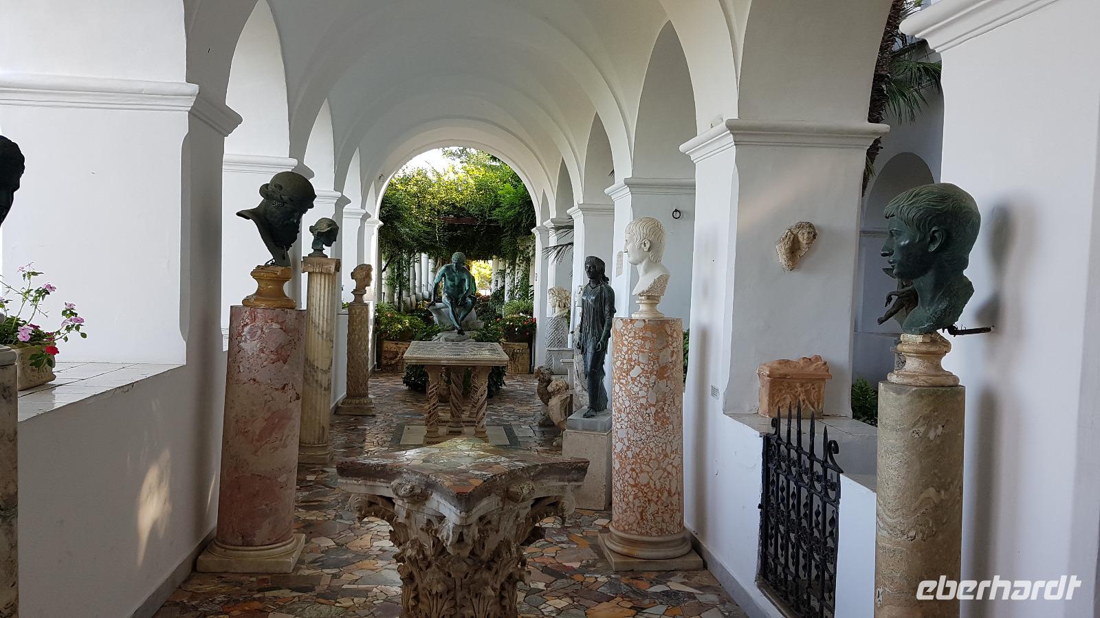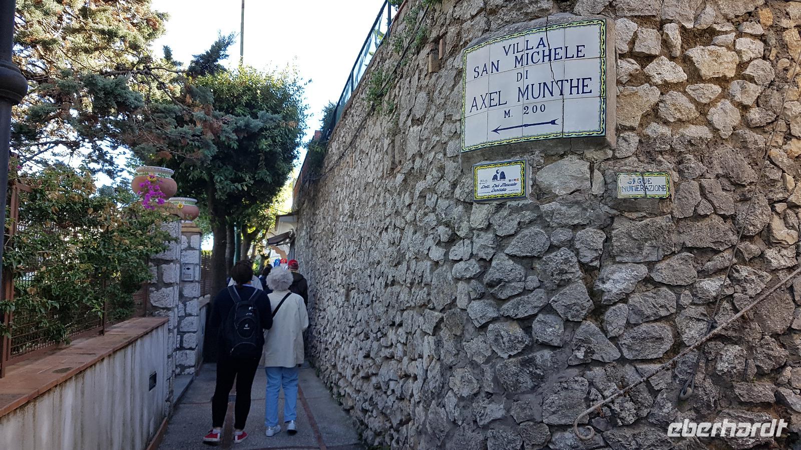 Für heute war Traumwetter angesagt und so brachen wir gleich nach dem Frühstück auf zu Fuss zum kleinen Busbahnhof. Mit dem Inselbus fuhren wir ca. 15 min. nach Anacapri und spazierten direkt zur Villa San Michele. Noch waren wir fast allein in der Villa und konnten so in aller Ruhe die Räume und den Garten besichtigen. Ende des 19. Jahrhunderts erfüllte sich der schwedische Arzt und Schriftsteller einen Herzenswunsch, kaufte ein Grundstück mit einer kleinen Kapelle in Anacapri und begann dort mit dem Bau der Villa. Mit viel Licht, offenen Übergängen von Räumen in die Gärten und mit vielen antiken Gegenständen besticht die Villa noch heute. Sie gehört dem schwedischen Staat, hat nebenan so auch ein schwedisches Konsulat und zählt täglich viele Besucher aus der ganzen Welt. Wir alle waren mächtig beeindruckt von dem Bau und konnten uns nur schwer wieder trennen. Aber es nahten viele grosse Touristengruppen und so begaben wir uns zunächst zu einer Limoncello- und Schokoladenprobe und dann ins Zentrum von Anacapri. Dort besuchten wir die Kirche der Hl. Sofia, die Kirche San Michele mit ihrem tollen Fussbodenmosaik und das rote Haus. Dieses im Pompej Rot gehaltene Haus wurde vom amerikanischen Oberst McKowen Ende des 19. Jahrhunderts gebaut und beherbergt heute eine Gemäldesammlung mit Ansichten von Capri aus dem 19. und 20. Jahrhunderts sowie 4 römischen Statuen aus der blauen Grotte.