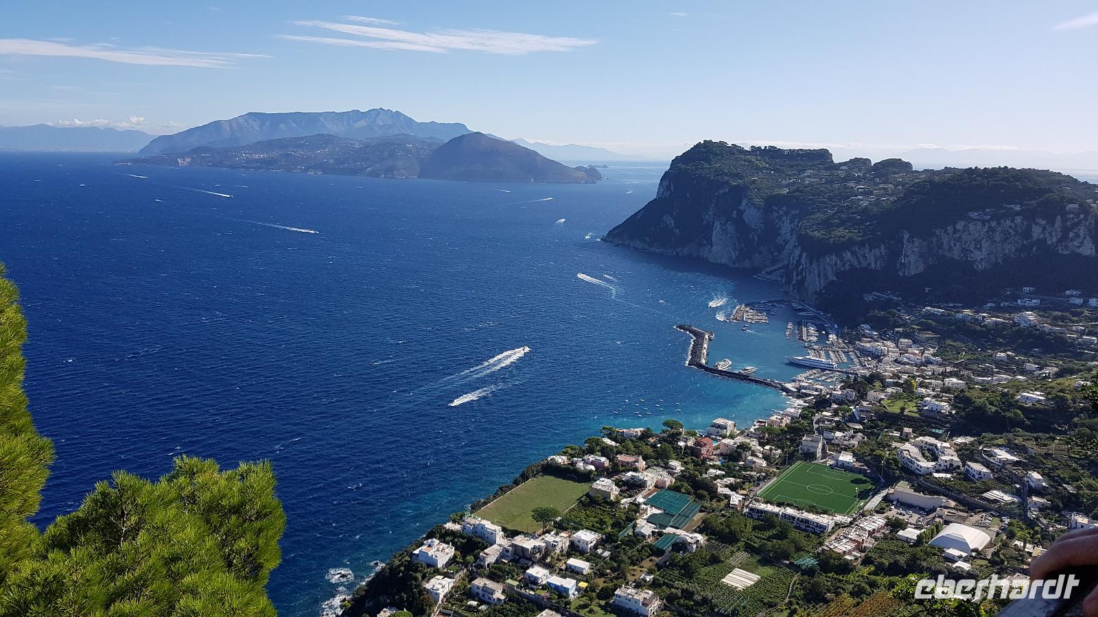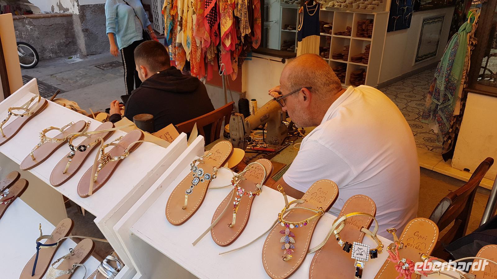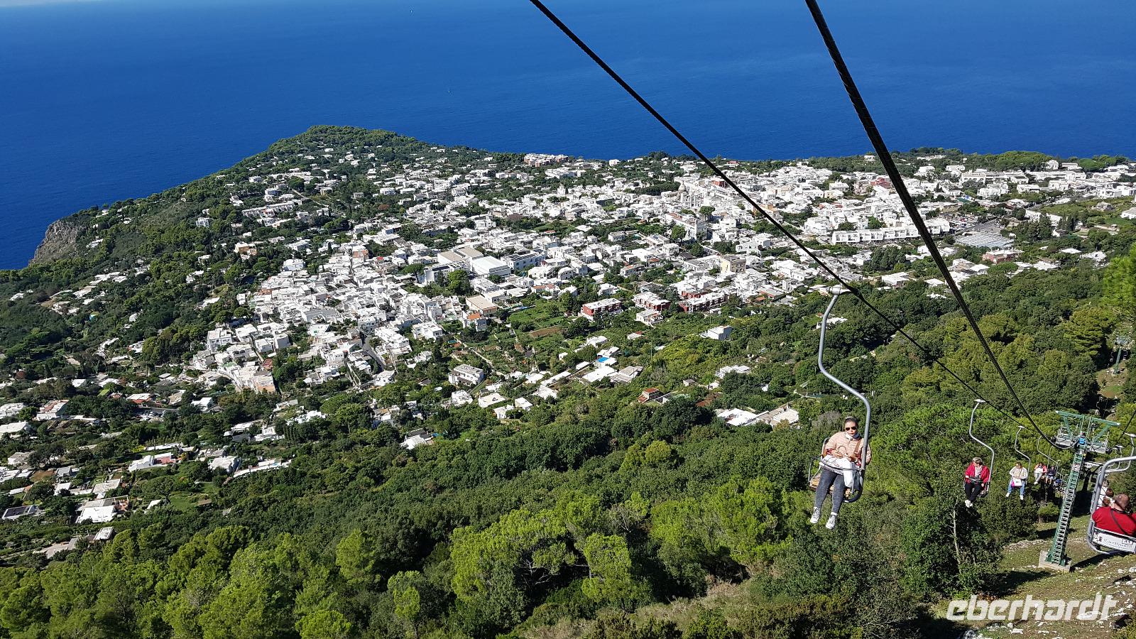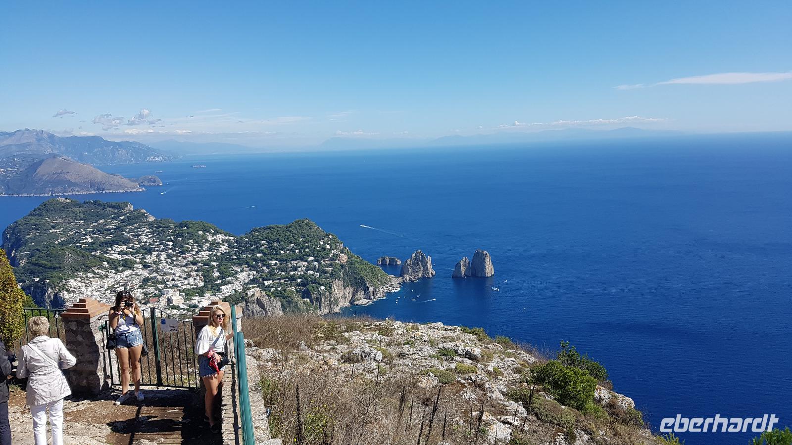Anacapri bietet alles, was das Touristenherz begeehrt und man konnte sich eine echte Capri Sandale anfertigen lassen. Derweil besorgten Annamaria und ich die Zutaten für ein Picknick und wir organisierten eine "Bevorzugte Auffahrt" auf den Monte Solaro. So waren wir trotz langer Schlange ruckzuck oben und begaben uns sogleich zu "Unserem" Picknickplatz mit toller Aussicht. Bei einem guten Weisswein liess sich jeder sein Sandwich schmecken und anschliessend umrundeten wir das Aussichtsplateau und konnten bis hin zu den Bergen des Cilento am Ende des Golfes von Salerno schauen. Eine traumhafte Aussicht an einem wunderschönen Tag. Mit dem Sessellift fuhren wir wieder hinunter und da standen dann schon 2 Caprio Taxen bereit, die uns hinunter zur Marina Grande brachten.