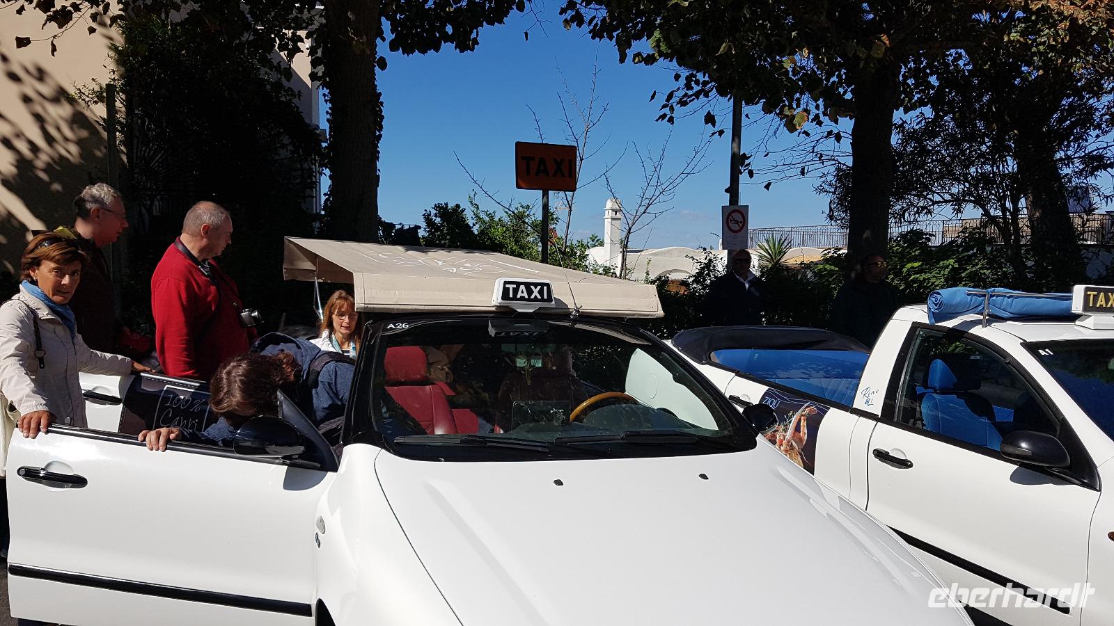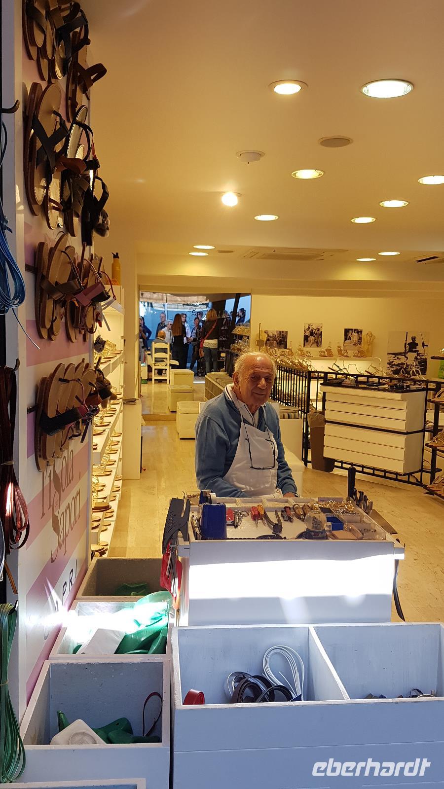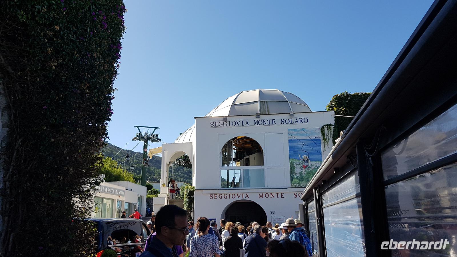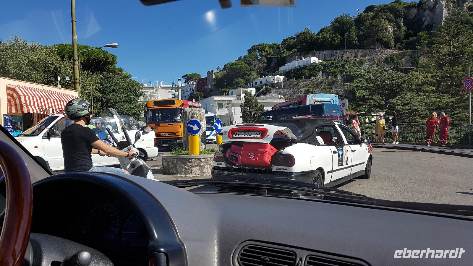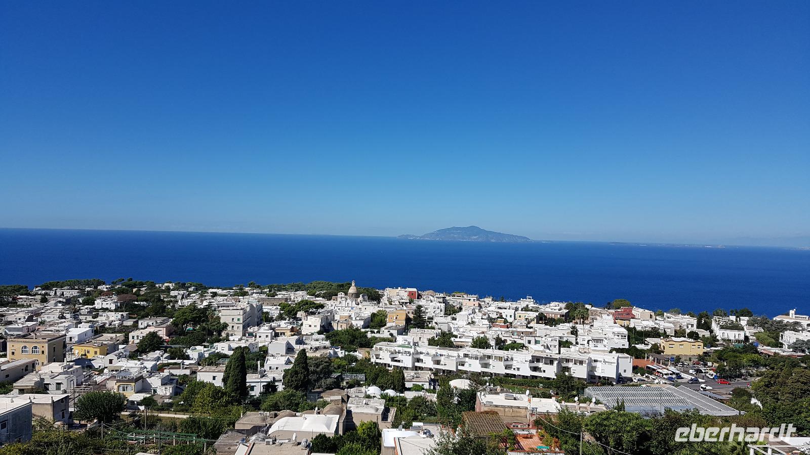 Anacapri bietet alles, was das Touristenherz begeehrt und man konnte sich eine echte Capri Sandale anfertigen lassen. Derweil besorgten Annamaria und ich die Zutaten für ein Picknick und wir organisierten eine "Bevorzugte Auffahrt" auf den Monte Solaro. So waren wir trotz langer Schlange ruckzuck oben und begaben uns sogleich zu "Unserem" Picknickplatz mit toller Aussicht. Bei einem guten Weisswein liess sich jeder sein Sandwich schmecken und anschliessend umrundeten wir das Aussichtsplateau und konnten bis hin zu den Bergen des Cilento am Ende des Golfes von Salerno schauen. Eine traumhafte Aussicht an einem wunderschönen Tag. Mit dem Sessellift fuhren wir wieder hinunter und da standen dann schon 2 Caprio Taxen bereit, die uns hinunter zur Marina Grande brachten.