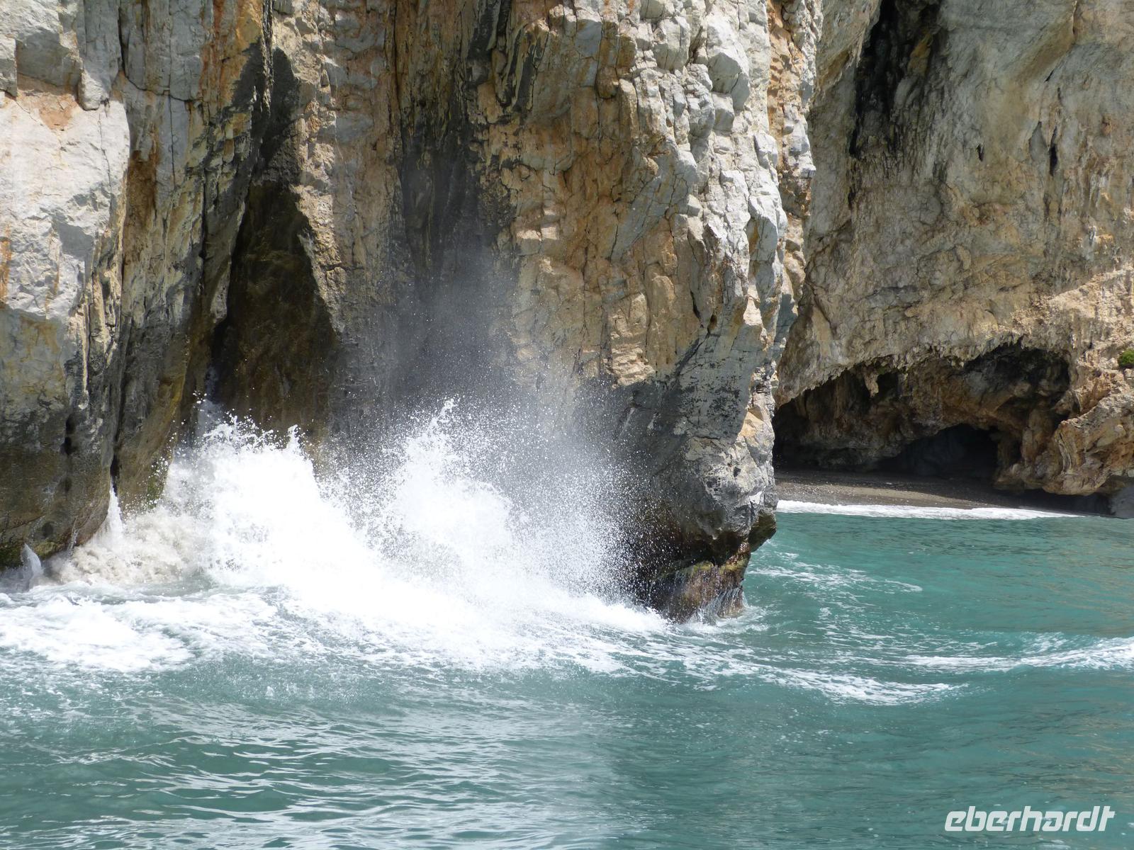 Bei Sonnenschein starteten wir schon 8.30 Uhr Richtung Palinuro. Leider kamen wir nur bis auf die Schnellstraße und dort streikte der Bus. Nach mehreren Reperaturversuchen kam schließlich ein neuer Bus und wir fuhren nach Palinuro zu den Booten. Gemütlich tuckerten wir um das Kap Palinuro, bewunderten die steilen Felsen und Durchbrüche. Schließlich ging es dann mit den Booten hinein in die Blutgrotte, Schwefelgrotte, Mönchsgrotte, Knochengrotte und als Höhepunkt in die blaue Grotte. Das Licht scheint durch einen 20 Meter langen Kanal ins Innere und läßt das Wasser tiefblau schimmern. In Palinuro speiste wir im Fischrestaurant vorzüglich bevor zurück ging nach Velia. Mit Ursula spazierten wir fast 3 Stunden durch die antike Stadt und überzeugten uns von der Baukunst.