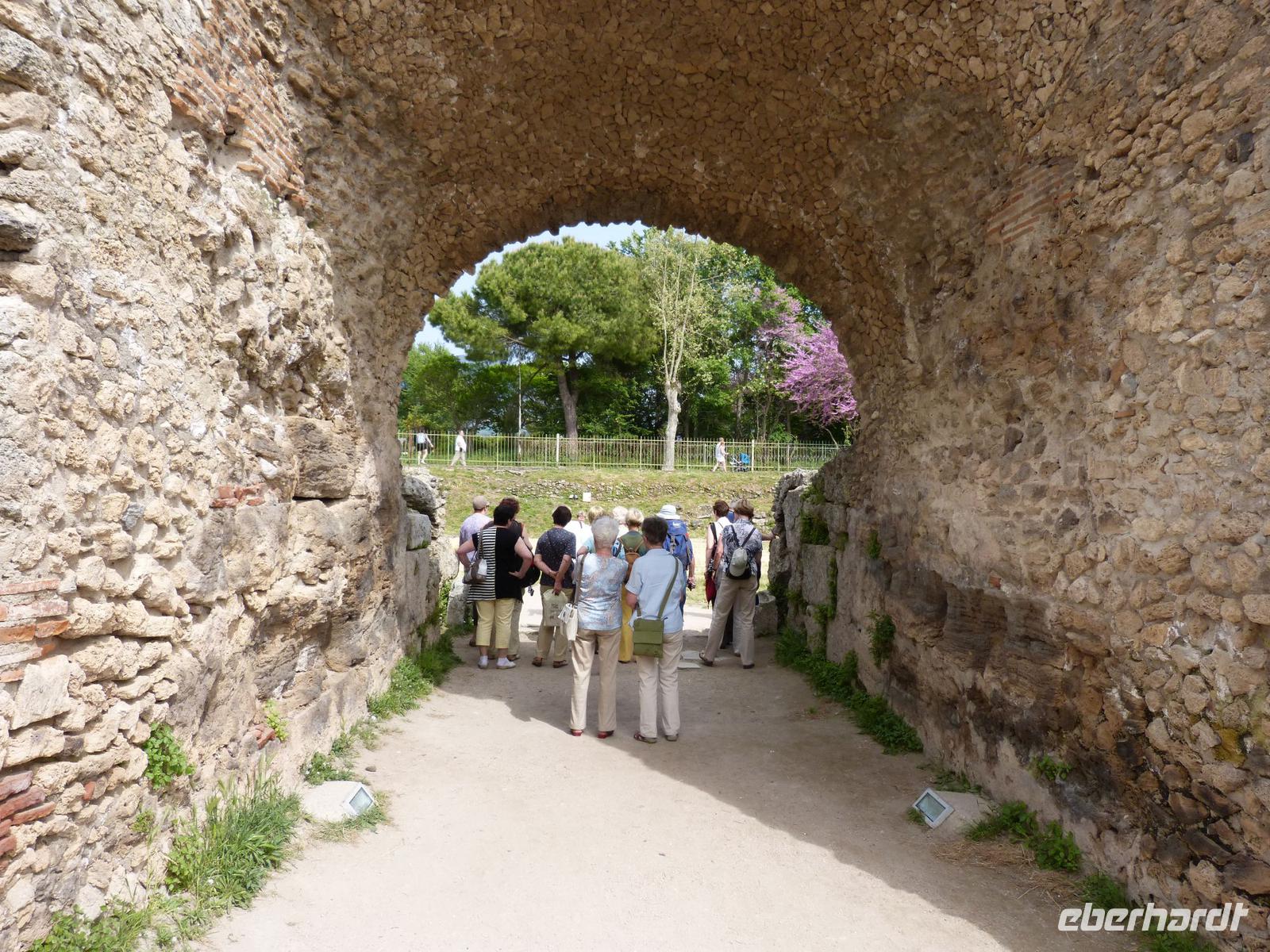 Die Sonne begleitete uns auf der Fahrt vorbei am Alento-Stausee nach Paestum. Zunächst besuchen wir die Büffelfarm, bewundern die stattlichen Tiere und konnten durchs Fenster beim Mozarella-Machen zusehen. Die Produkte der Büffelmilch sind sehr vielfältig und so probiert jeder, worauf er/sie Appetit hatte. Ein kleiner Abstechen führte uns dann ans Meer und zum Einkaufen. Mit dem Bus fuhren wir weiter zu den Ausgrabungen und hatten Zeit für eine Mittagspause. Mit Ursula umrundeten einige Gäste die alte Stadtmauer und erfuhren vieles über die Geschichte und die Umgebung. 14 Uhr begann dann die Führung im Museum mit Prof. Daniele. Leider ist der Prof. sehr krank und so wurde die Führung im Aussengelände von Ursula weitergeführt.