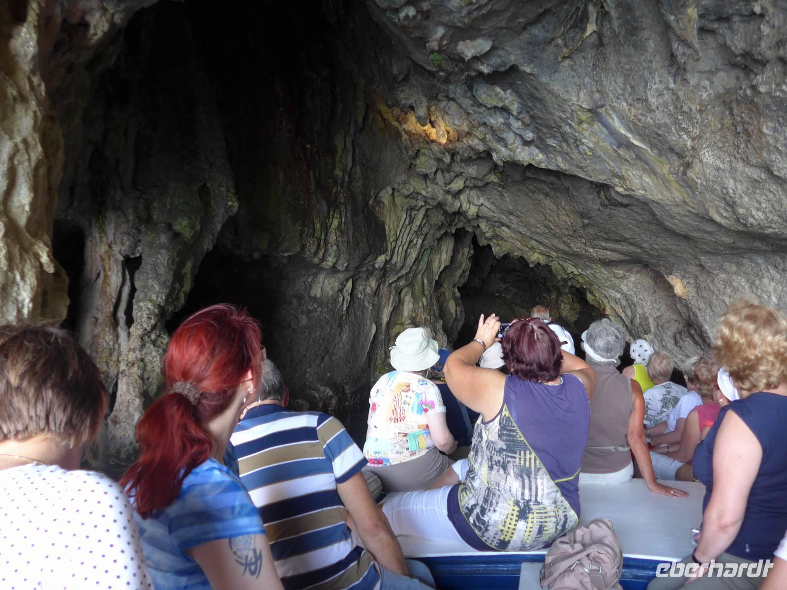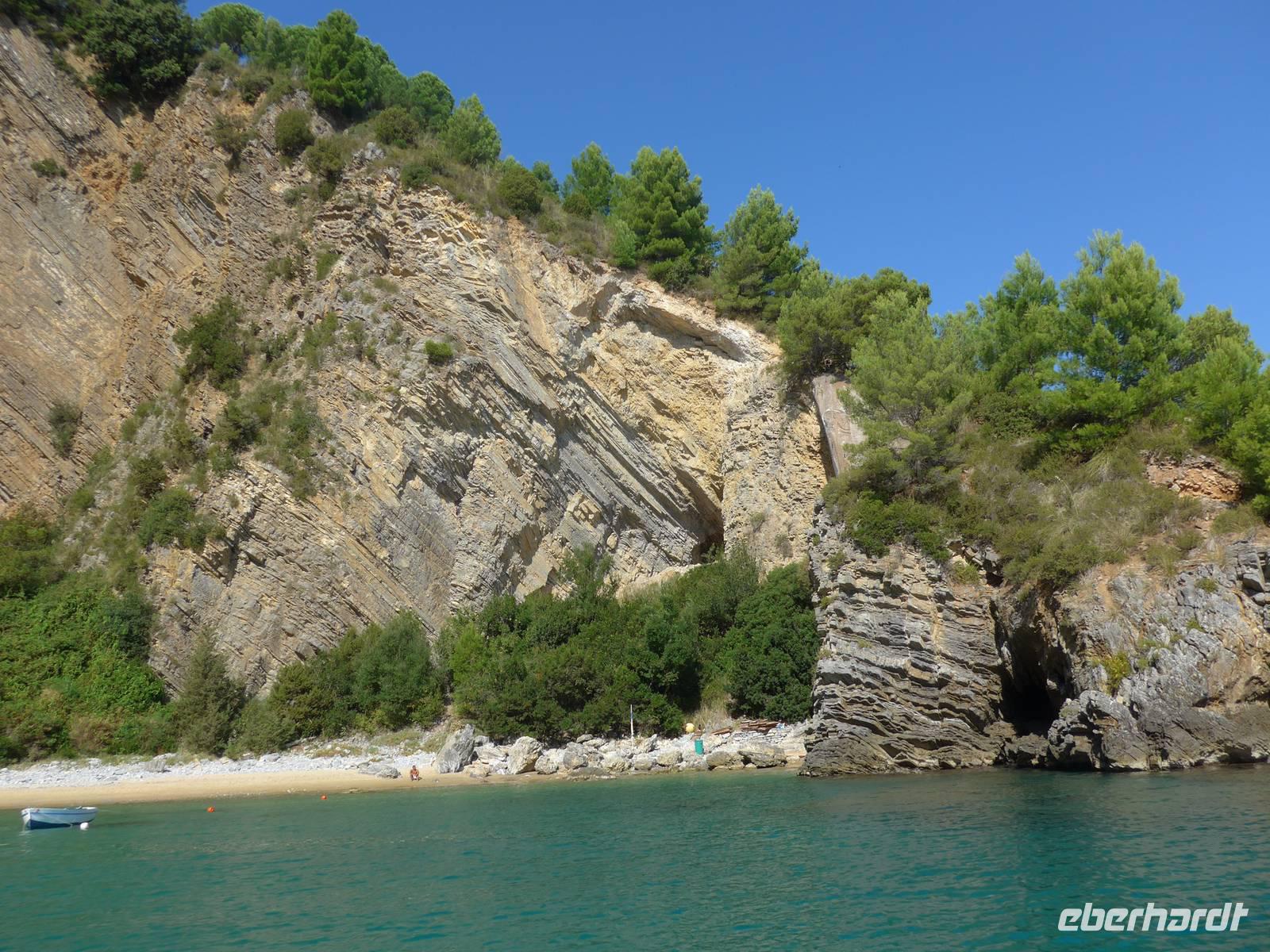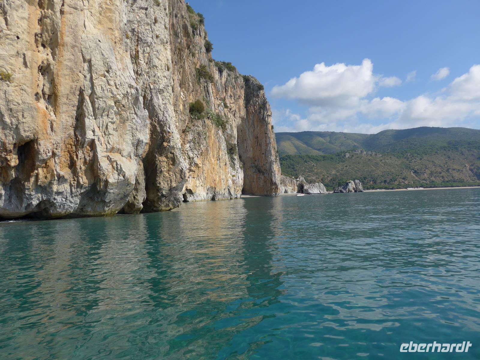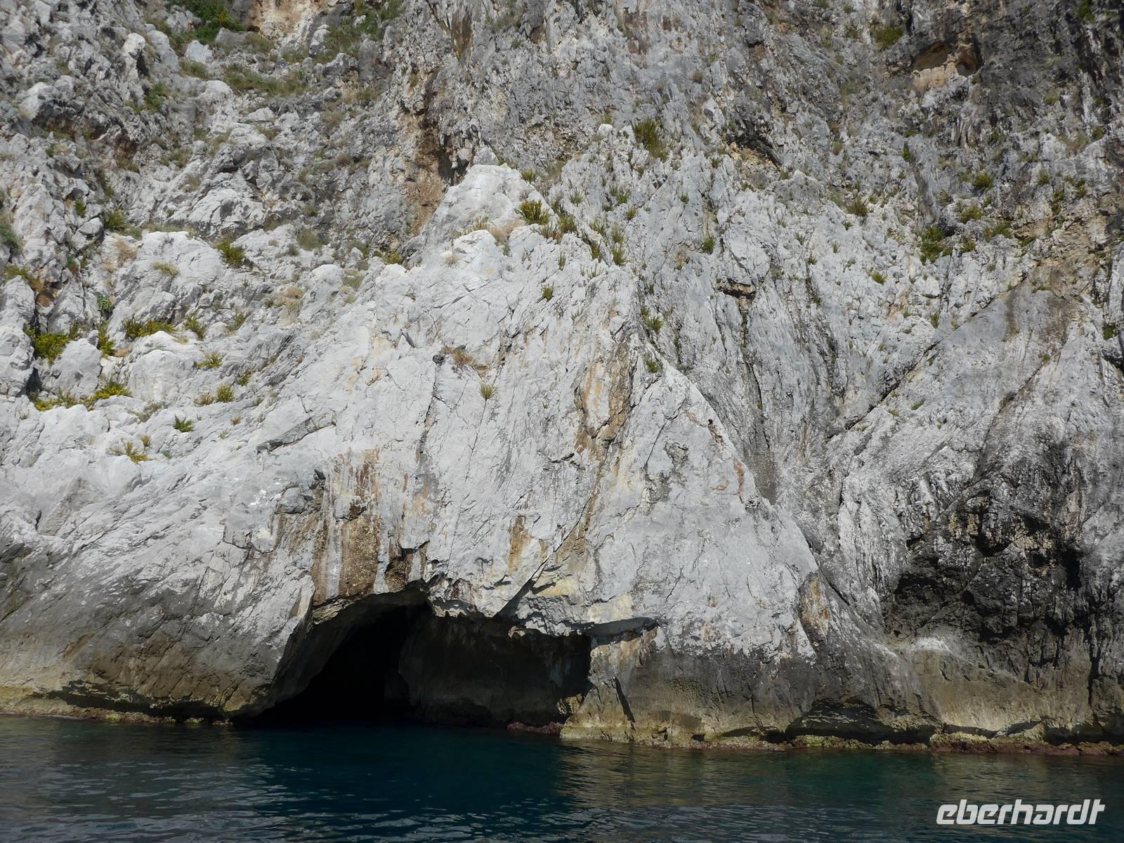 Es war tolles Wetter angesagt und so entschieden wir, gleich unseren Ausflug nach Palinuro zu machen. Auf der Fahrt dorthin hielten wir am Supermarkt, um Wasser zu kaufen. Dann nutzten wir die Schnellstraße bis San Severino und erkundeten dort, den Aufstieg in das alte nicht mehr bewohnte Dorf. Leider war die Treppe noch immer gesperrt und man konnte vermuten, daß sie gar nicht mehr hergerichtet werden soll. So fuhren wir durch die Mingardo-Schlucht, auch Teufelsschlund genannt, nach Palinuro. Ursula nahm unsere Menuewünsche für das Abendessen auf, denn Umberto kauft jeden Tag frisch ein und benutzt auch nur Frisches zum Kochen. Wir spazierten hinunter zum Strand und bestiegen ein Boot. Bei spiegelglatter See ging es nun hinaus aufs Meer, um das Kap von Palinuro. Es war traumhaft, warm und die Sonne kitzelte uns. Entlang der Steilküste gibt es viele Höhlen und wir fuhren zunächst in die Blutsgrotte, dann in die Silbergrotte - ganz was seltenes und wir konnten nicht glauben, daß unser Boot dort überhaupt hinein paßte. Weiter ging es in die Mönchsgrotte, Schwefelgrotte und bis zur Bucht des guten Schlafes. Zwischen Kaninchenfelsen und einer wunderschönen Badebucht hindurch gelangten wir zur Knochengrotte und zum Arco Naturale. Auf der Rückfahrt wartete der Höhepunkt der Bootsfahrt - die blaue Grotte. Sie war unbeschreiblich schön mit dem intensiv blauen Wasser. Gut und sicher brachte uns das Boot zum Strand zurück, wo wir unser vom Hotel vorbereitetes Picknick einnahmen. Das Programm des Tages war erfüllt, wir aber bei dem schönen Wetter noch voller Tatendrang.