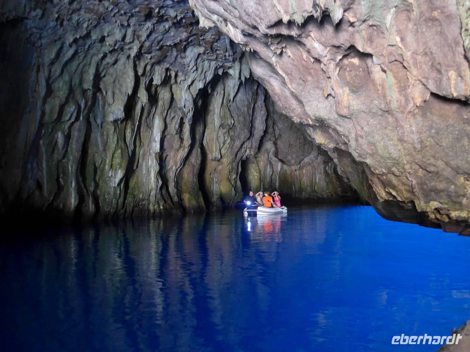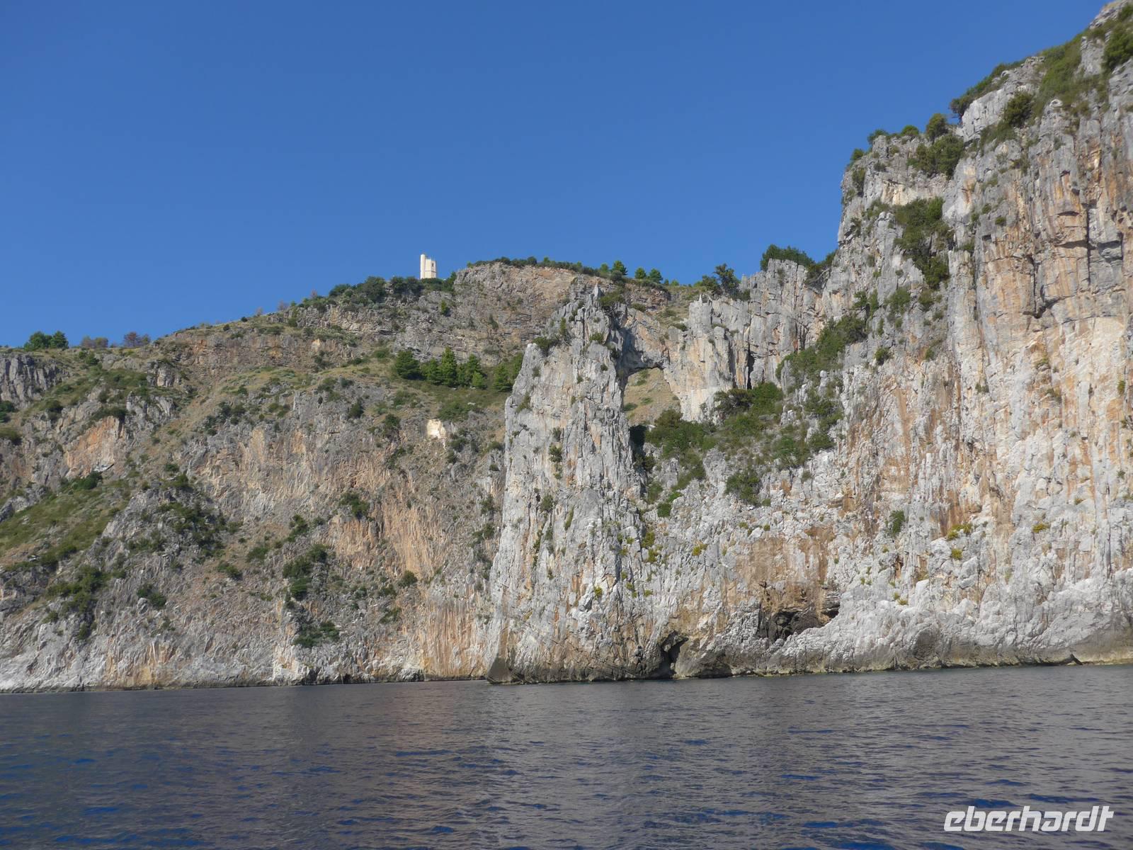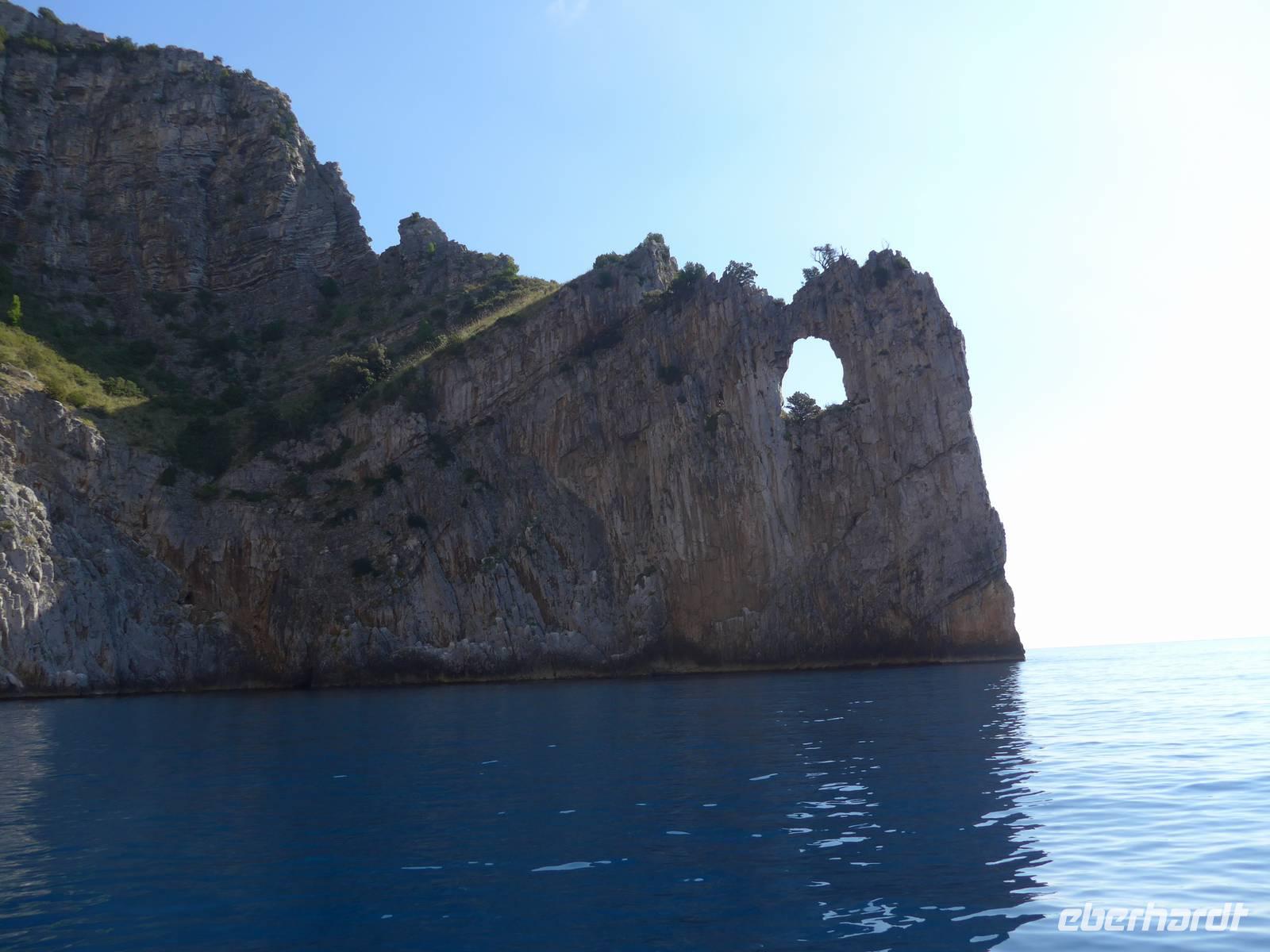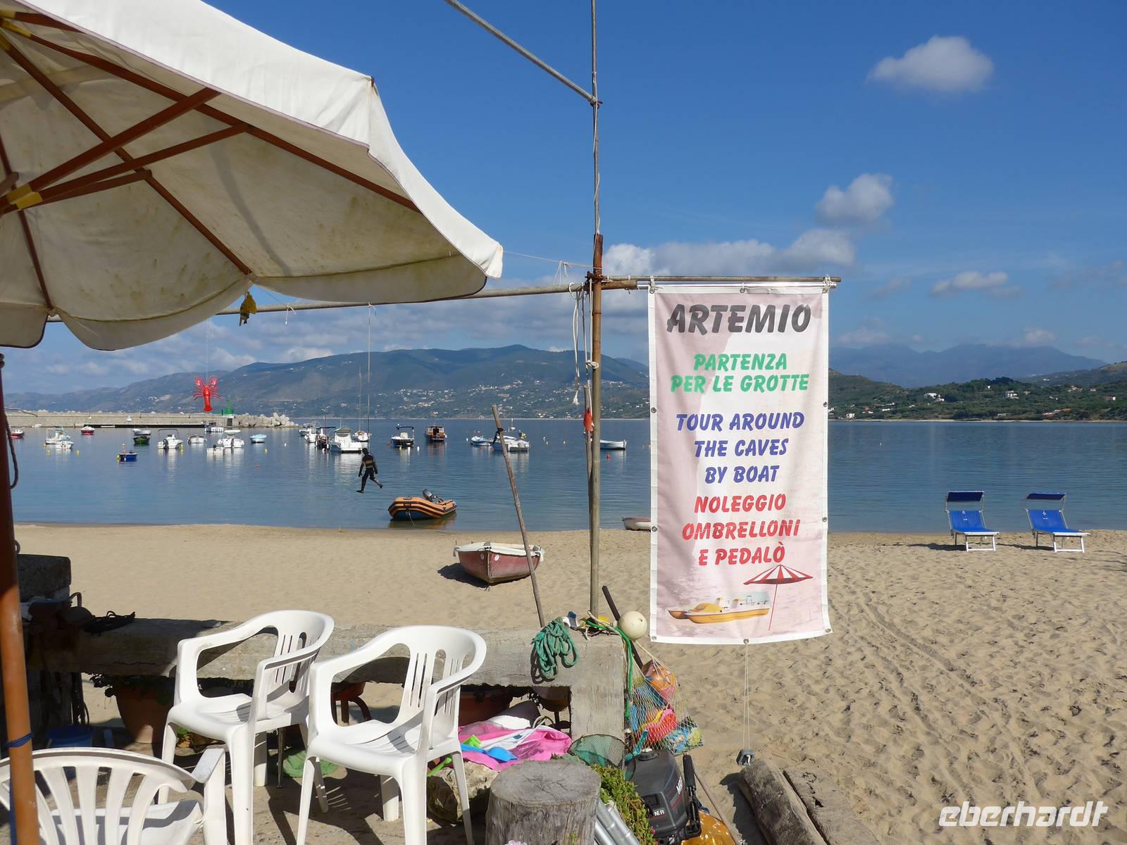 Es war tolles Wetter angesagt und so entschieden wir, gleich unseren Ausflug nach Palinuro zu machen. Auf der Fahrt dorthin hielten wir am Supermarkt, um Wasser zu kaufen. Dann nutzten wir die Schnellstraße bis San Severino und erkundeten dort, den Aufstieg in das alte nicht mehr bewohnte Dorf. Leider war die Treppe noch immer gesperrt und man konnte vermuten, daß sie gar nicht mehr hergerichtet werden soll. So fuhren wir durch die Mingardo-Schlucht, auch Teufelsschlund genannt, nach Palinuro. Ursula nahm unsere Menuewünsche für das Abendessen auf, denn Umberto kauft jeden Tag frisch ein und benutzt auch nur Frisches zum Kochen. Wir spazierten hinunter zum Strand und bestiegen ein Boot. Bei spiegelglatter See ging es nun hinaus aufs Meer, um das Kap von Palinuro. Es war traumhaft, warm und die Sonne kitzelte uns. Entlang der Steilküste gibt es viele Höhlen und wir fuhren zunächst in die Blutsgrotte, dann in die Silbergrotte - ganz was seltenes und wir konnten nicht glauben, daß unser Boot dort überhaupt hinein paßte. Weiter ging es in die Mönchsgrotte, Schwefelgrotte und bis zur Bucht des guten Schlafes. Zwischen Kaninchenfelsen und einer wunderschönen Badebucht hindurch gelangten wir zur Knochengrotte und zum Arco Naturale. Auf der Rückfahrt wartete der Höhepunkt der Bootsfahrt - die blaue Grotte. Sie war unbeschreiblich schön mit dem intensiv blauen Wasser. Gut und sicher brachte uns das Boot zum Strand zurück, wo wir unser vom Hotel vorbereitetes Picknick einnahmen. Das Programm des Tages war erfüllt, wir aber bei dem schönen Wetter noch voller Tatendrang.