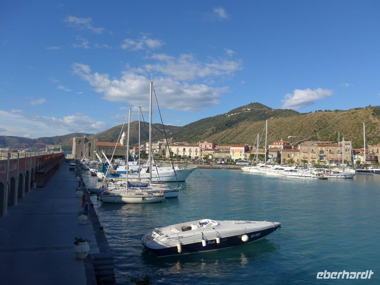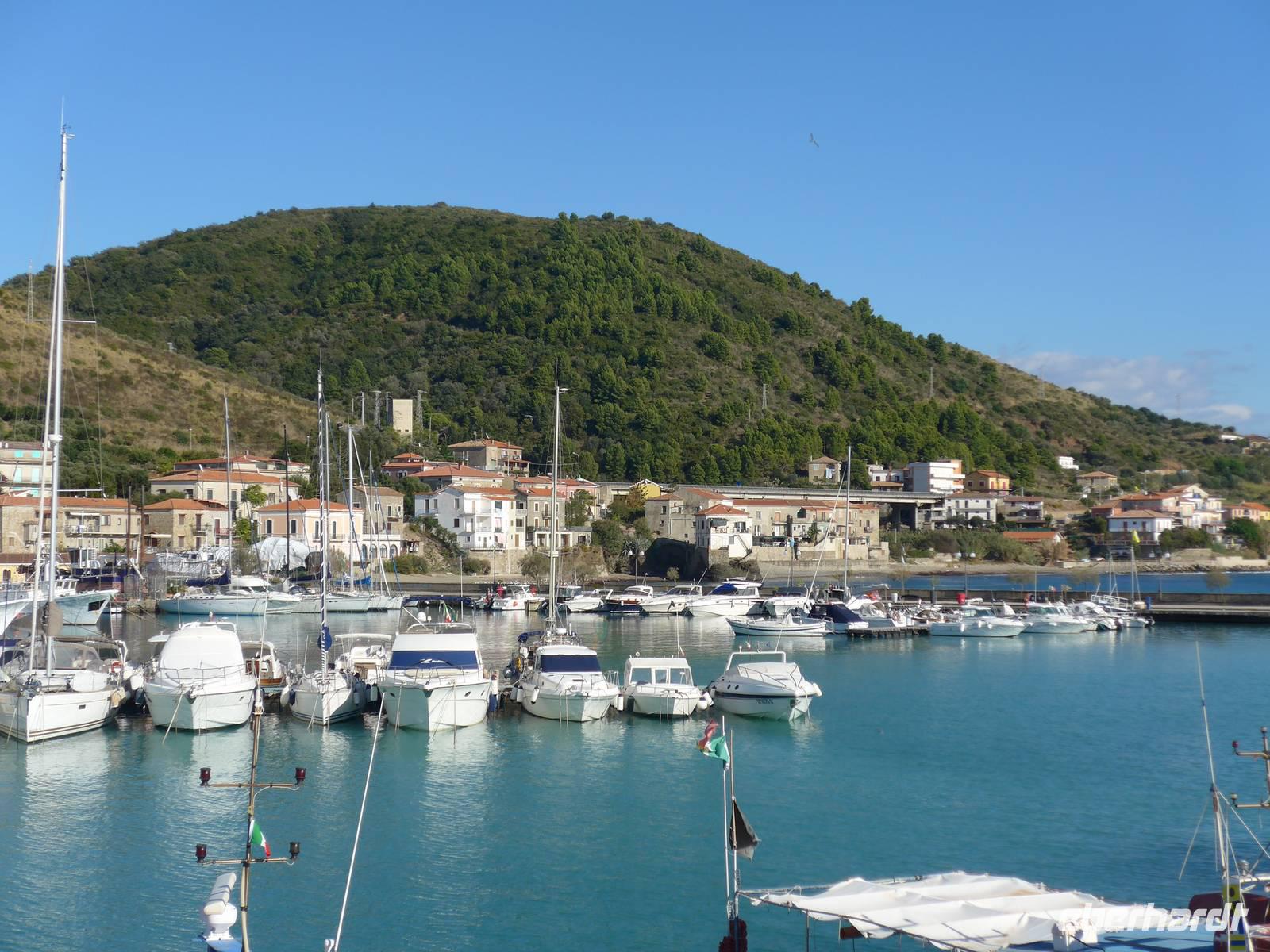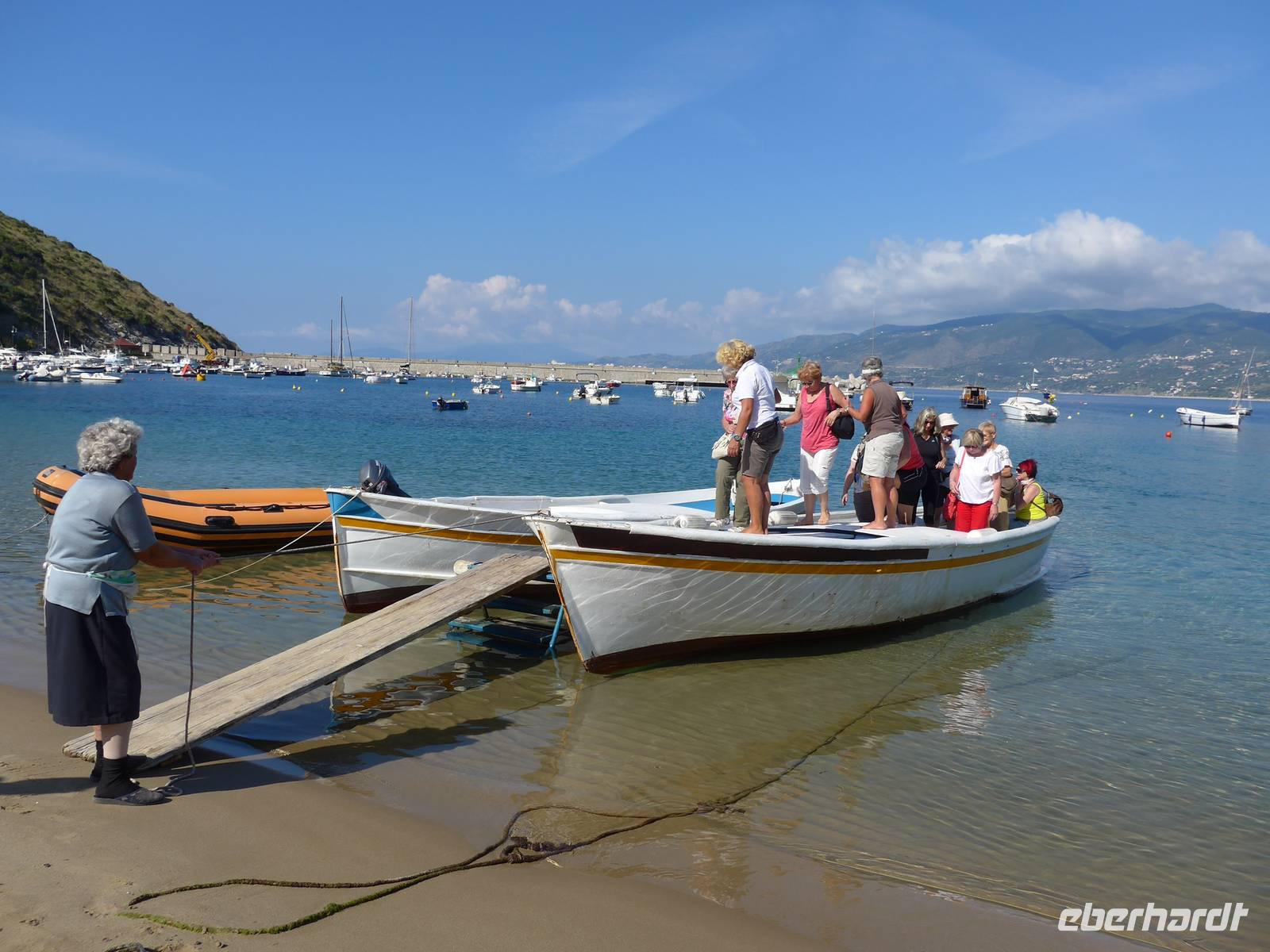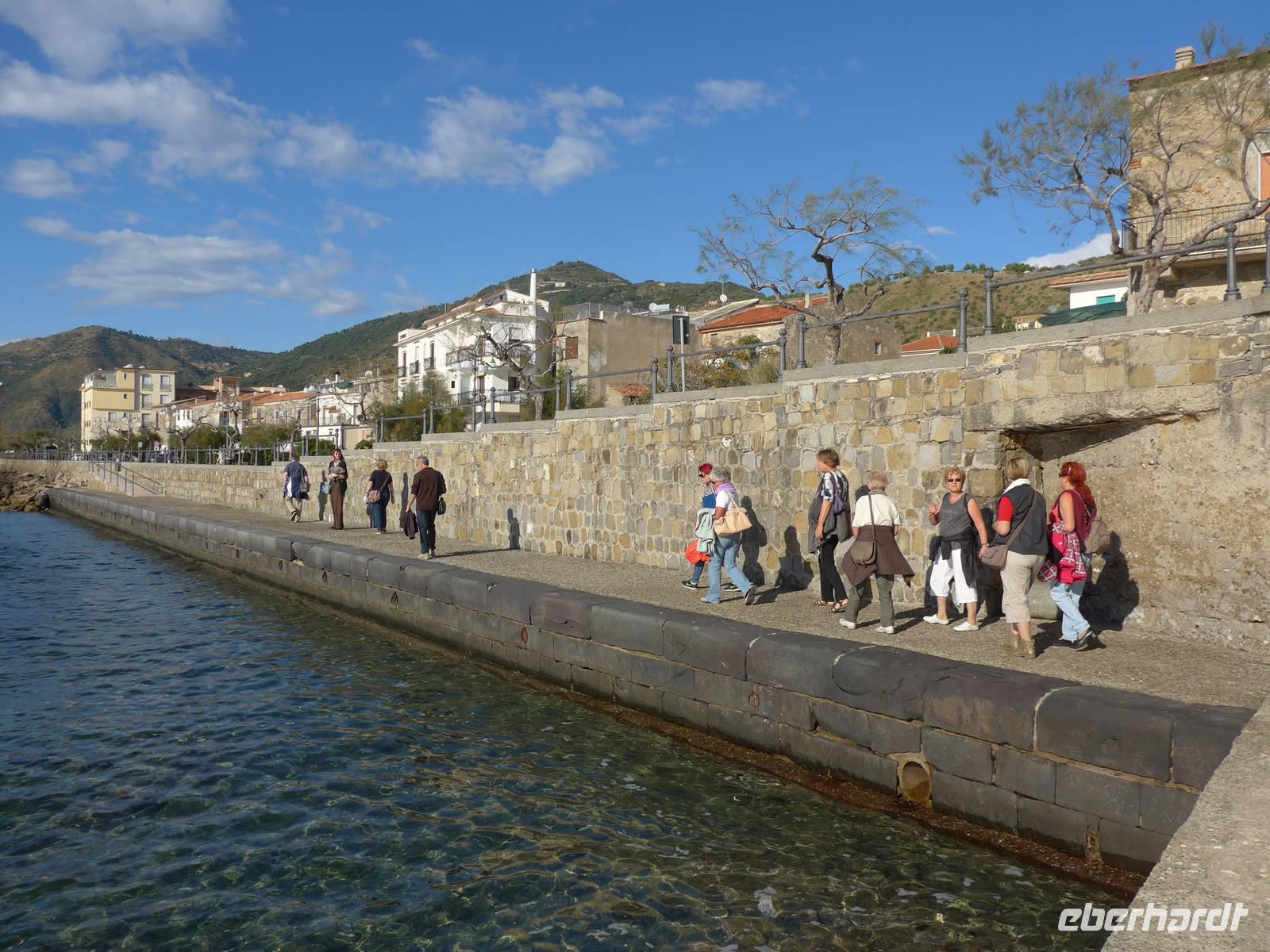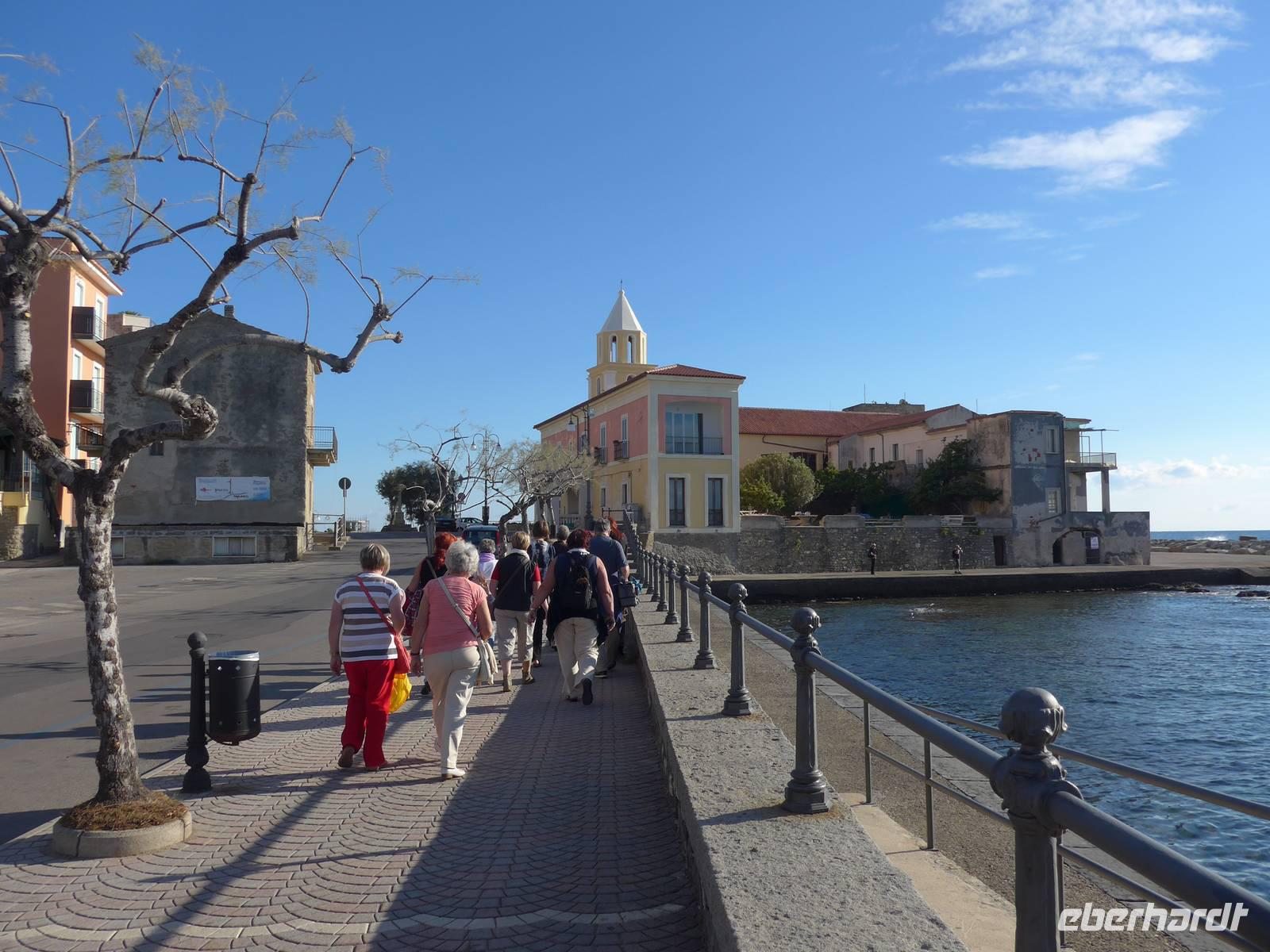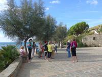 Gleich am Morgen fuhren wir nach Casal Velino zum Wochenmarkt. Bauern der Region boten dort ihre Produkte an, Fleisch/Wurst- und Käsegeschäfte waren mit Ständen vertreten und Kleidung gab es in Hülle und Fülle. Wir kamen gleich mit den Bauern ins Gespräch und kauften für zu Hause ein. Dann fuhren wir nach Agropoli und weiter auf der Küstenstraße nach Santa Maria di Castellabate. Dort machten wir für 2 Stunden Pause. Traumhaftes Wetter mit Sonne und guter Fernsicht ließen uns den Ort genießen. Fast 300 Meter über dem Meer liegt Castellabate, das mittelalterliche Juwel. Von da oben war die Sicht noch grandioser. Mit Ursula spazierten wir durch den Ort, Schauplatz des Films "Willkommen im Süden", der den Ort noch berühmter machte. Vorbei an der Kirche durch zahlreiche enge Gassen stiegen wir nach unten, wo es nochmals einen Aussichtsplatz gibt. Unser Bus brachte uns wieder hinunter auf die Küstenstrasse und vorbei an San Marco nach Acciaroli. Die Sonne hatte die Luft gut erwärmt und so gingen wir gemütlich über die Hafenmole und durch die Gassen der Stadt mit Endziel Eiscafe. In der Sonne sitzend ließen wir den herrlichen Ausflug ausklingen. Die Ruhe der Nachsaison hat einen besonderen Charme und so wären wir gern noch etwas länger dort sitzen geblieben. Aber wir wollten ja noch das Mittelmeermuseum besuchen. Unser kleiner, wendiger Bus konnte uns direkt am Cafe abholen und wir fuhren auf der Küstenstrasse direkt am Meer zurück nach Pioppi.