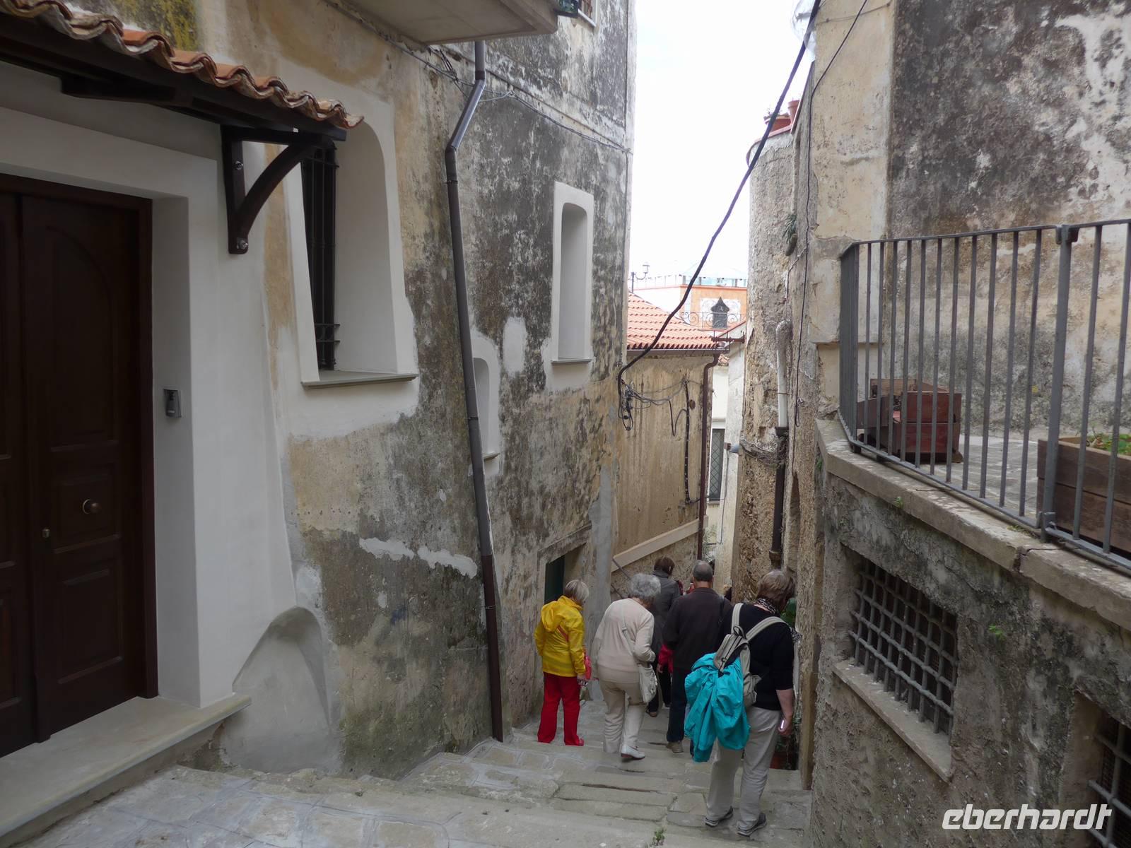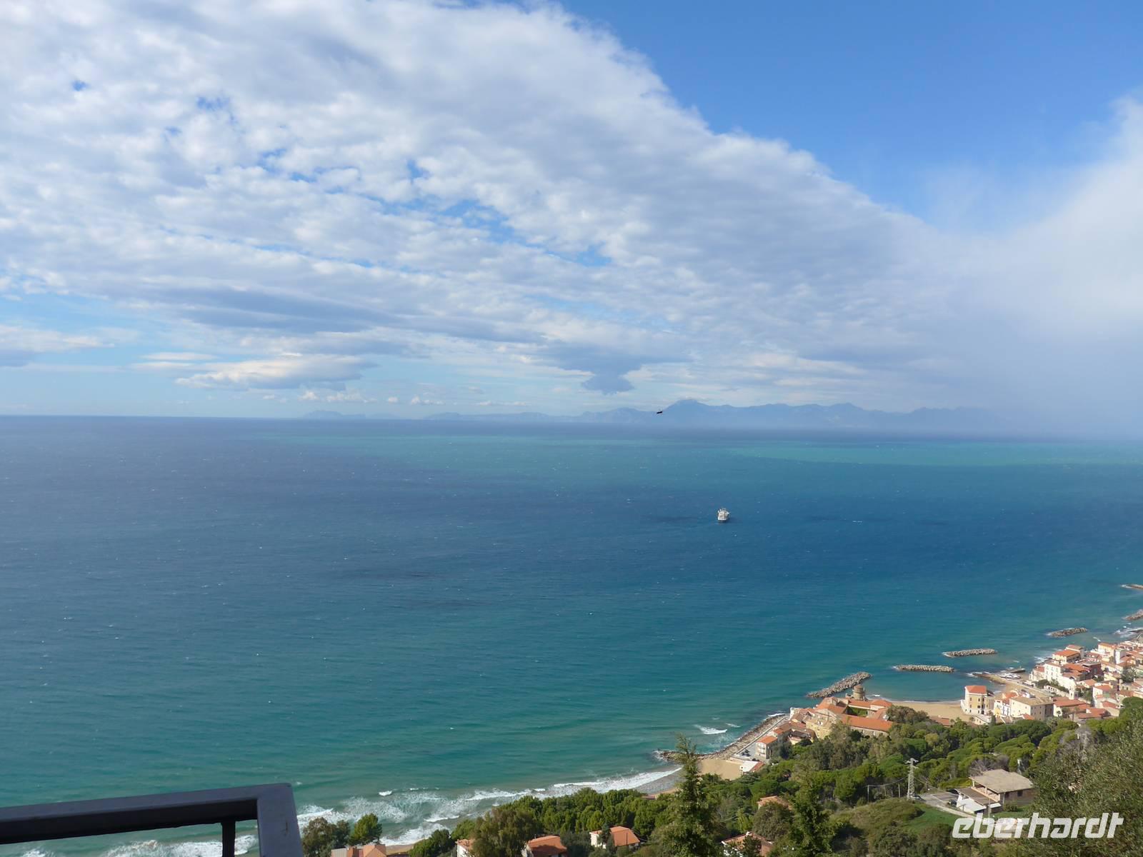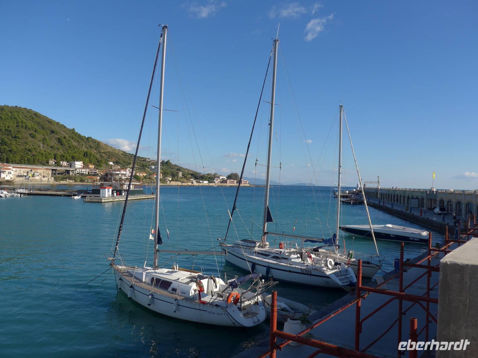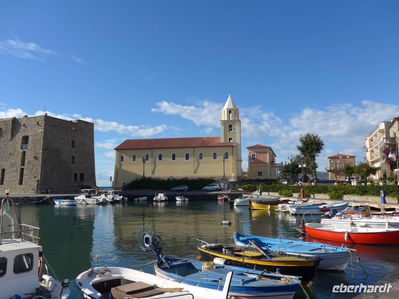 Gleich am Morgen fuhren wir nach Casal Velino zum Wochenmarkt. Bauern der Region boten dort ihre Produkte an, Fleisch/Wurst- und Käsegeschäfte waren mit Ständen vertreten und Kleidung gab es in Hülle und Fülle. Wir kamen gleich mit den Bauern ins Gespräch und kauften für zu Hause ein. Dann fuhren wir nach Agropoli und weiter auf der Küstenstraße nach Santa Maria di Castellabate. Dort machten wir für 2 Stunden Pause. Traumhaftes Wetter mit Sonne und guter Fernsicht ließen uns den Ort genießen. Fast 300 Meter über dem Meer liegt Castellabate, das mittelalterliche Juwel. Von da oben war die Sicht noch grandioser. Mit Ursula spazierten wir durch den Ort, Schauplatz des Films "Willkommen im Süden", der den Ort noch berühmter machte. Vorbei an der Kirche durch zahlreiche enge Gassen stiegen wir nach unten, wo es nochmals einen Aussichtsplatz gibt. Unser Bus brachte uns wieder hinunter auf die Küstenstrasse und vorbei an San Marco nach Acciaroli. Die Sonne hatte die Luft gut erwärmt und so gingen wir gemütlich über die Hafenmole und durch die Gassen der Stadt mit Endziel Eiscafe. In der Sonne sitzend ließen wir den herrlichen Ausflug ausklingen. Die Ruhe der Nachsaison hat einen besonderen Charme und so wären wir gern noch etwas länger dort sitzen geblieben. Aber wir wollten ja noch das Mittelmeermuseum besuchen. Unser kleiner, wendiger Bus konnte uns direkt am Cafe abholen und wir fuhren auf der Küstenstrasse direkt am Meer zurück nach Pioppi.