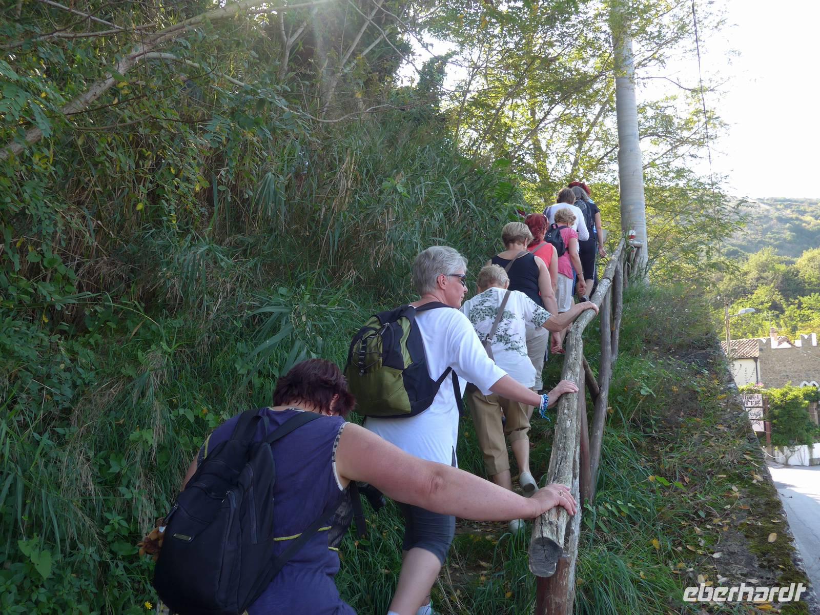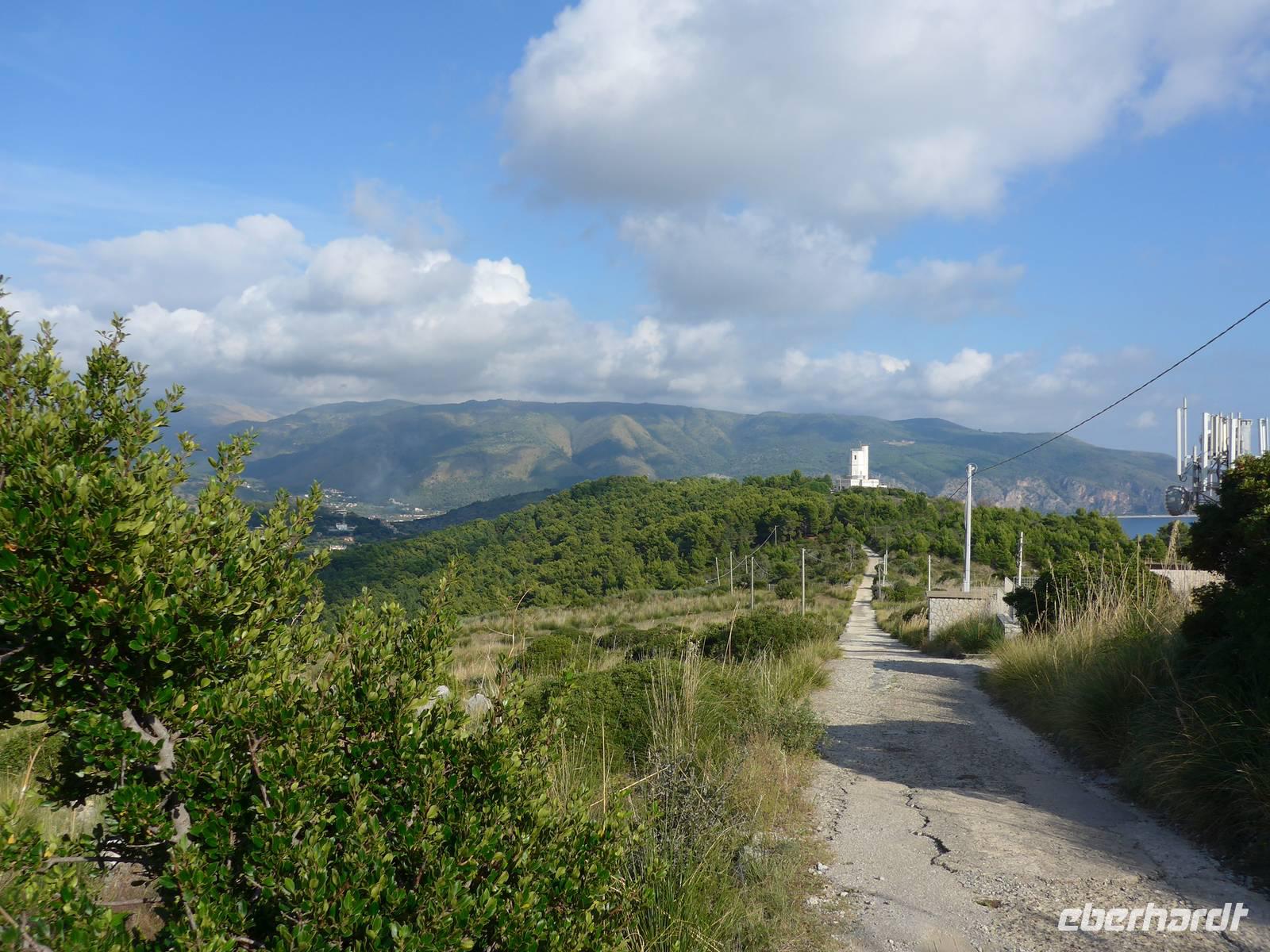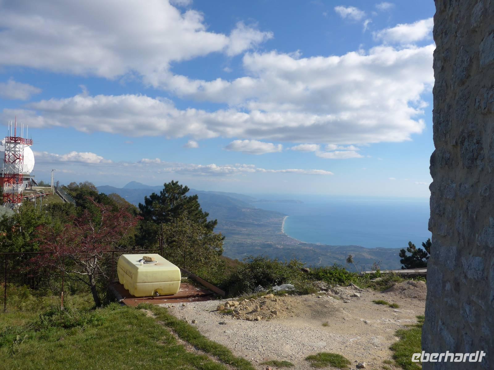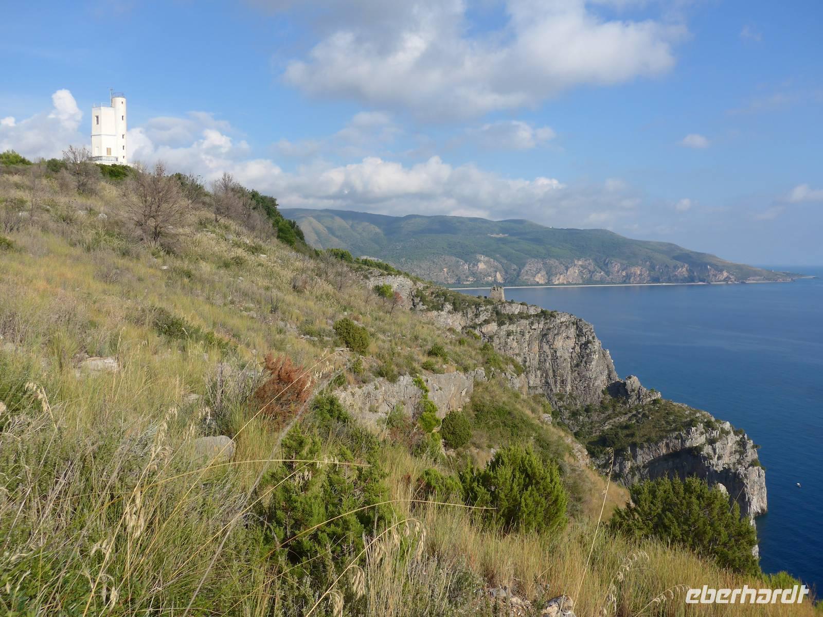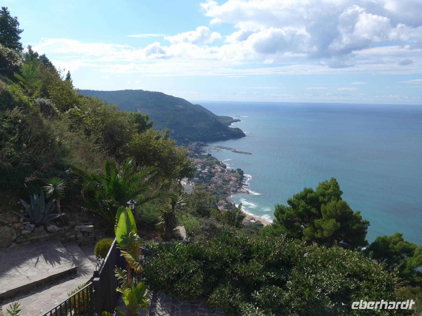 Wir wechselten die Schuhe und stiegen hinauf zum Leuchtturm, den wir jeden Abend von unserem Hotel in Pioppi aus blinken sahen. Es ging steil bergan auf dem Treppenweg Sentieri natura und alle hatten, obwohl wir keine Wandergruppe waren, den Ehrgeiz oben anzukommen. Wir ließen uns Zeit. Ursula erklärte uns unterwegs viele Pflanzen. Es hatte sich gelohnt. Die Küsten des Cilento lagen uns zu Füßen und wir sahen die hohen Gipfel ganz nah. Mit den Unermüdlichen machte Ria einen Abstecker zur Steilküste mit Blick bis nach Marina di Camerote. Zurück nahmen wir einen längeren, dafür aber bequehmeren Weg und unten am Meer kehrten wir ins La Torre auf einen Kaffee, ein Eis....... ein. Die Rückfahrt auf der Schnellstraße hatte für uns noch viele tolle Ausblicke parat und wir erreichten das Hotel erst bei Dunkelheit. Trotzdem gingen viele noch schwimmen vor dem Abendessen, welches wir wieder im Garten des Hotels genießen konnten.