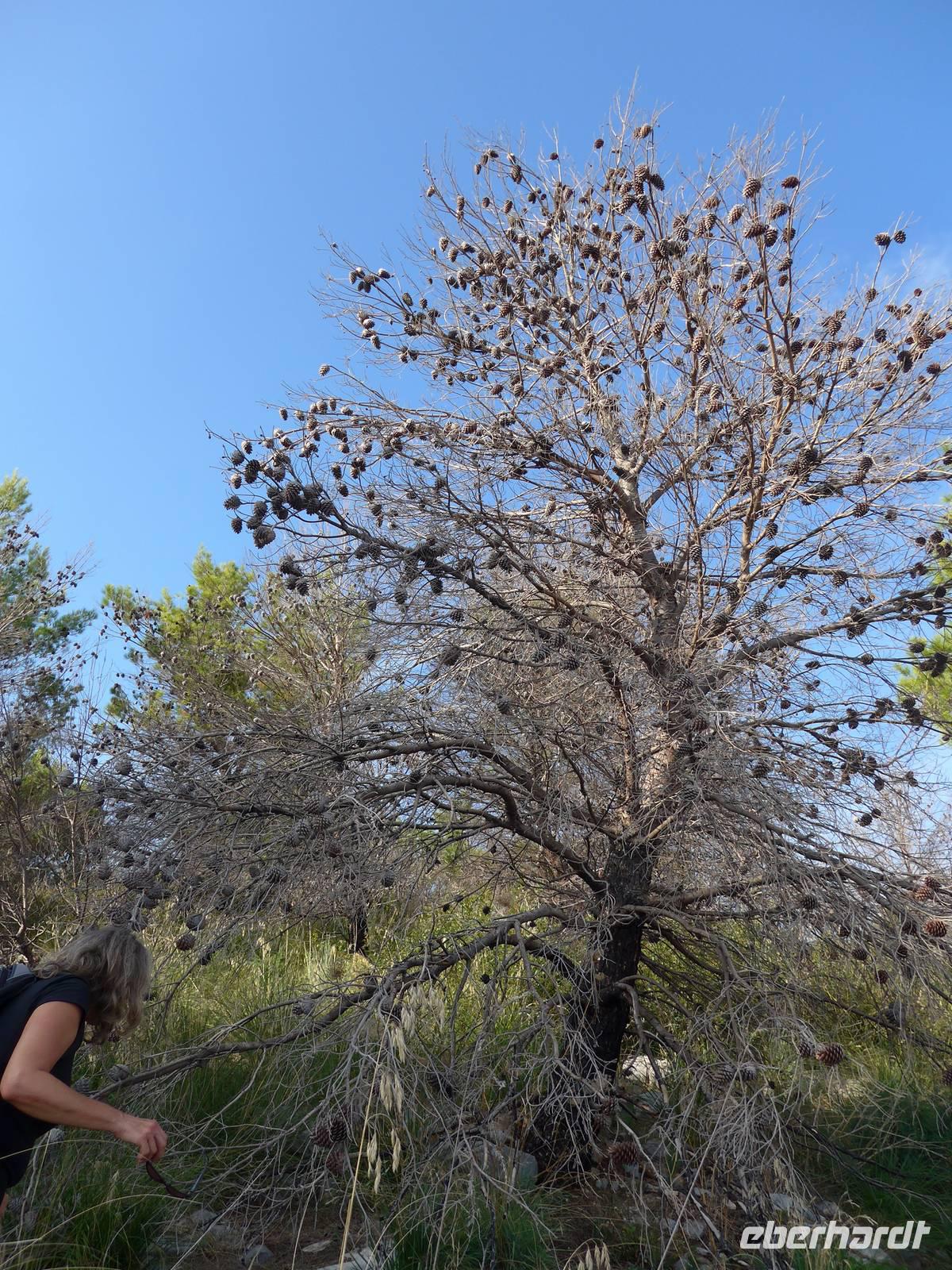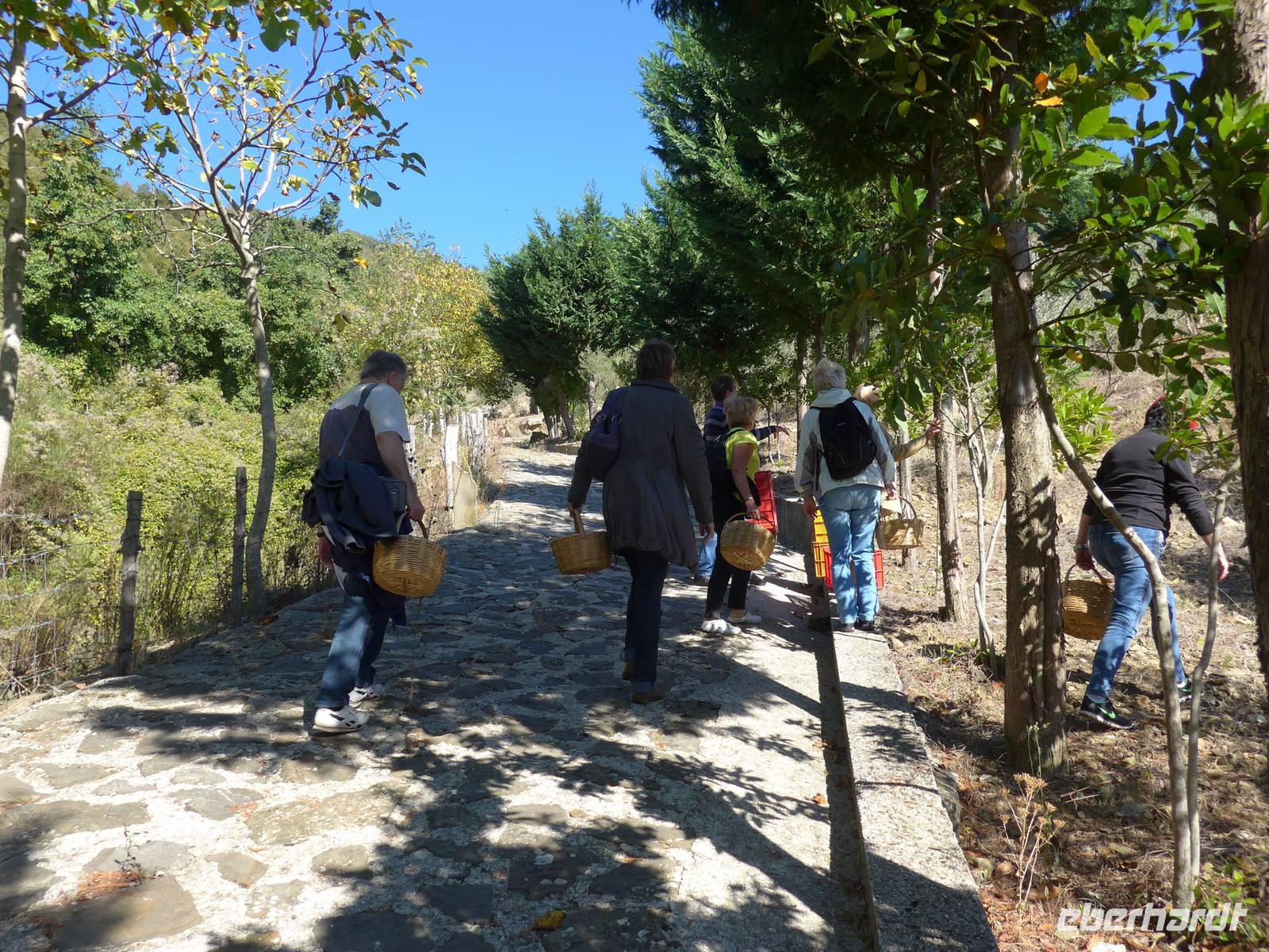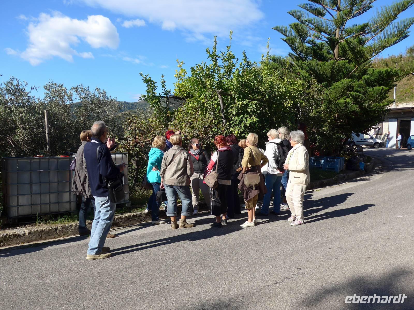 Gut gestärkt nach dem Frühstück brachen wir auf zur Olivenernte. Unser Bus brachte uns hinauf zum Olivenhain der Familie Consalvo. So ein Oivenhain ist der Stolz einer jeden Familie. Er wird immer weiter vererbt an einen Sohn und stellt die Ernährungsgrundlage der Familie dar. Als wir oben ankamen, trauten wir unseren Augen kaum - keine Oliven an den Bäumen. Mit Ursula und einer Angestellten des Hotels durchstreiften wir das riesige Anwesen, ohne Oliven zu finden. Das ist ein Disaster für die Familie. Wir blieben 1 Stunde oben und erfuhren alles zur Olivenernte von Ursula. Feigenbäume und Johannisbrotbäume hatten Früchte und wir entdeckten sogar blühenden Aronstab. Mit leeren Körben kehrten wir zu unserem Bus zurück, der uns wieder hinunter nach Pioppi brachte. Wir nutzten die Zeit, den Ort zu erkunden und zu baden.