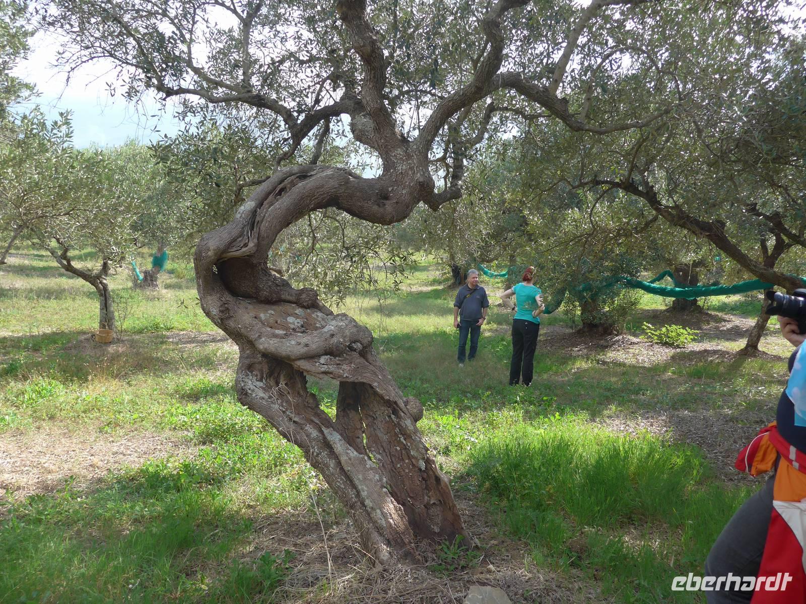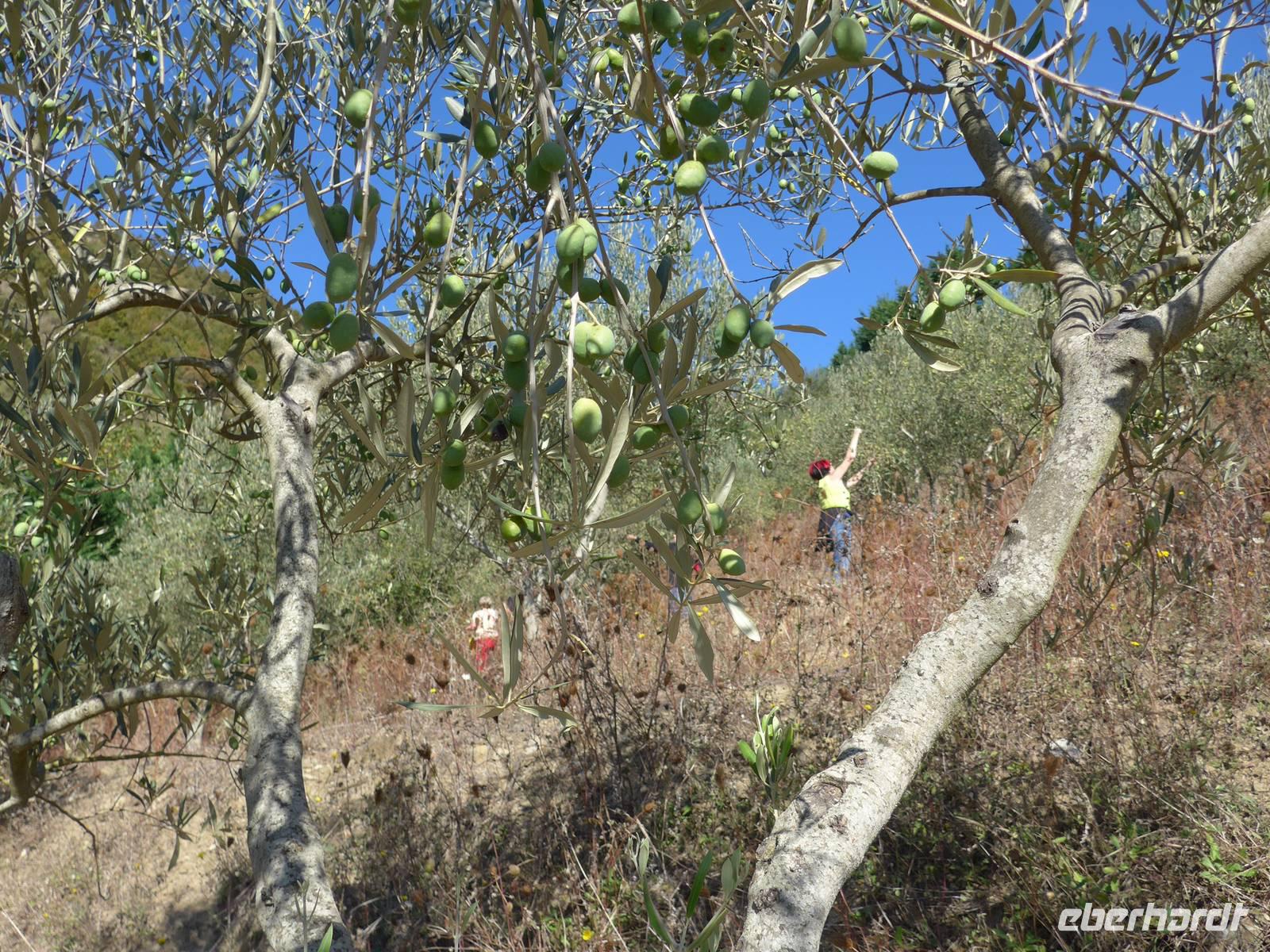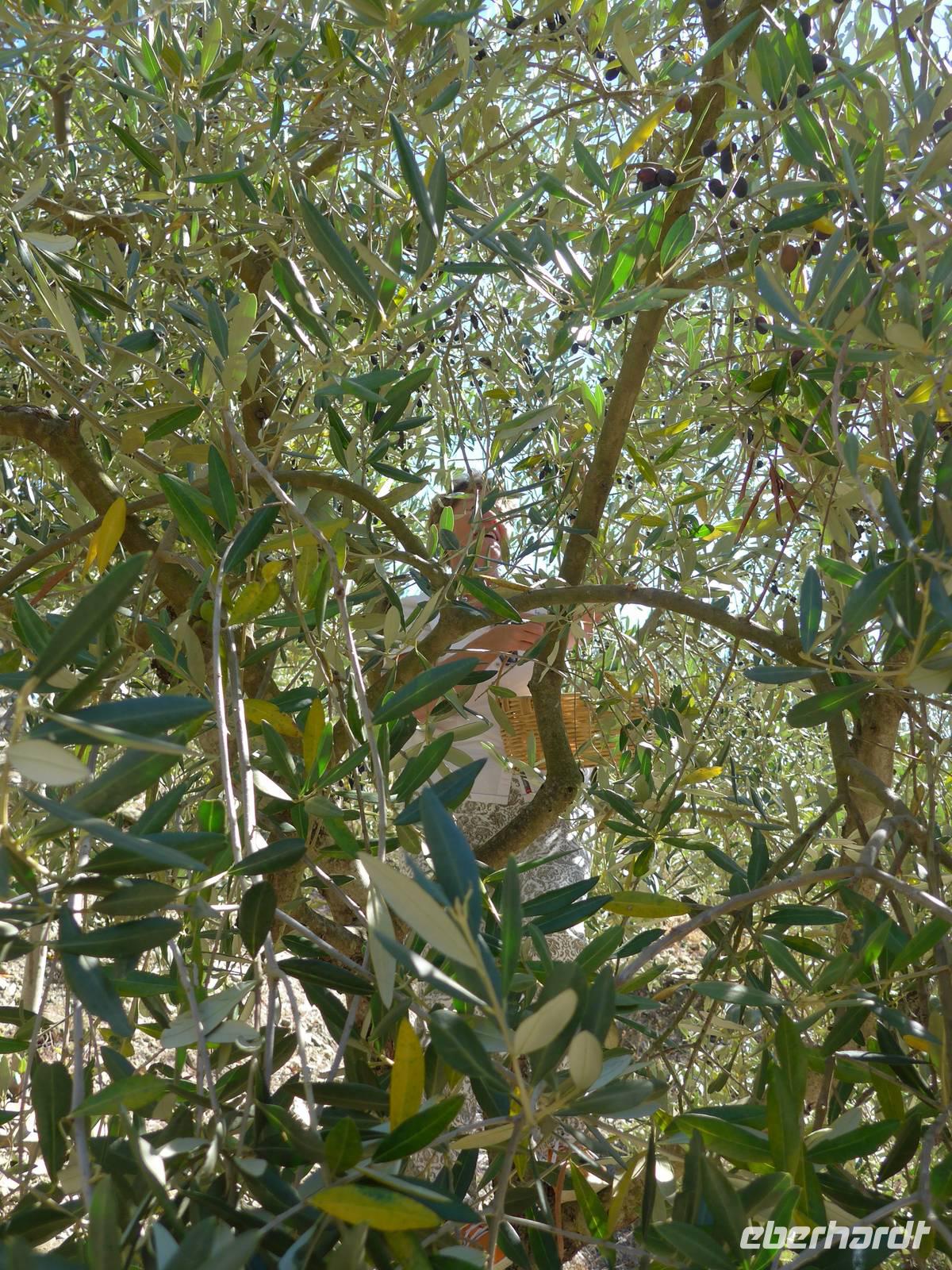 Die ganze Woche war Umberto auf der Suche nach einem Olivenbauern, bei dem es was zu ernten gab. Und tatsächlich hoch oben am Fuße des Monte Stella gab es Oliven an steilen Hängen. Wir fuhren hinauf zur Familie Radano und besichtigten erst einmal deren moderne Ölpresse. Ein Computer steuert alles und nur eine Person muß den Vorgang überwachen. In nur einer Stunde wird aus 30000 kg Oliven das fertige Öl gewonnen. Welch ein Unterschied zur alten Ölpresse von Tonino. Unser Bus brachte uns noch weiter hinauf zum Olivenhain, wir nahmen wieder unsere Körbe und fanden viele Früchte an den Bäumen. Es war mühevoll, an den steilen Hängen einen sicheren Stand zum Ernten zu finden, aber es machte sehr viel Spaß. Um die Oliven in der Baummitte zu erreichen, kletterte ich in das Geäst. Die Kisten füllten sich mit Oliven und wir hätten gern noch weiter geerntet. Aber unser Picknick stand ja noch aus.