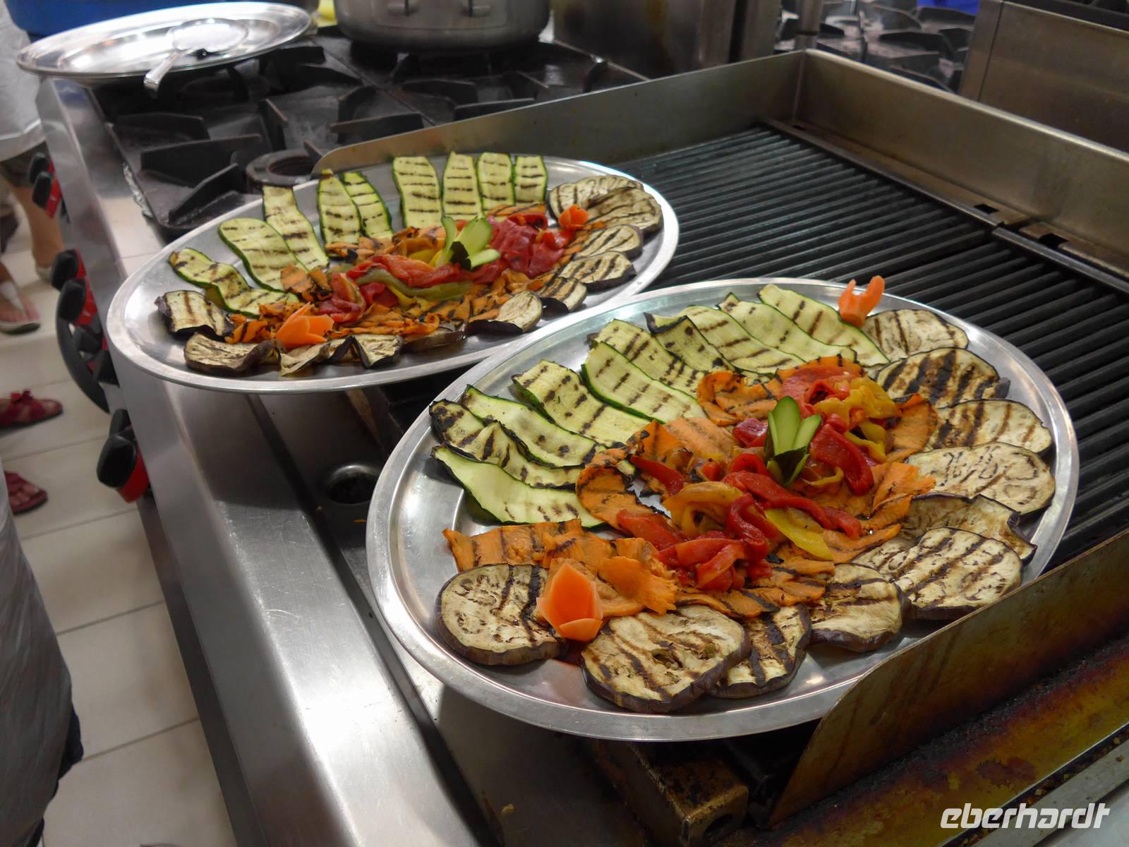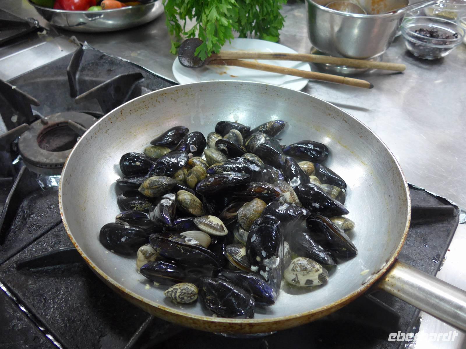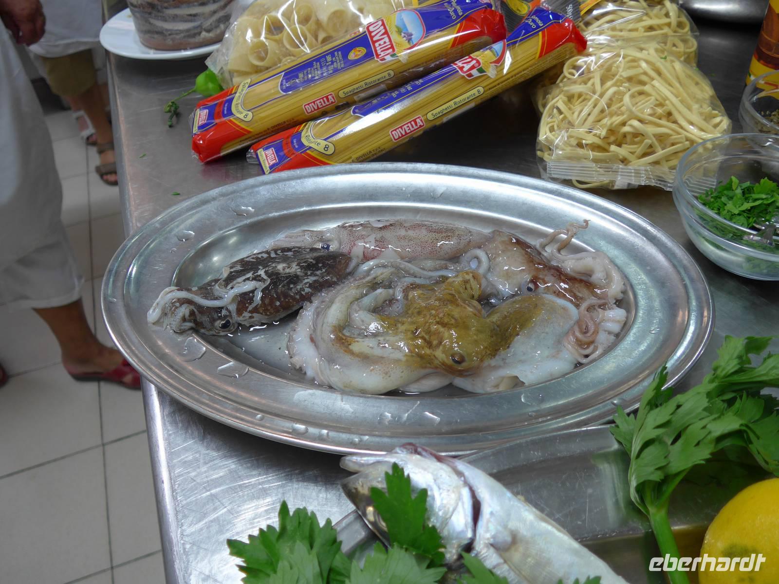 13 Uhr trafen wir uns wieder im Garten des Hotels, legten unsere Schürzen und Mützen an und hielten das alles im Bild fest. Dann gings endlich in die Küche, wo uns Umberto empfing. Die Zutaten waren alle aufgereiht und er gab eine Erklärung zu den Kräutern und Gewürzen. Umberto bereitete vor unseren Augen Spaghetti mit Knoblauchsose, Pasta mit Kichererbsen, Spaghetti alla Puttanesca (nach Hurenart) und eine grüne Sose, die man zu allen gekochten Gerichten wie Fisch oder Fleisch reichen kann. Wir durften alles selbst verkosten mit Wein und Wasser. Schlemmen in der Küche des Meisters - das war mal was Besonderes. Die Rezepte dieser leckeren und gesunden Gerichte wurden an der Rezeption für uns kopiert und im Kochbuch von Umberto fanden wir weitere Anregungen zur Mittelmeerdiät.