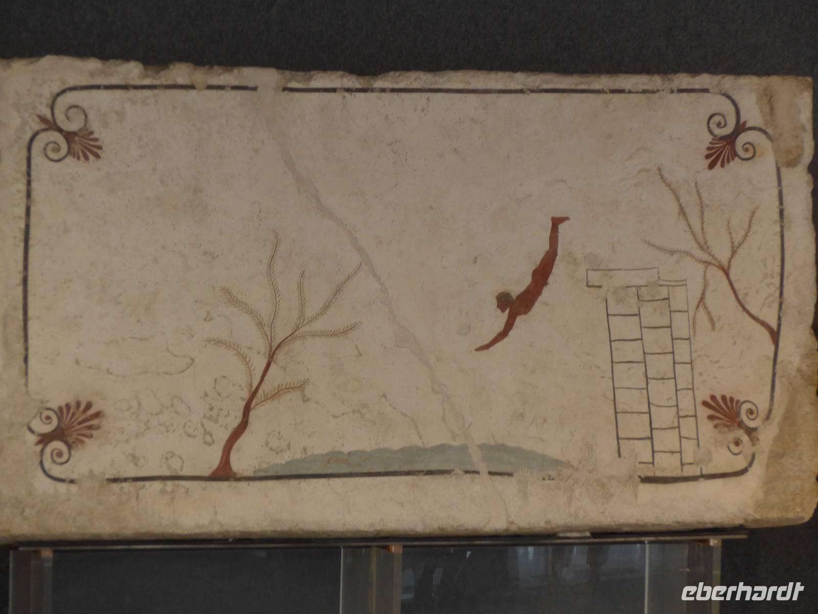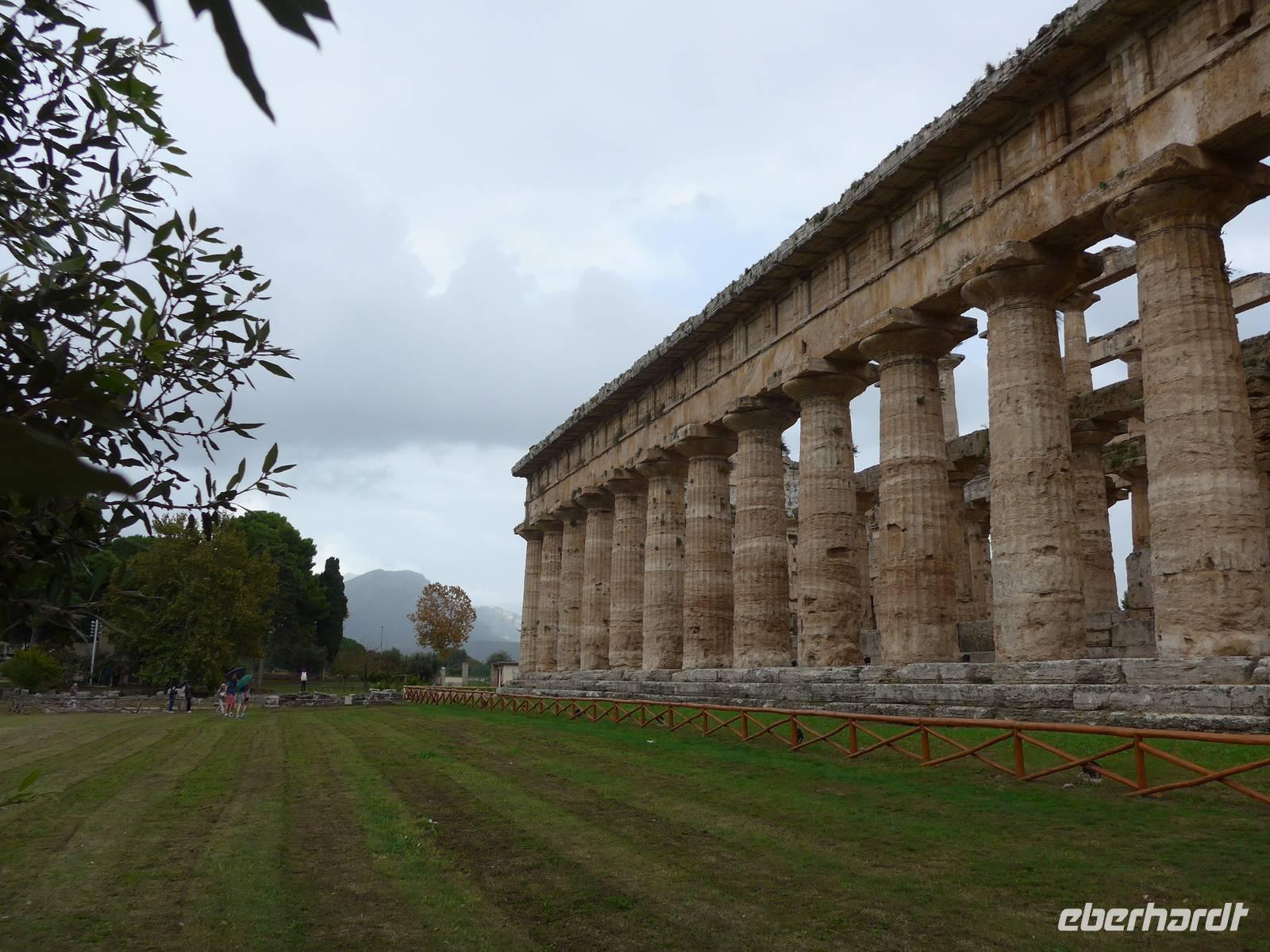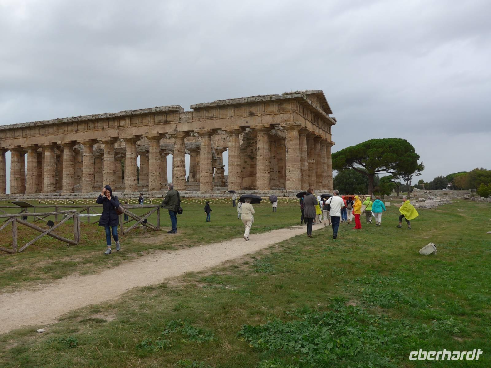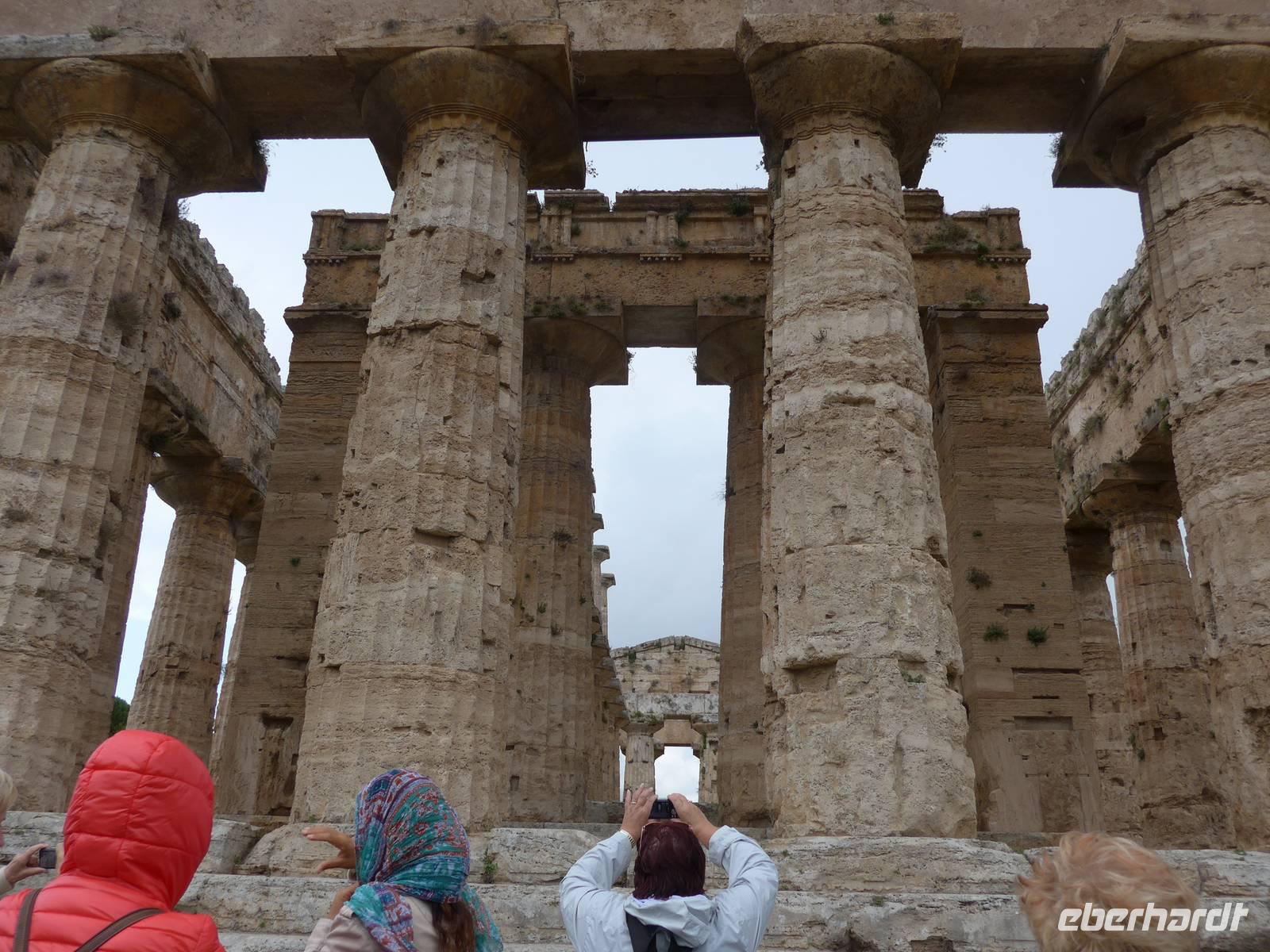 Erst Mitte des 18.Jahrhunderts stieß man bei Straßenbauarbeiten auf die Ruinen der antiken Stadt Paestum. Nur ein Sechstel ist heute davon freigelegt und wir begannen unsere Führung mit Adele am Athene-Tempel. Adele berichtete über die Entstehung der Siedlung in der Sele-Ebene und beim Spaziergang über die Via Sacra, den Cardo Maximus, bekamen wir einen guten Eindruck vom Leben der Menschen in Paestum vor mehr als 2000 Jahren. Die unterirdische Grabkapelle aus griechischer Zeit sahen wir später in einer Installation nochmals im Museum. Über das Forum spazierten wir weiter zum Amphitheater und zum Poseidon-Tempel. Dort wurden wir von Sturm und Regen überrascht und flüchteten unter einen großen Baum, der uns Schutz bot. Der Poseidon-Tempel ist neben den Tempeln in Agrigent und Segesta auf Sizilien einer der besterhaltenen. Ein Abstecher zum Hera-Tempel beendete die Führung im Freigelände. Danach gingen wir in das 1952 eröffnete Museum. Die wertvollsten Ausgrabungsfunde sind dort ausgestellt. 1968 wurde außerhalb der antiken Stadt das Grab des Tauchers entdeckt. Es ist einmalig auf der Welt und das wichtigste Ausstellungsstück des Museums. Fasziniert vom Ausflug in die Antike verabschiedeten wir uns von Adele und fuhren zurück ins Hotel.