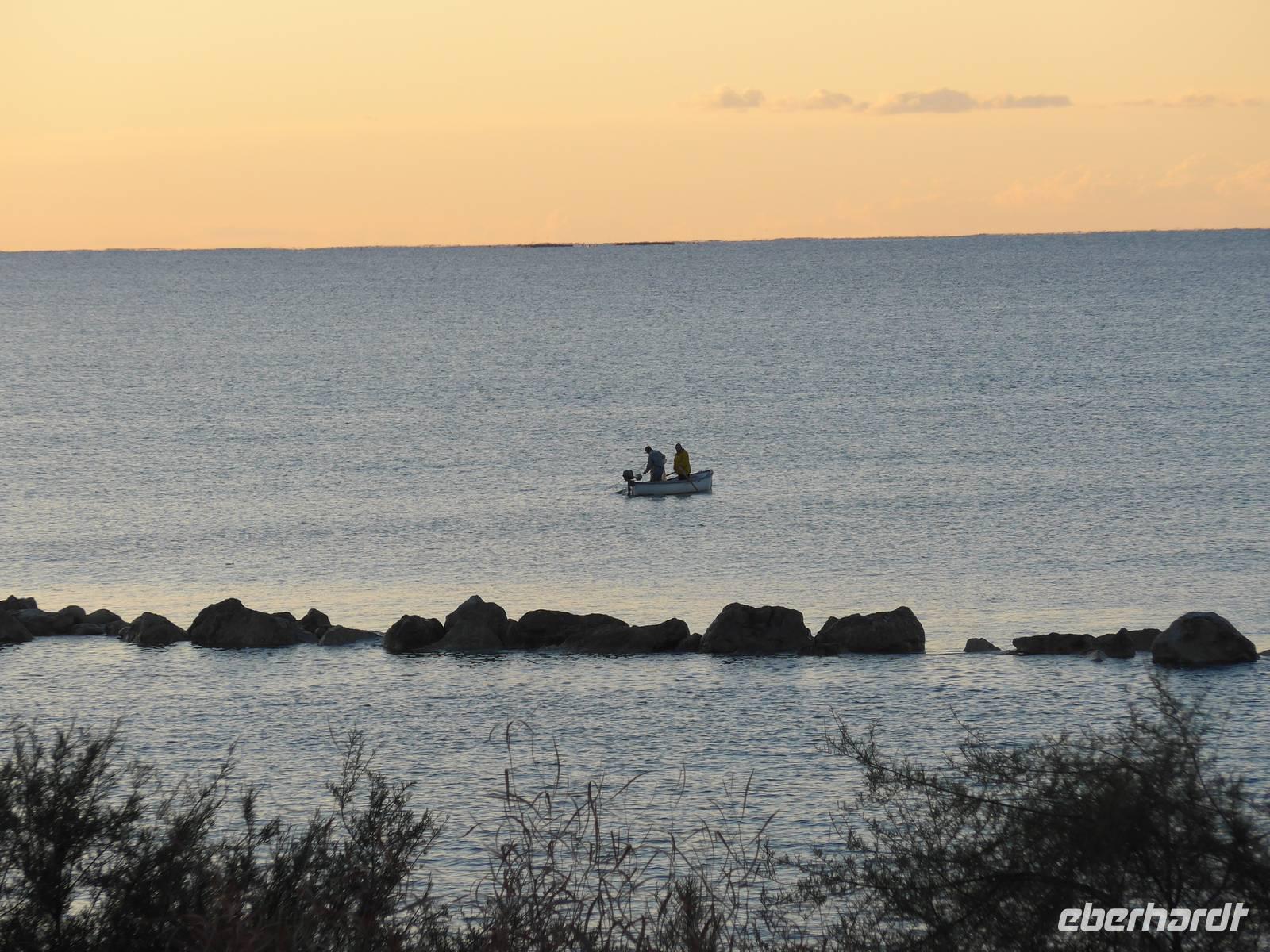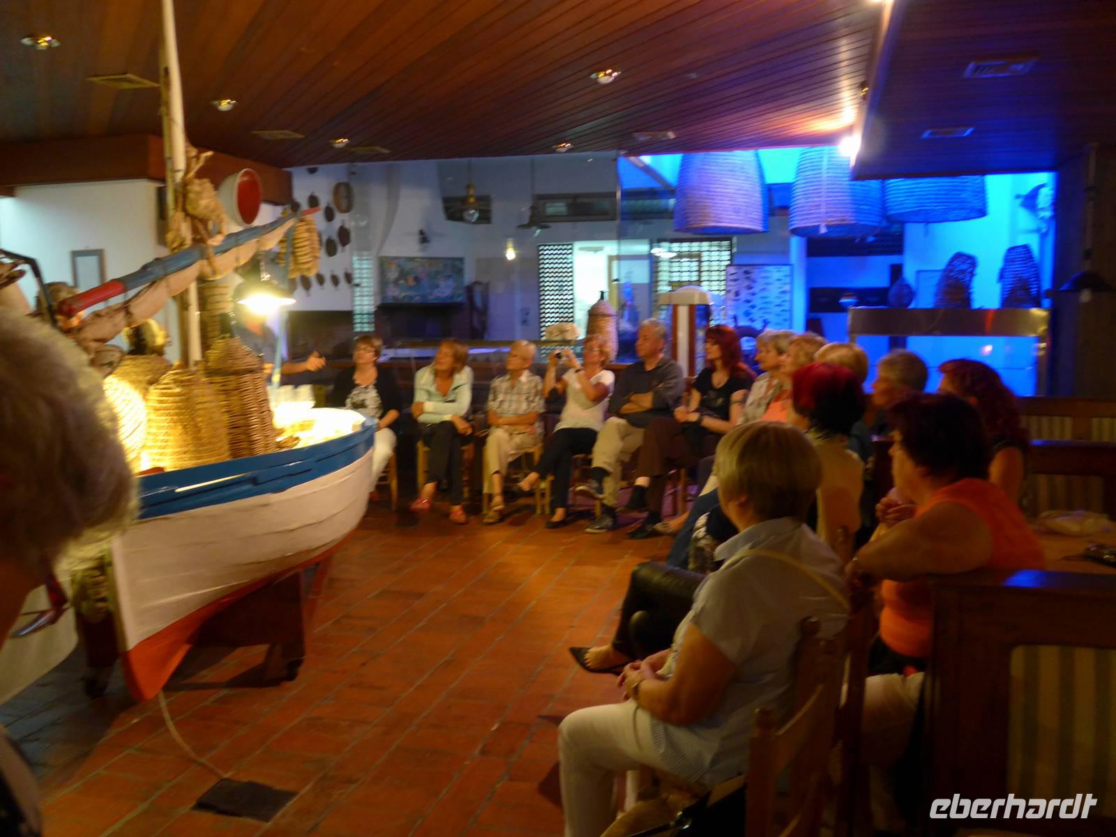 Um 18 Uhr trafen wir uns mit Ursula und Tonino im Restaurant II Grigliaro zu Weinprobe. Im Zentrum des Raumes steht ein altes Fischerboot von der Eltern der Brüder Consalvo und der Raum ist geschmückt mit allerlei alten Gegenständen zum Fischfang. Tonino präsentierte uns 3 Weißweine und 2 Rotweine. Es war sehr lustig und so gingen wir erst 20 Uhr zum Abendessen. Der Sturm hatte Abkühlung gebracht und so aßen wir drin im Restaurant.
